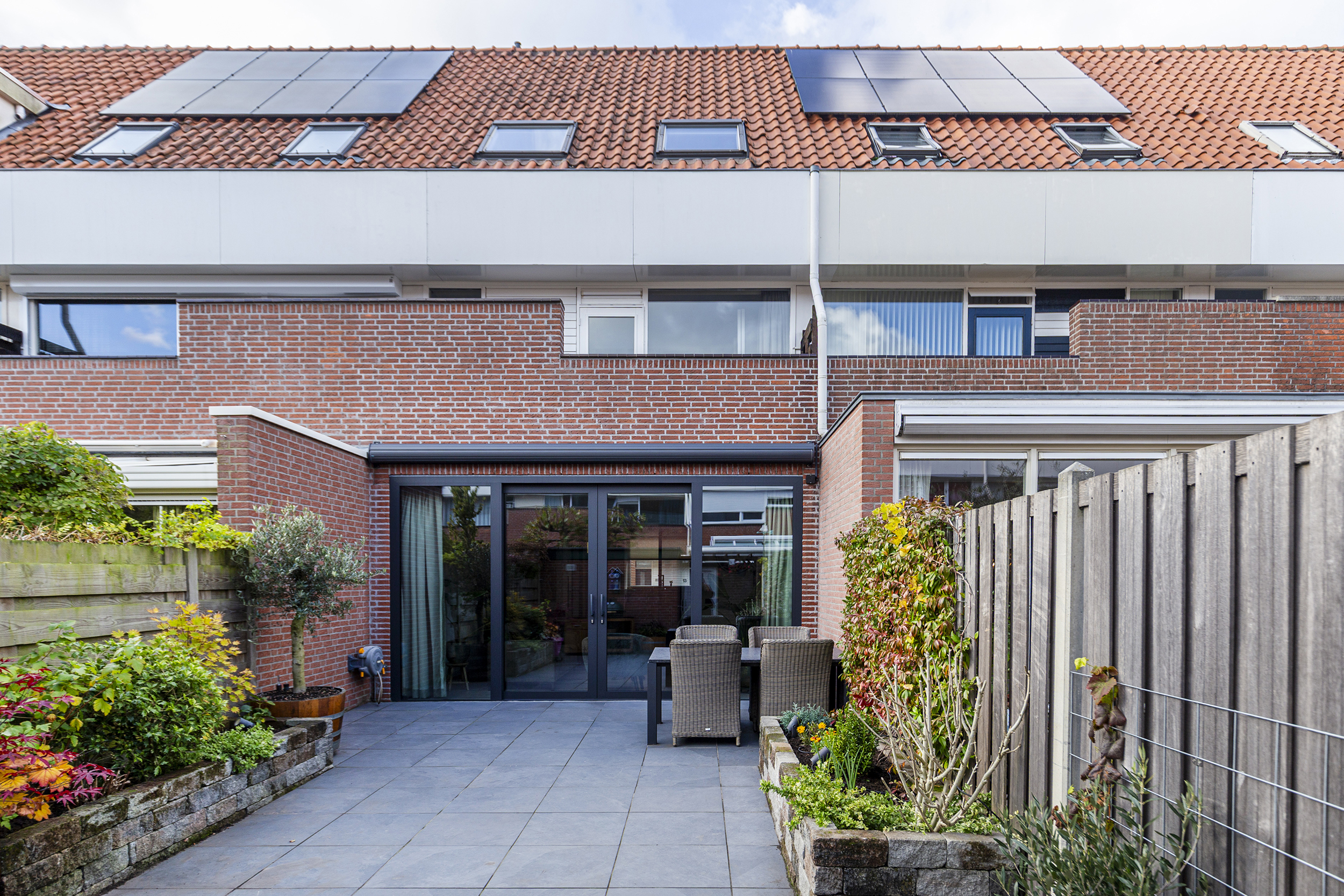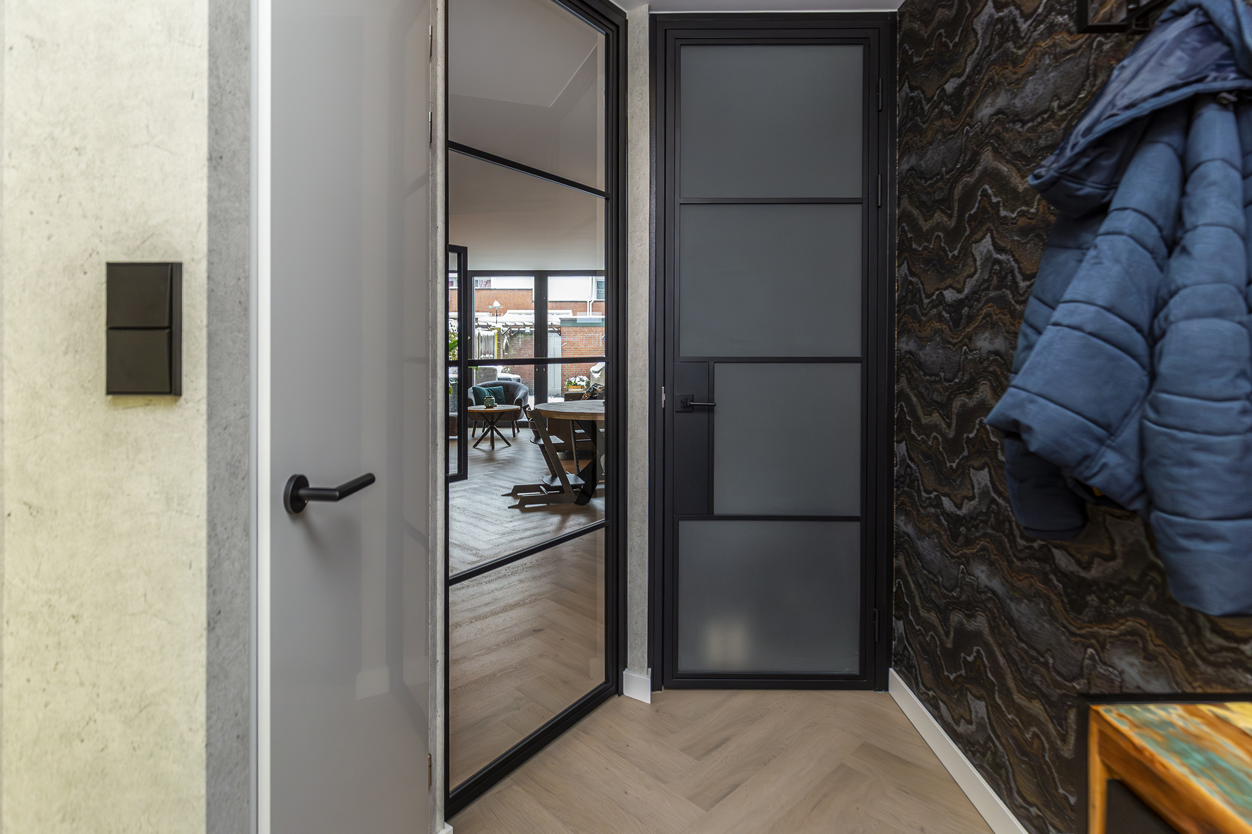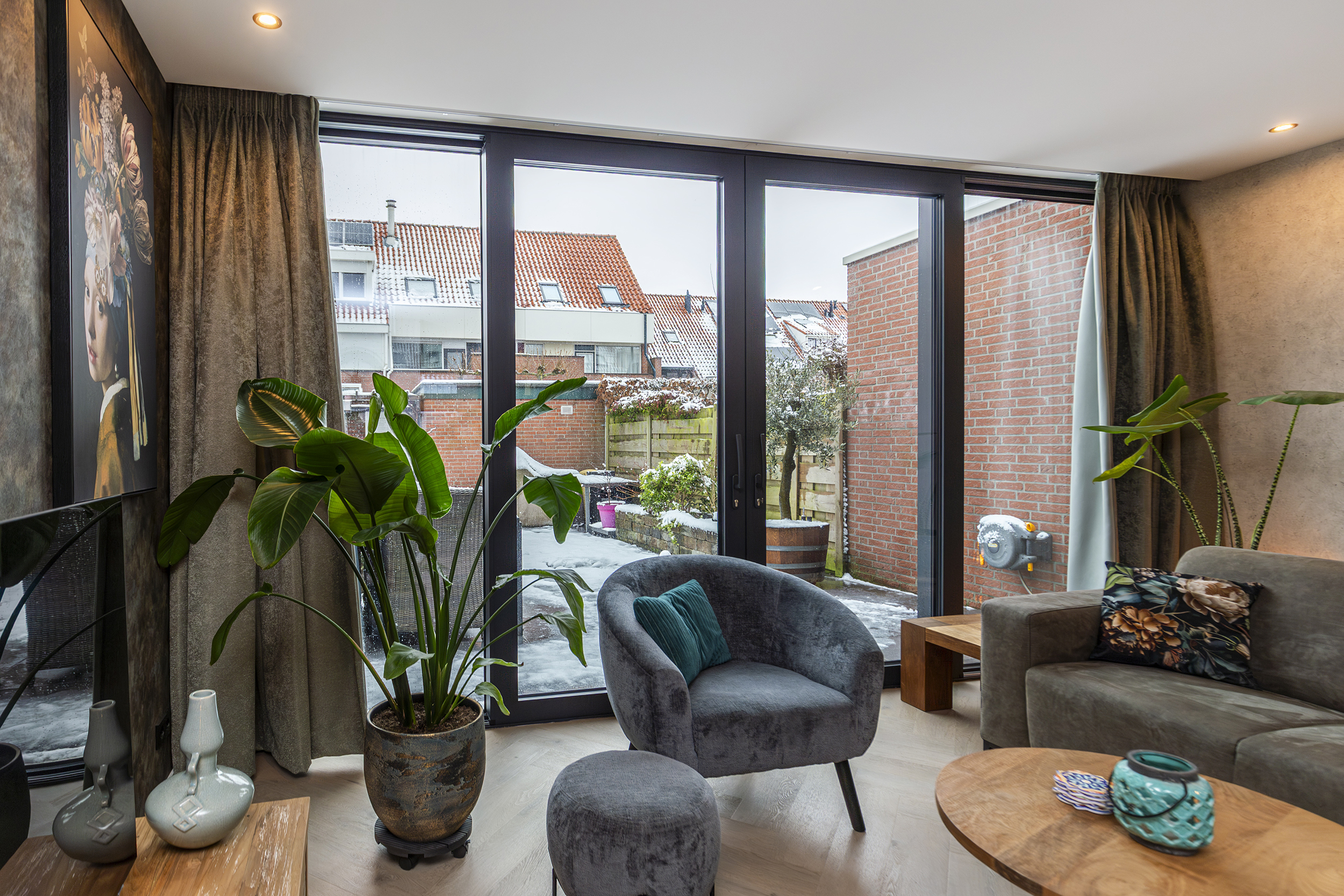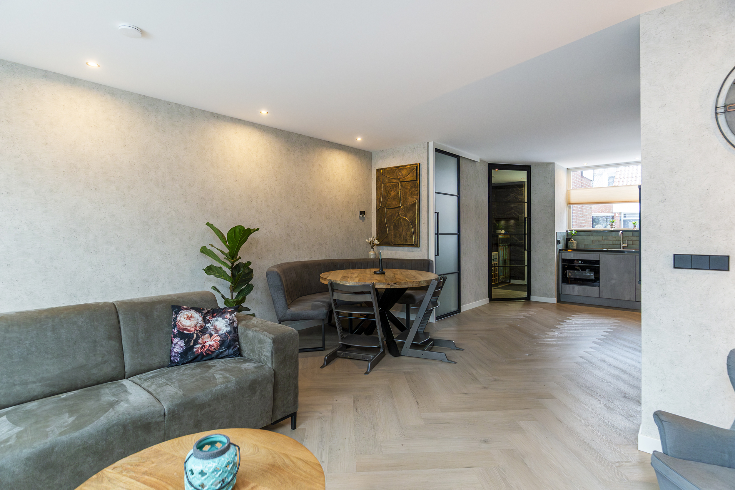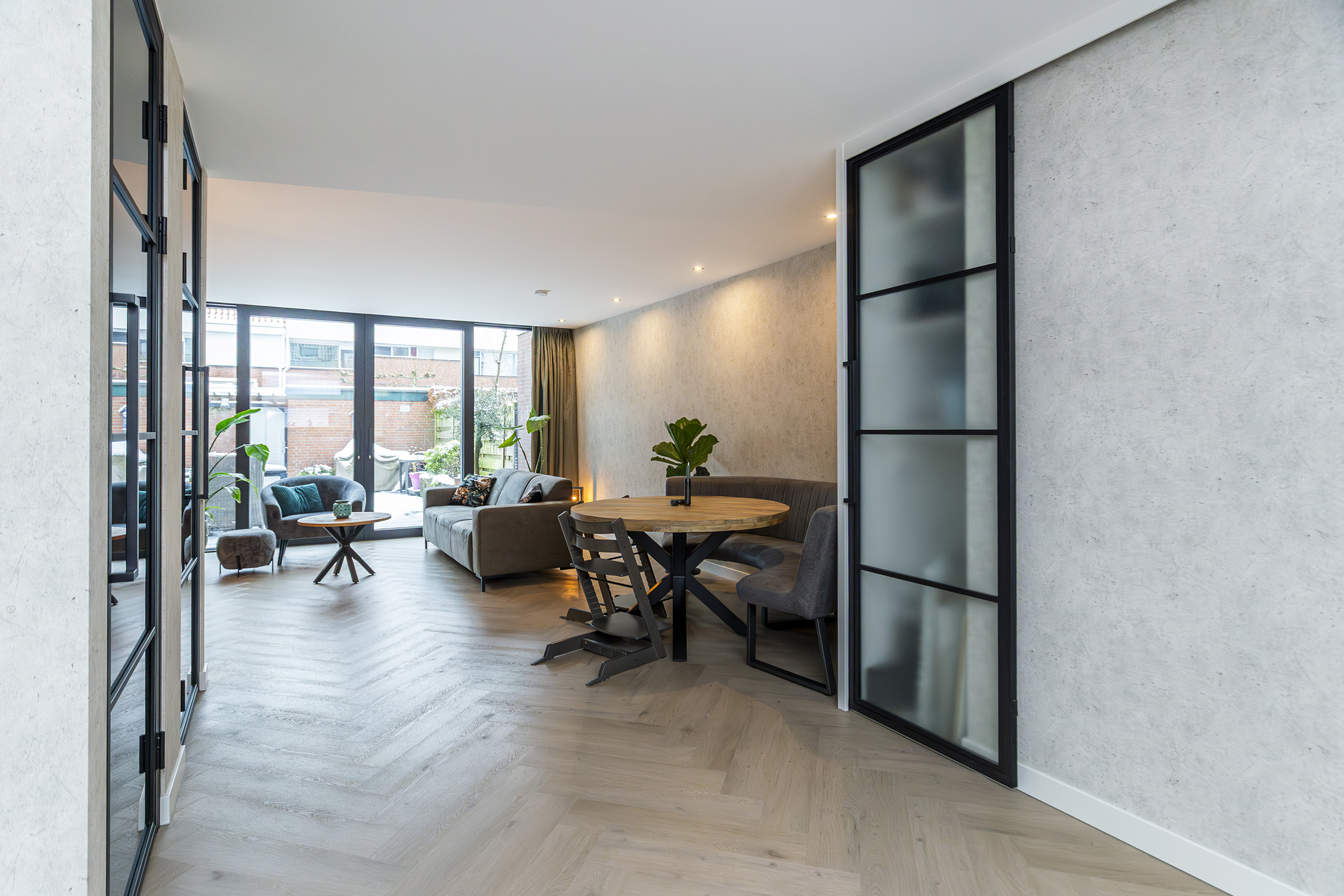 De begane grond van deze woning is in het najaar van 2024 grondig gerenoveerd en voorzien van hoogwaardige afwerkingen. De nieuwe, moderne keuken is uitgerust met inbouwapparatuur en biedt veel werkruimte. Verder is de vloer op de begane grond vervangen door een prachtige PVC vissengraatvloer, die samen met de vloerverwarming zorgt voor zowel luxe als comfort. Alle binnendeuren zijn vervangen door stijlvolle stalen deuren met glas, wat een industriële uitstraling geeft aan de ruimte. Het verlaagde plafond is voorzien van ingebouwde spots, wat zorgt voor een strakke, moderne sfeer. De grote glazen achterpui met triple glas en aluminium kozijnen biedt niet alleen veel daglicht, maar zorgt ook voor minder warmteverlies, wat bijdraagt aan de energiezuinigheid van de woning. Vanuit de lichte woonkamer heb je toegang tot de onderhoudsvriendelijke achtertuin, een fijne plek om te ontspannen. Achterin de tuin staat een praktische berging en is er een achterom. De trap naar de eerste verdieping is toegankelijk via een smaakvolle stalen deur, die de industriële uitstraling van de begane grond verder versterkt.