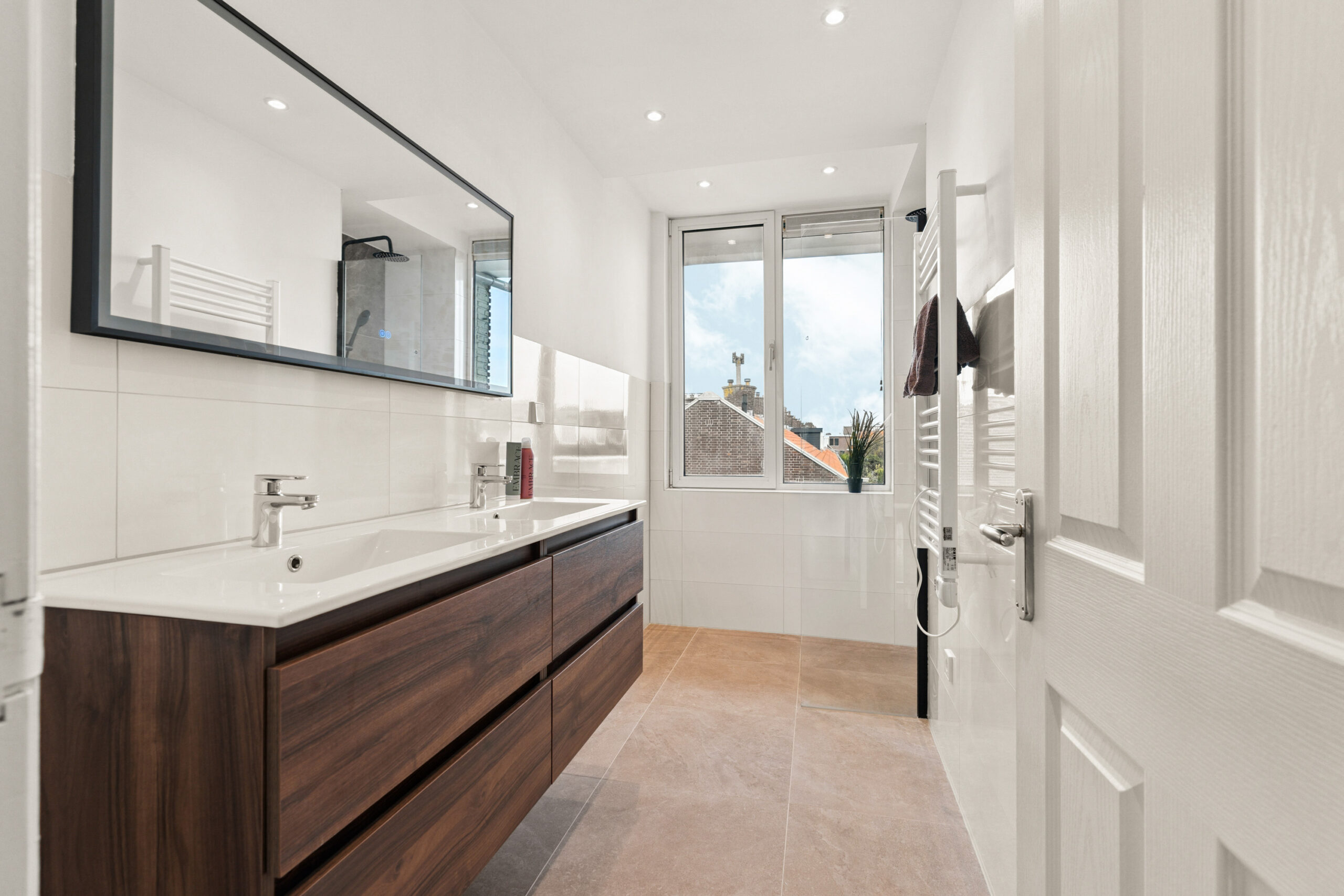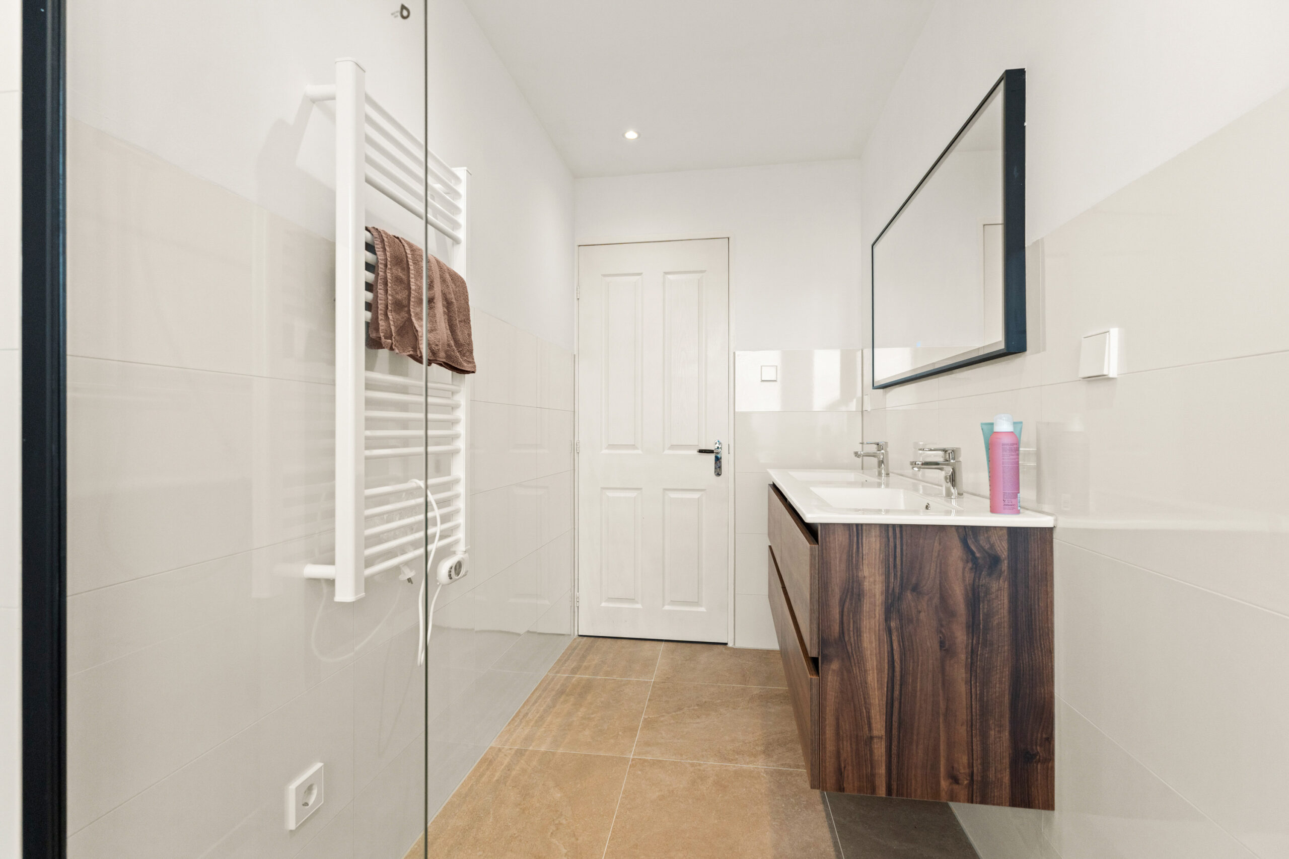 De luxe badkamer is uitgevoerd met mooie grote tegels, spotjes en is erg licht door een groot raam. De badkamer beschikt over een ruime inloopdouche, een dubbele wastafel met veel opbergruimte, een grote spiegel met geïntegreerde verlichting en een elektrische handdoekradiator. Het toilet is apart gesitueerd en beschikt tevens over een fonteintje.
