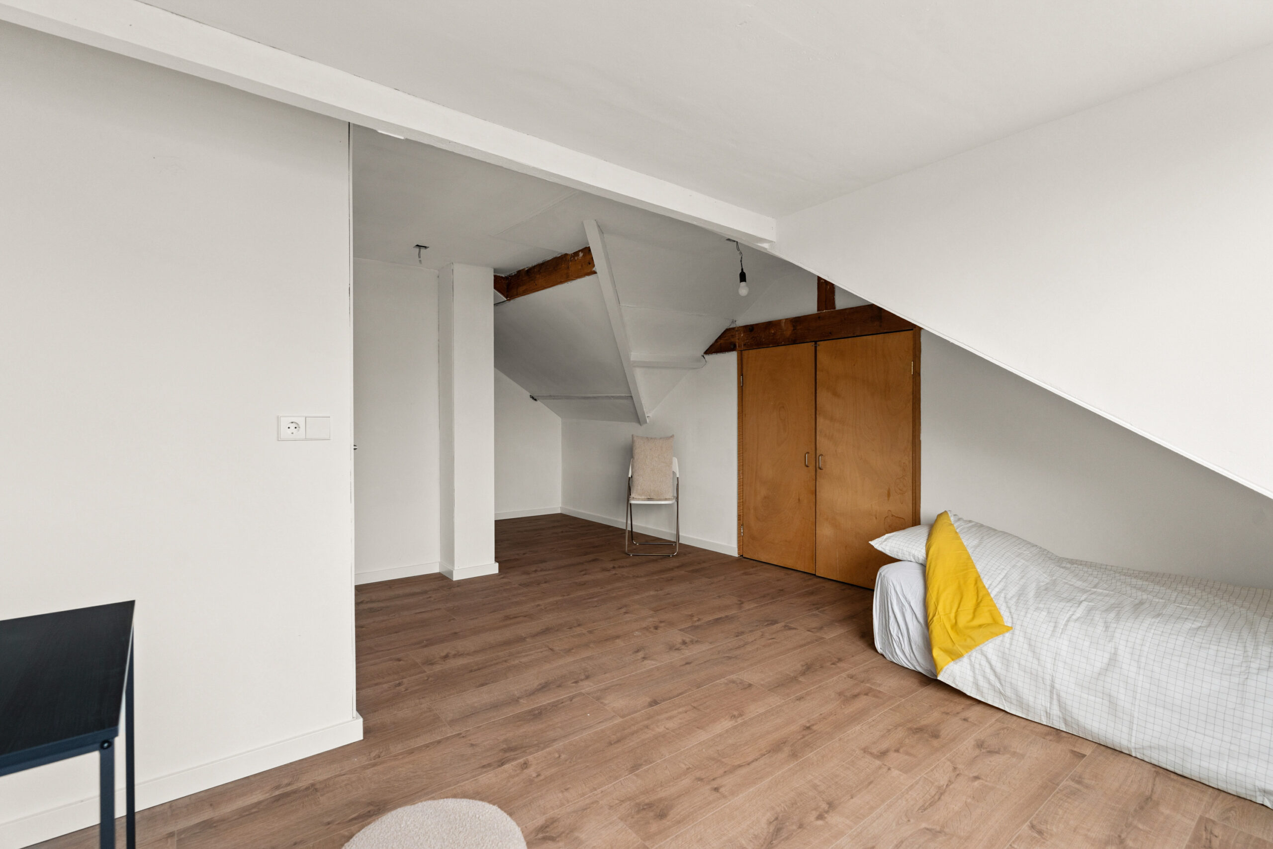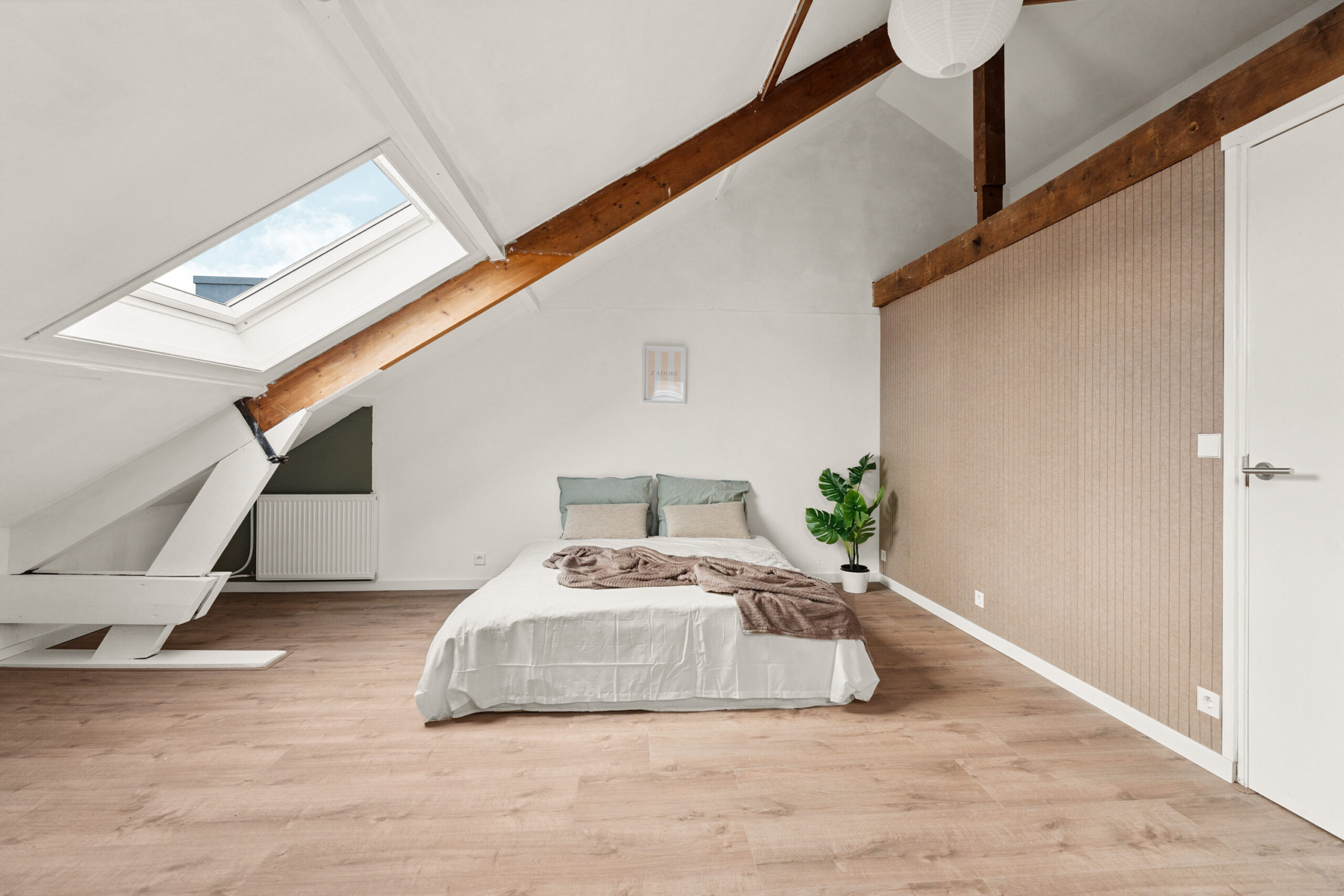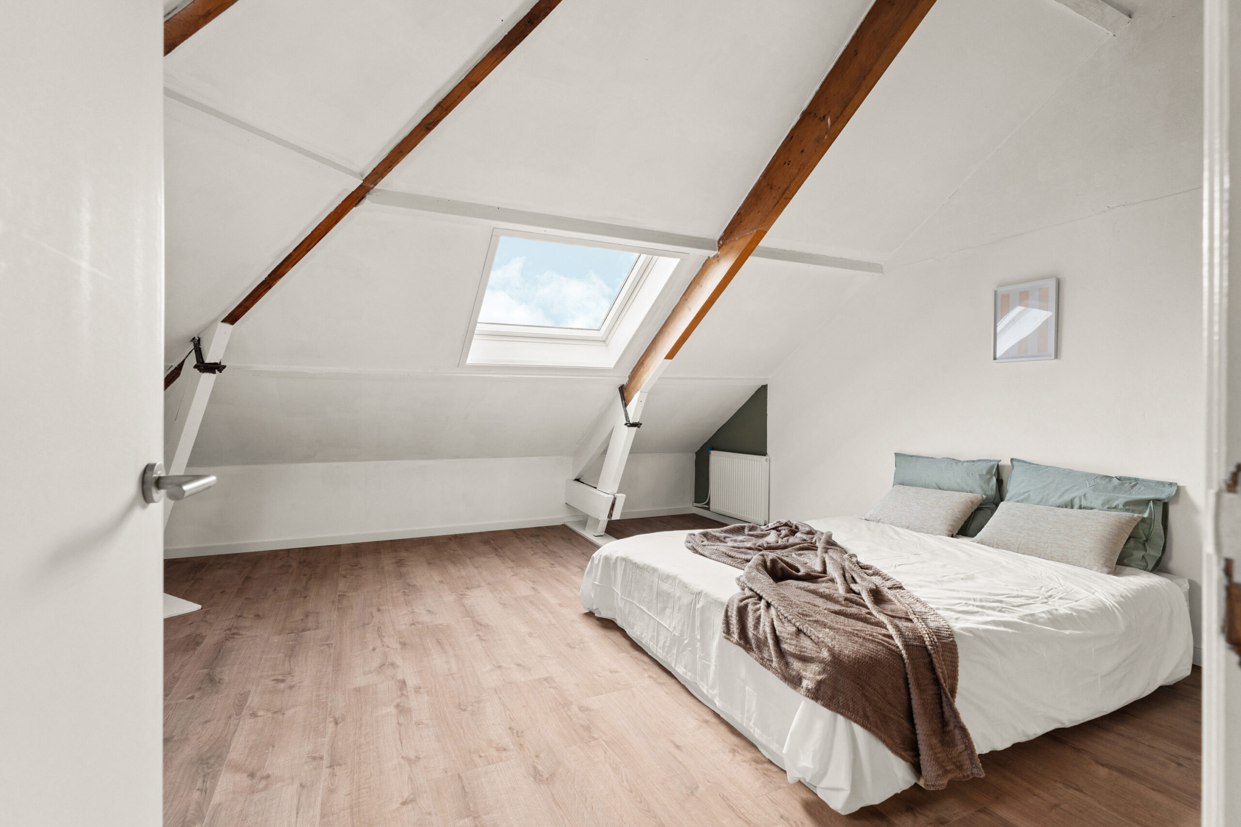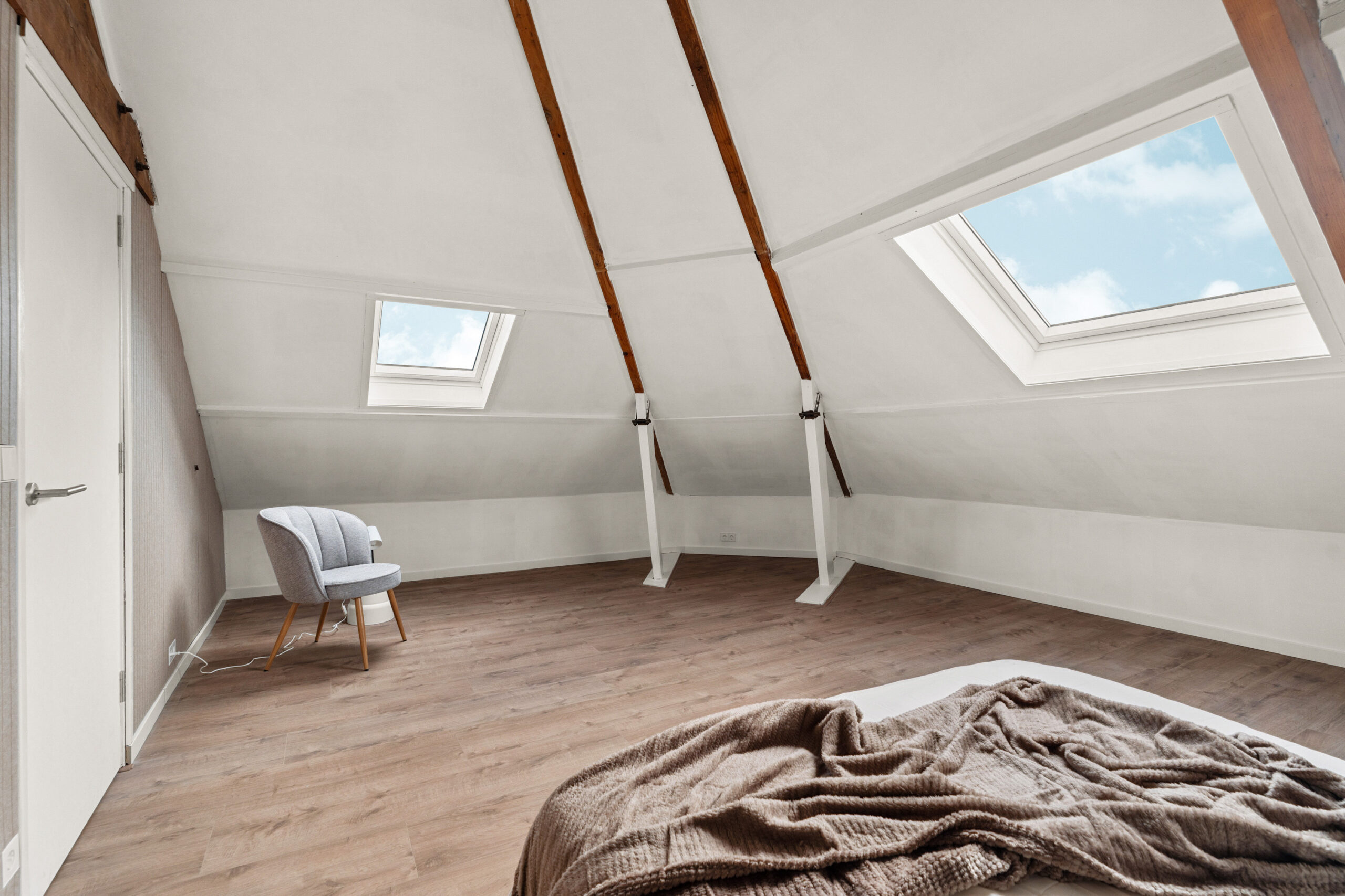 Op de bovenste verdieping bevinden zich nog eens twee royale slaapkamers en een handige berging. De schuine wanden en zichtbare dakconstructie geven deze kamers een charmante en unieke uitstraling. Dankzij de dakramen is er ook hier veel lichtinval. In de grootste slaapkamer met dakkapel bevindt zich een toegangsdeur naar de berging.