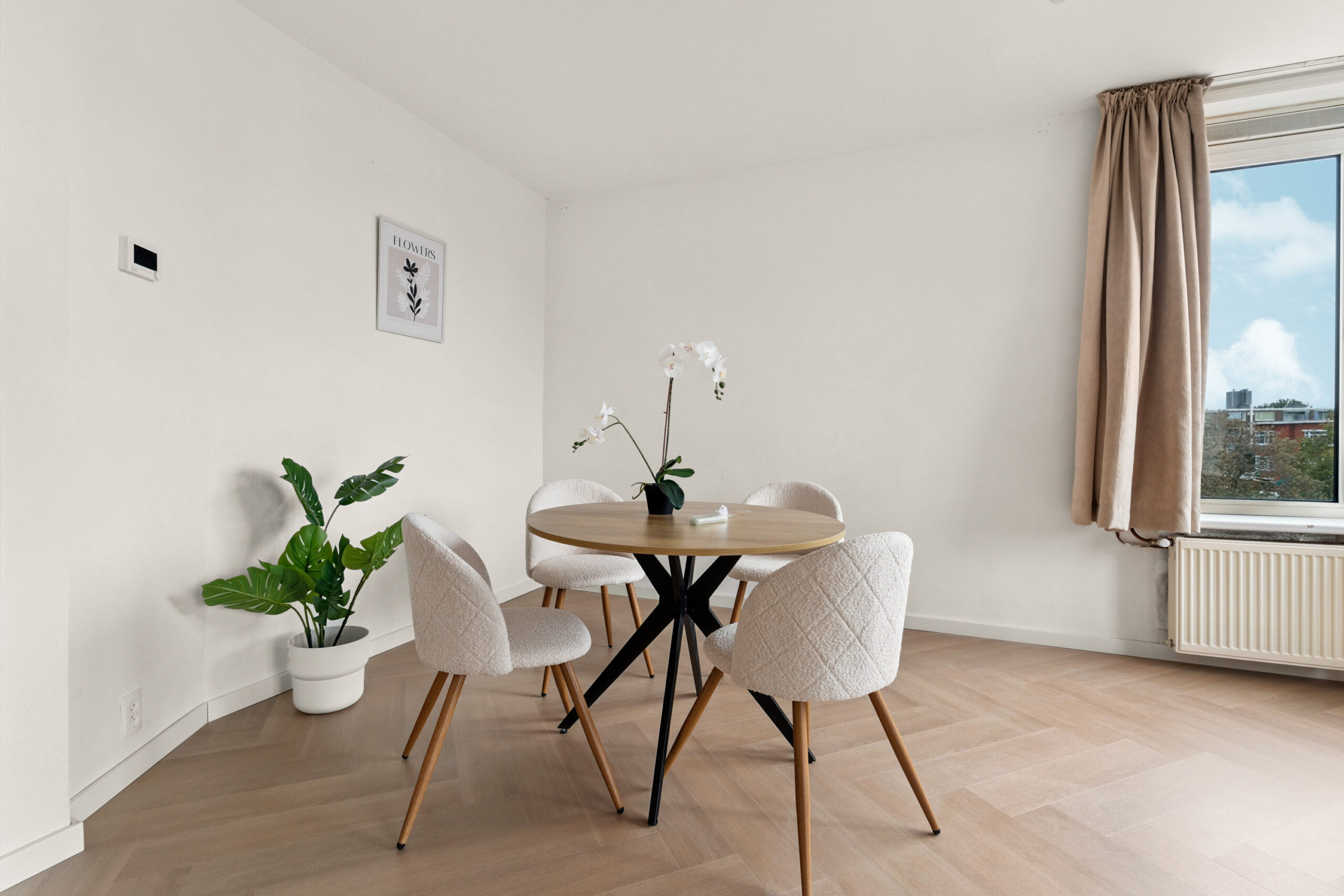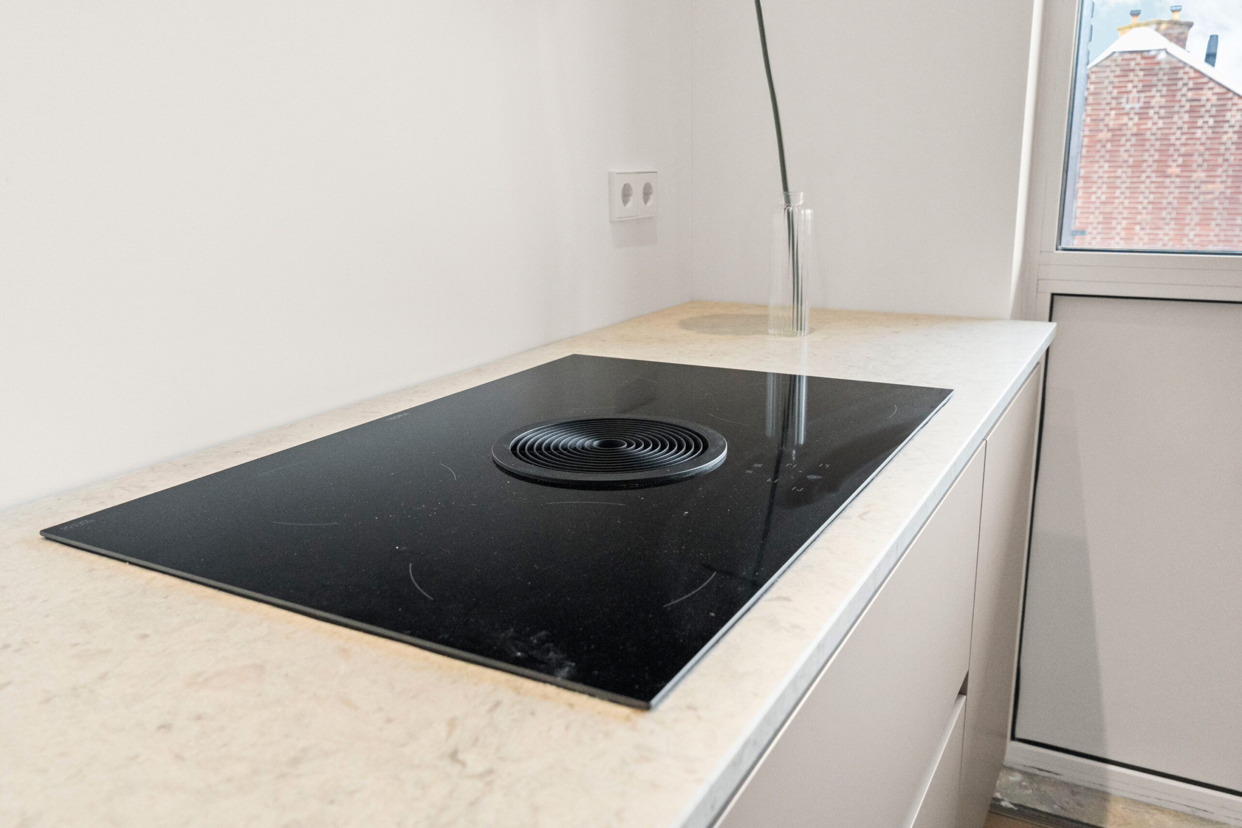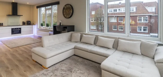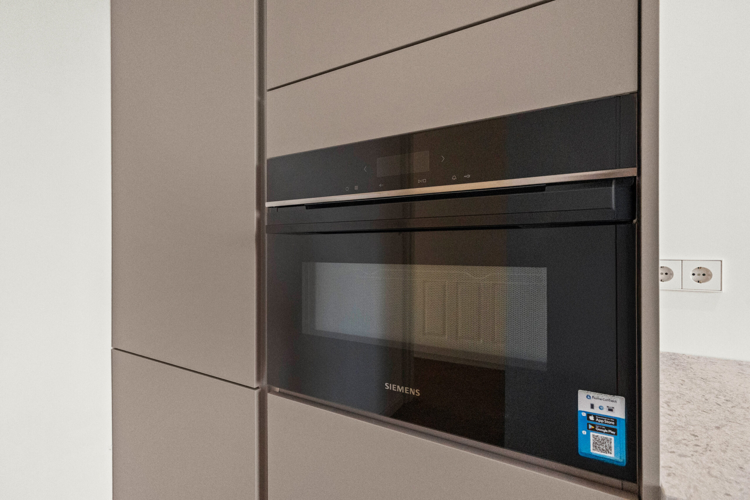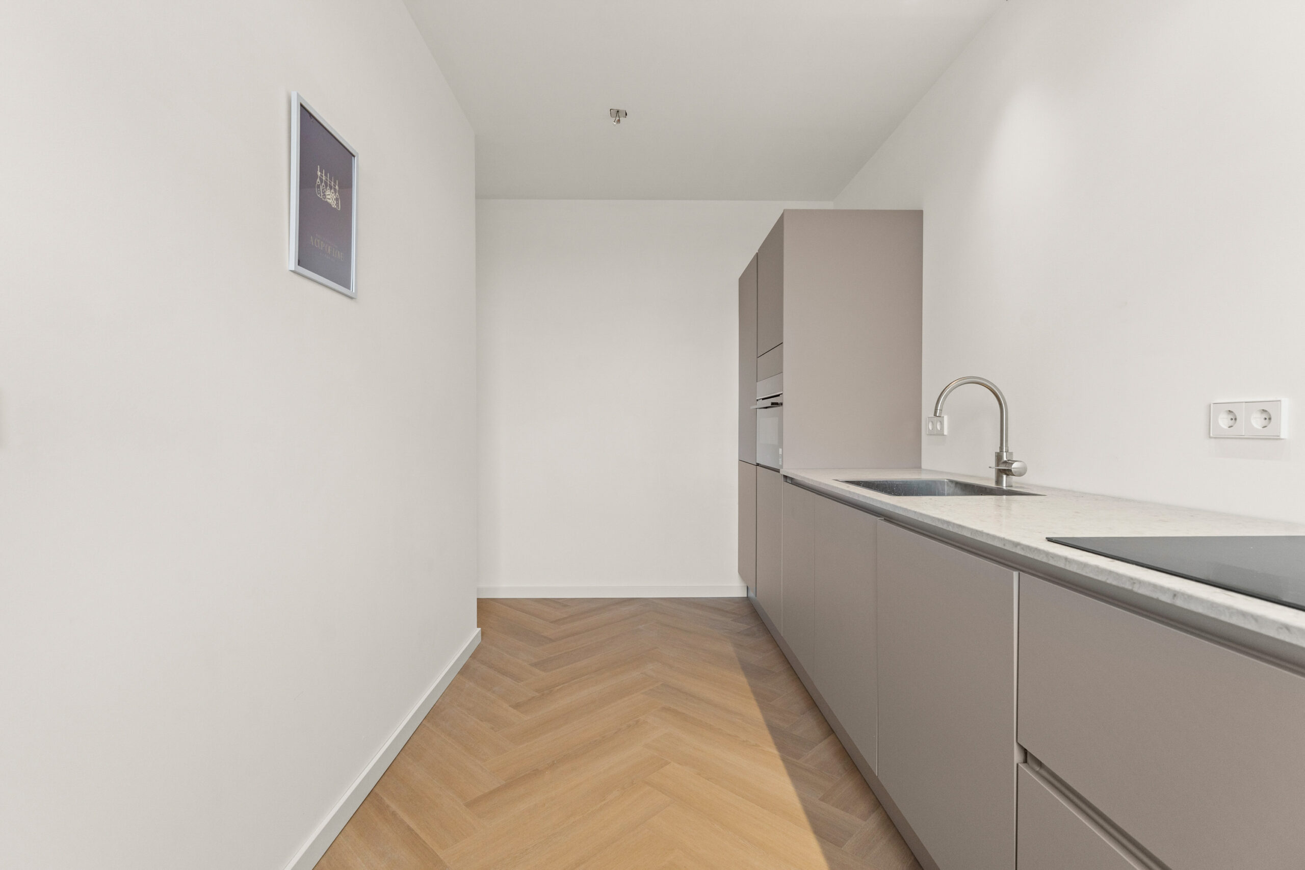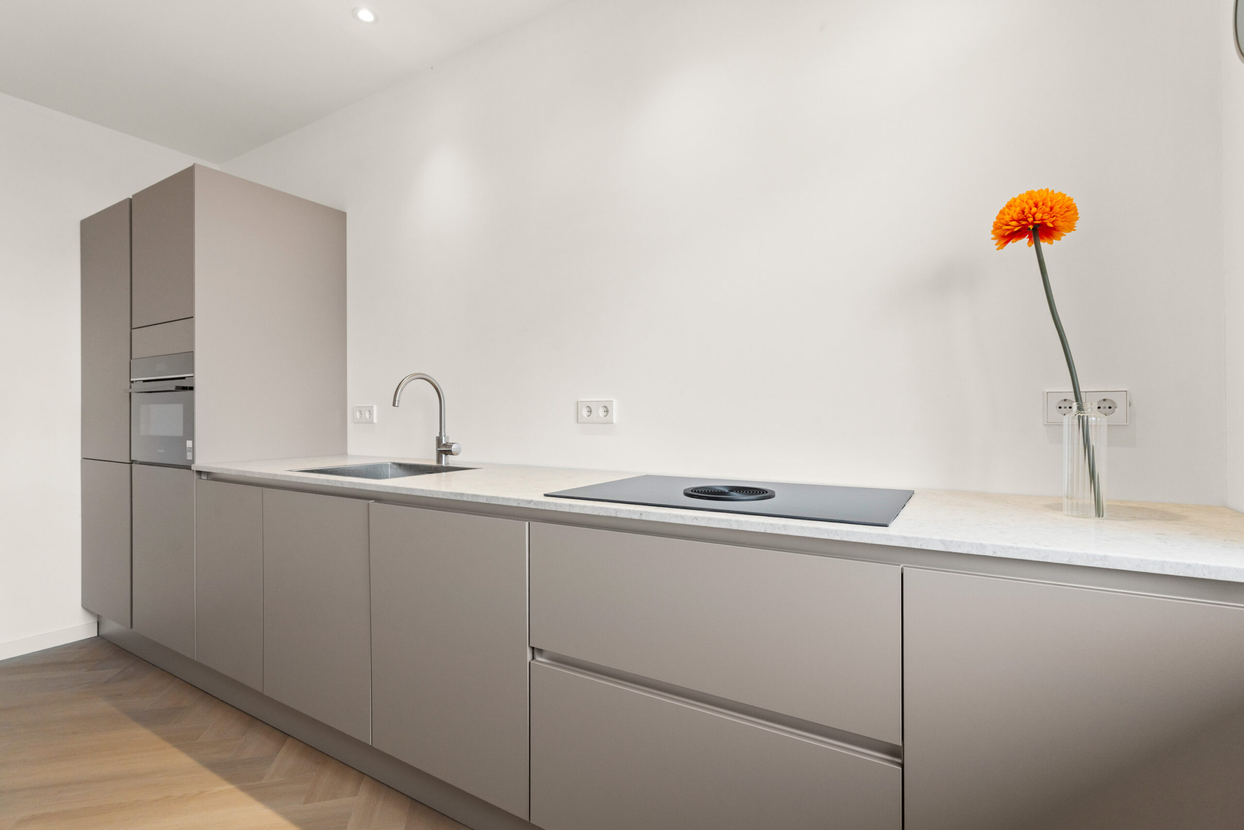 De moderne keuken bevindt zich aan de andere zijde van de woning en is uitgerust met diverse nieuwe inbouwapparatuur, waaronder een inductiekookplaat met geïntegreerde afzuiging en een combi-oven/magnetron. Vanuit de keuken heb je toegang tot een balkon van circa 3 m², perfect voor een ochtendkoffie of een moment van rust in de buitenlucht.