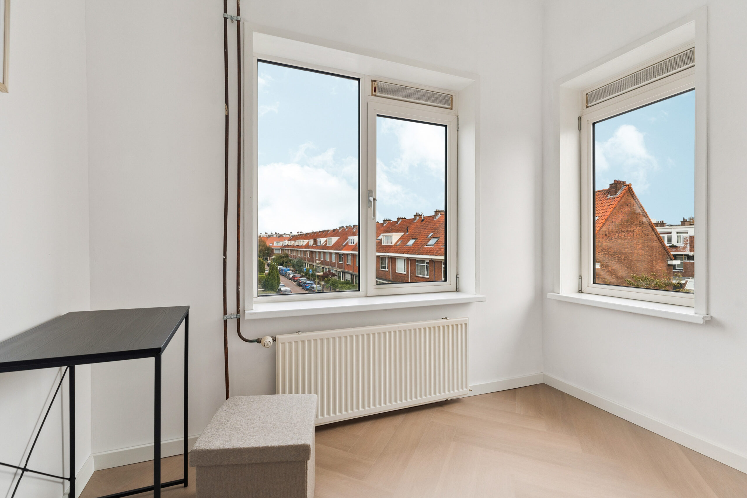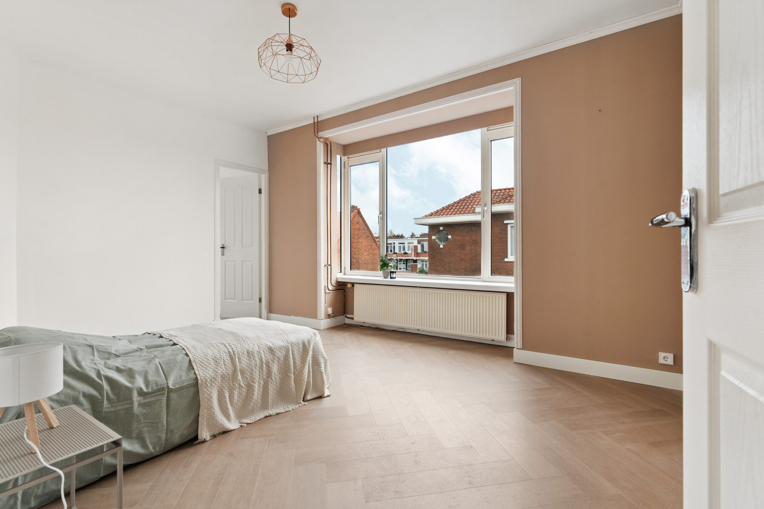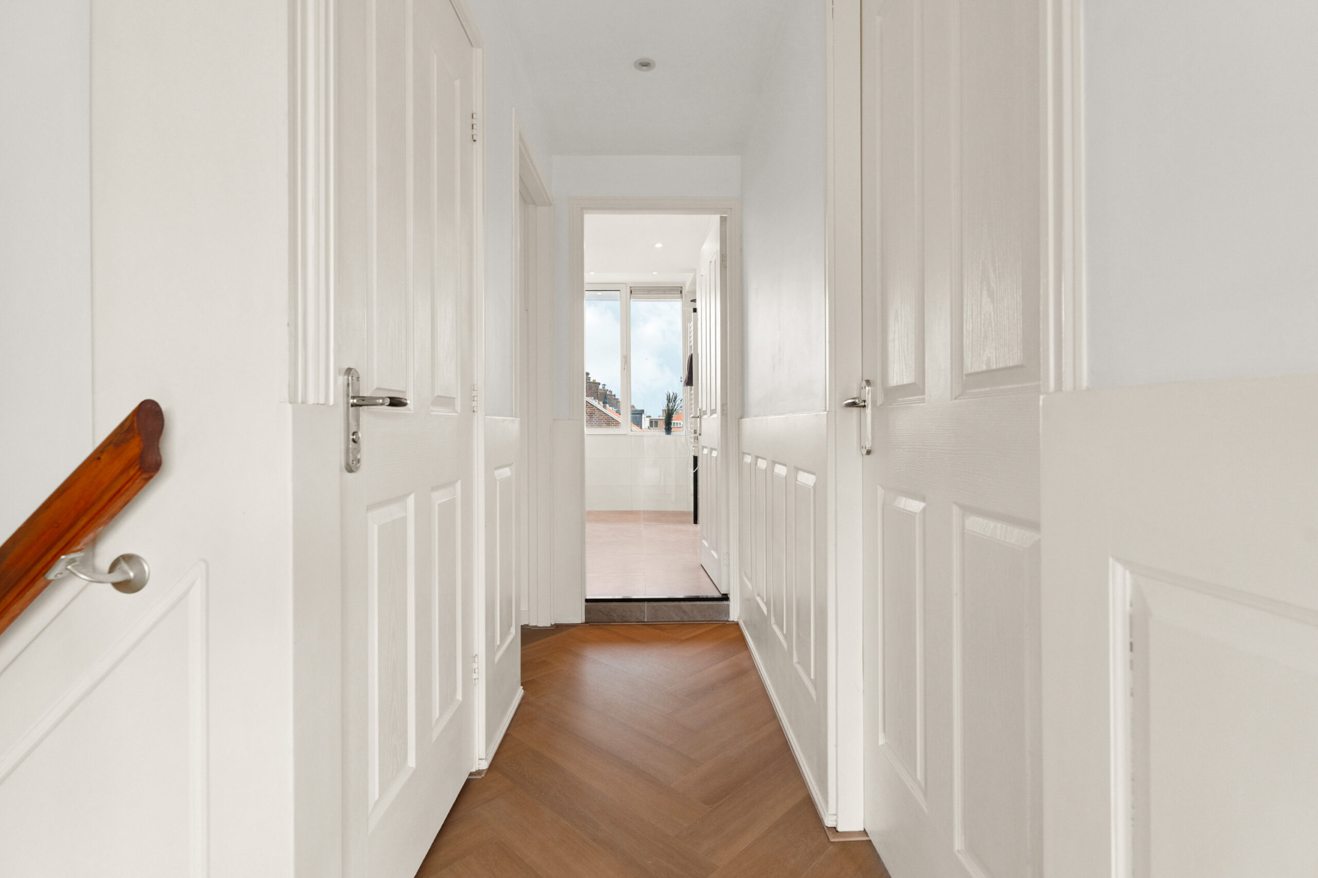 Op deze woonlaag bevinden zich ook twee slaapkamers. De royale hoofdslaapkamer is toegankelijk via de overloop en biedt dankzij de grote raampartijen veel natuurlijk licht. Daarnaast is de kamer voorzien van een ruime, praktische inbouwkast. Aansluitend ligt een tweede, kleinere kamer die via de hoofdslaapkamer te bereiken is. Perfect te gebruiken als kinderkamer, thuiswerkplek of walk-in closet.