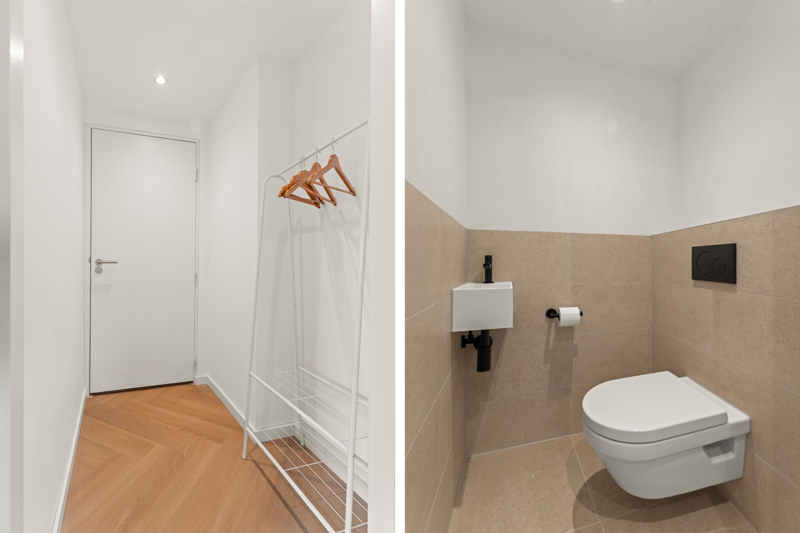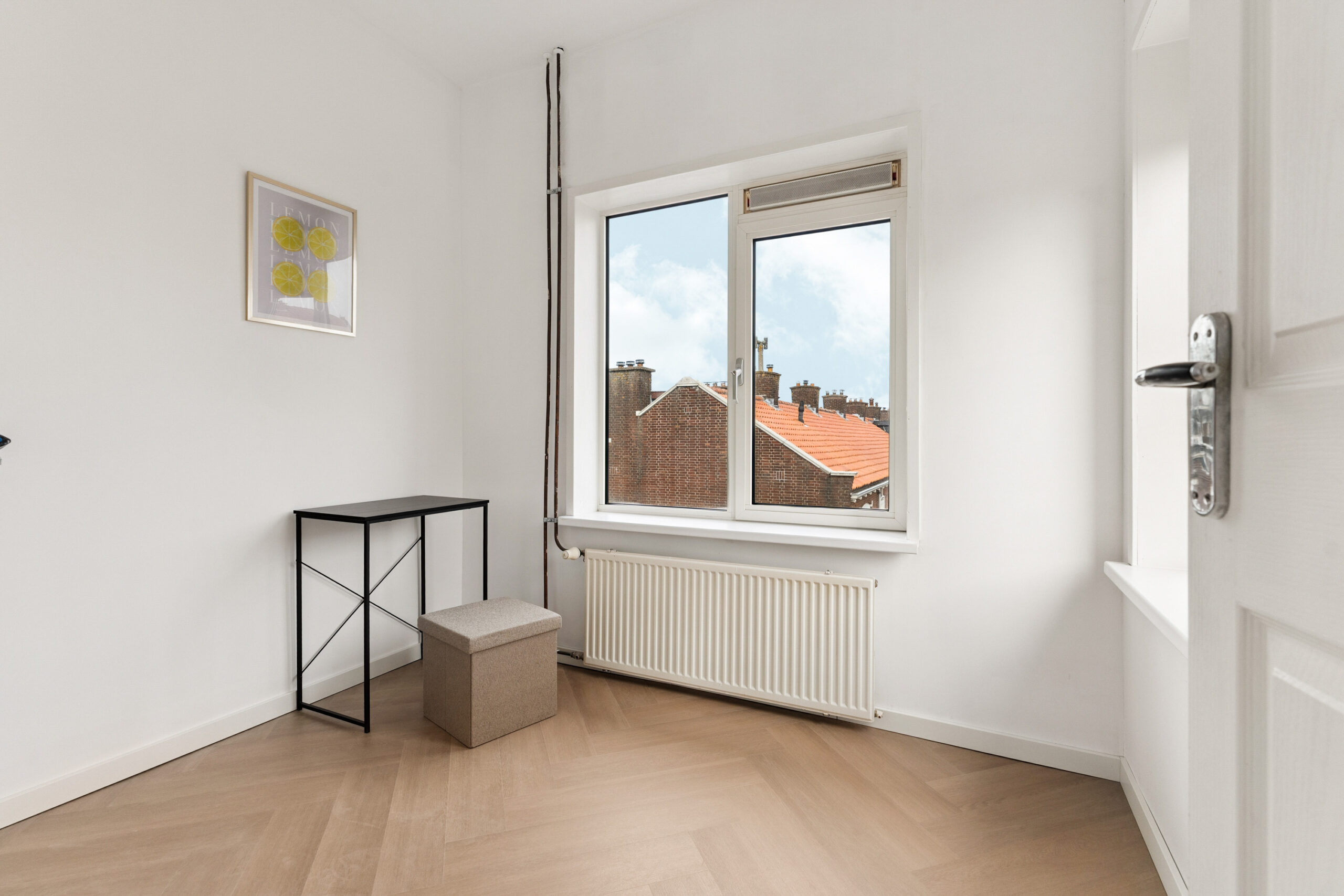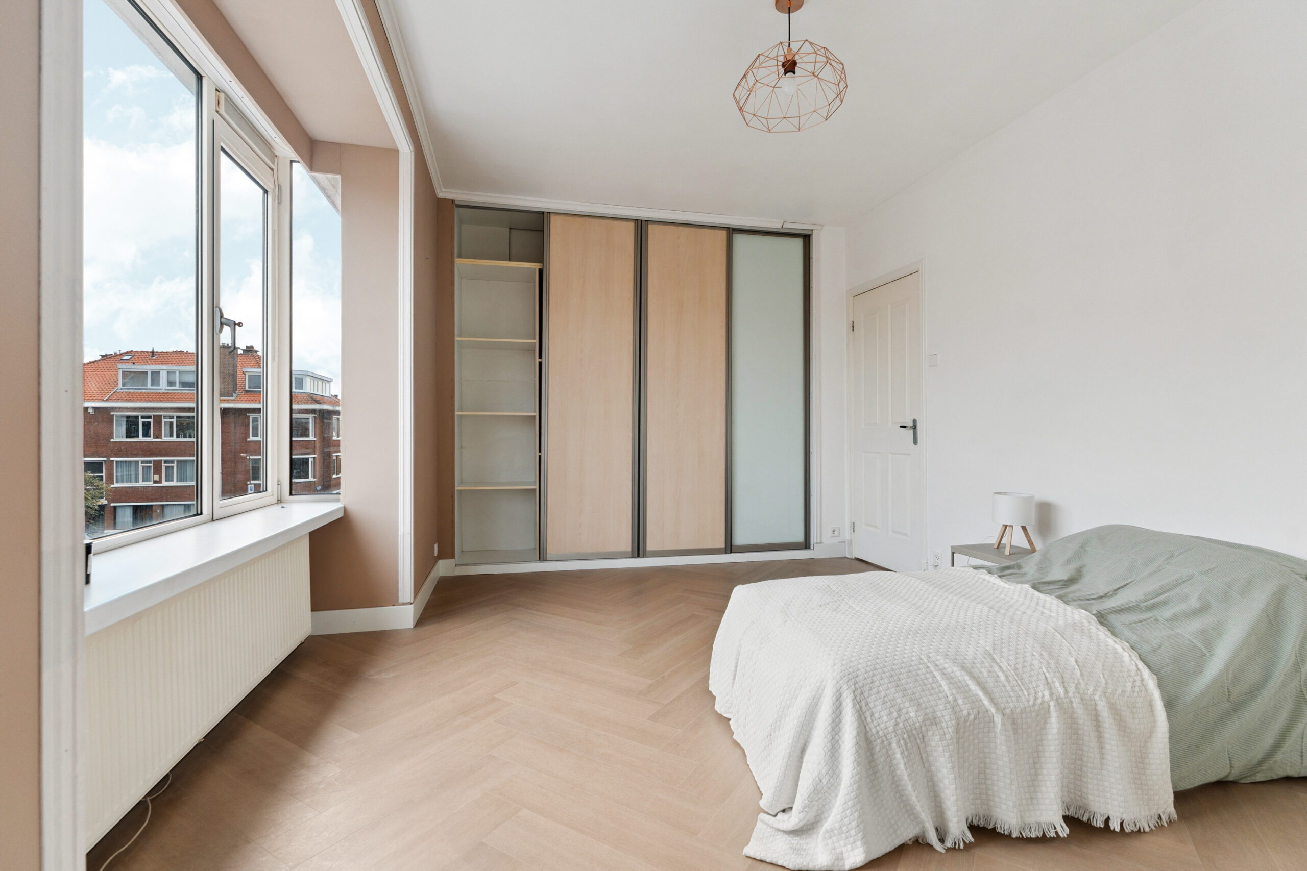 Op deze woonlaag bevinden zich ook twee slaapkamers. De royale hoofdslaapkamer is toegankelijk via de overloop en biedt dankzij de grote raampartijen veel natuurlijk licht. Daarnaast is de kamer voorzien van een ruime, praktische inbouwkast. Aansluitend ligt een tweede, kleinere kamer die via de hoofdslaapkamer te bereiken is. Perfect te gebruiken als kinderkamer, thuiswerkplek of walk-in closet.