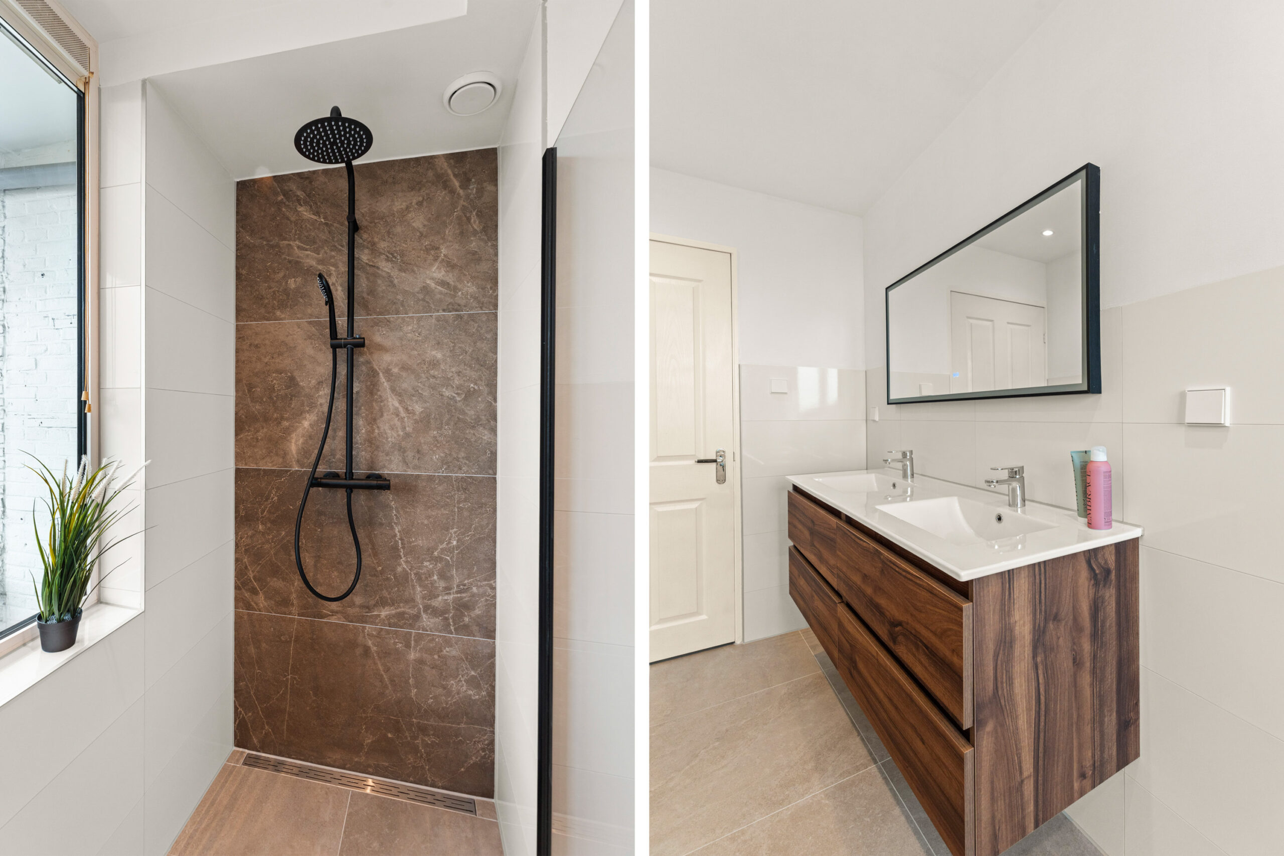 - Badkamervoorzieningen Dubbele wastafel, wastafelmeubel, inloopdouche