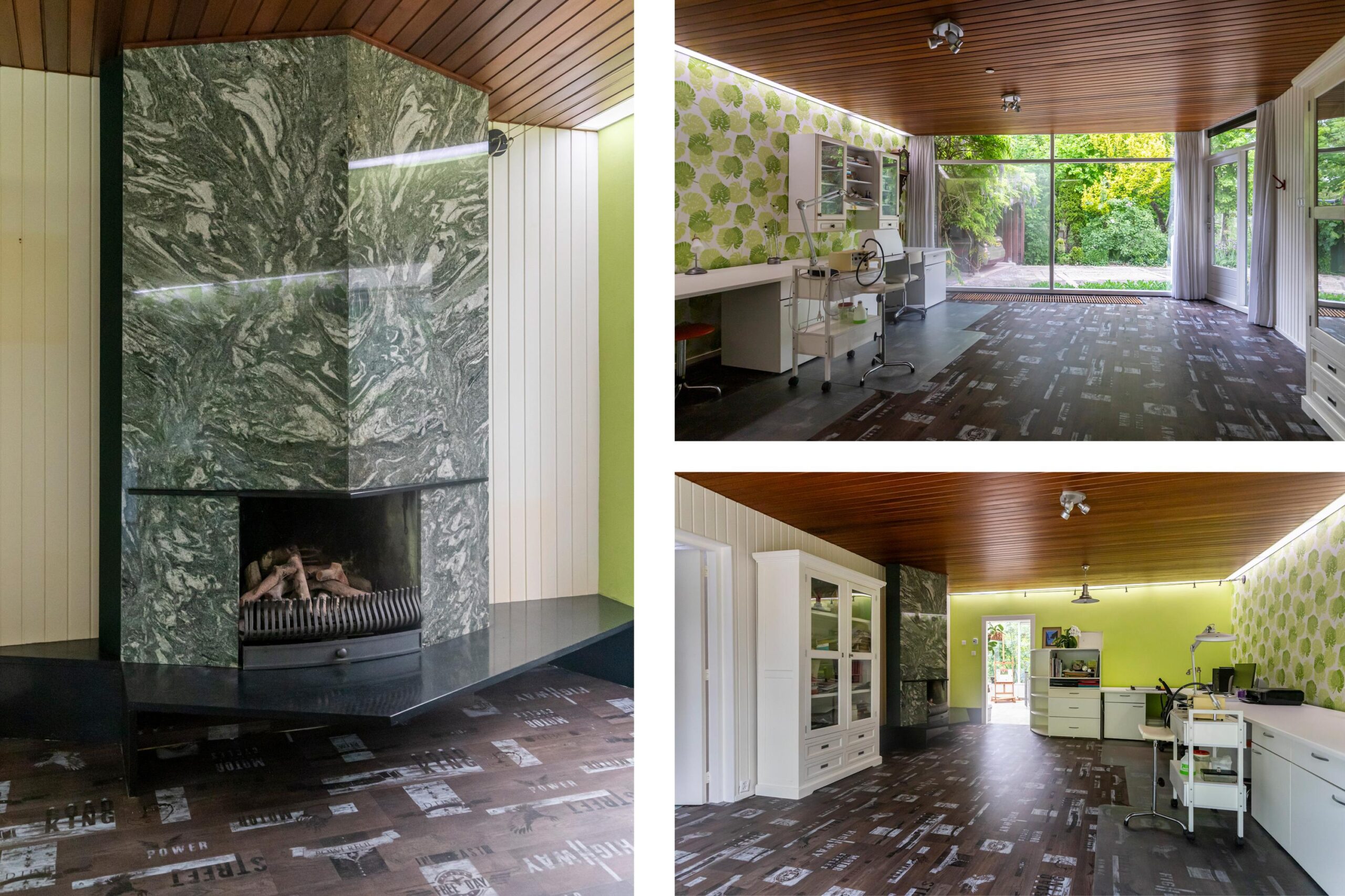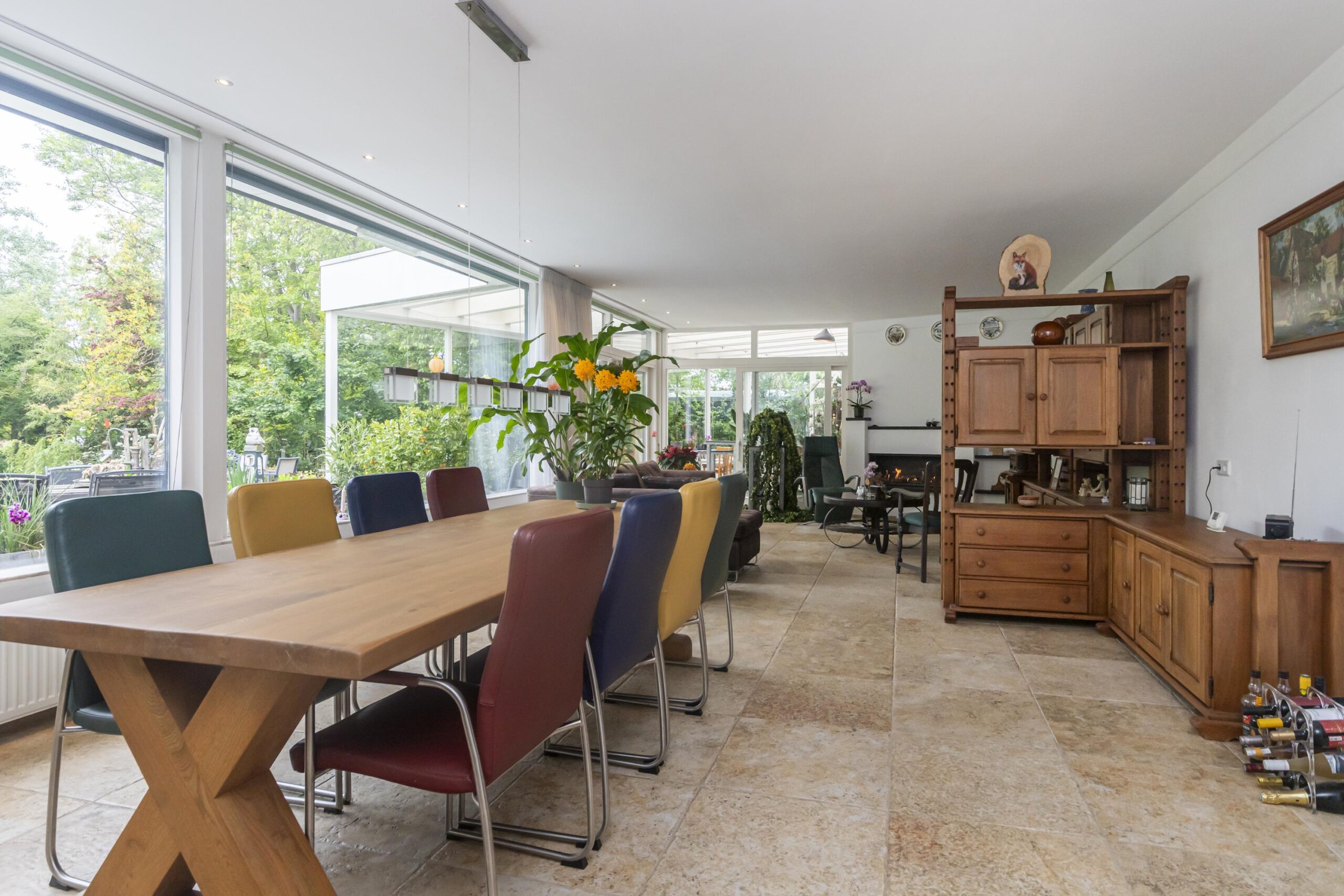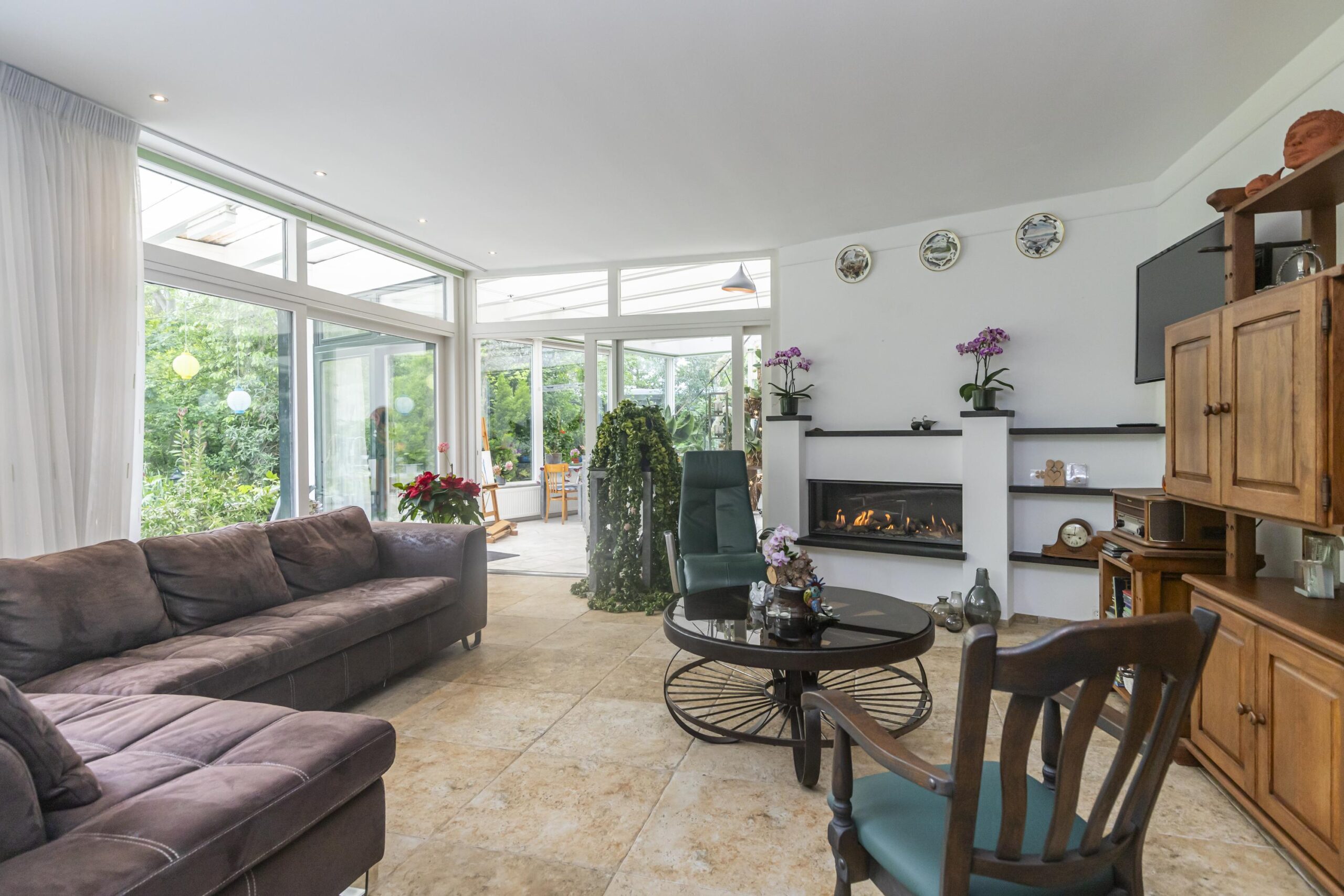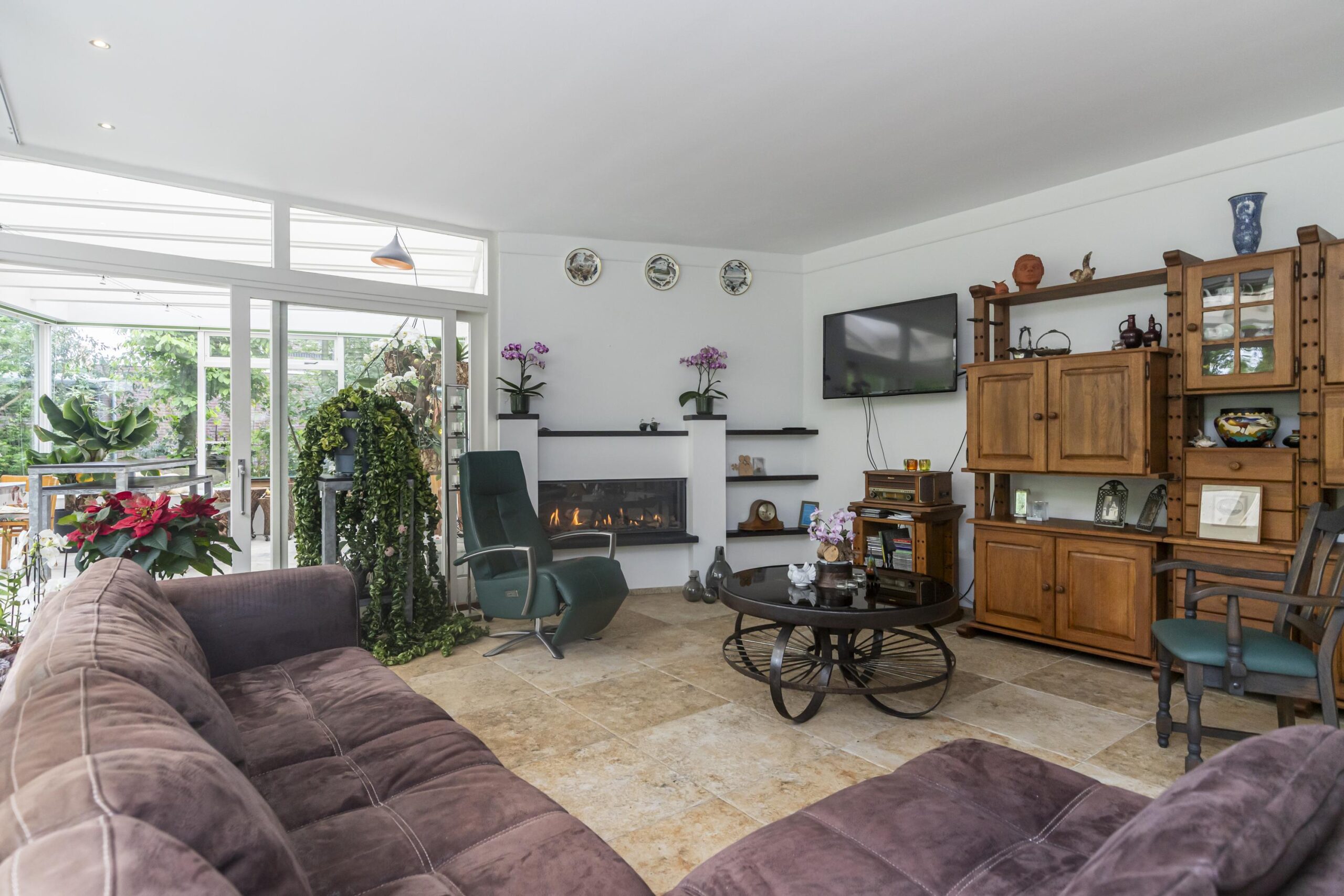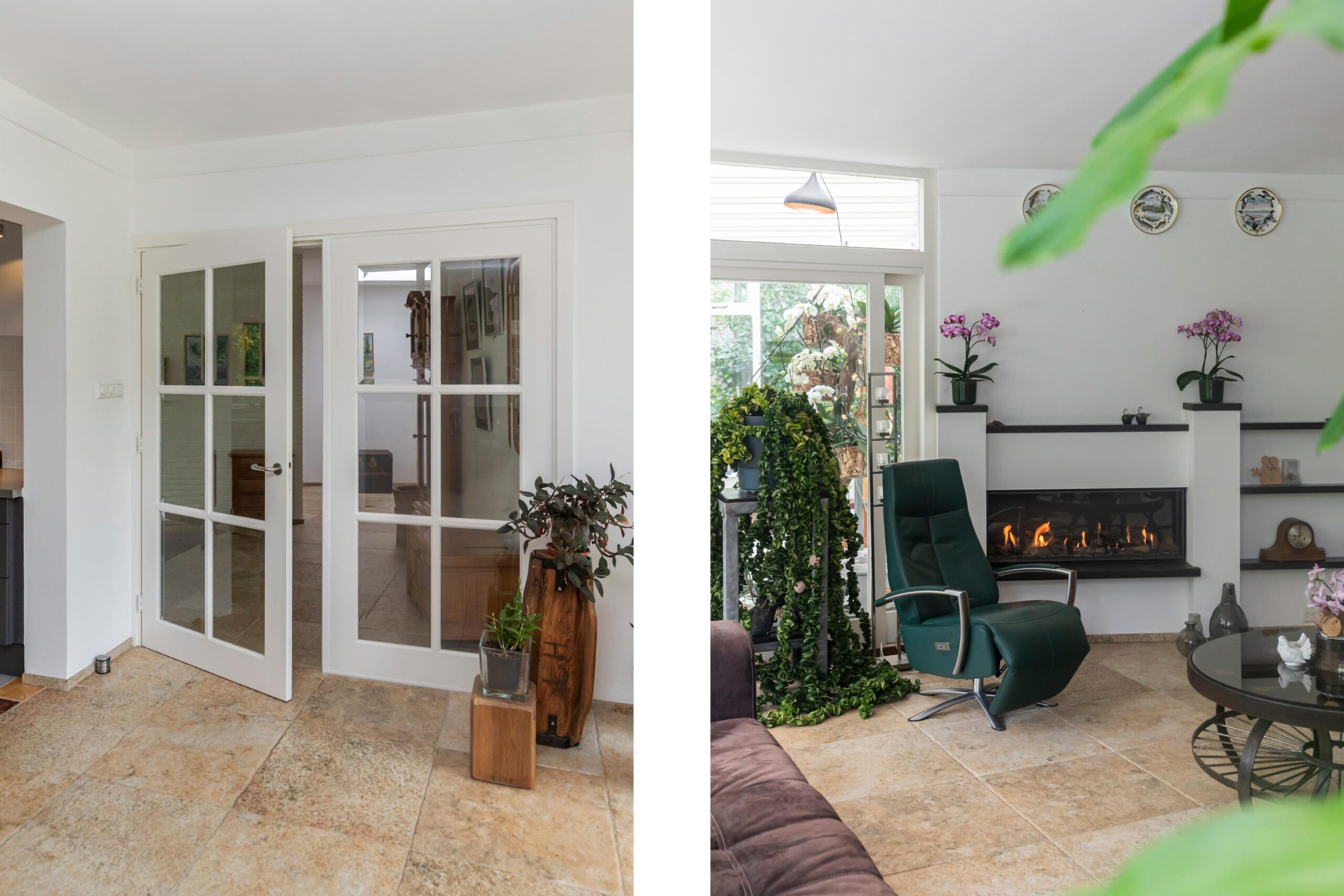 Aan de rechterkant van de hal is een ruime eethoek, waar je een grote eettafel kunt plaatsen, perfect voor gezellige diners met familie en vrienden. De woonkamer, die naast de eetruimte ligt, is bijzonder licht door de grote raampartijen en biedt een fijne, open sfeer. In de woonkamer vind je een gashaard, die zorgt voor extra warmte en gezelligheid.