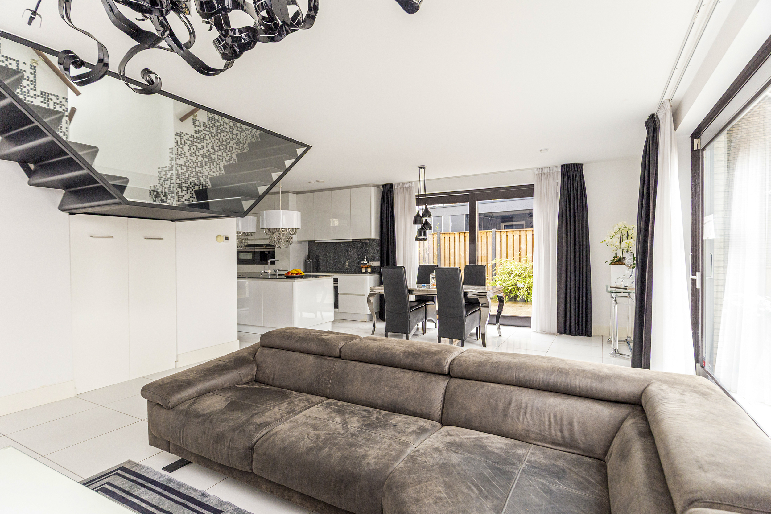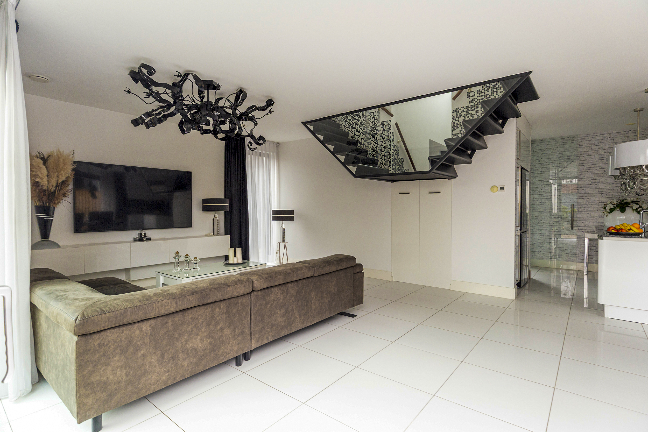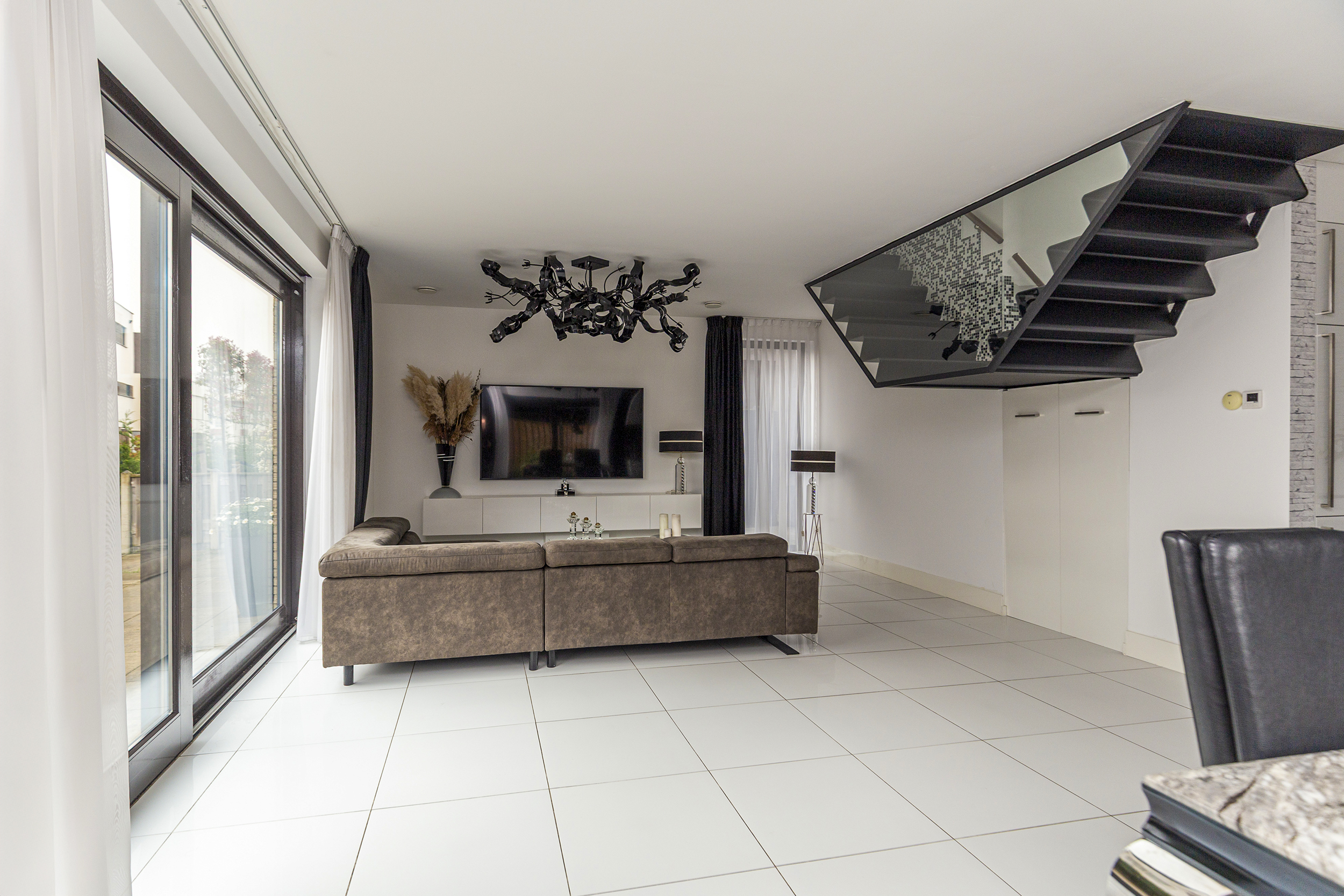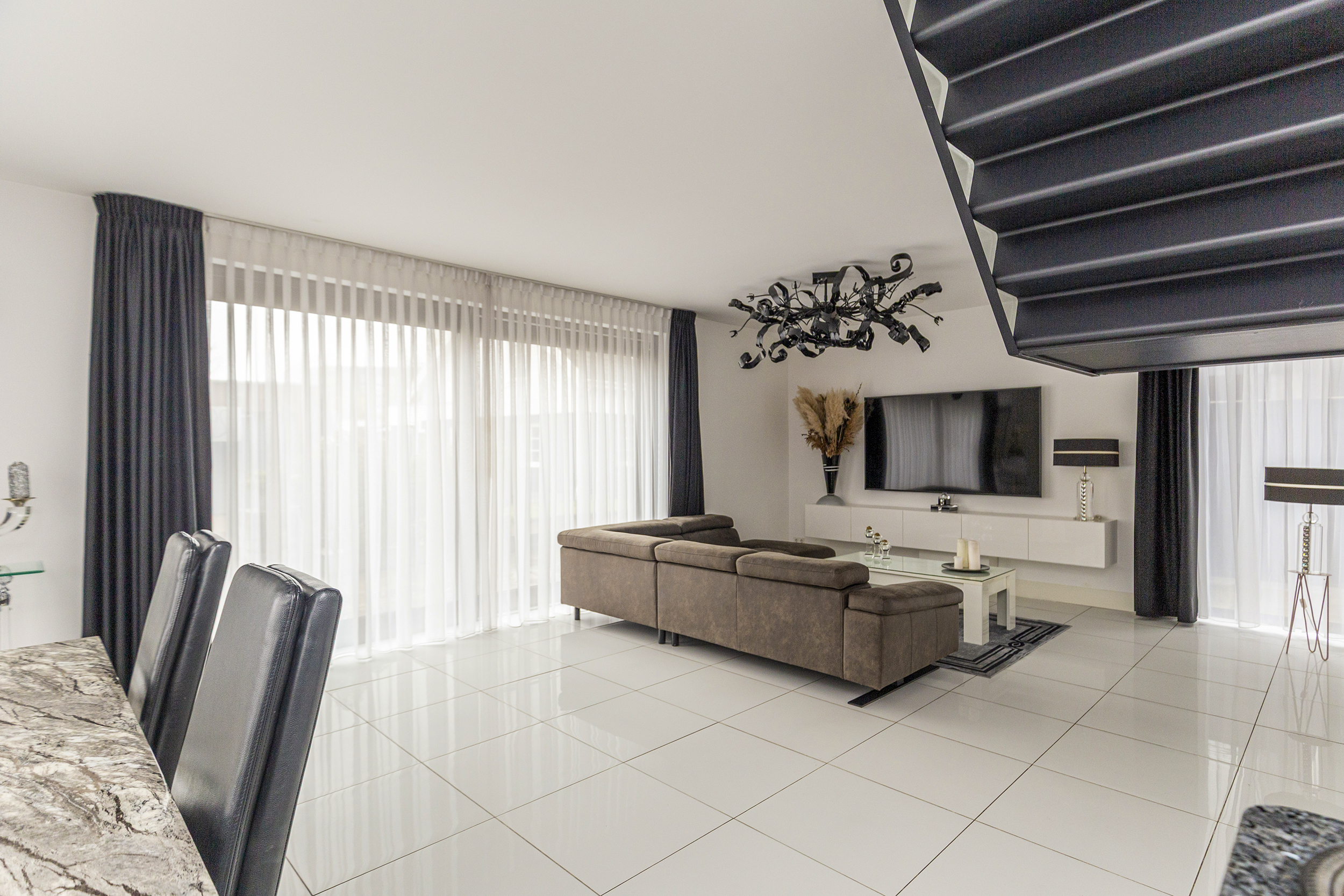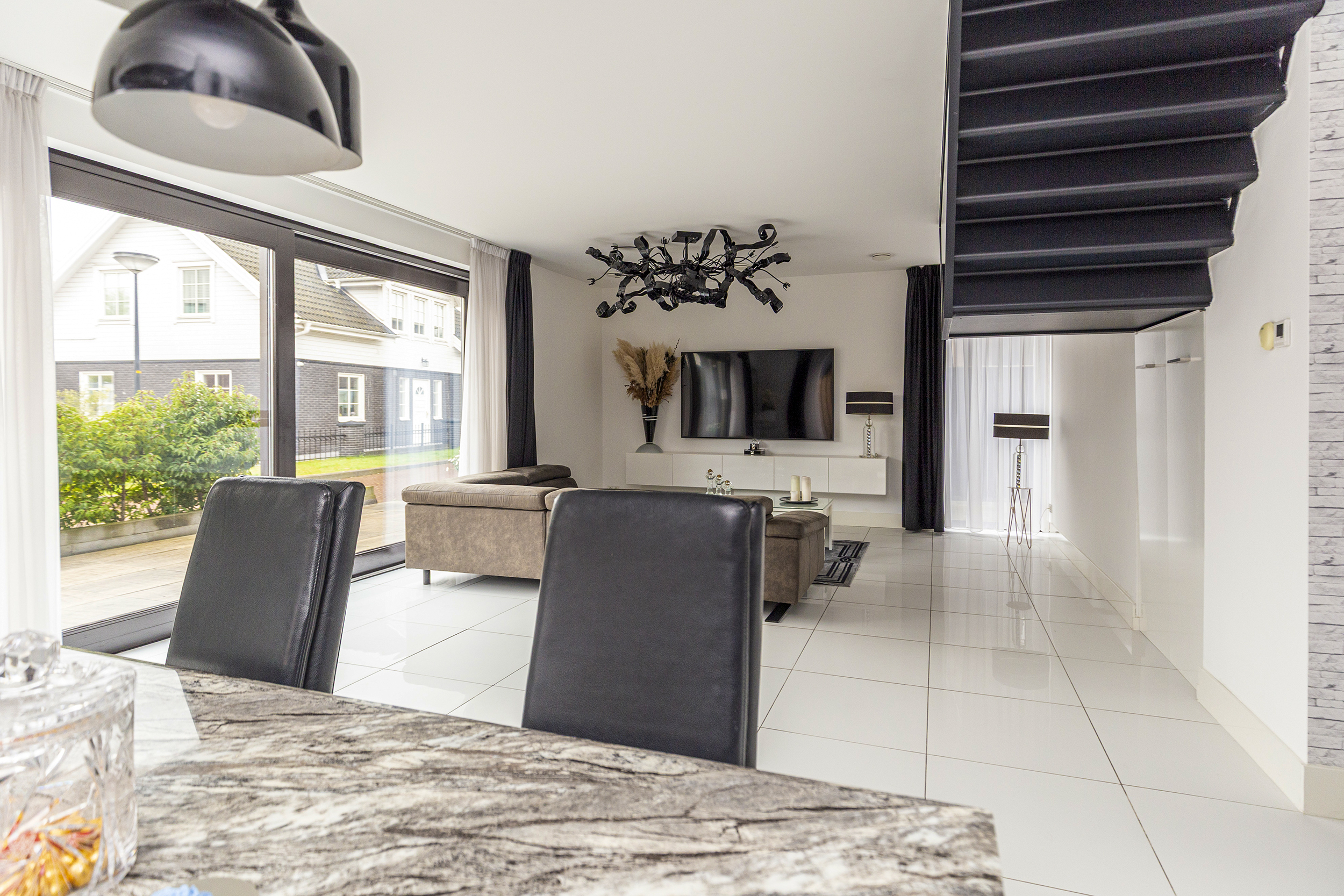 Via de entree stap je binnen in de hal. Hier vind je een luxe, volledig betegeld toilet met fonteintje, de meterkast en een technische ruimte met warmtepomp, WTW-installatie en praktische bergruimte. Vanuit de hal loop je direct door naar de open keuken. De keuken is strak uitgevoerd en ingericht met een kookeiland en Siemens inbouwapparatuur: een combi-oven/magnetron, aparte oven, 5-pits inductiekookplaat, vaatwasser, koel-/vriescombinatie en een kokend waterkraan. Een fijne plek om te koken en samen te komen. Aansluitend ligt de lichte woon- en eetkamer. Dankzij de grote raampartijen valt er veel daglicht naar binnen en heb je mooi zicht op de tuin rondom de woning. De ruimte is ruim opgezet en flexibel in te delen. De unieke steektrap vormt een echte blikvanger in de woonkamer en brengt je naar de verdieping.