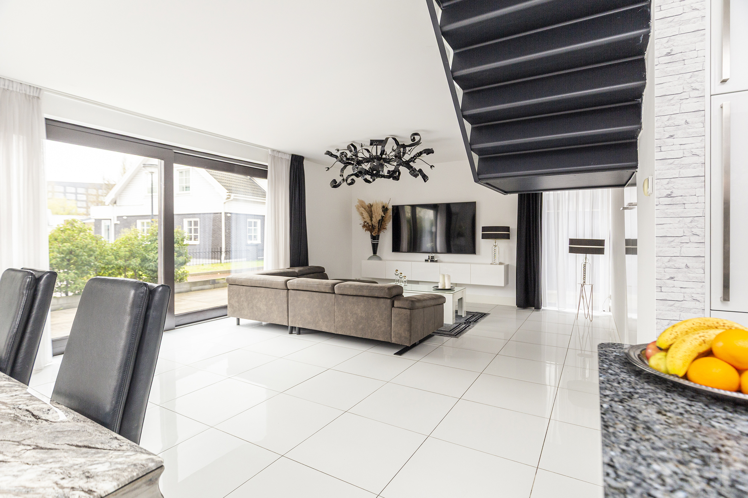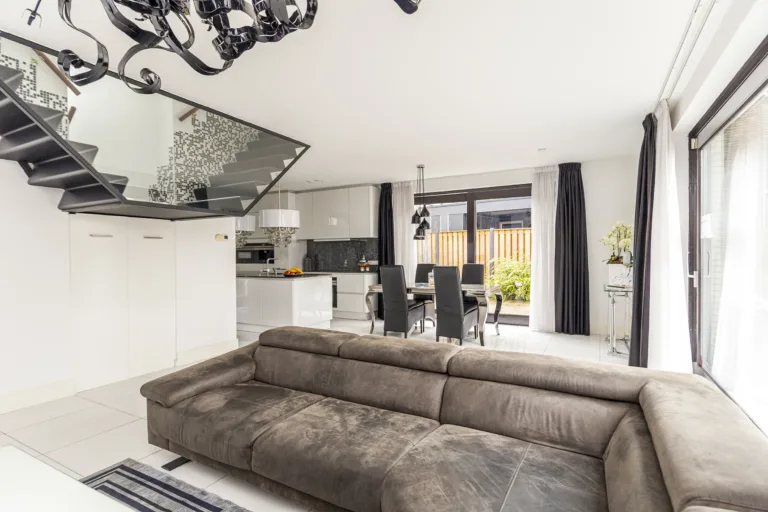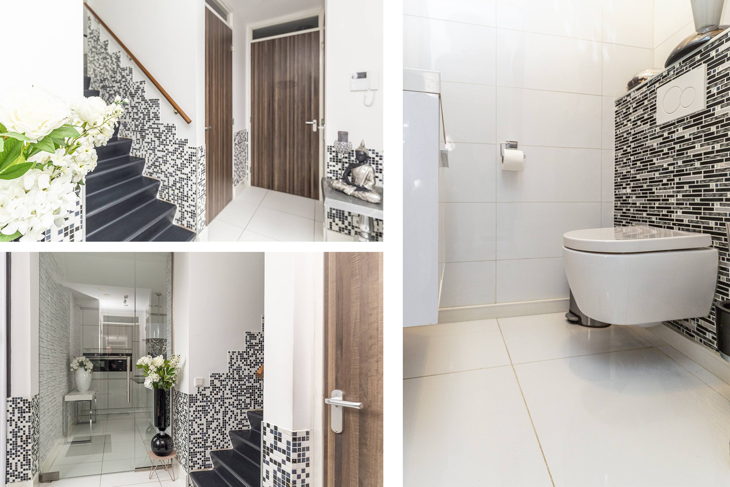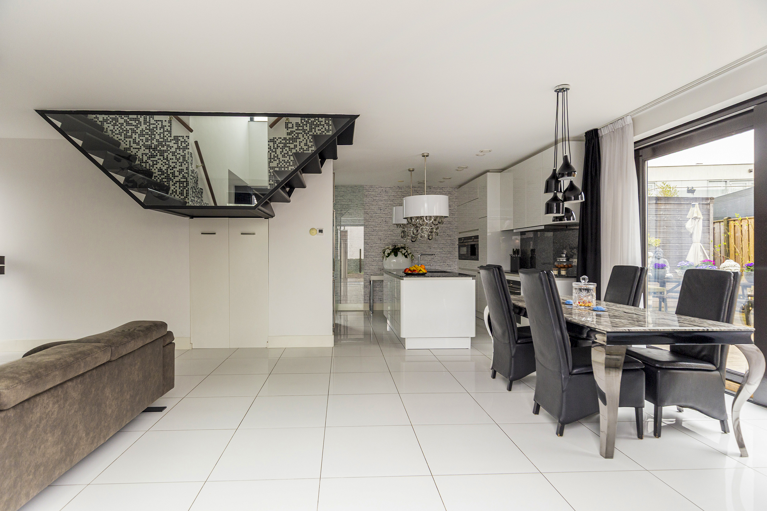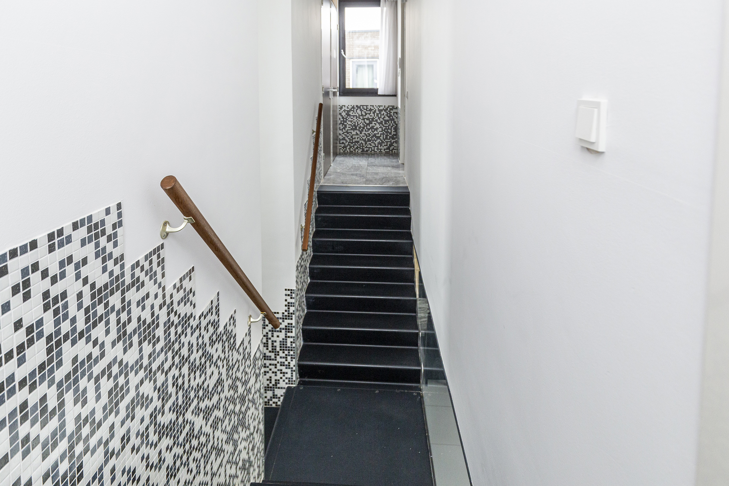Via de entree stap je binnen in de hal. Hier vind je een luxe, volledig betegeld toilet met fonteintje, de meterkast en een technische ruimte met warmtepomp, WTW-installatie en praktische bergruimte. Vanuit de hal loop je direct door naar de open keuken. De keuken is strak uitgevoerd en ingericht met een kookeiland en Siemens inbouwapparatuur: een combi-oven/magnetron, aparte oven, 5-pits inductiekookplaat, vaatwasser, koel-/vriescombinatie en een kokend waterkraan. Een fijne plek om te koken en samen te komen. Aansluitend ligt de lichte woon- en eetkamer. Dankzij de grote raampartijen valt er veel daglicht naar binnen en heb je mooi zicht op de tuin rondom de woning. De ruimte is ruim opgezet en flexibel in te delen. De unieke steektrap vormt een echte blikvanger in de woonkamer en brengt je naar de verdieping.