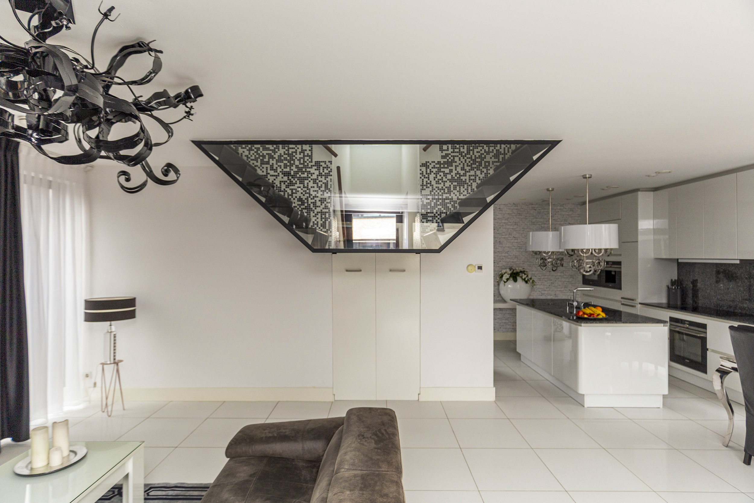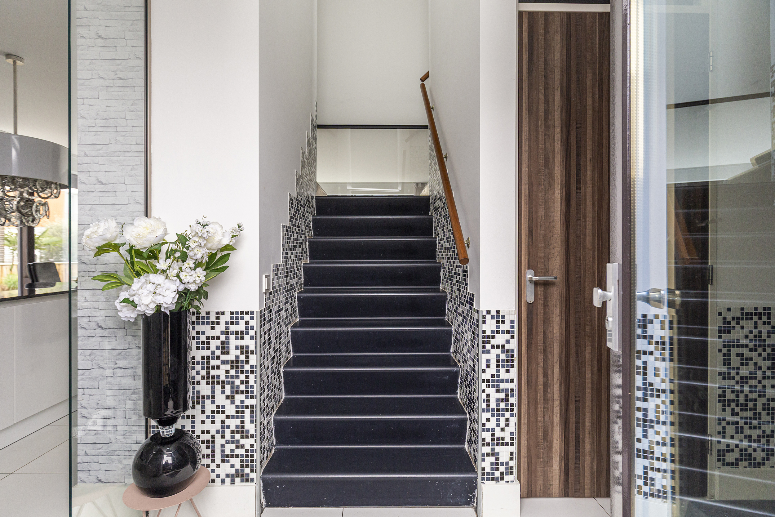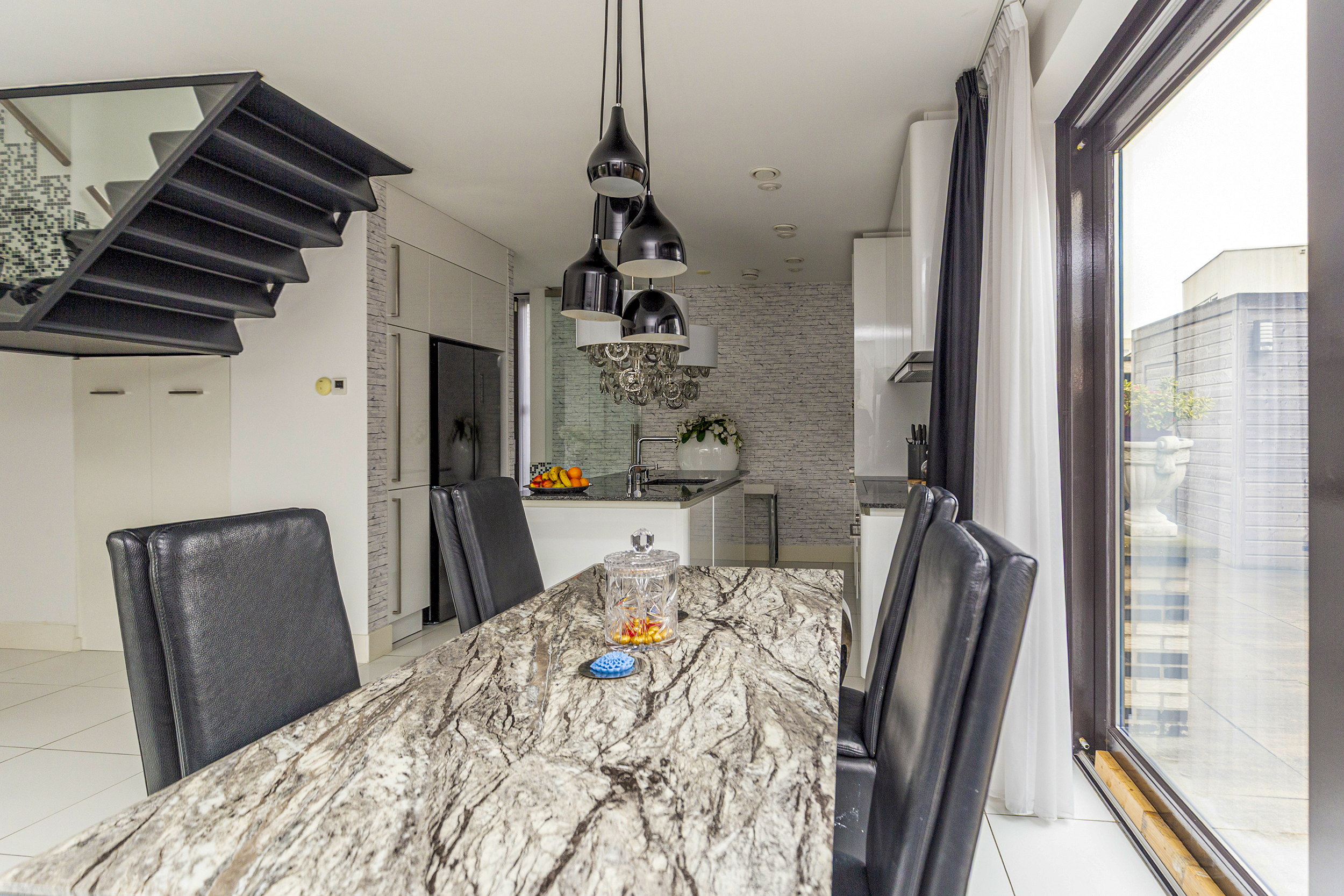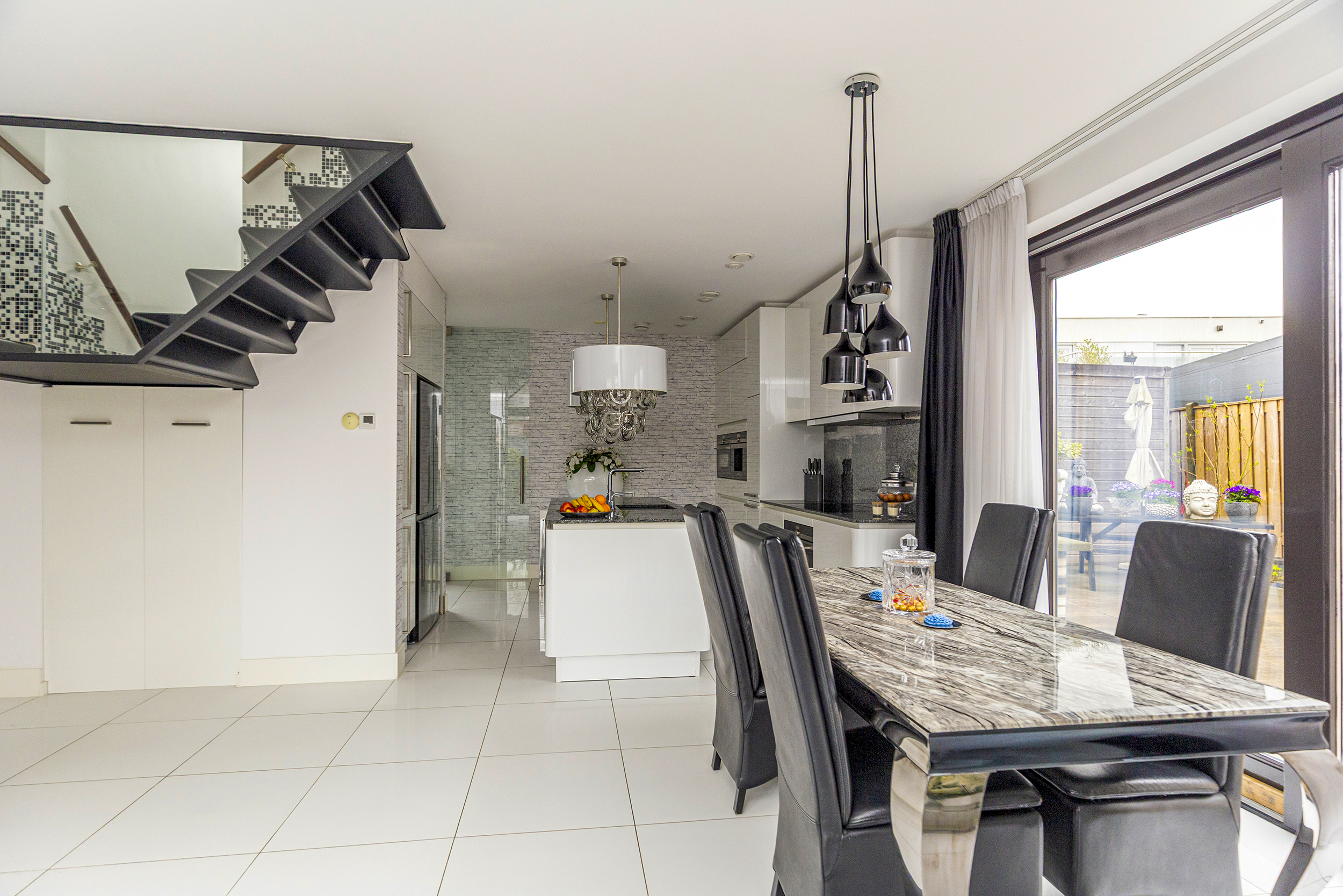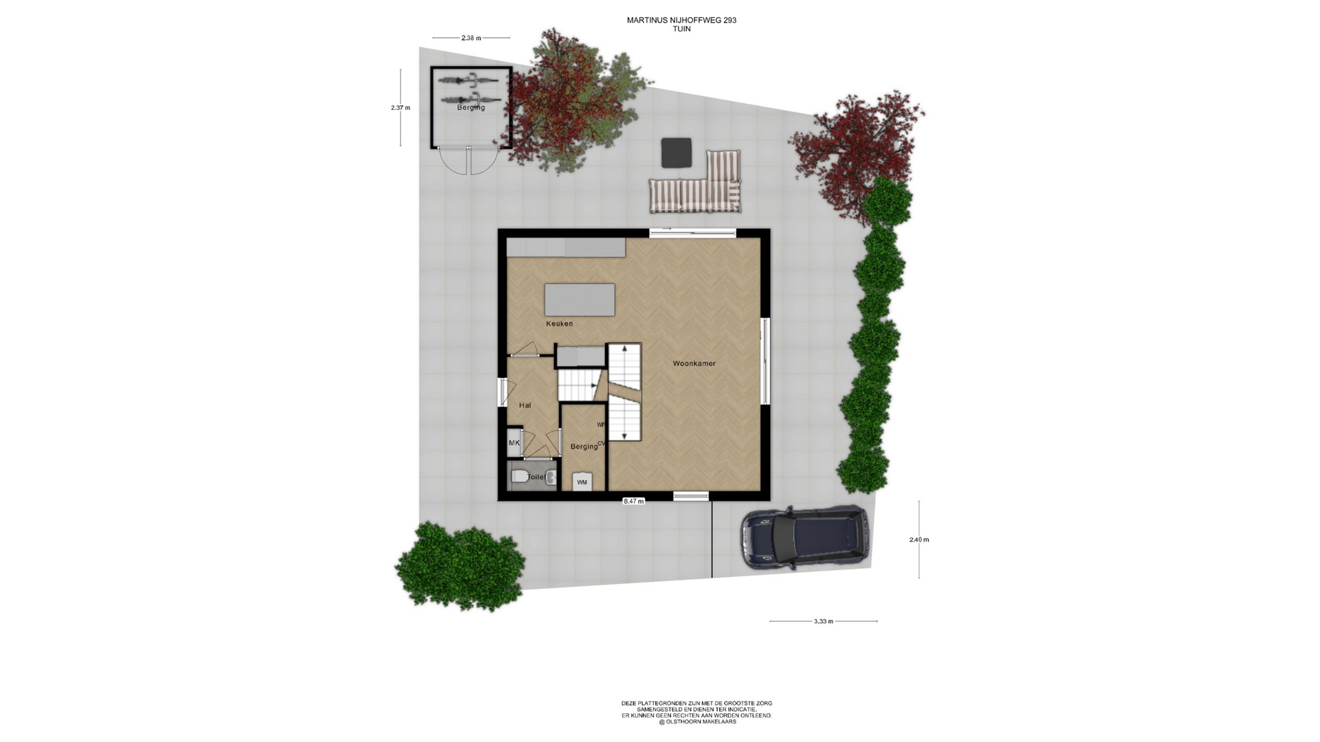 Via de entree stap je binnen in de hal. Hier vind je een luxe, volledig betegeld toilet met fonteintje, de meterkast en een technische ruimte met warmtepomp, WTW-installatie en praktische bergruimte. Vanuit de hal loop je direct door naar de open keuken. De keuken is strak uitgevoerd en ingericht met een kookeiland en Siemens inbouwapparatuur: een combi-oven/magnetron, aparte oven, 5-pits inductiekookplaat, vaatwasser, koel-/vriescombinatie en een kokend waterkraan. Een fijne plek om te koken en samen te komen. Aansluitend ligt de lichte woon- en eetkamer. Dankzij de grote raampartijen valt er veel daglicht naar binnen en heb je mooi zicht op de tuin rondom de woning. De ruimte is ruim opgezet en flexibel in te delen. De unieke steektrap vormt een echte blikvanger in de woonkamer en brengt je naar de verdieping.