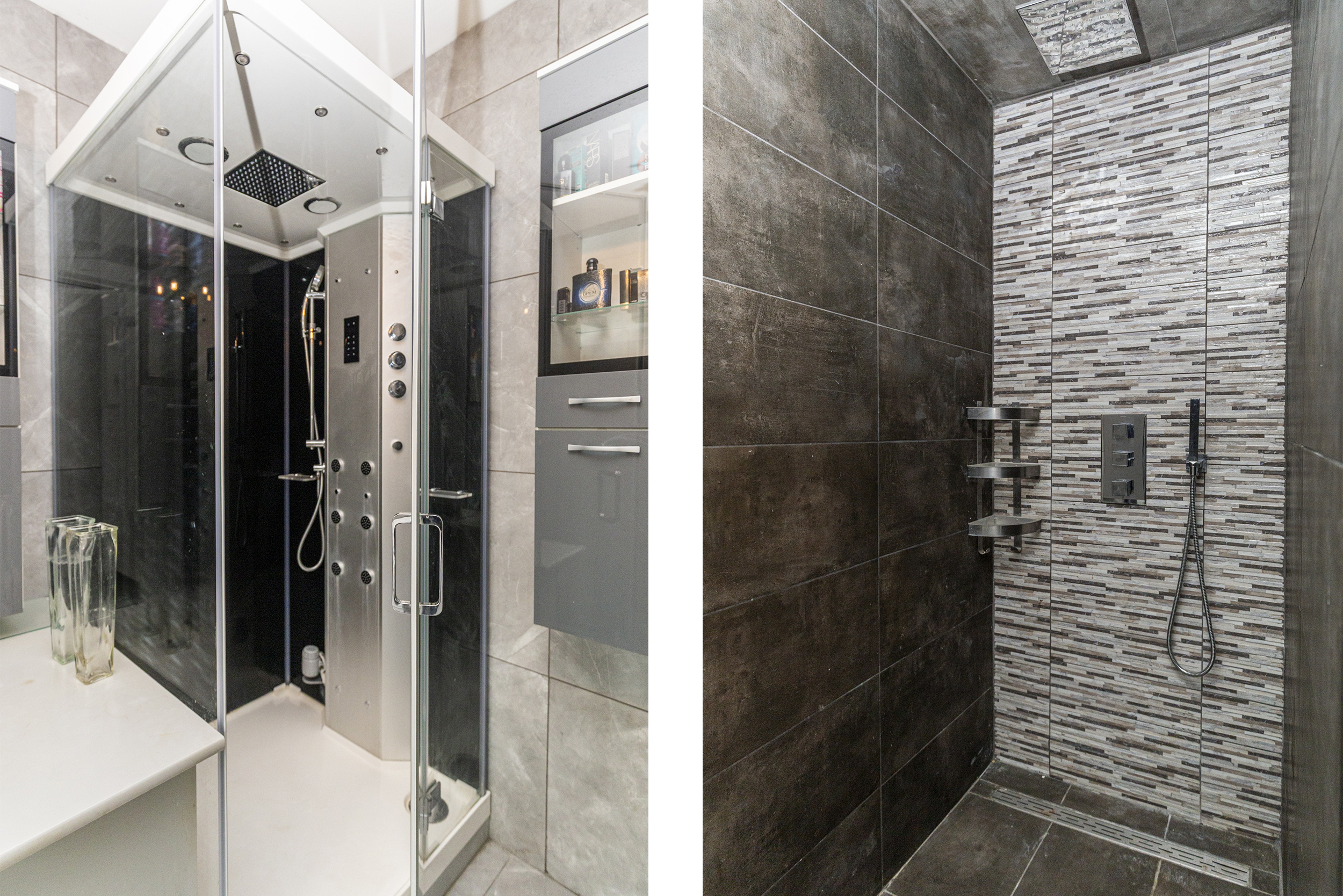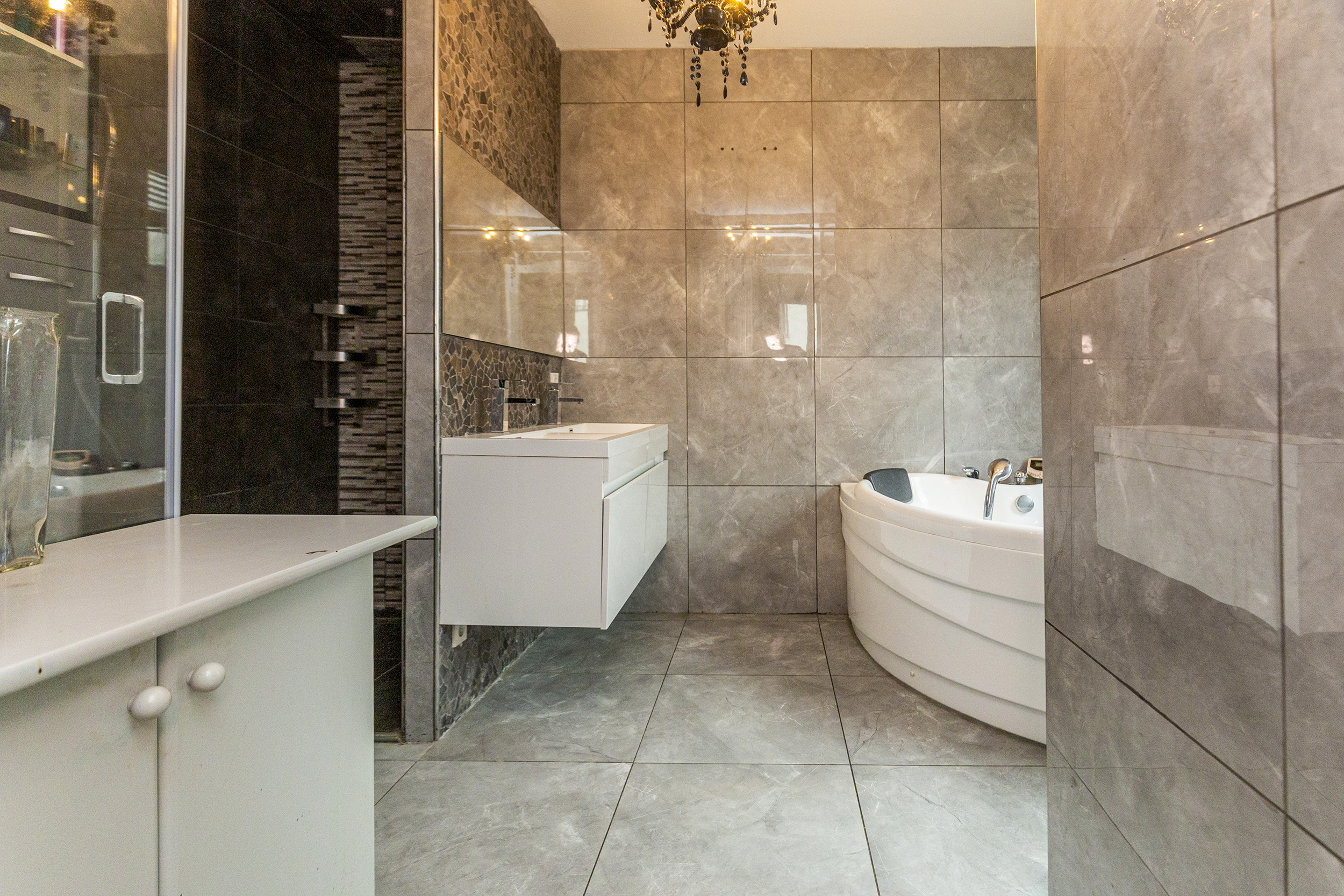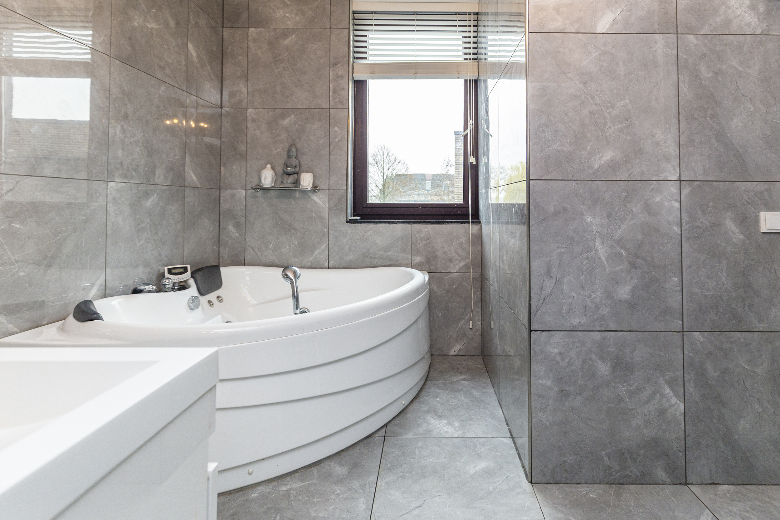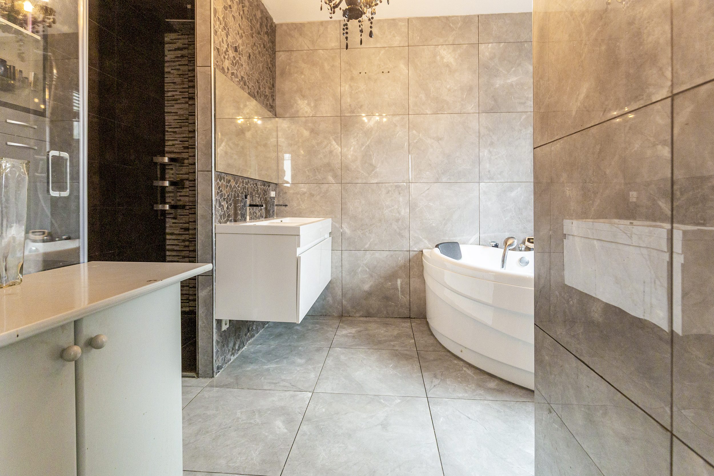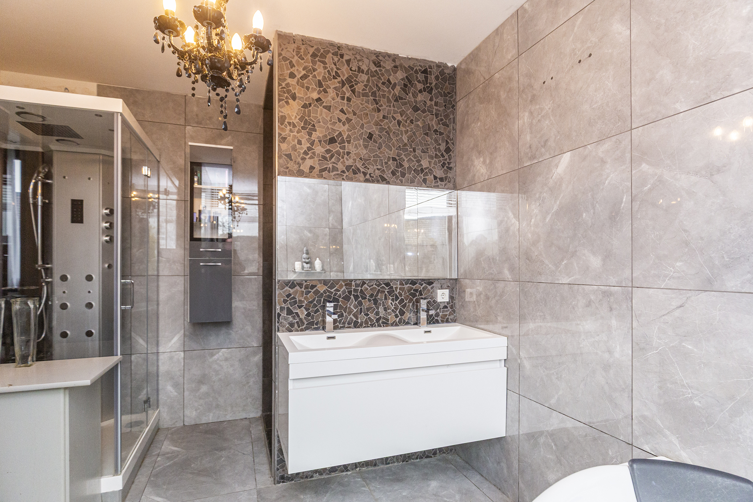 - Badkamervoorzieningen Douche, jacuzzi, dubbele wastafel, wastafelmeubel, inloopdouche, vloerverwarming