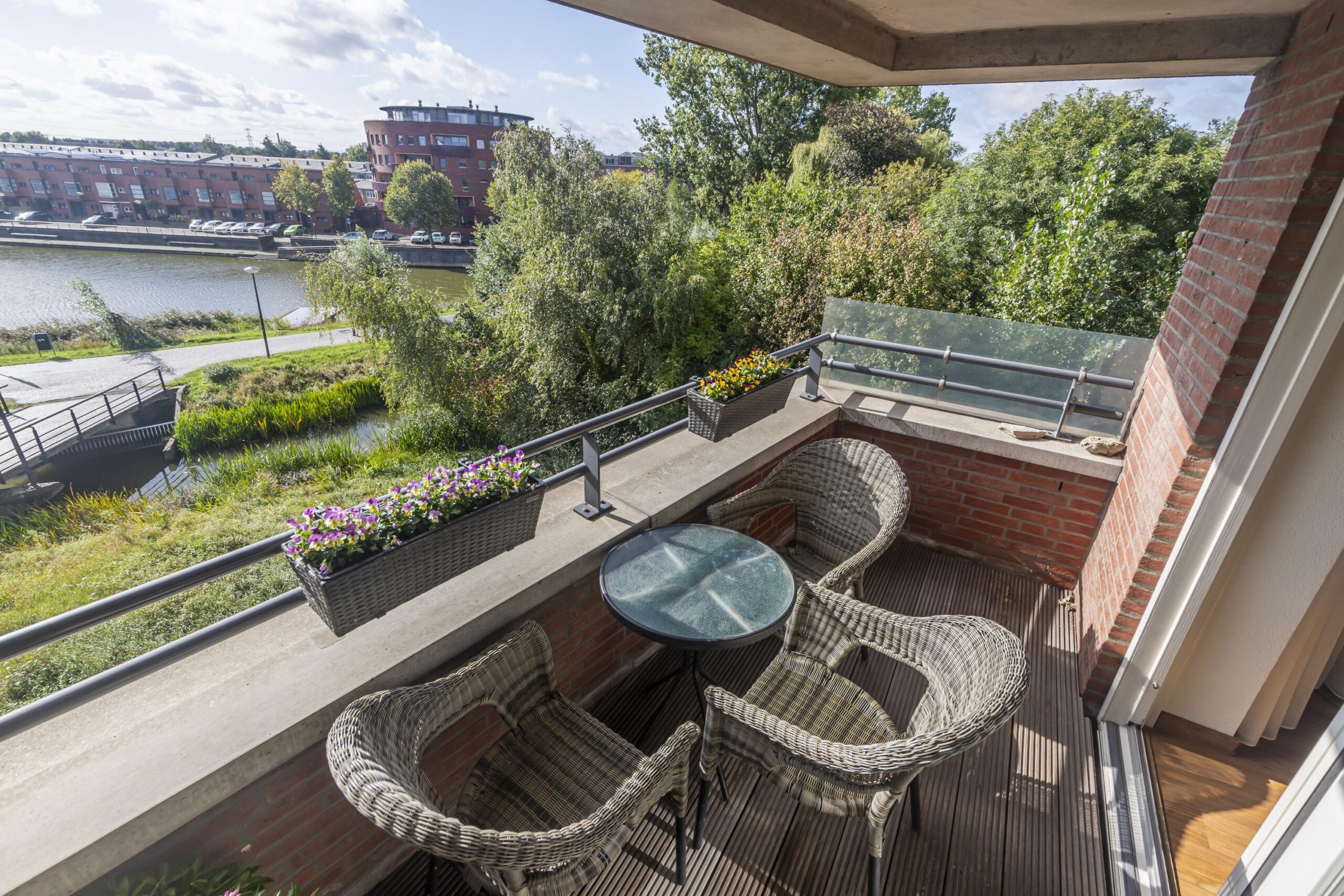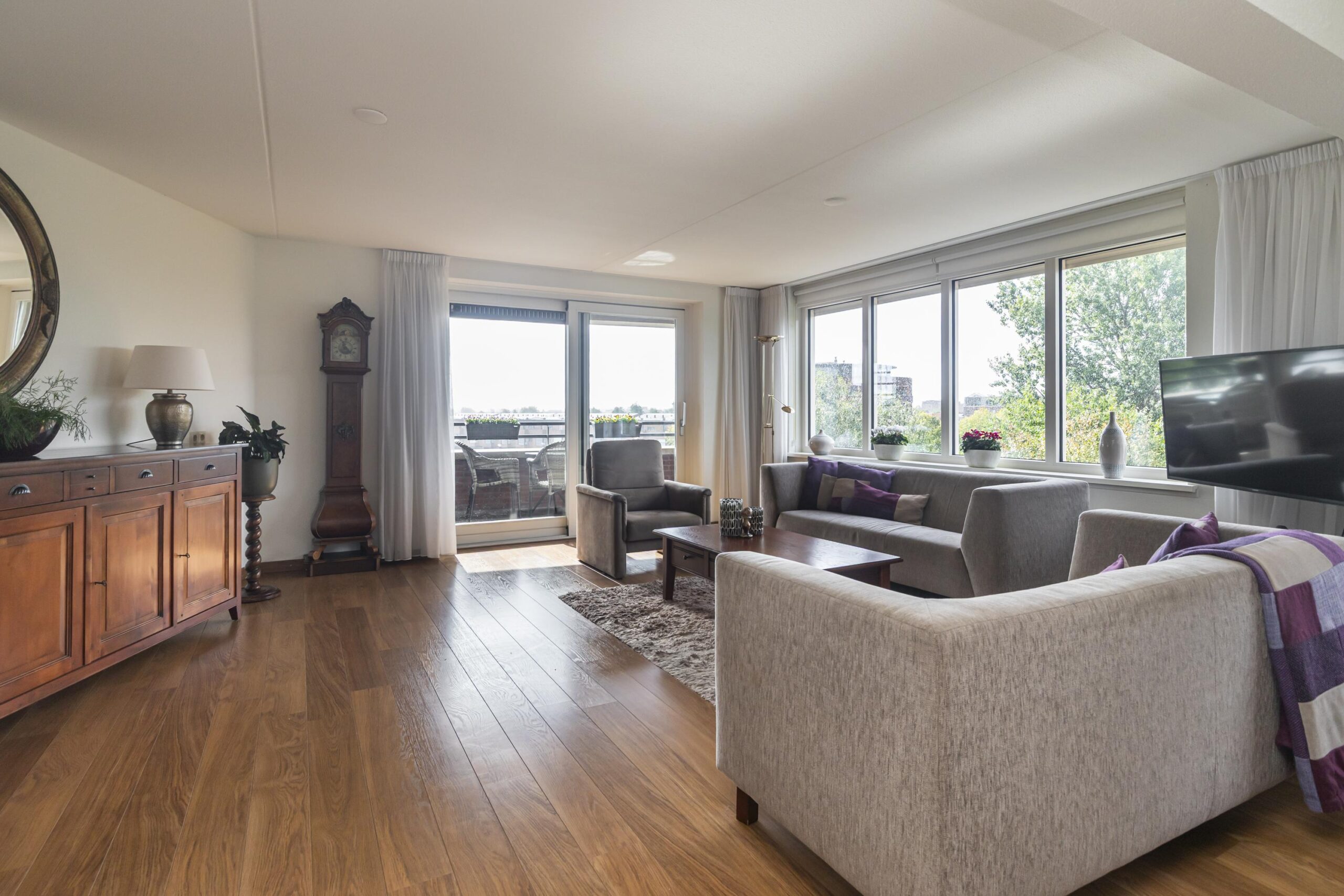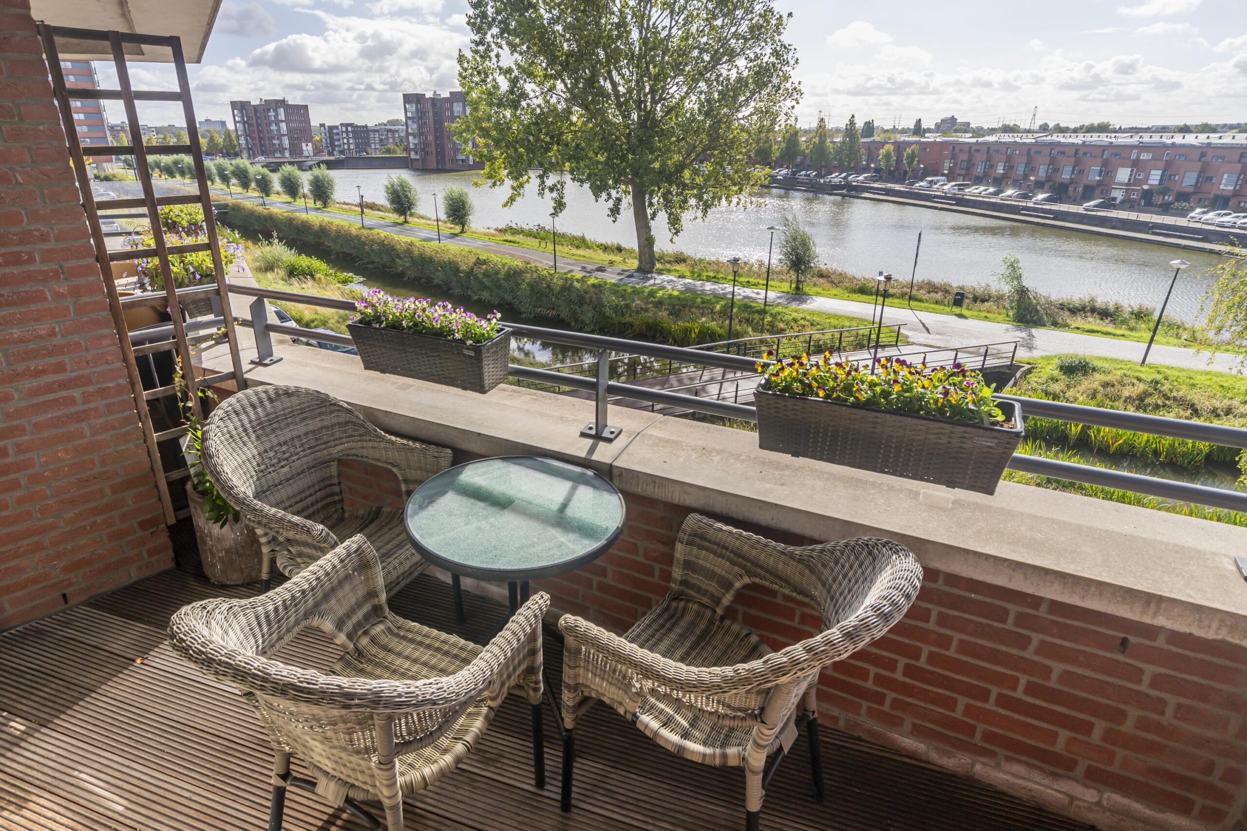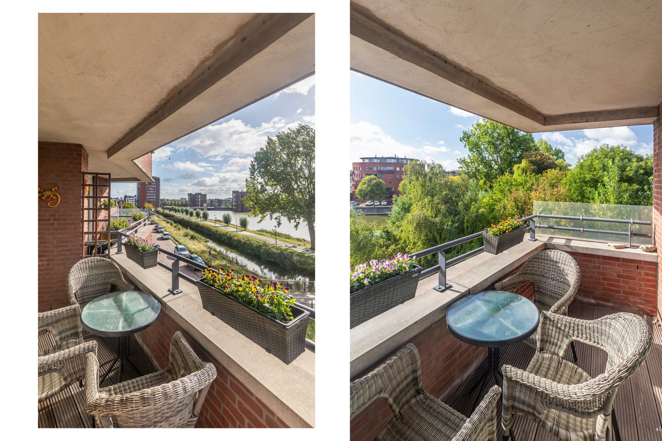 Via de schuifpui in de woonkamer bereikt u het zonnige balkon, gelegen op het zuidoosten. Hier geniet u volop van rust, privacy en het prachtige vrije uitzicht over het water en het groen.