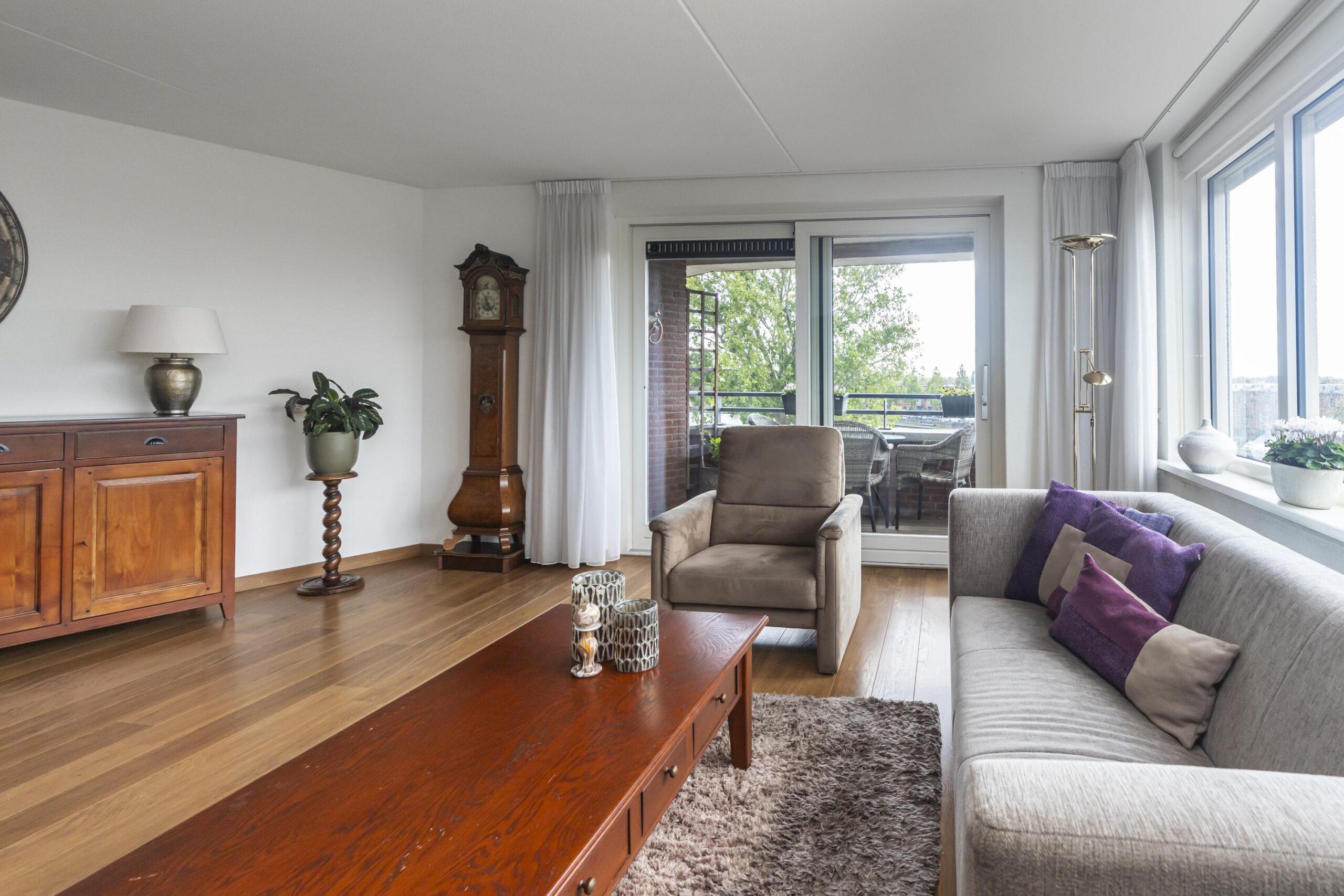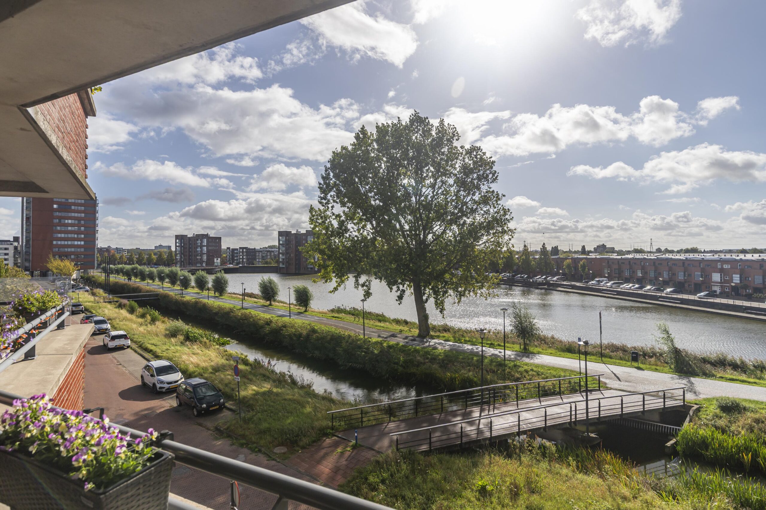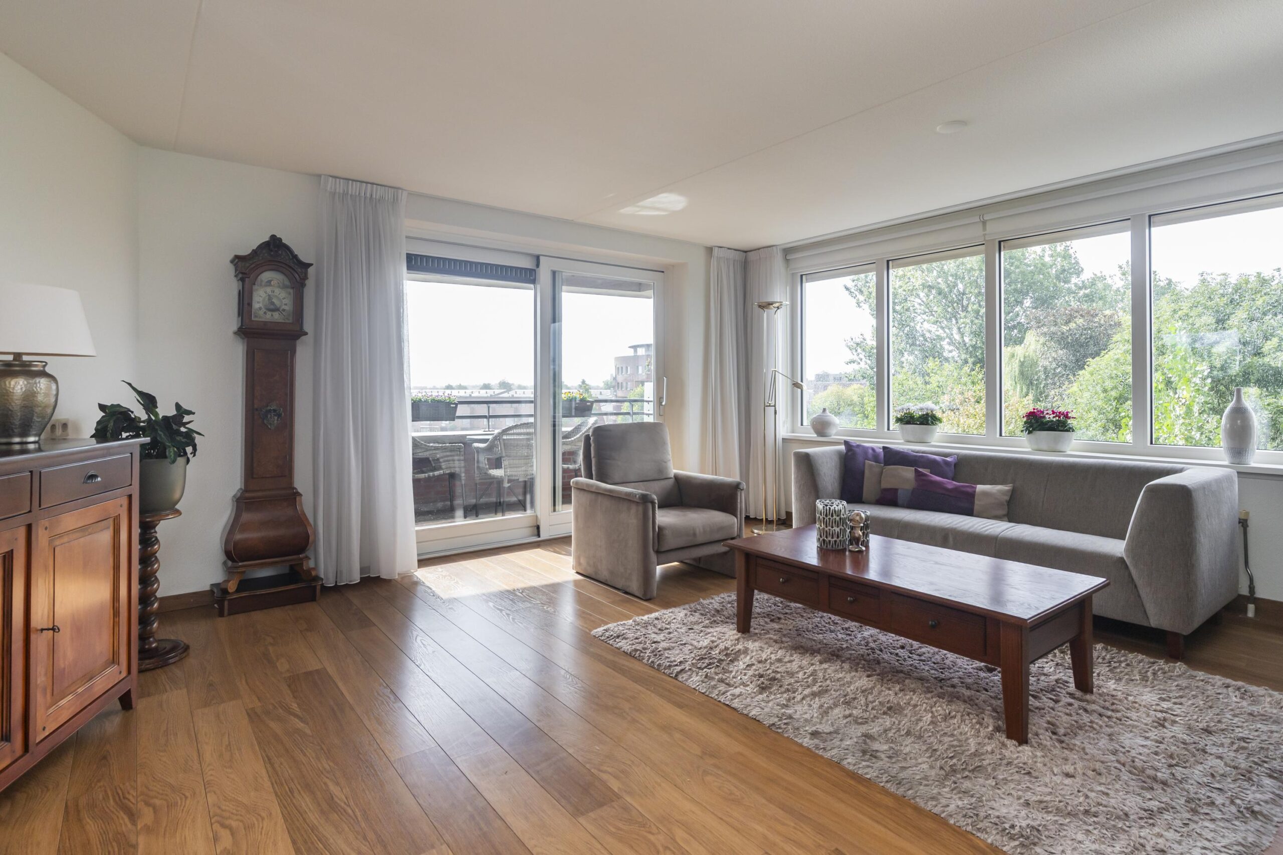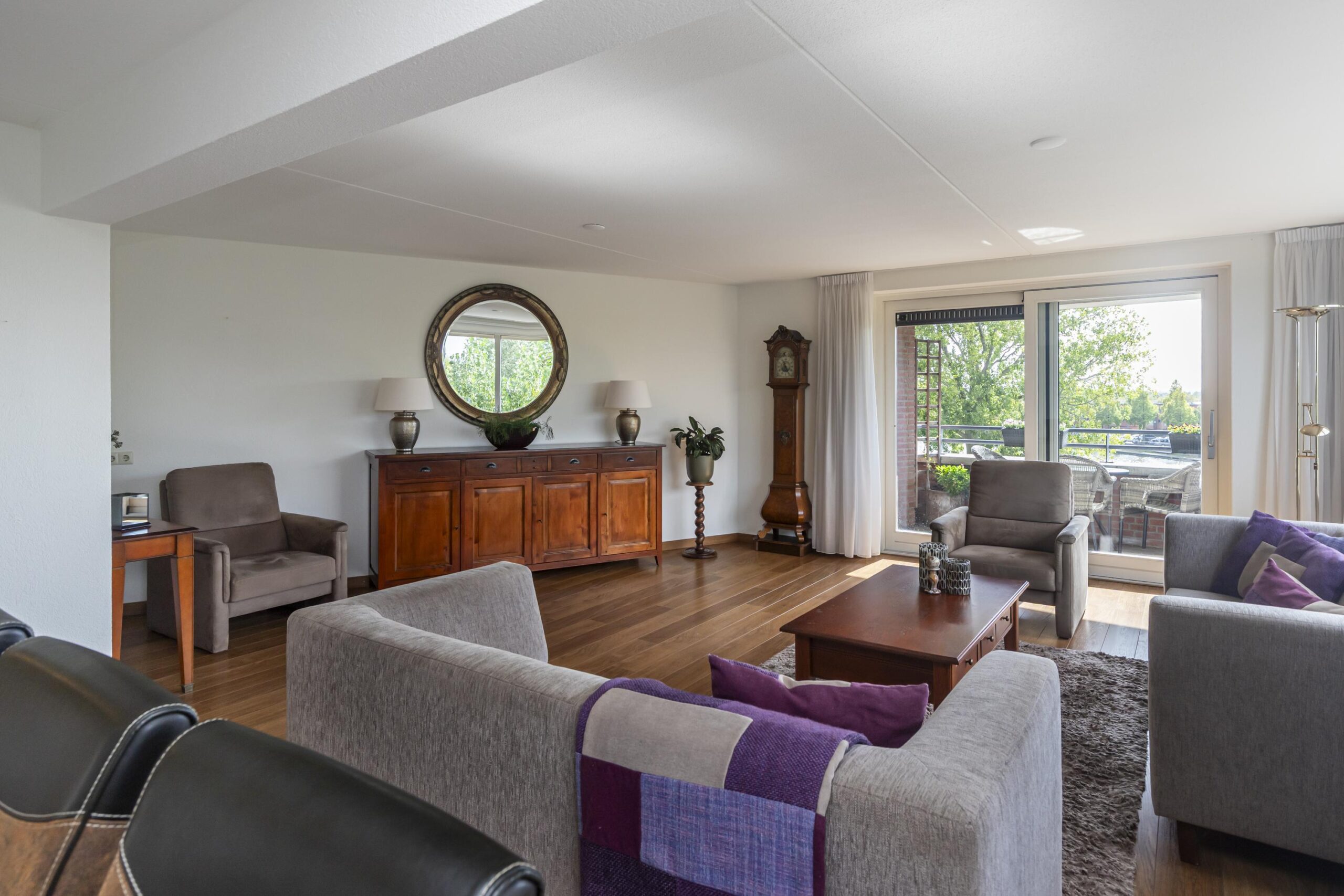 Via de schuifpui in de woonkamer bereikt u het zonnige balkon, gelegen op het zuidoosten. Hier geniet u volop van rust, privacy en het prachtige vrije uitzicht over het water en het groen.