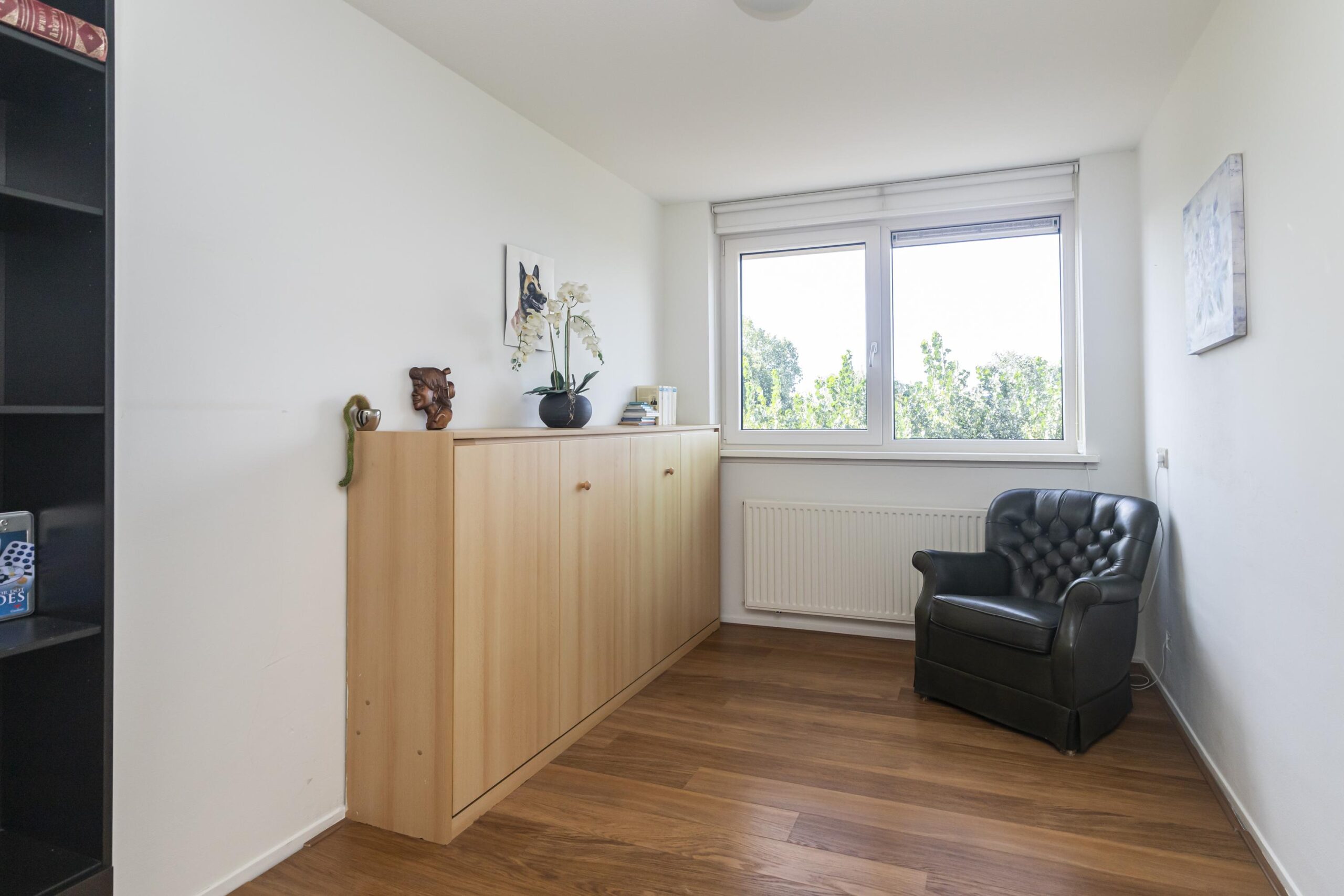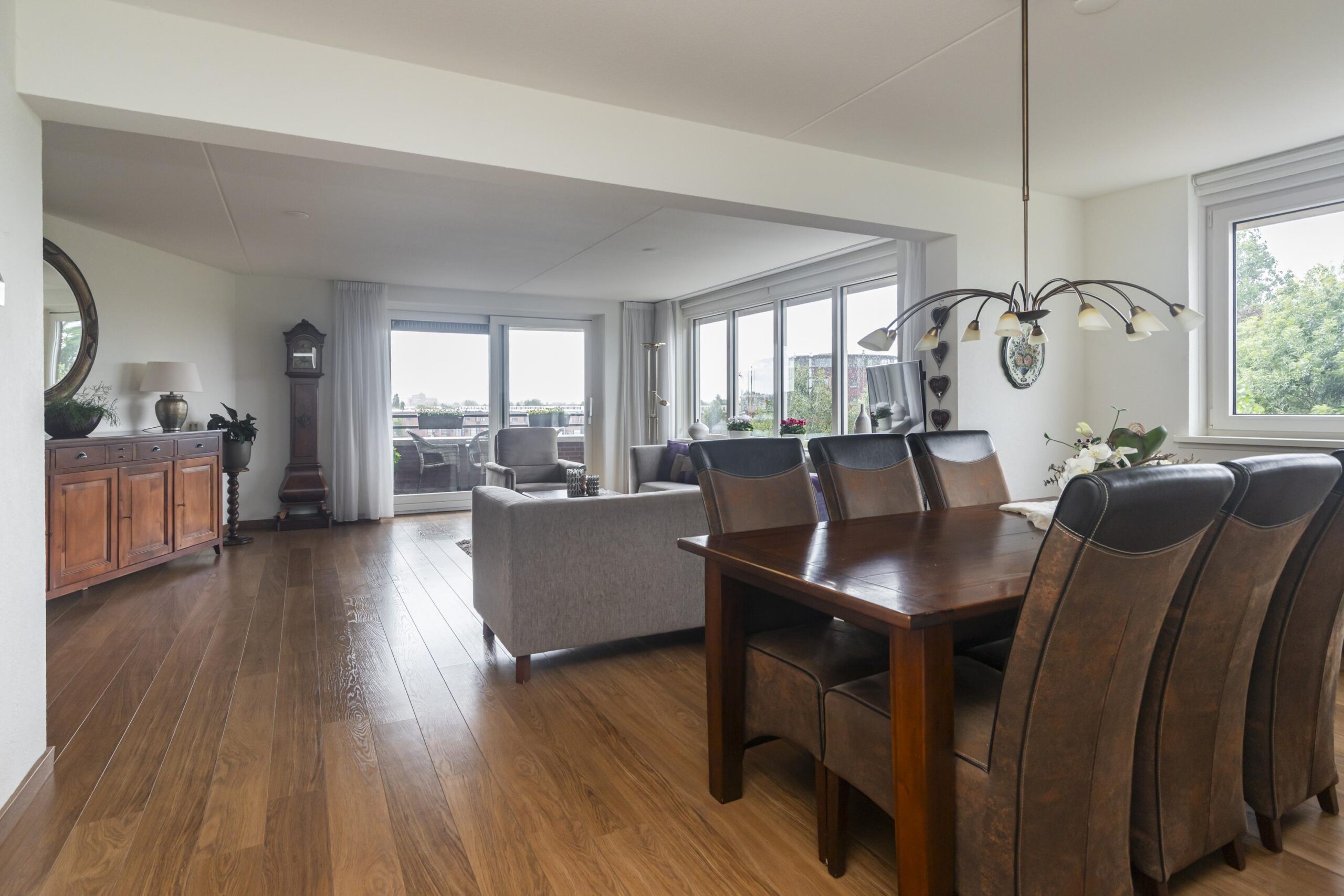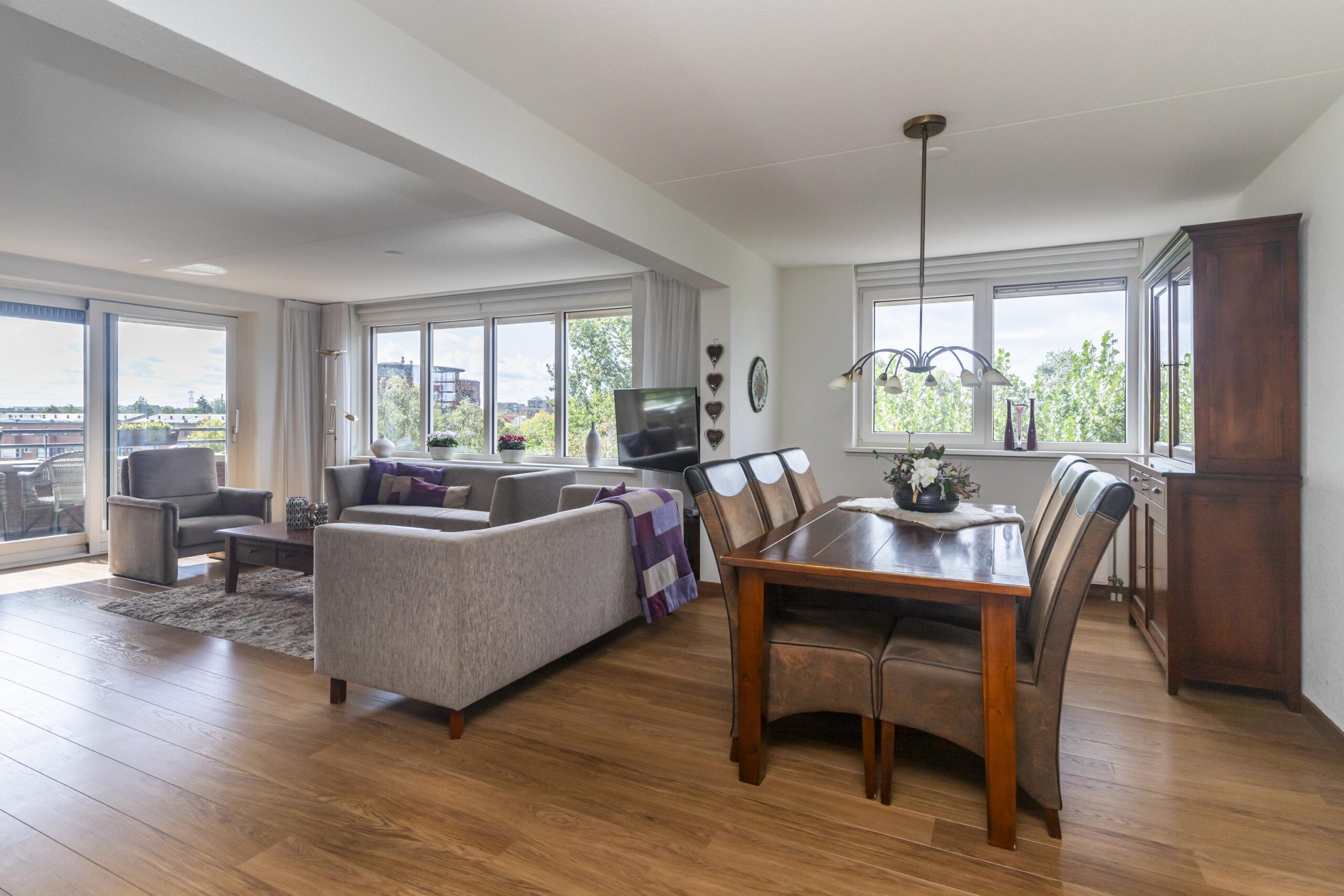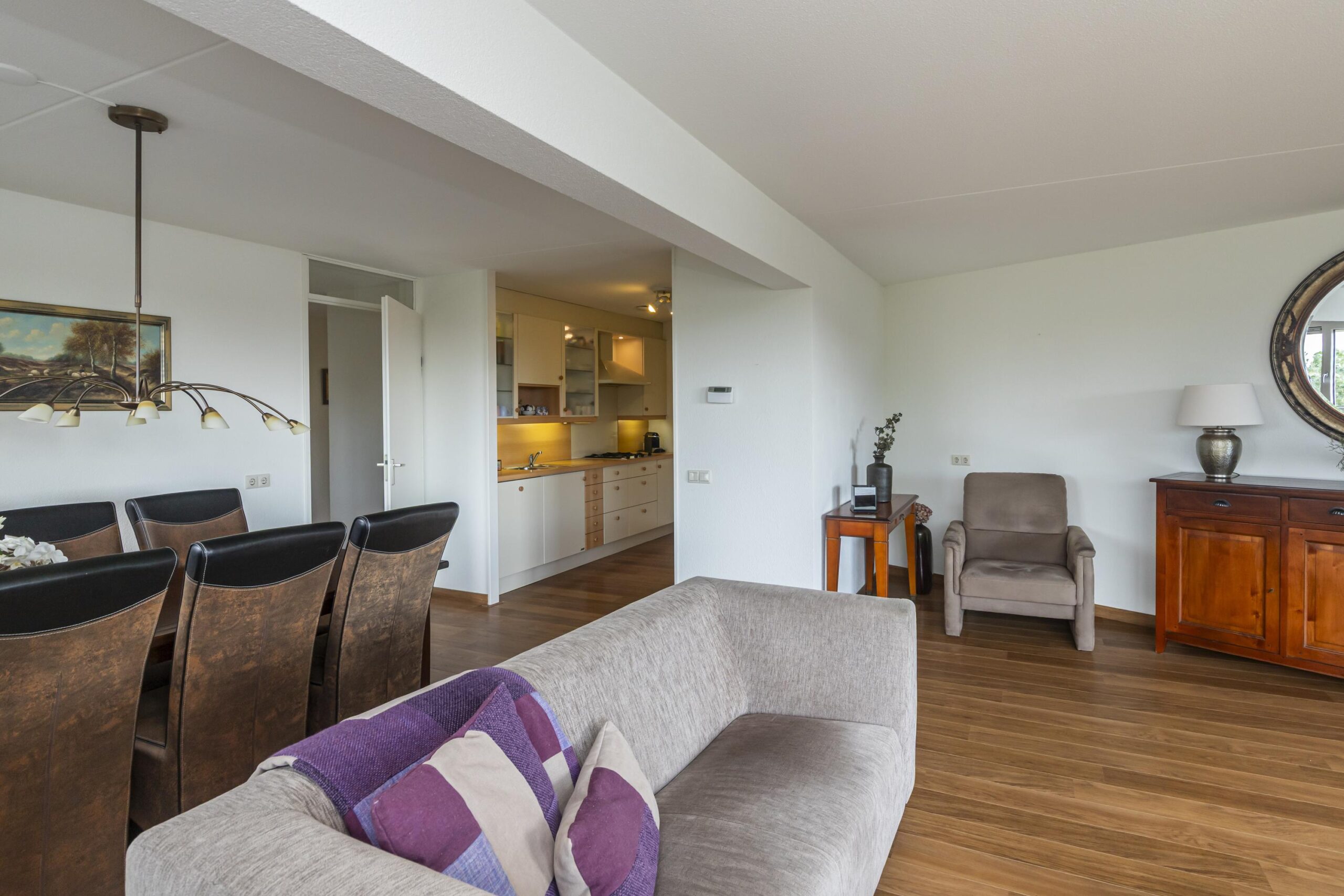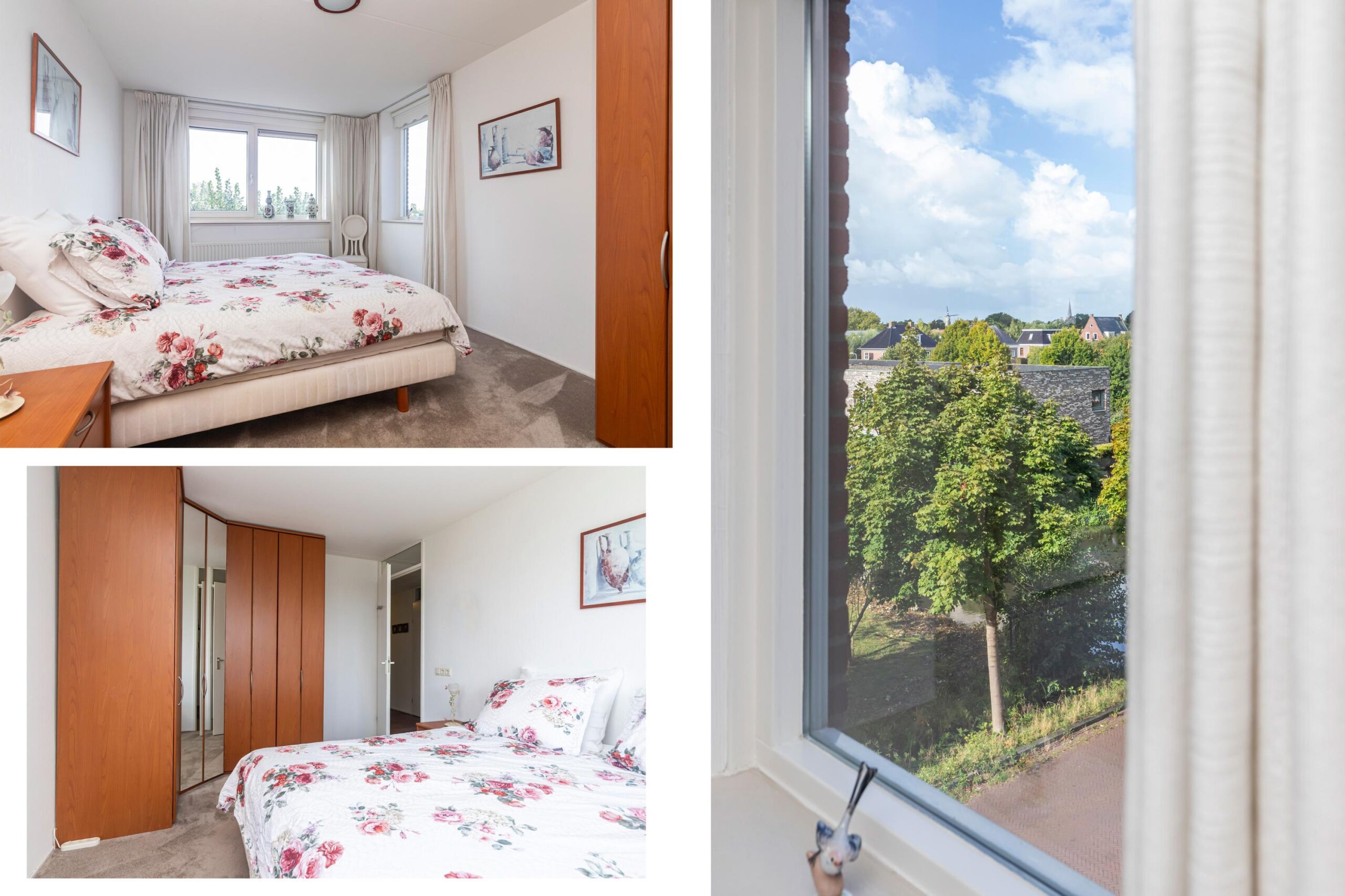 Via de schuifpui in de woonkamer bereikt u het zonnige balkon, gelegen op het zuidoosten. Hier geniet u volop van rust, privacy en het prachtige vrije uitzicht over het water en het groen.