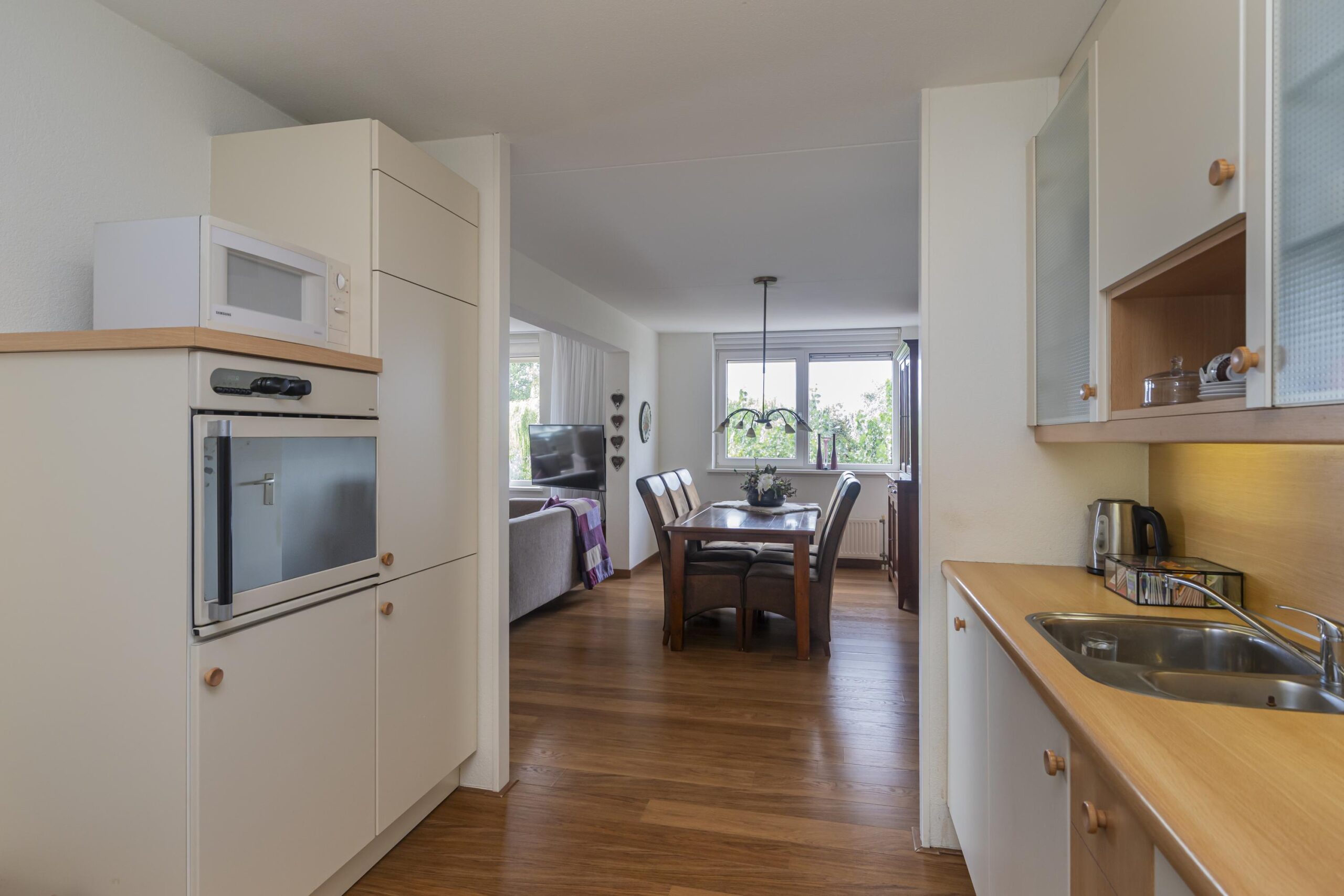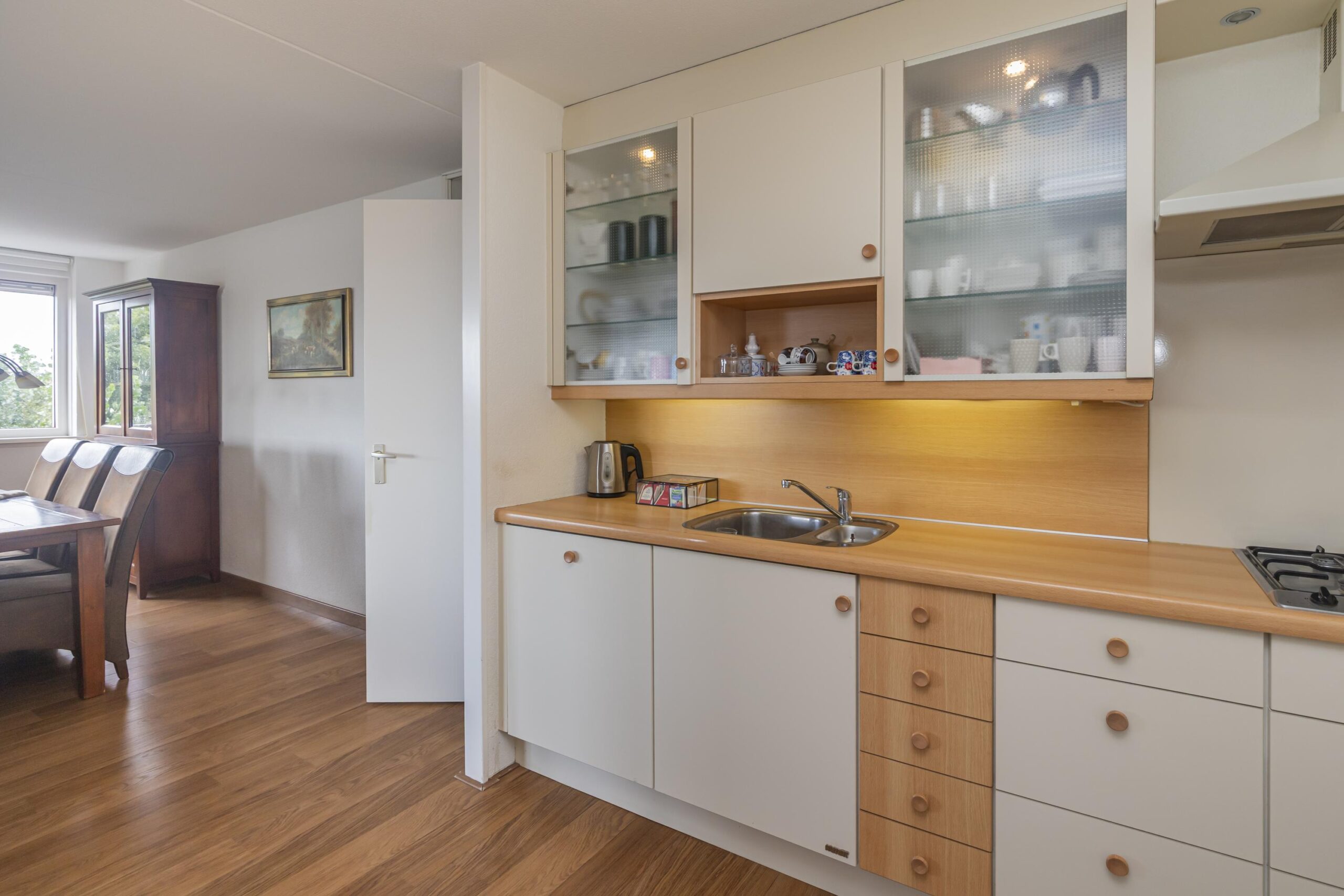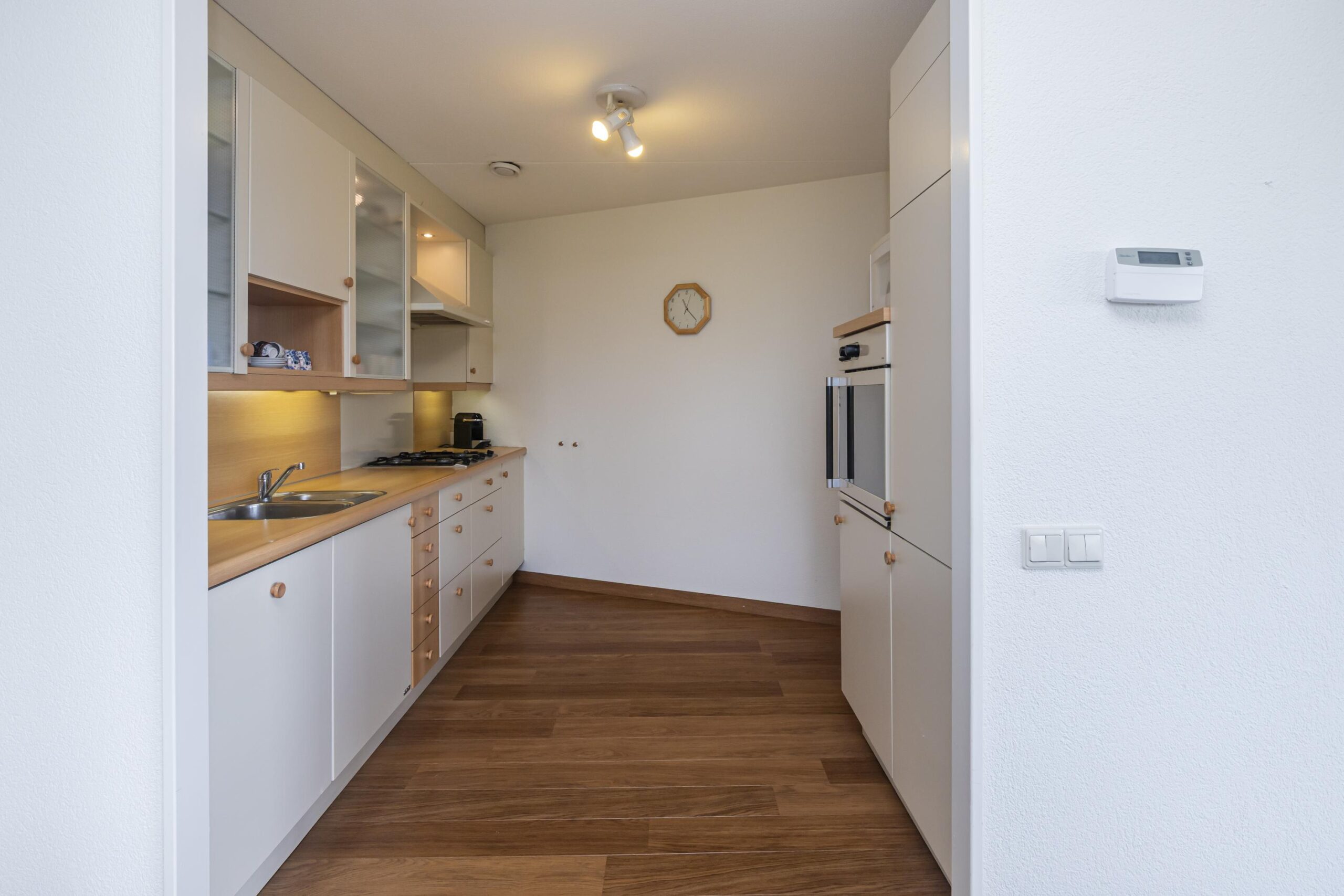 Het separate toilet met fonteintje is netjes afgewerkt. De ruime, nette badkamer beschikt over een inloopdouche, dubbele wastafel en een handdoekradiator. Verder beschikt het appartement over twee goed bemeten slaapkamers. De royale woon-/eetkamer valt direct op door de grote raampartijen die zorgen voor een prettige lichtinval. De open keuken is uitgerust met diverse inbouwapparatuur, waaronder een Whirlpool vaatwasser, oven, koel-/vriescombinatie en een 4-pits gaskookplaat met afzuigkap.