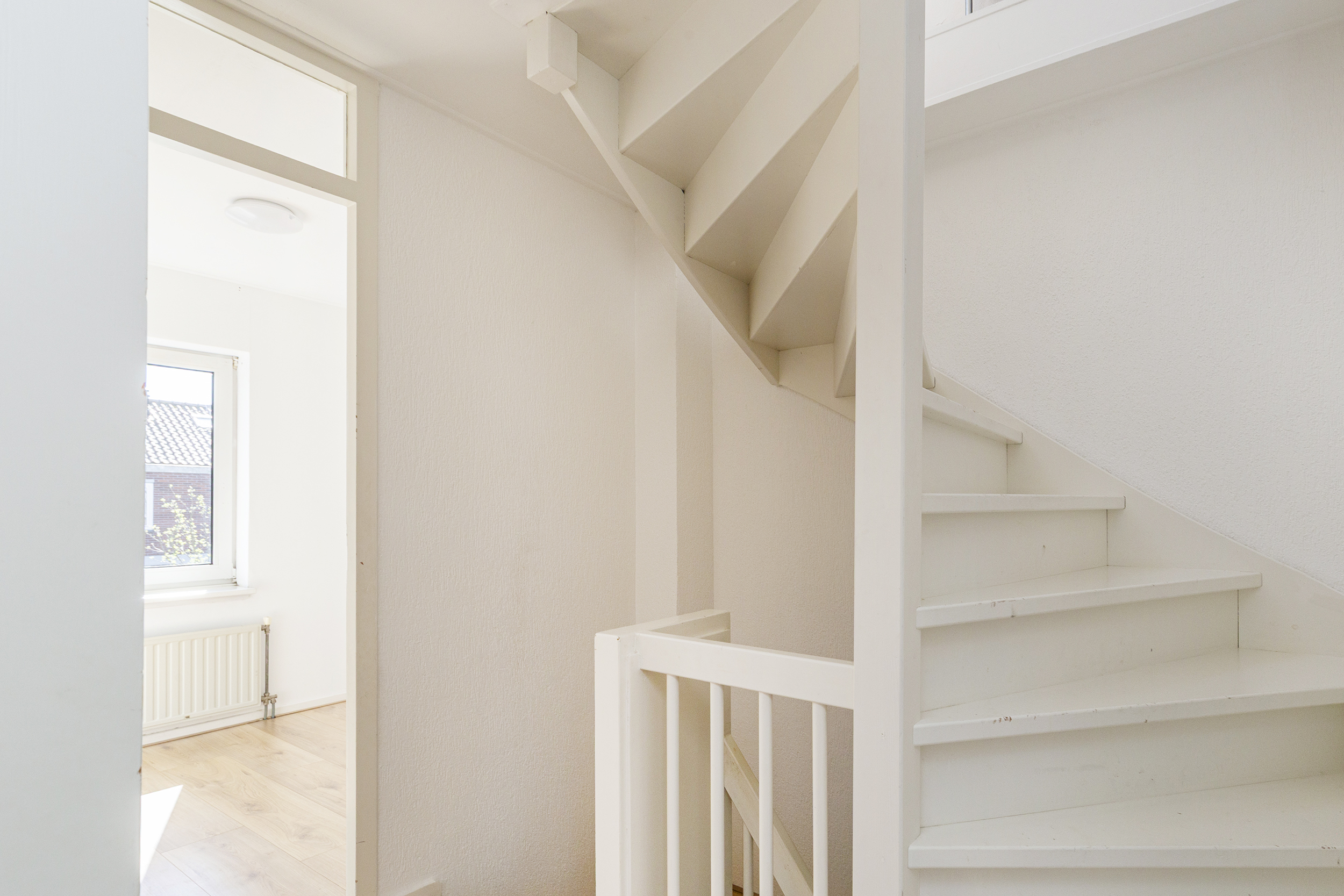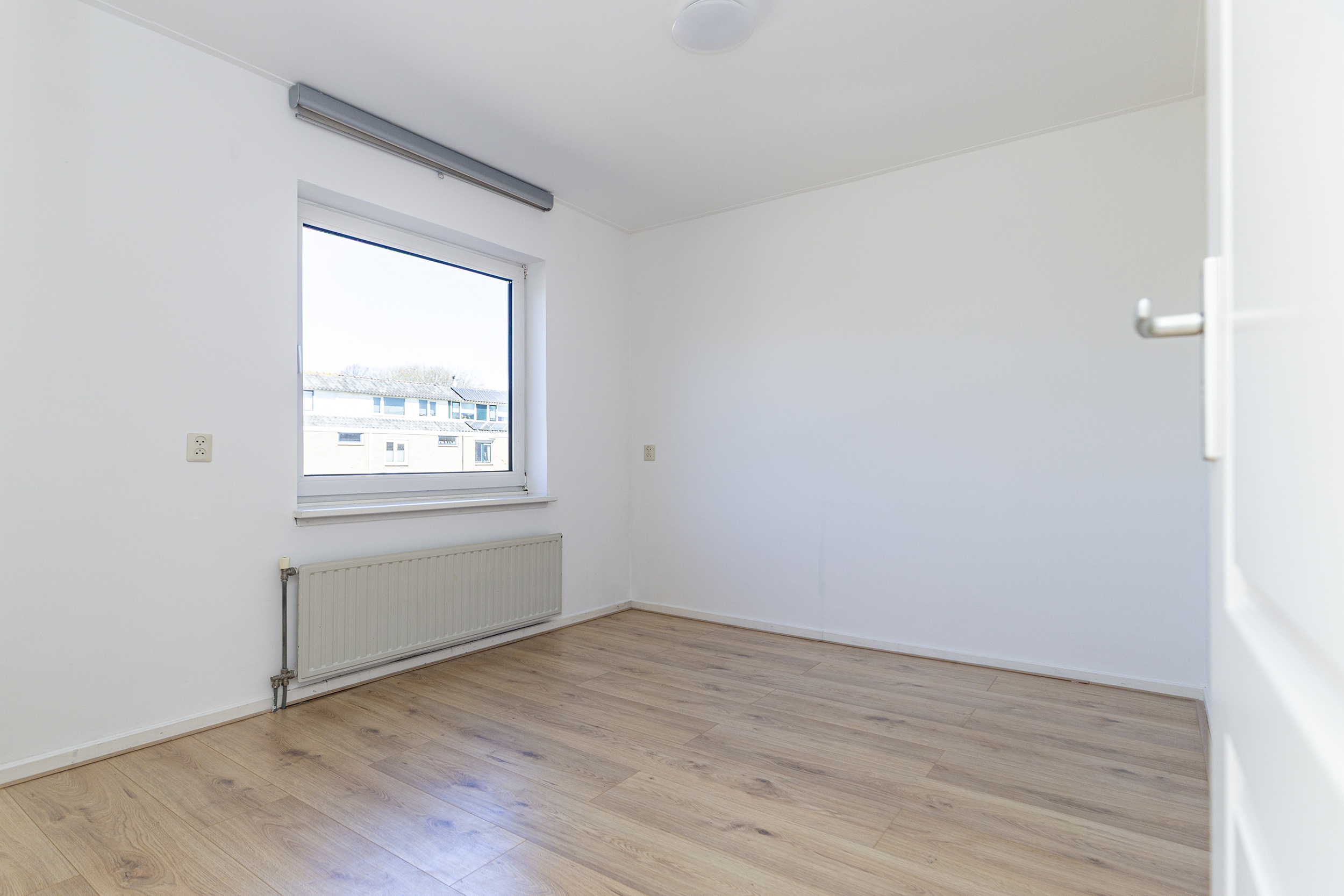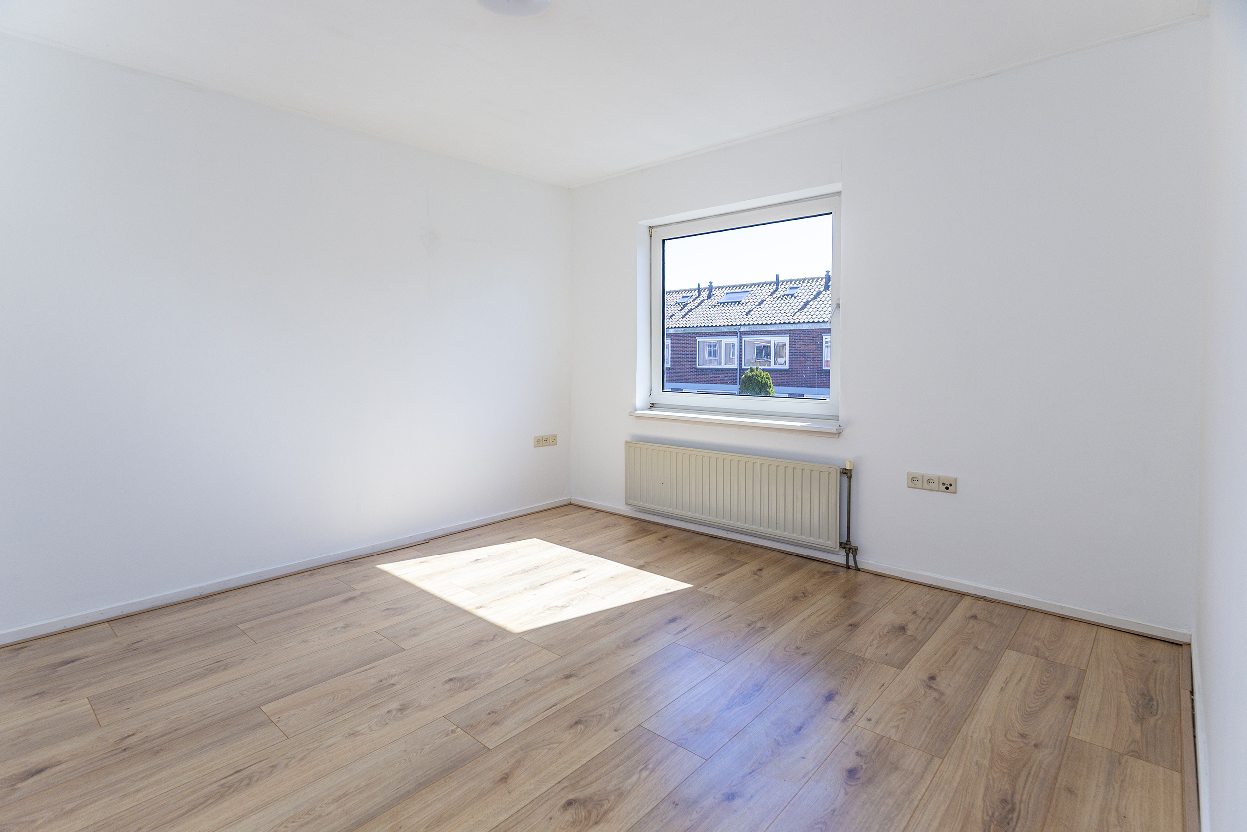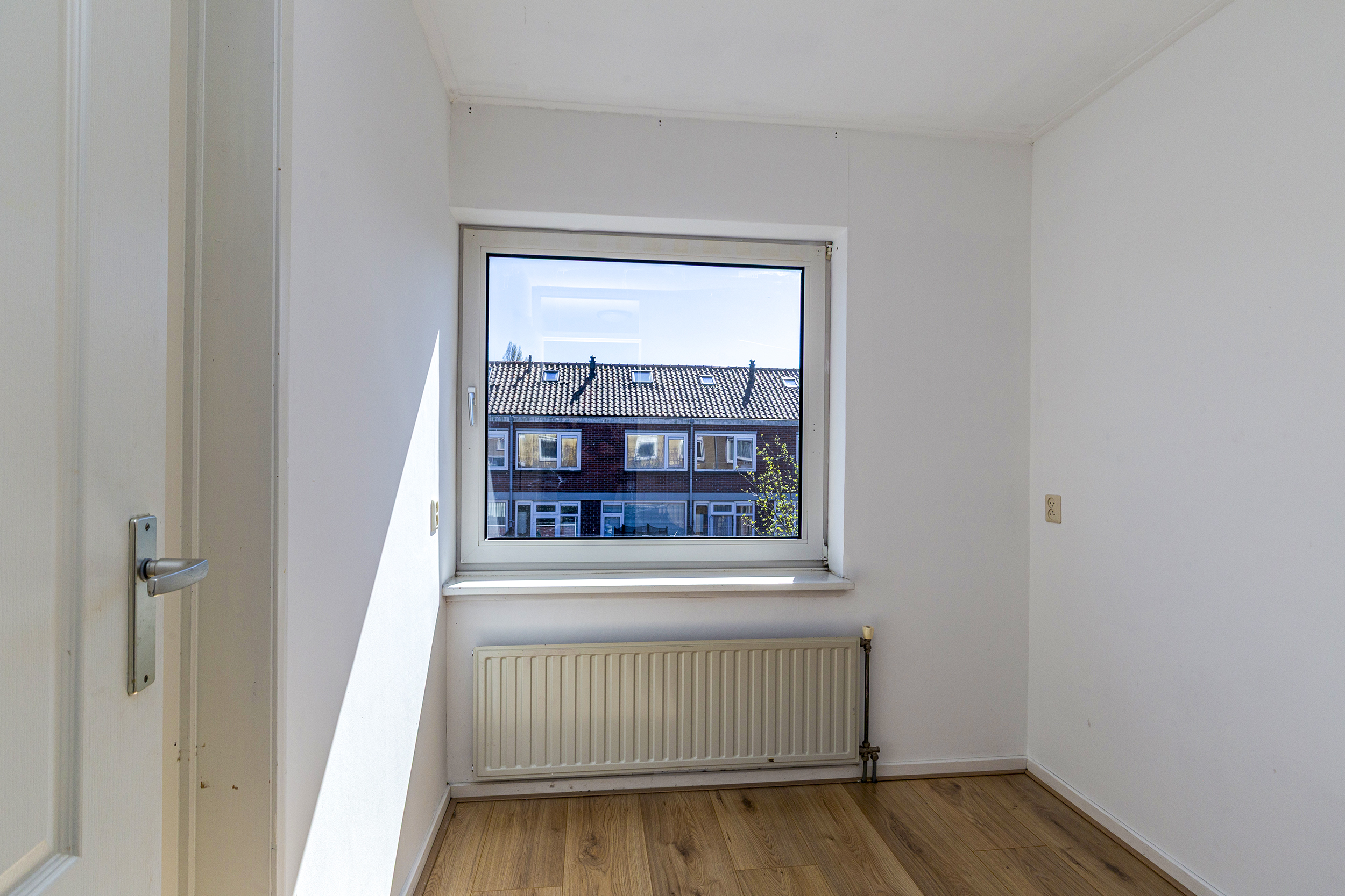 Op de eerste verdieping vind je drie volwaardige slaapkamers. De hoofdslaapkamer is ruim en licht en beschikt over een raam dat naar binnen opent. Daarnaast is er een tweede, ruime slaapkamer en een derde kamer die perfect geschikt is als kinderkamer, werkkamer of bijvoorbeeld een inloopkast. De badkamer is netjes en verzorgd en voorzien van een inloopdouche, een hangend toilet en een wastafel. Dankzij het aanwezige raam is er prettig daglicht.