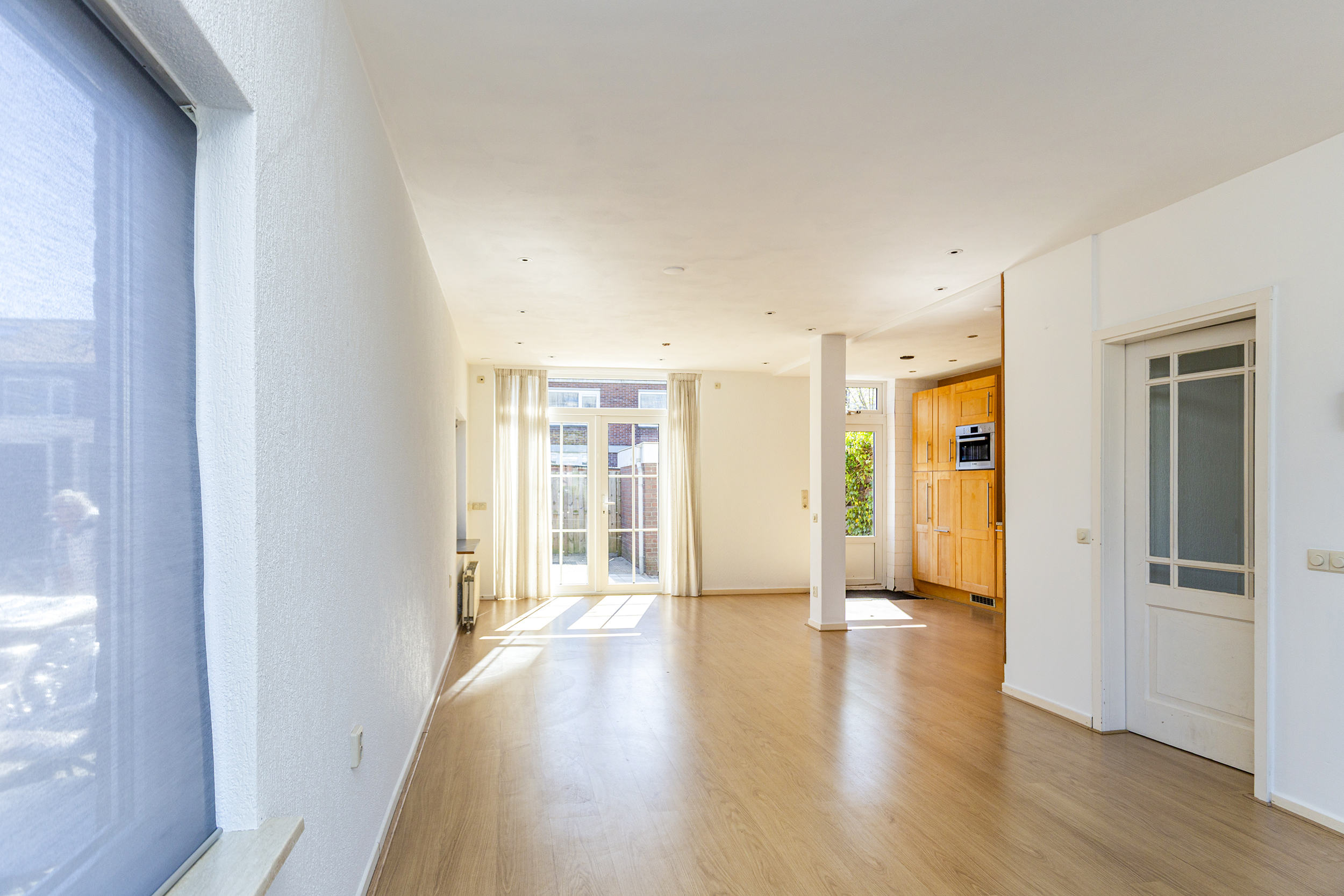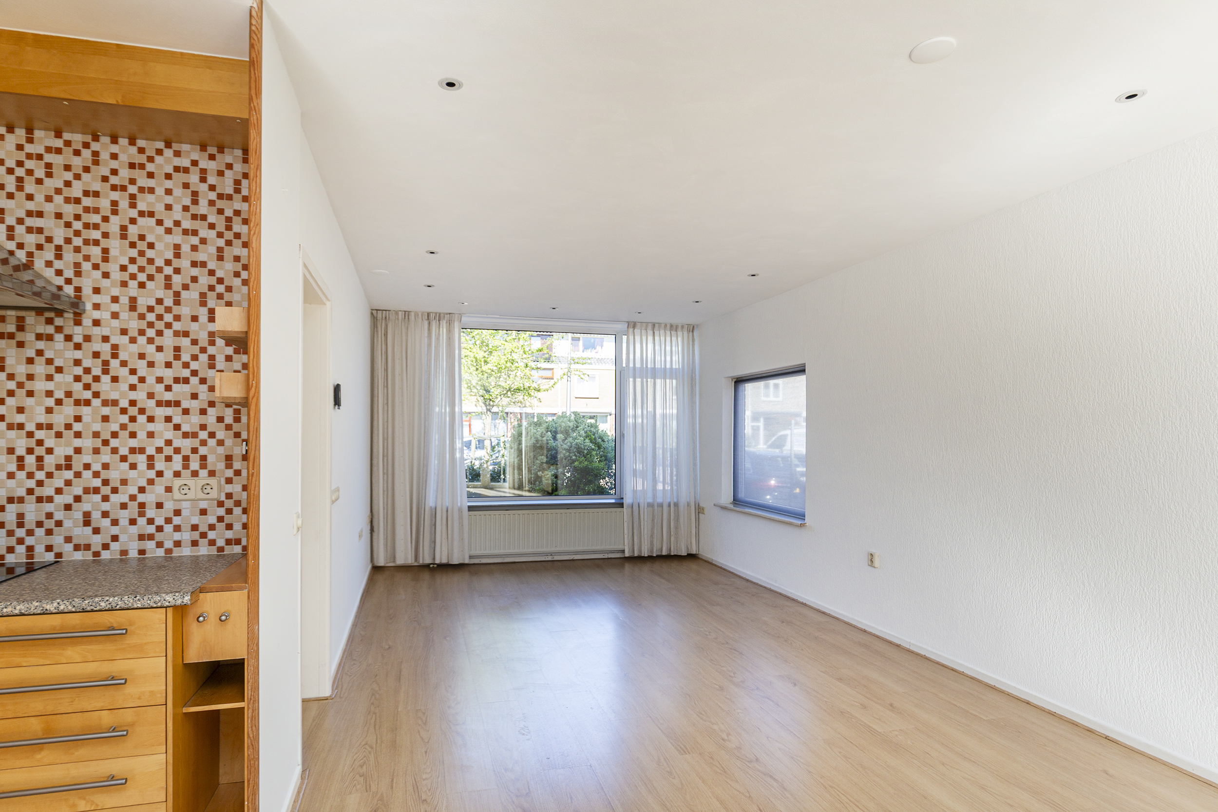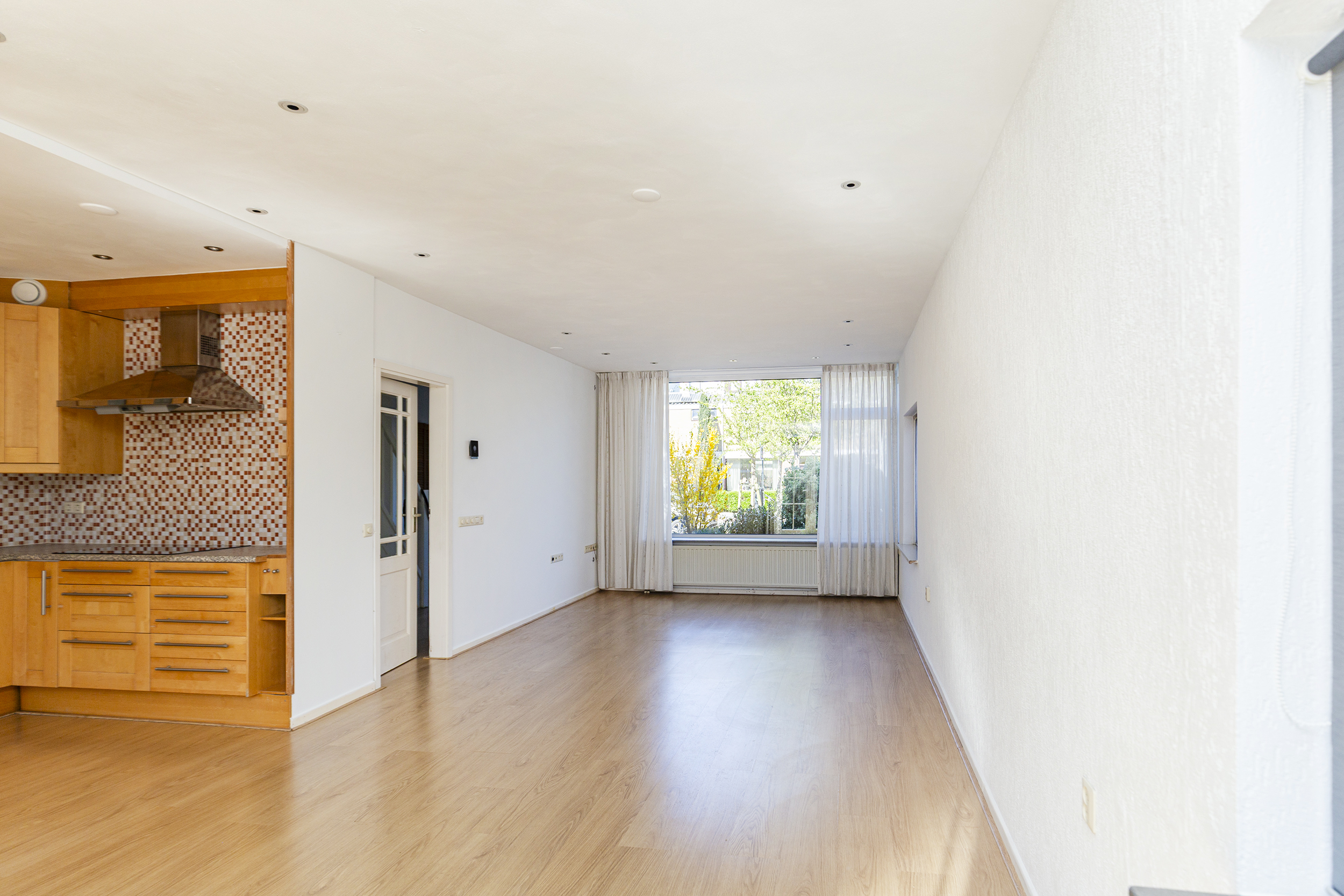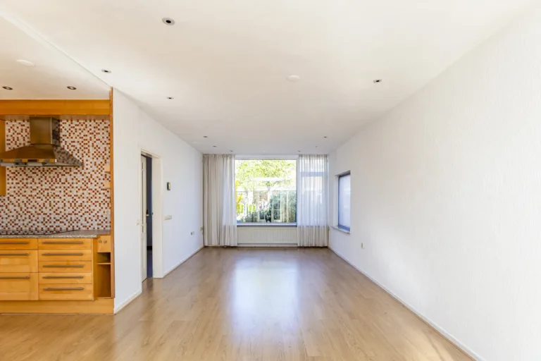 Via de voortuin kom je binnen in de hal met toilet, meterkast en een trapkast voor extra bergruimte. Vanuit hier loop je door naar de woonkamer. De uitgebouwde woonkamer is een heerlijke, lichte leefruimte met veel daglicht dankzij de grote raampartijen aan de voorzijde en de extra zijramen. Hierdoor voelt de ruimte open en prettig aan. De openslaande deuren zorgen voor een mooie verbinding met de tuin, waardoor binnen en buiten naadloos in elkaar overlopen.