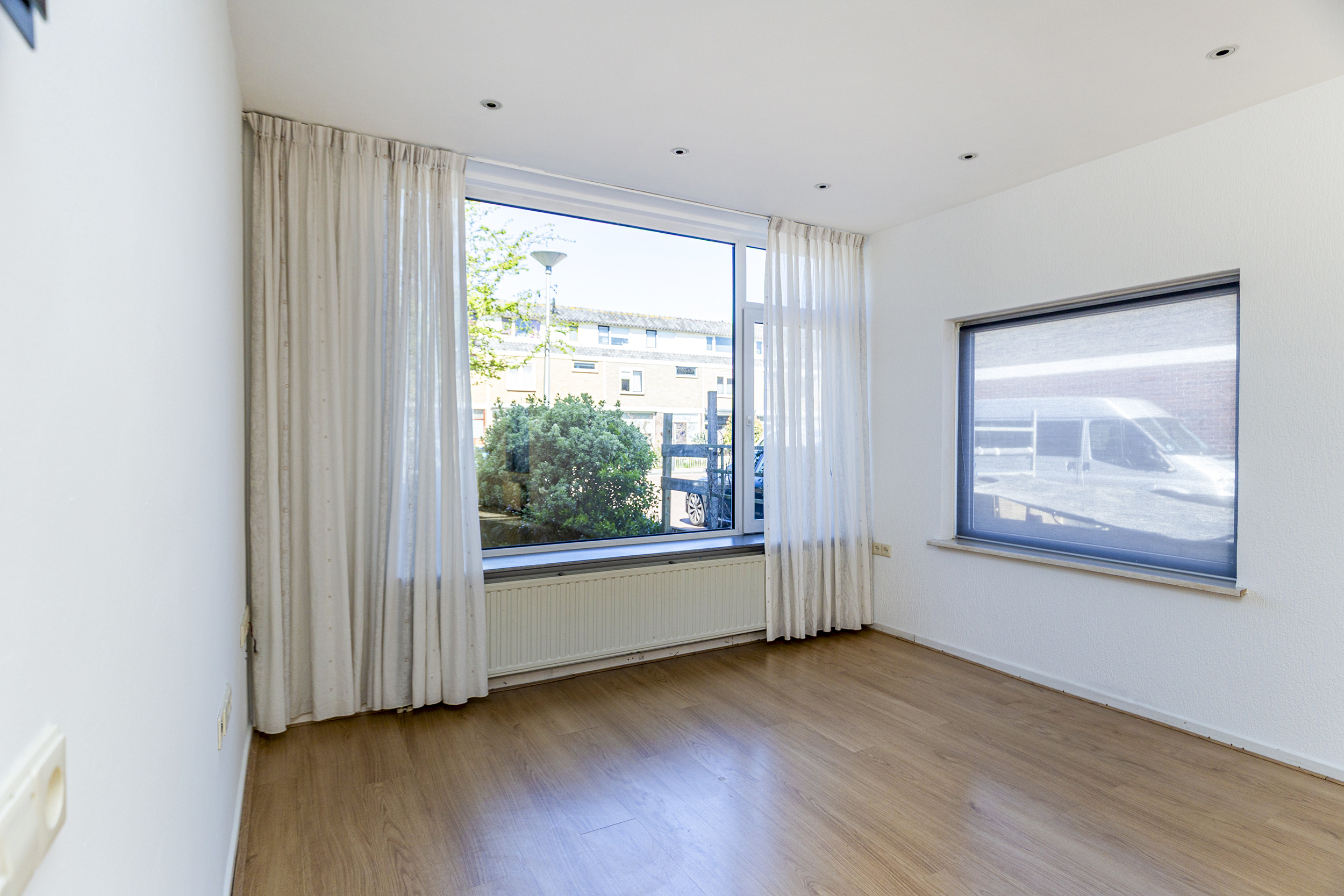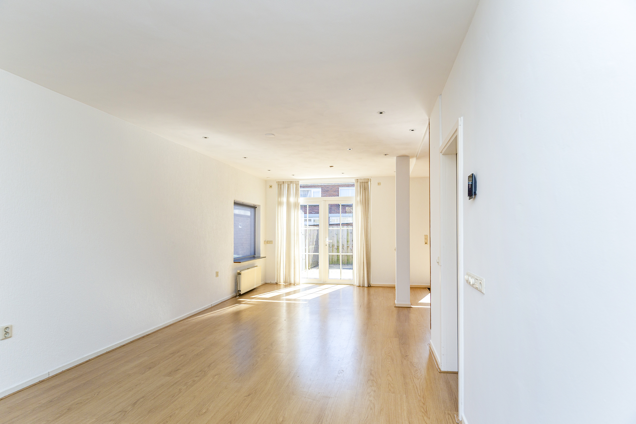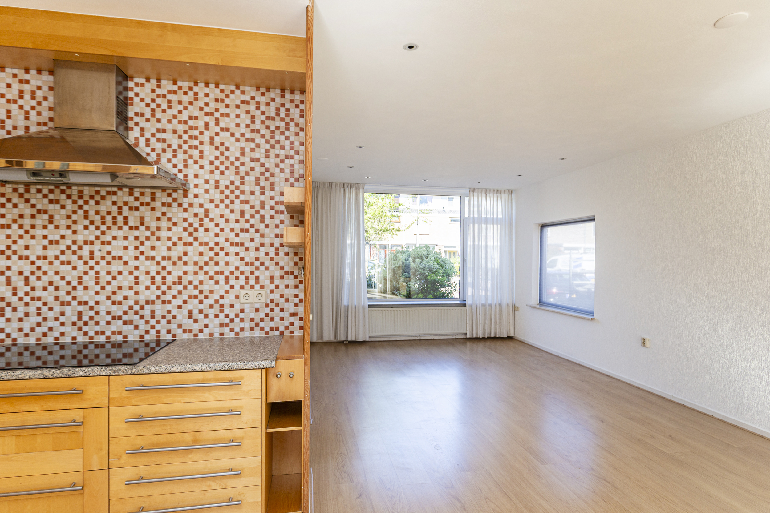 Via de voortuin kom je binnen in de hal met toilet, meterkast en een trapkast voor extra bergruimte. Vanuit hier loop je door naar de woonkamer. De uitgebouwde woonkamer is een heerlijke, lichte leefruimte met veel daglicht dankzij de grote raampartijen aan de voorzijde en de extra zijramen. Hierdoor voelt de ruimte open en prettig aan. De openslaande deuren zorgen voor een mooie verbinding met de tuin, waardoor binnen en buiten naadloos in elkaar overlopen.