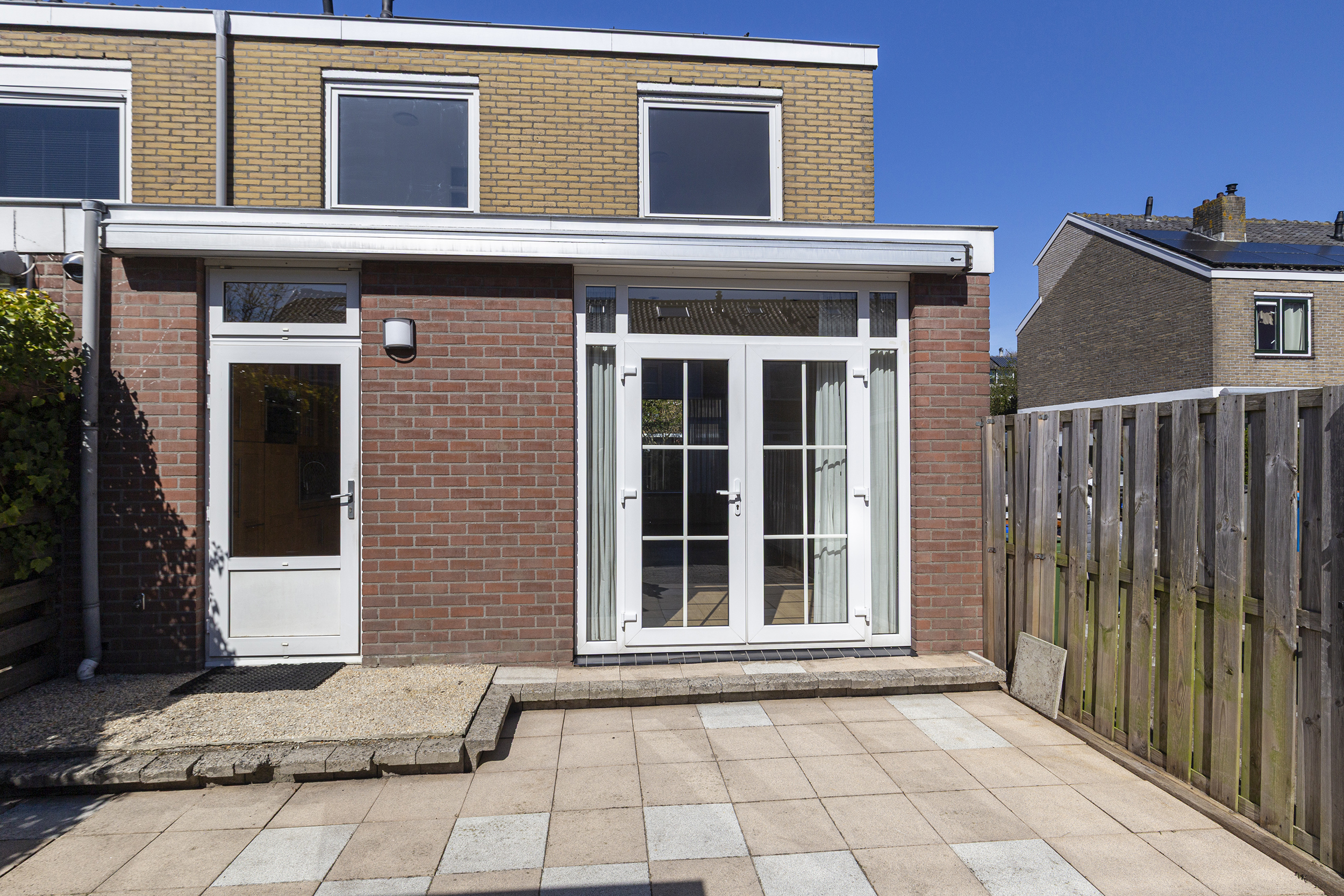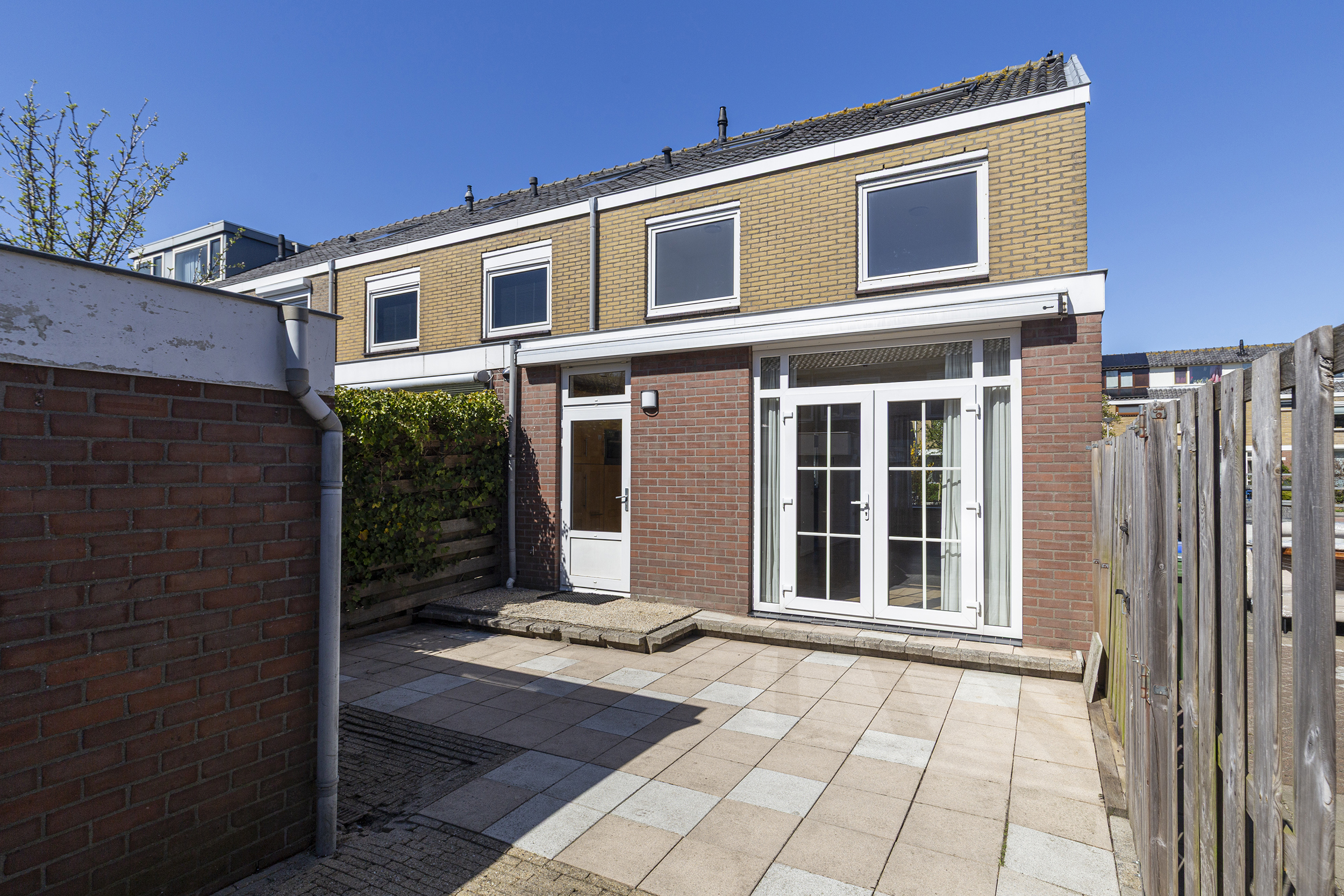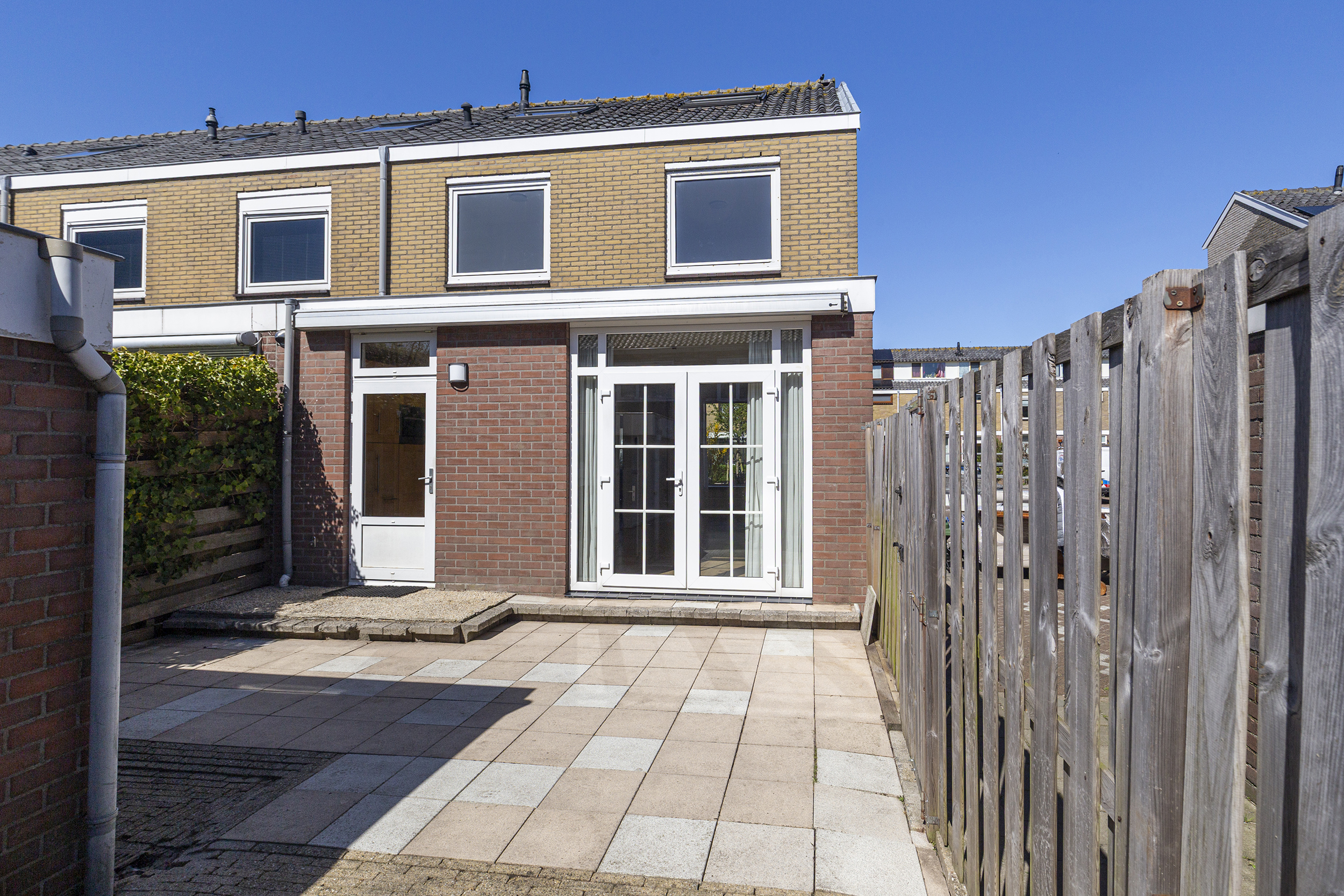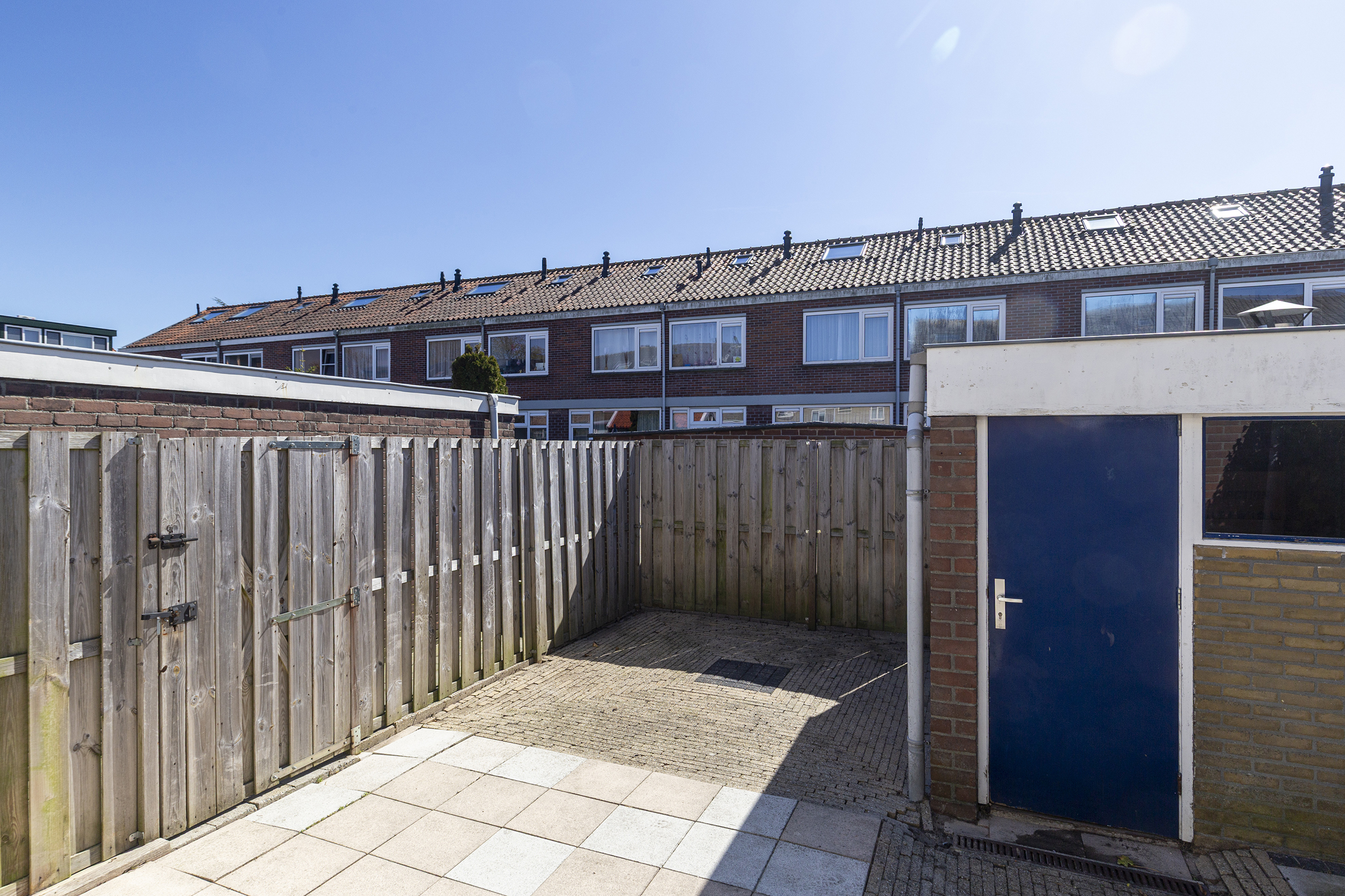 De achtertuin ligt op het zuiden en is een fijne plek om van de zon te genieten. Het zonnescherm zorgt voor schaduw op warme dagen. Achter in de tuin staat een berging en via de zijkant heeft u toegang tot de achtertuin.