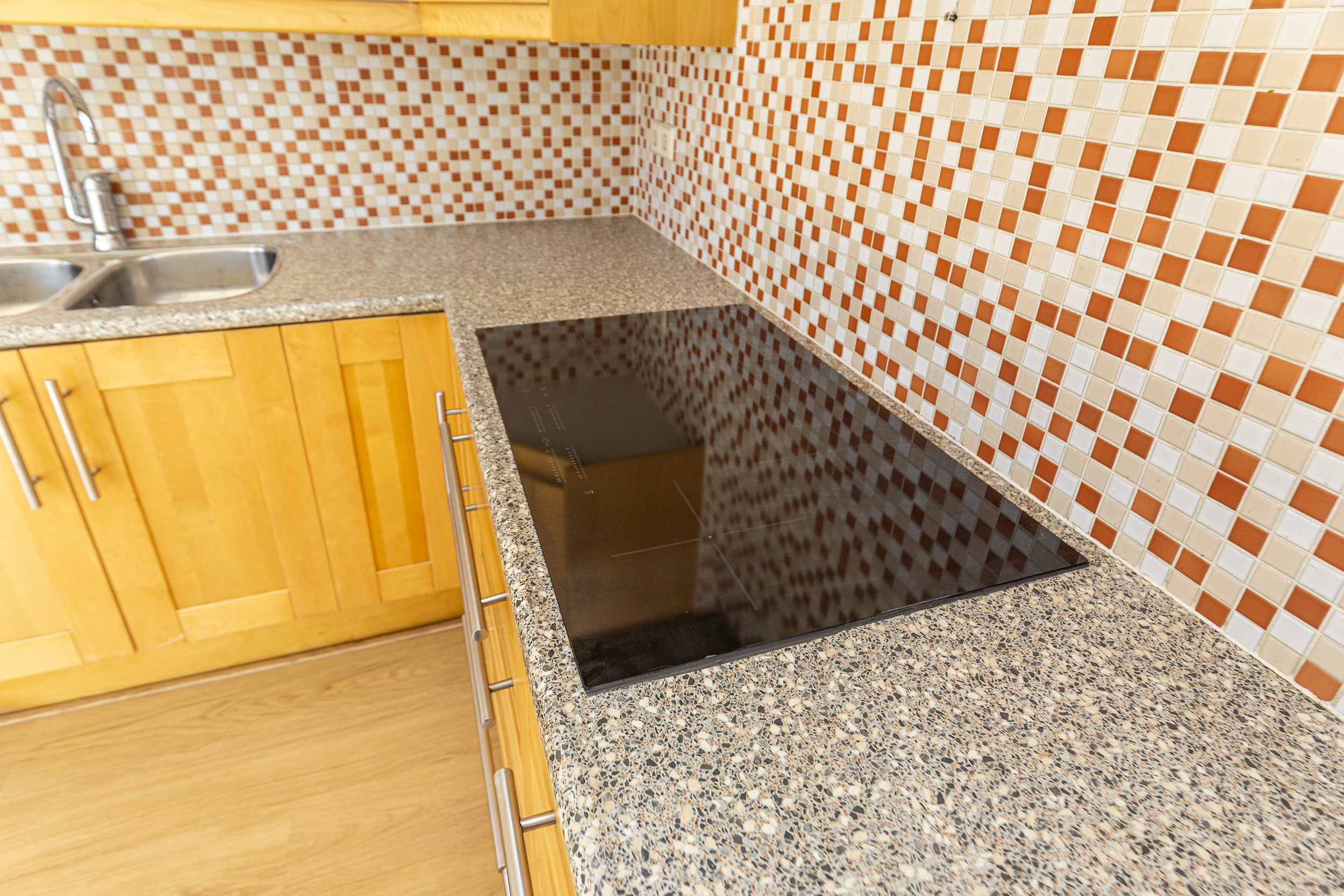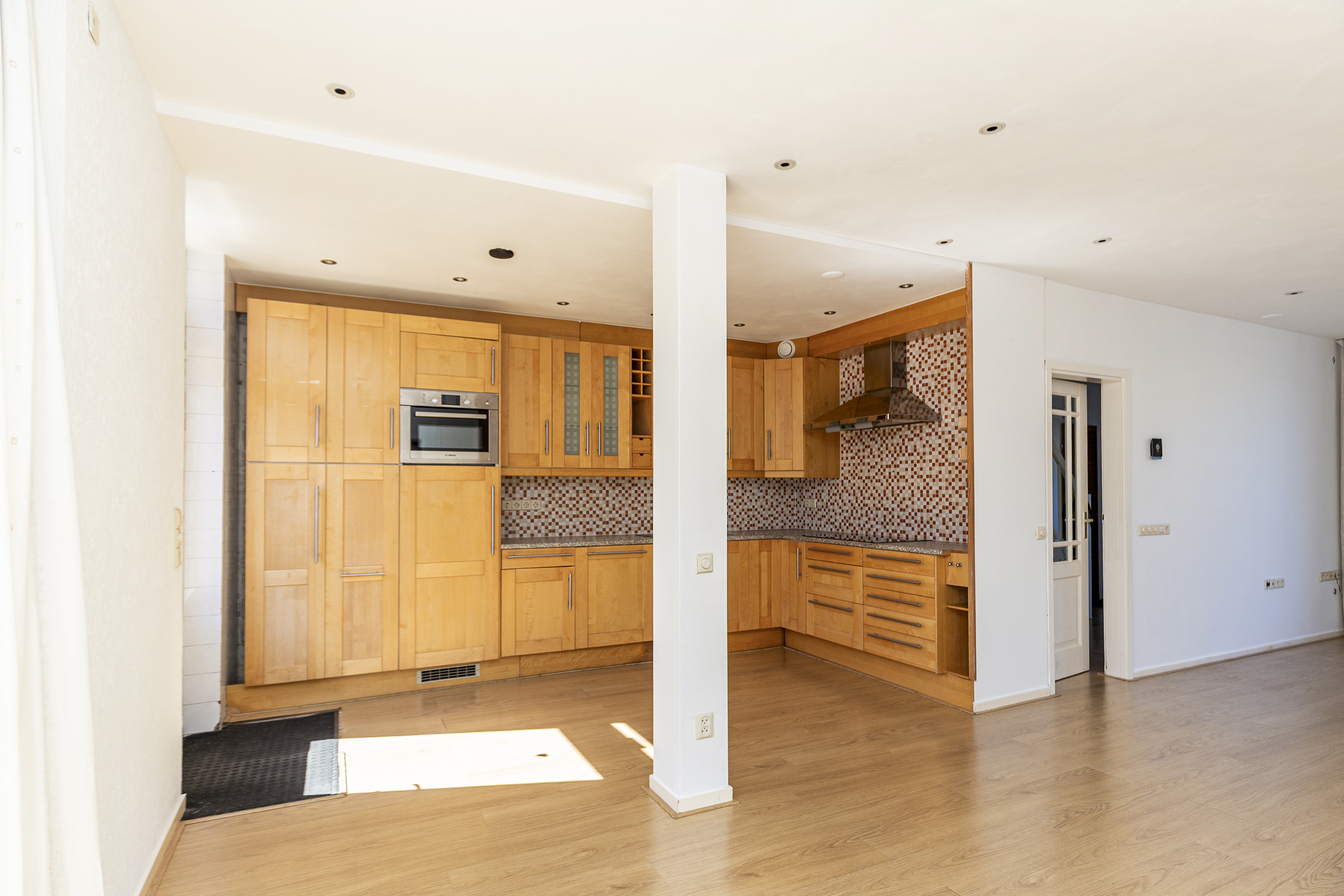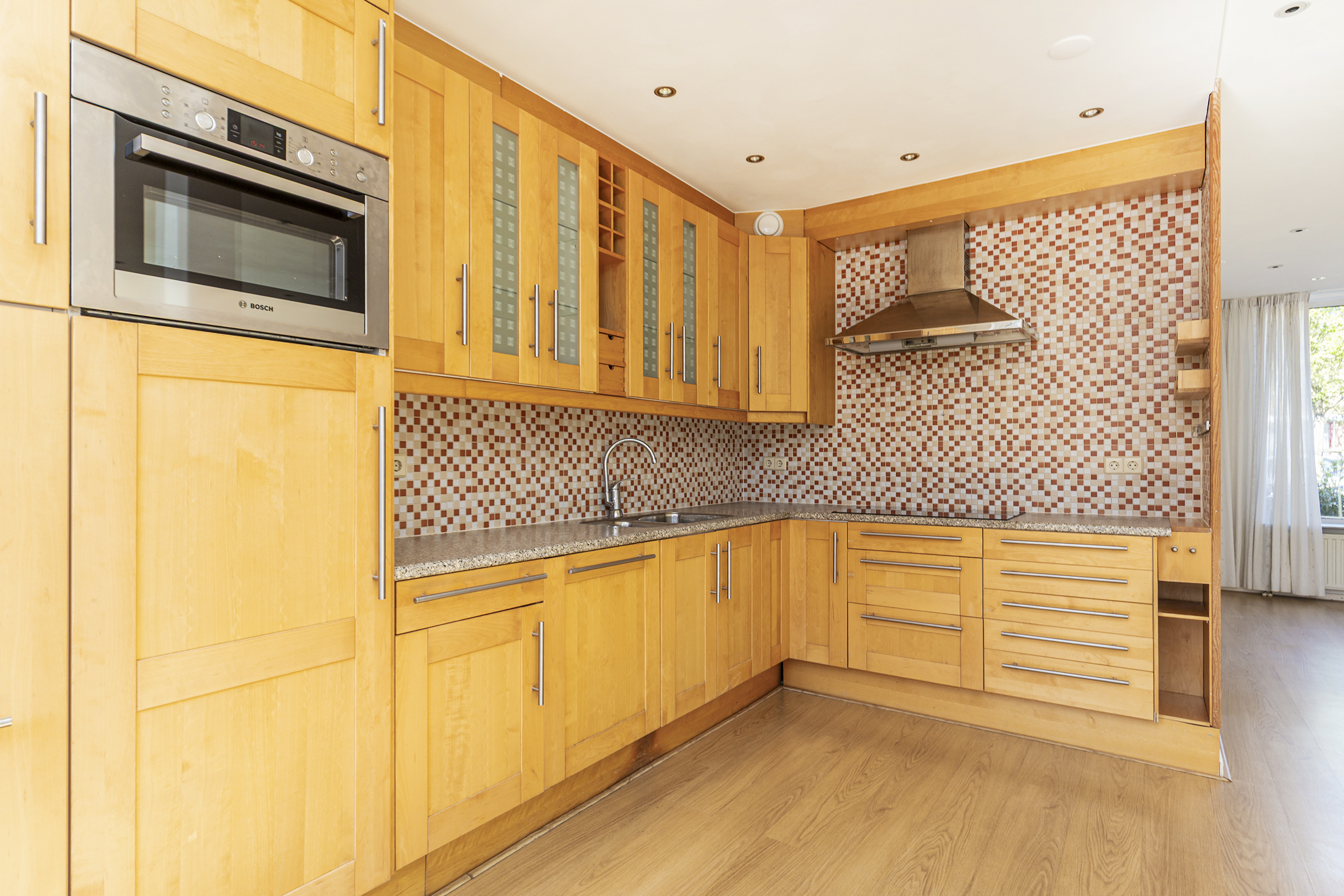 Aan de achterzijde van de woning bevindt zich de open keuken in hoekopstelling. Door de uitbouw is hier volop ruimte ontstaan, onder andere voor een grote eettafel waar je gezellig kunt tafelen. De keuken is voorzien van een 4-pits inductiekookplaat en twee spoelbakken en biedt voldoende werk- en bergruimte.