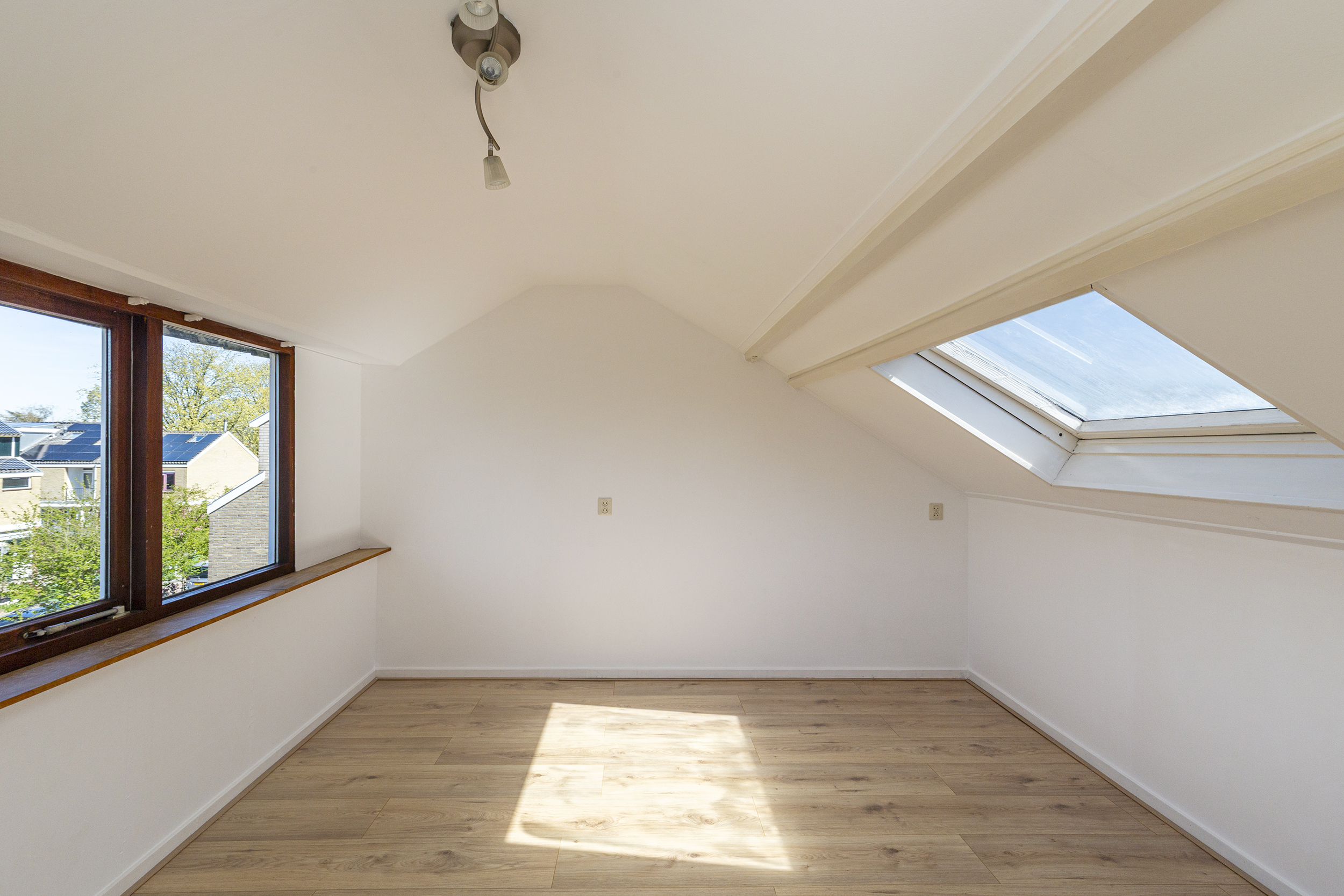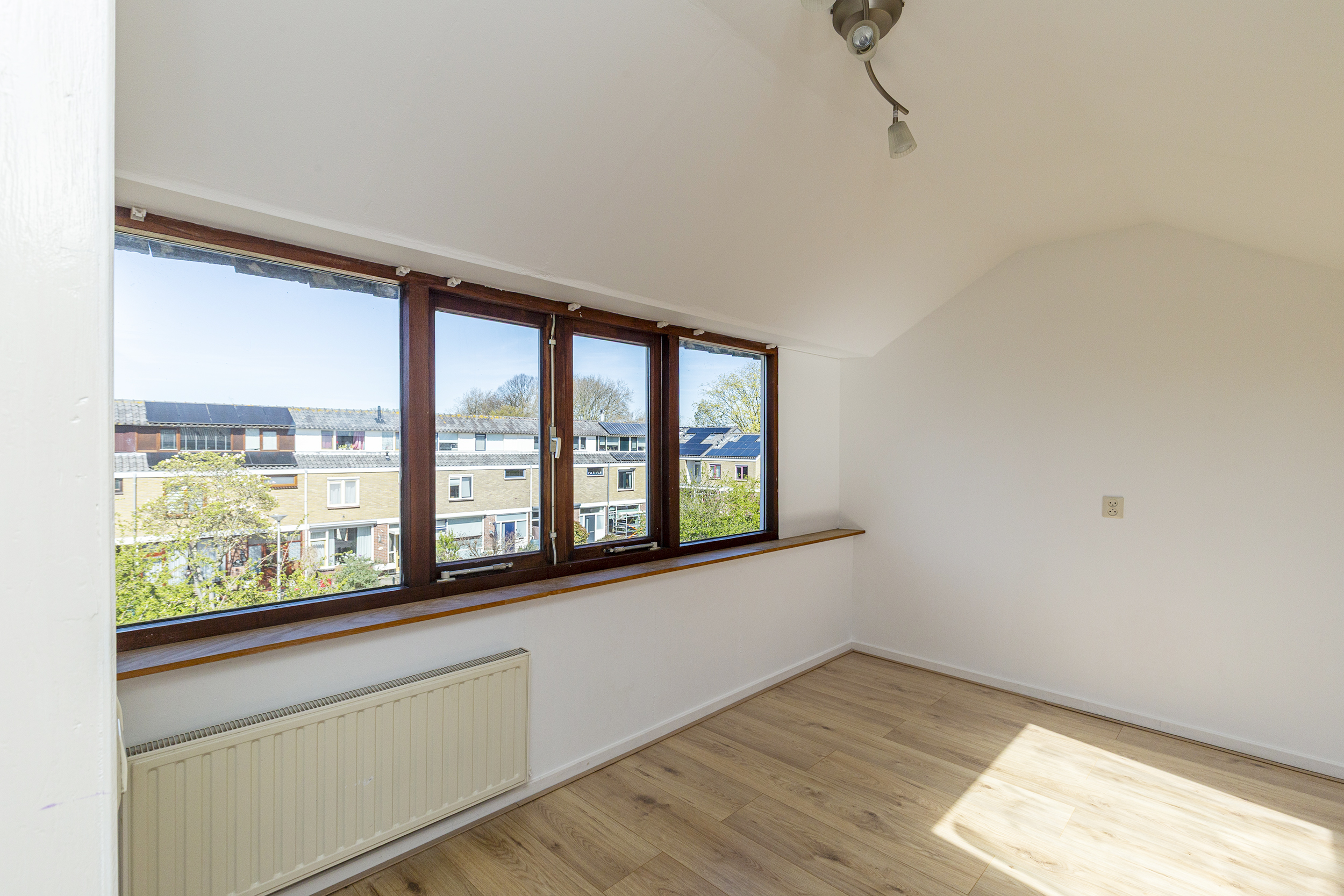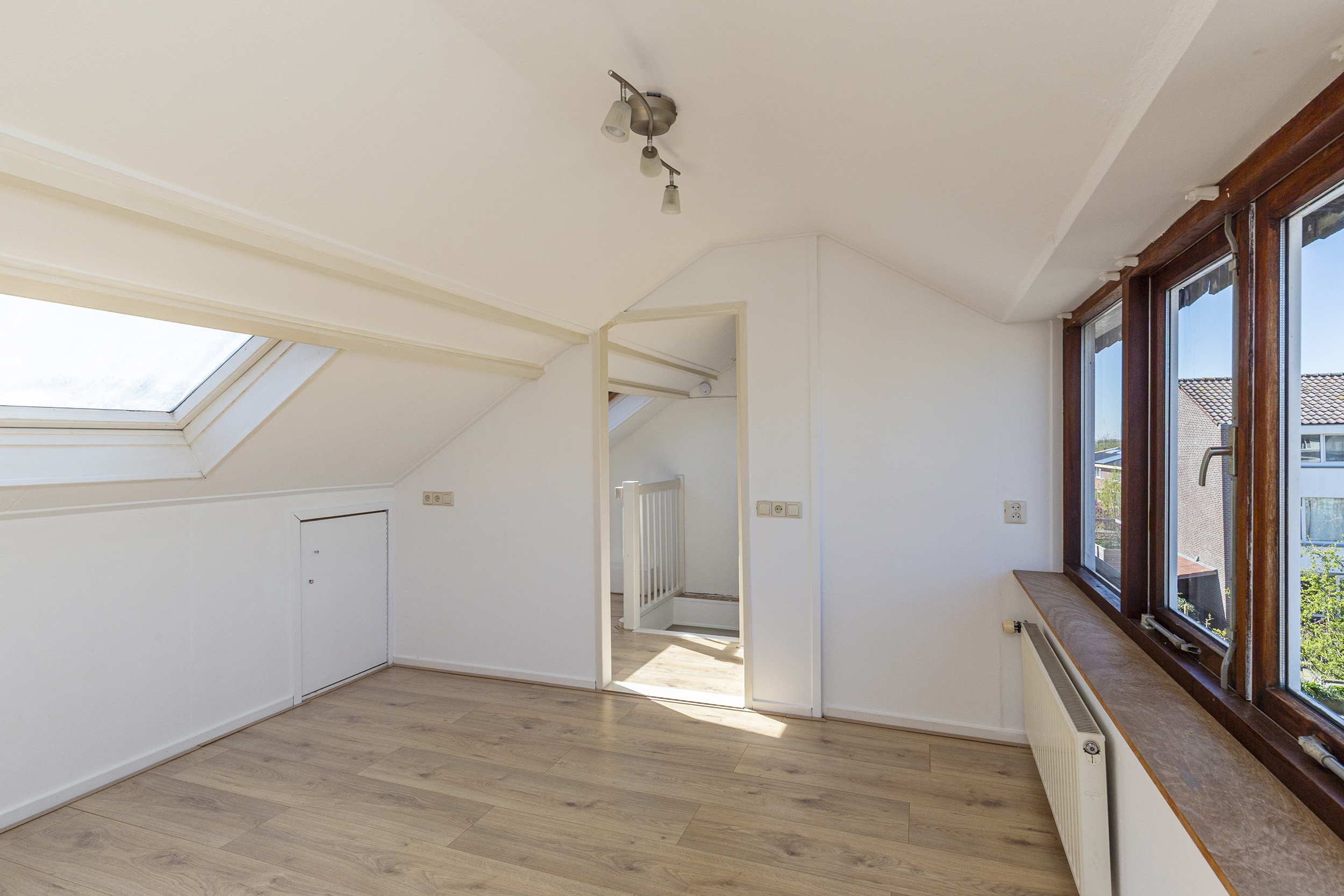 Via een vaste trap bereik je de zolderverdieping. Door de opbouw is hier een volwaardige en ruime vierde slaapkamer gerealiseerd, waardoor deze verdieping echt als extra woonlaag gebruikt kan worden. De kamer beschikt over een dakraam en biedt voldoende ruimte voor bijvoorbeeld een grote slaapkamer of werkplek.