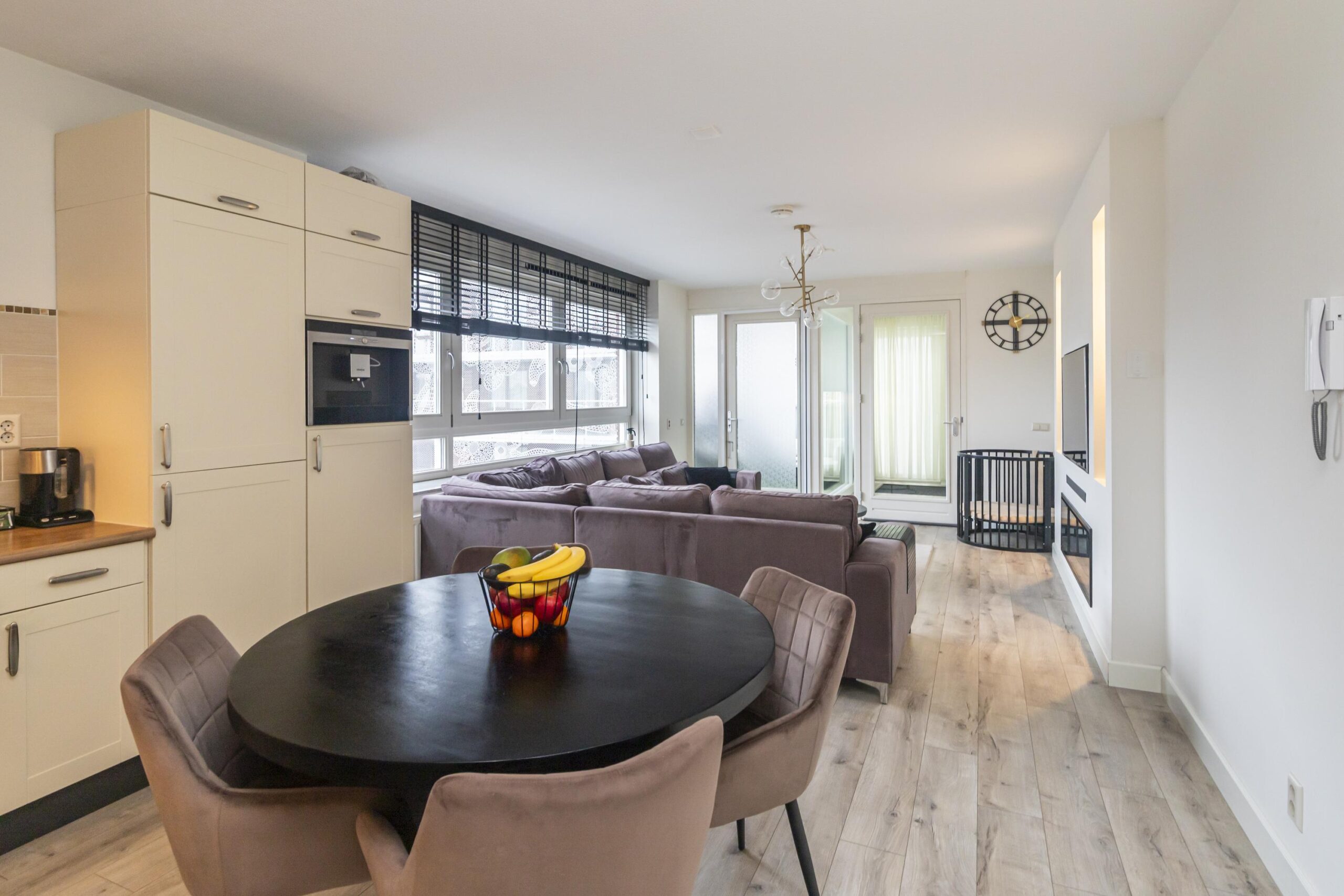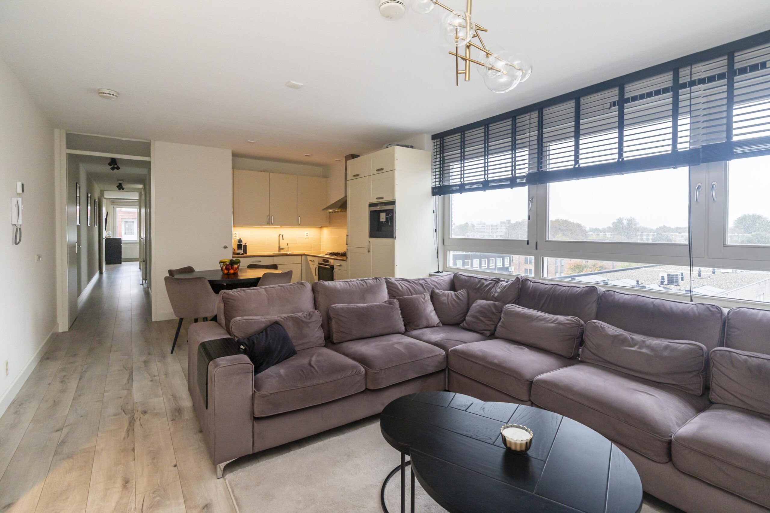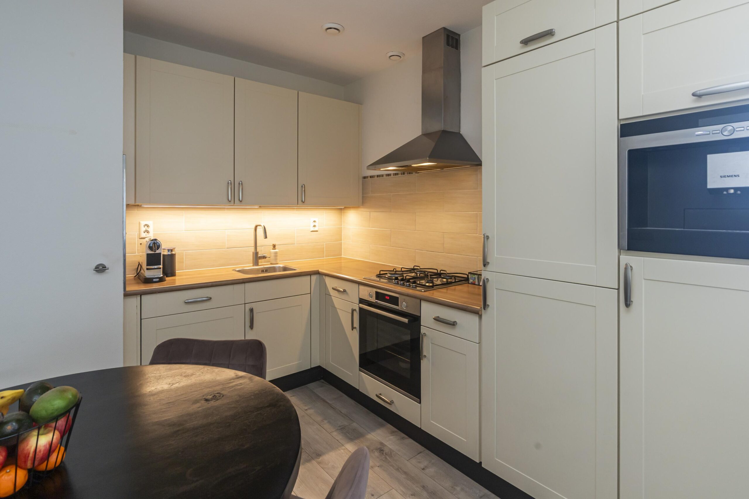 Entree van de woning via een ruime hal met meterkast. De lichte woonkamer is voorzien van een nette vloerafwerking en biedt toegang tot het zonnige balkon. De moderne open keuken in hoekopstelling is uitgerust met diverse inbouwapparatuur, waaronder een kookplaat, afzuigkap, oven, koelkast, vriezer, vaatwasser en inbouw koffiemachine.