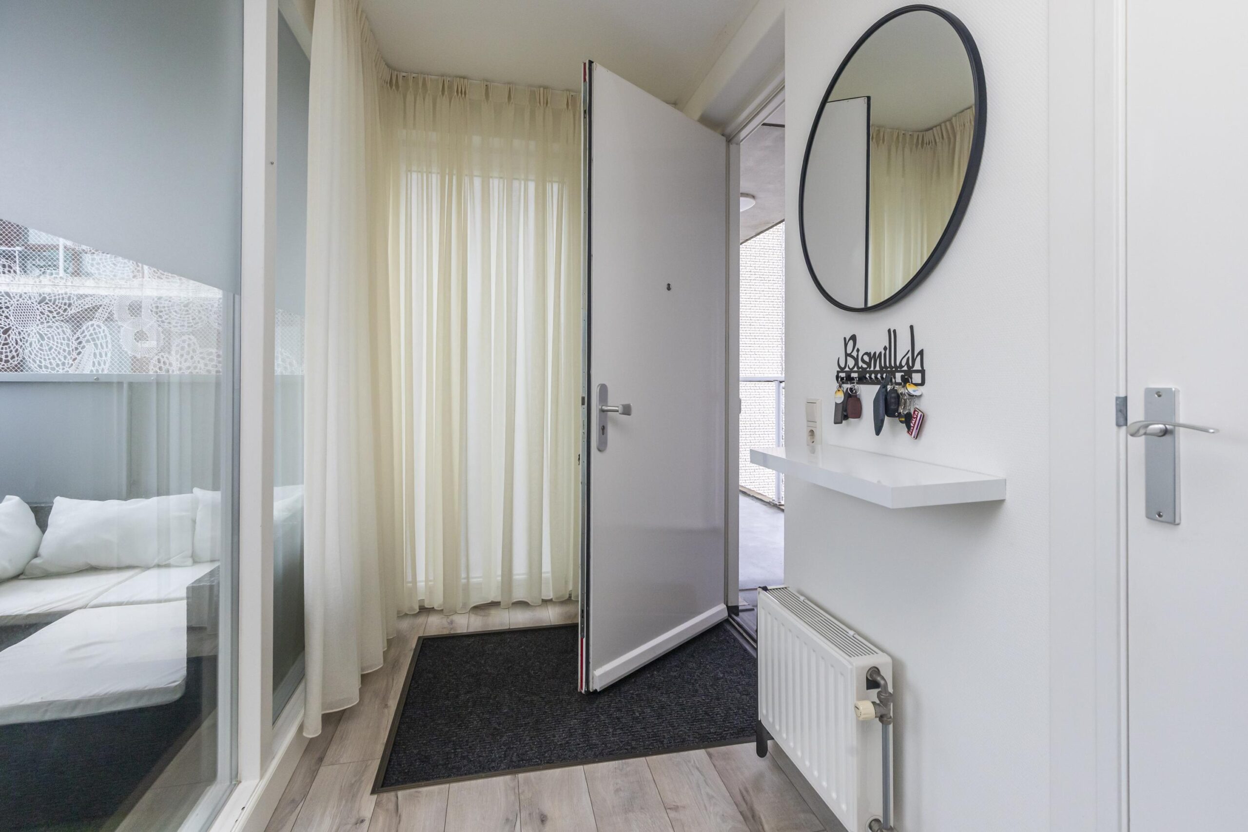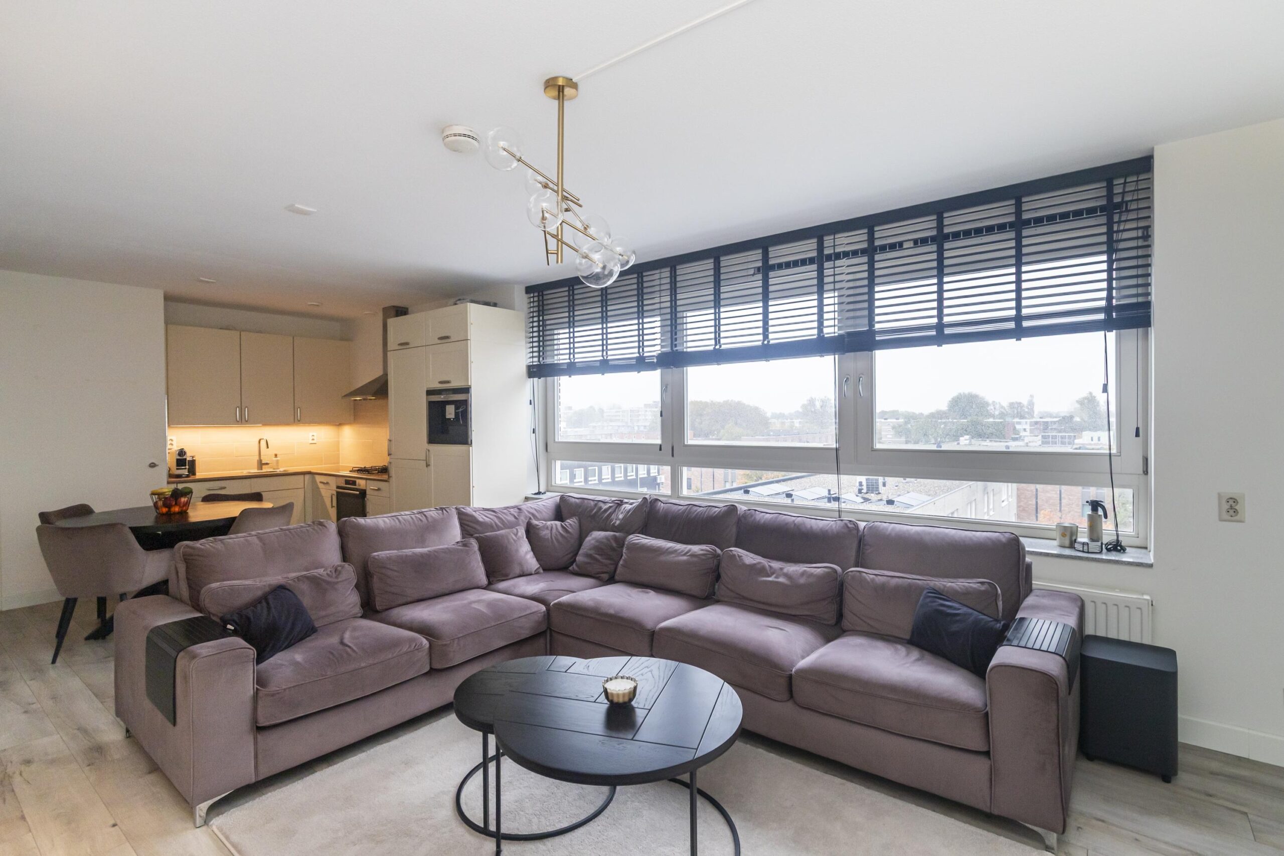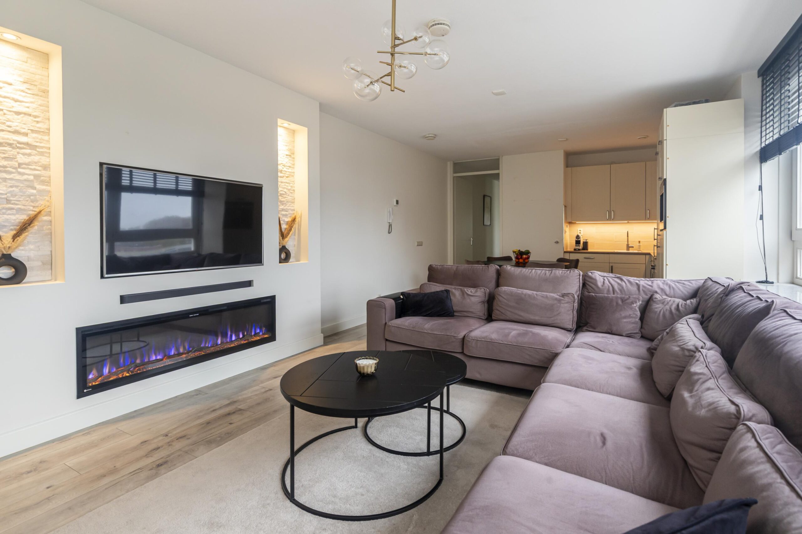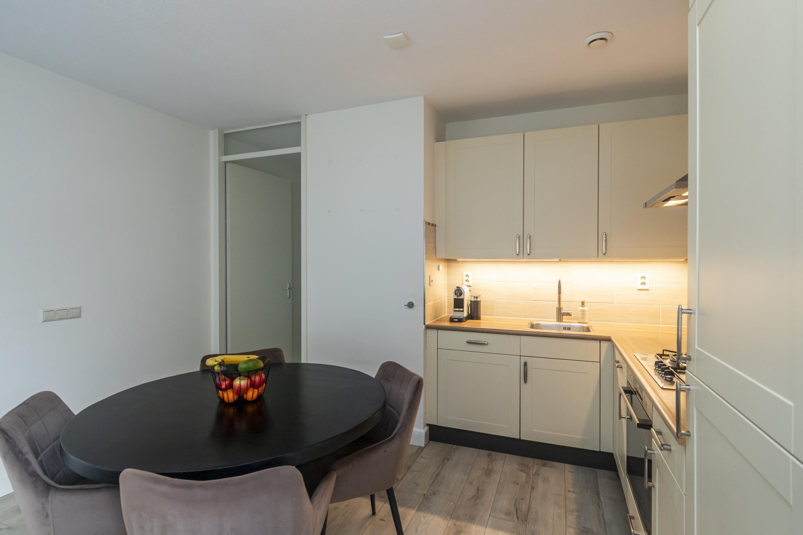 Entree van de woning via een ruime hal met meterkast. De lichte woonkamer is voorzien van een nette vloerafwerking en biedt toegang tot het zonnige balkon. De moderne open keuken in hoekopstelling is uitgerust met diverse inbouwapparatuur, waaronder een kookplaat, afzuigkap, oven, koelkast, vriezer, vaatwasser en inbouw koffiemachine.
