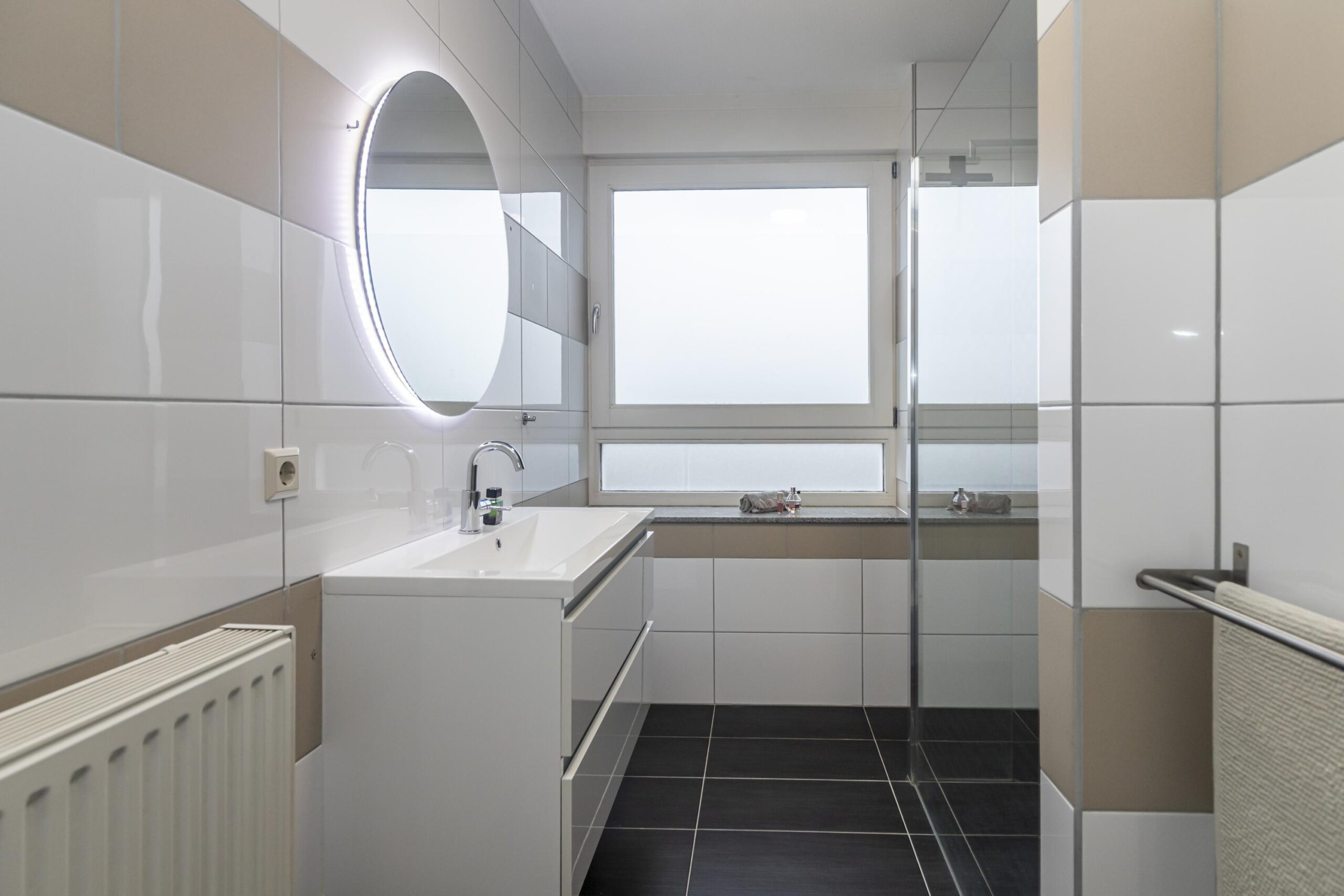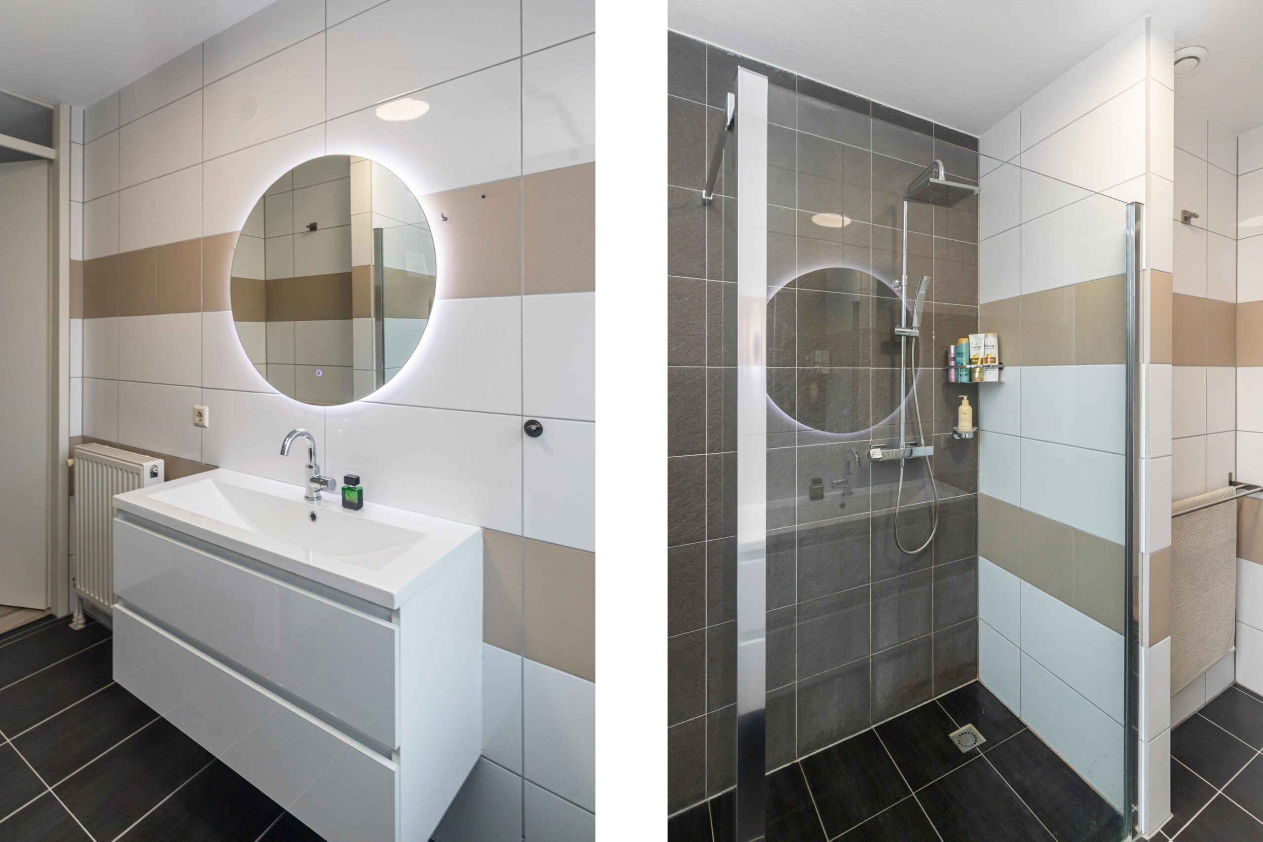 De moderne badkamer is geheel betegeld en voorzien van een ruime inloopdouche en een stijlvol wastafelmeubel.