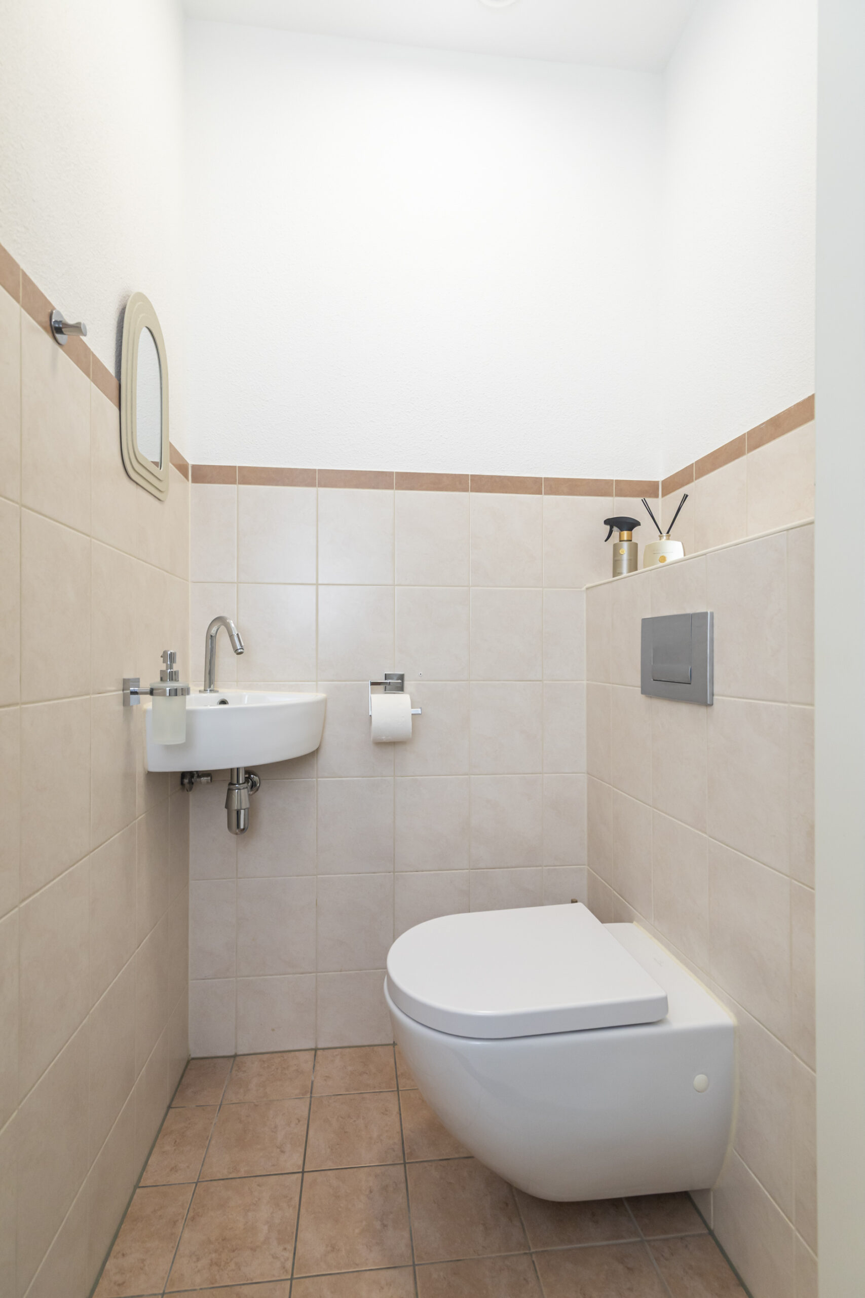 Er is een separate toiletruimte met wandcloset en fontein. Hiernaast is er een ruimte met een vaste kast met aansluiting voor de wasmachine en wasdroger.