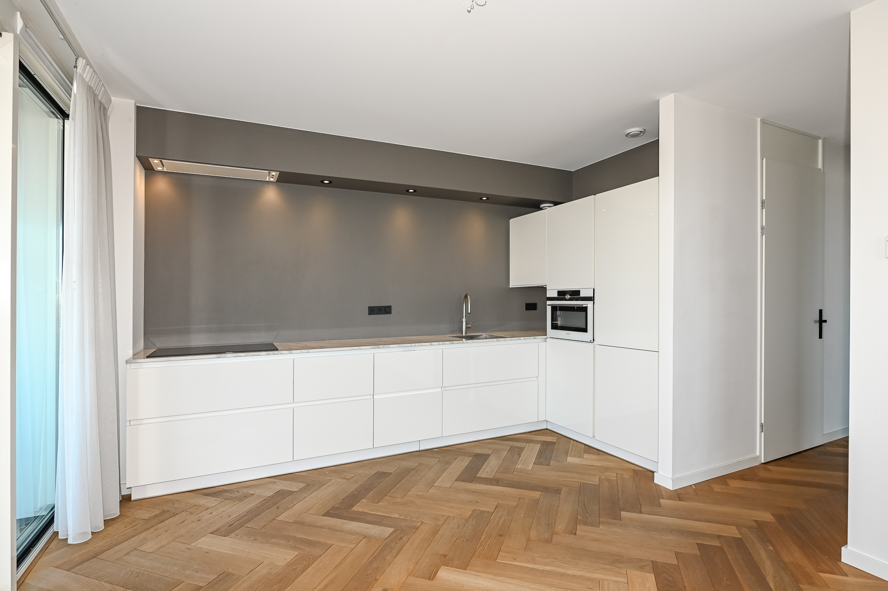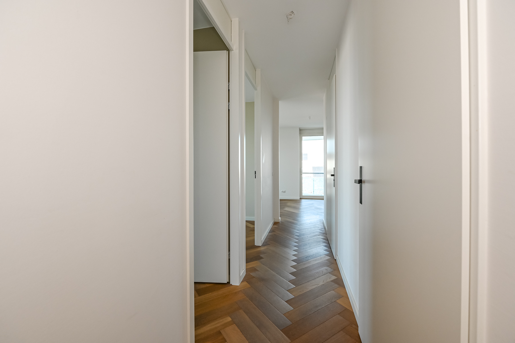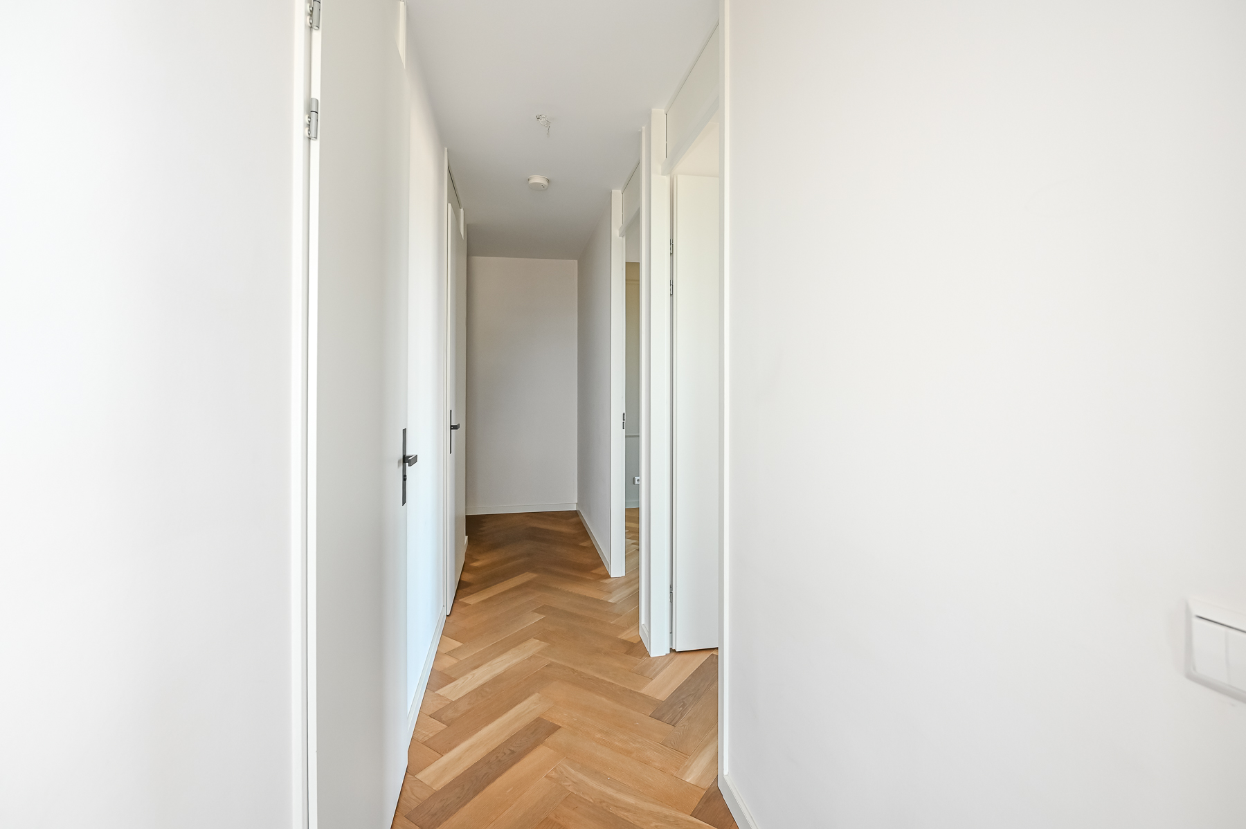 De woning is gelegen op de tweede verdieping. Je komt binnen via een hal die toegang geeft tot de woonkamer met open keuken, twee ruime slaapkamers, de badkamer en een aparte wasruimte. De woonkamer is licht dankzij drie schuifpuien en de wanden en plafonds zijn strak gestuukt. De vloer is een houten visgraatvloer, voorzien van zowel vloerverwarming als vloerverkoeling. Vanuit de woonkamer stap je via de schuifpuien direct het ruime balkon op gelegen op het oosten, waardoor u 's-ochtends geniet van de van het eerste zonlicht van de dag.