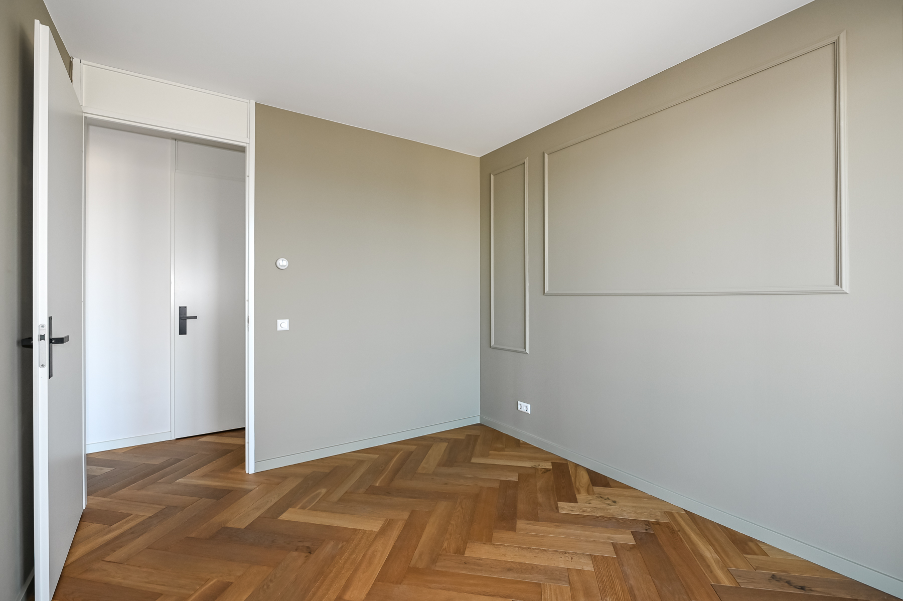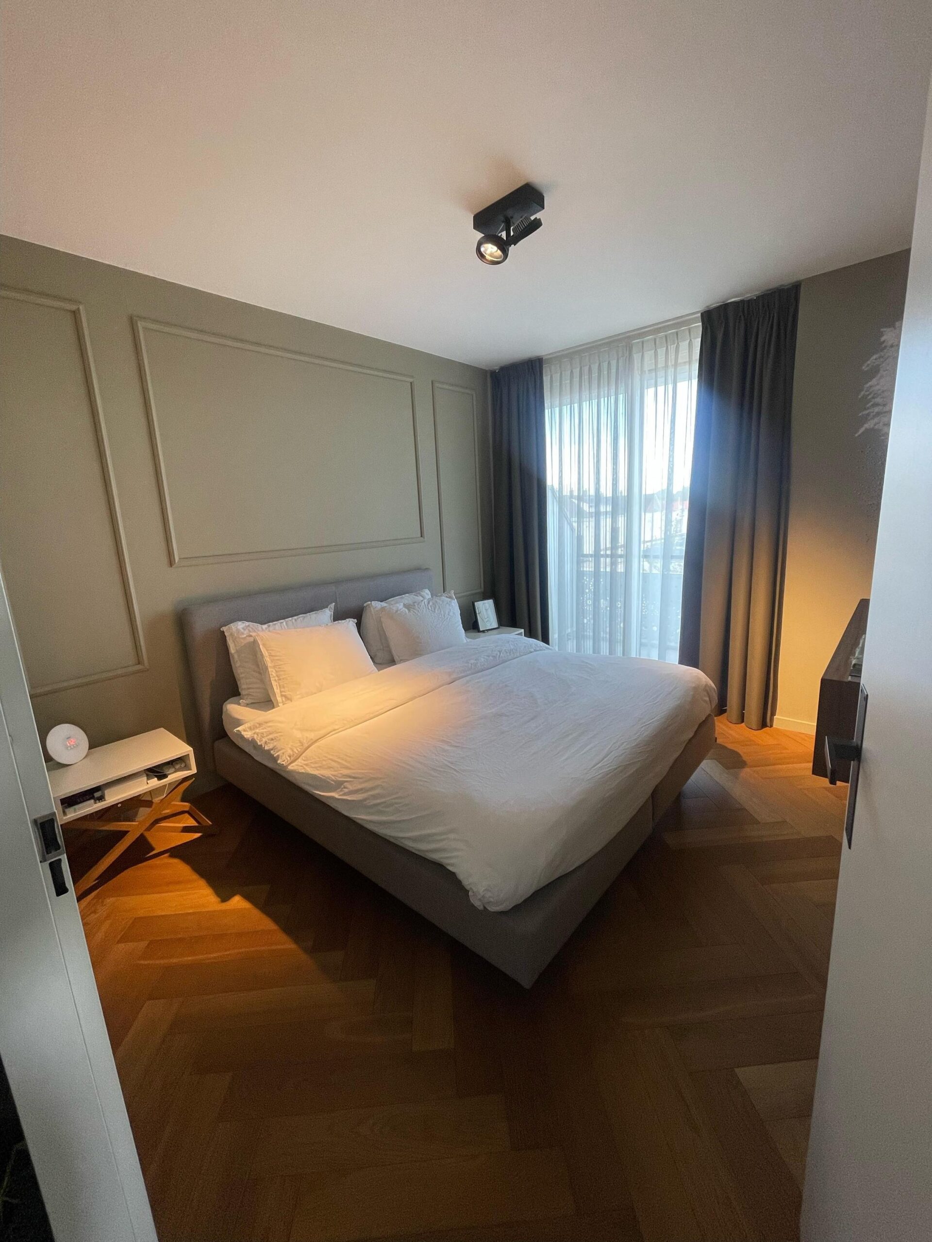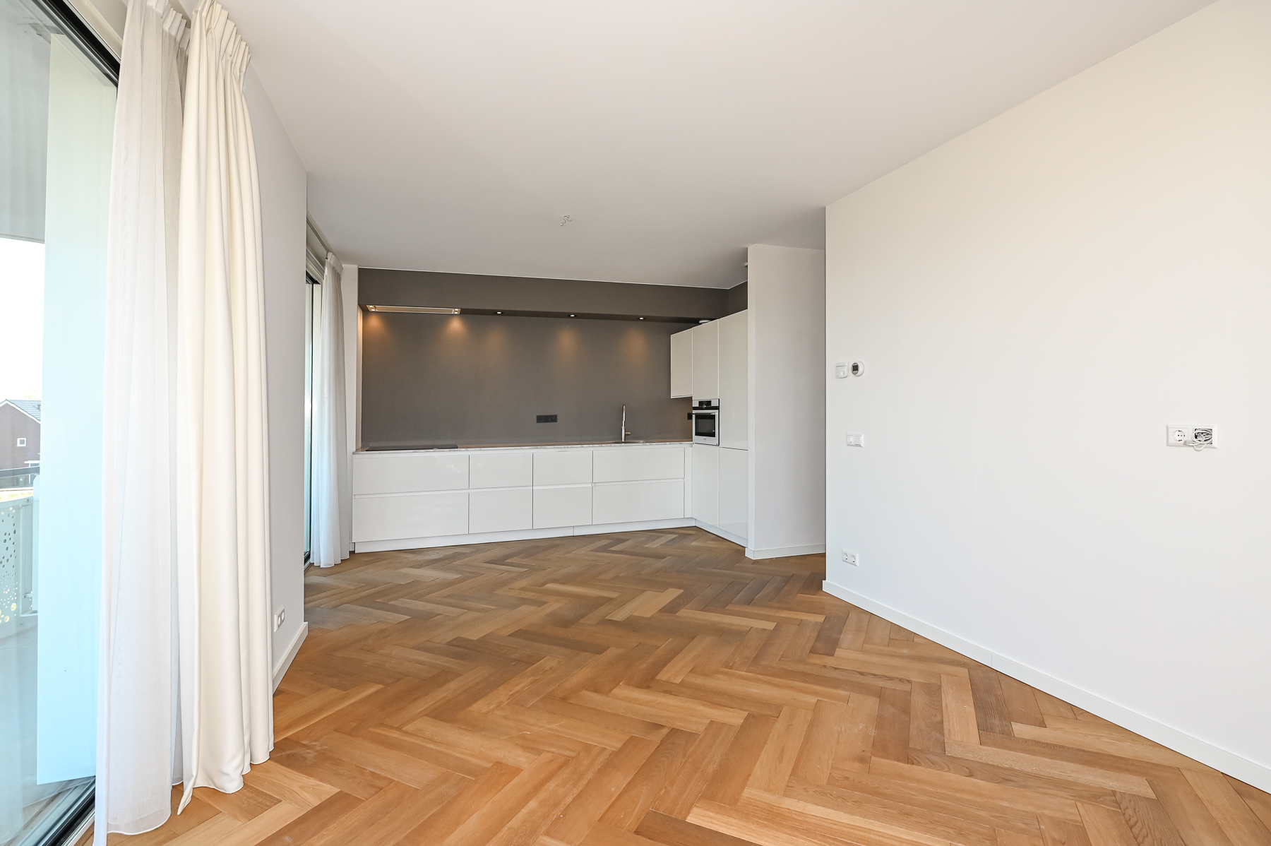 De woning is gelegen op de tweede verdieping. Je komt binnen via een hal die toegang geeft tot de woonkamer met open keuken, twee ruime slaapkamers, de badkamer en een aparte wasruimte. De woonkamer is licht dankzij drie schuifpuien en de wanden en plafonds zijn strak gestuukt. De vloer is een houten visgraatvloer, voorzien van zowel vloerverwarming als vloerverkoeling. Vanuit de woonkamer stap je via de schuifpuien direct het ruime balkon op gelegen op het oosten, waardoor u 's-ochtends geniet van de van het eerste zonlicht van de dag.