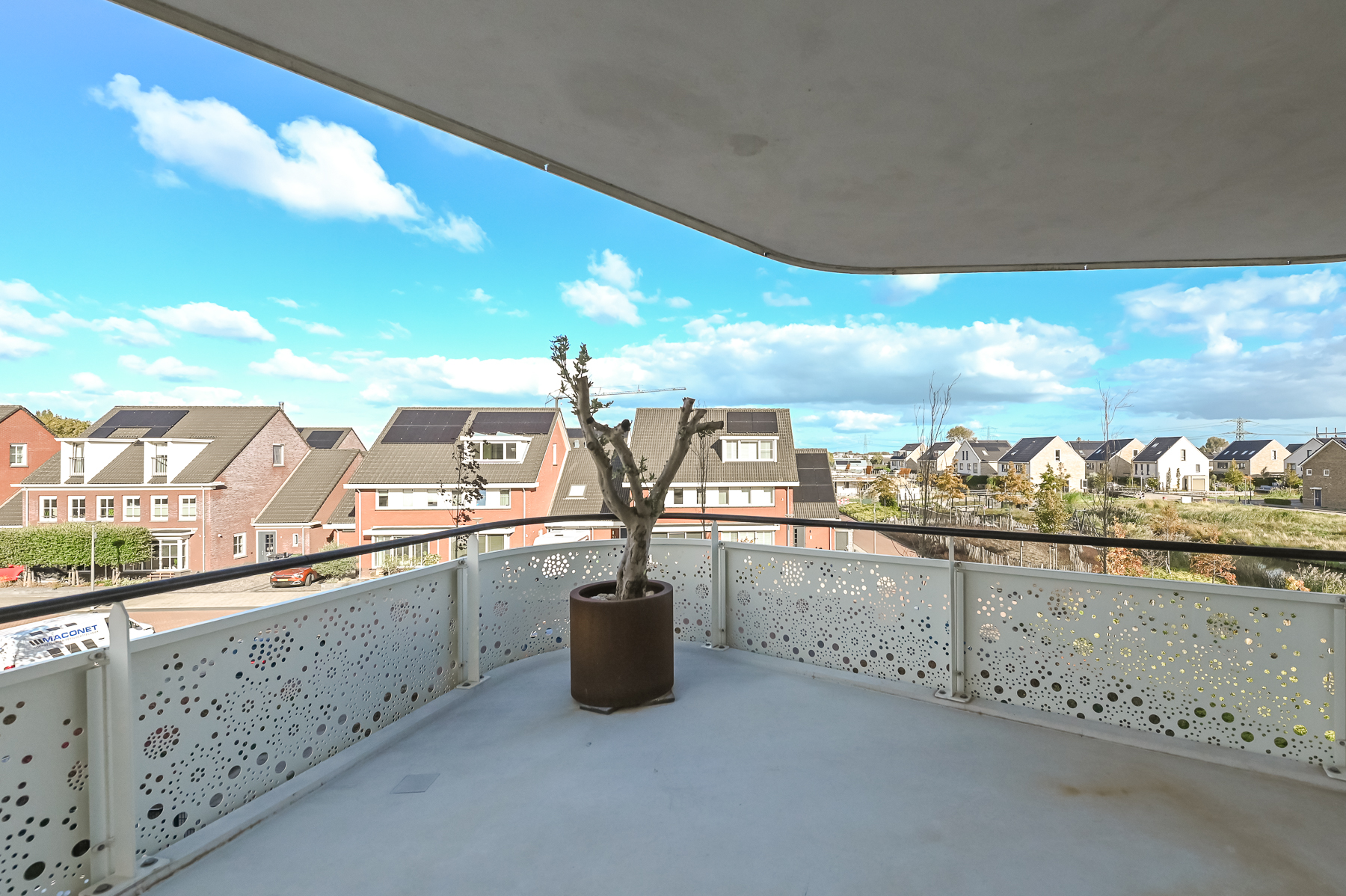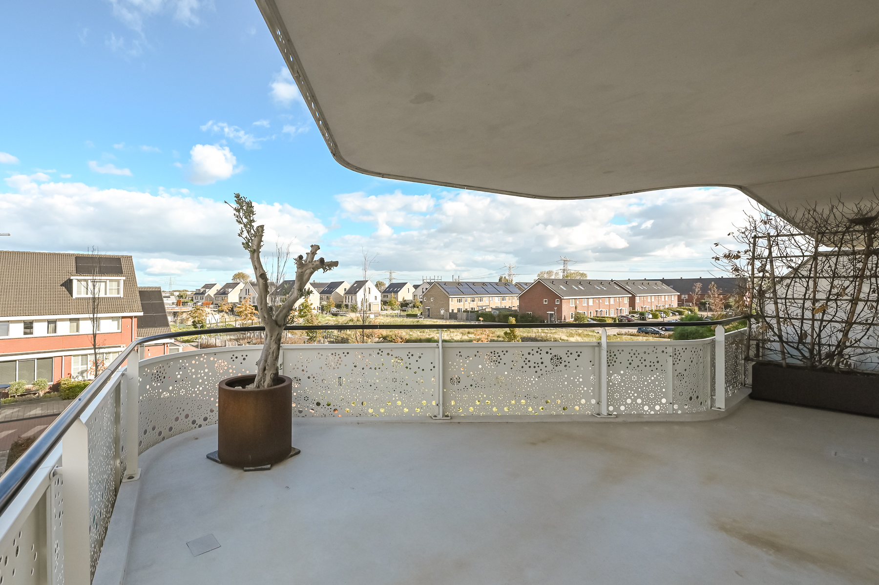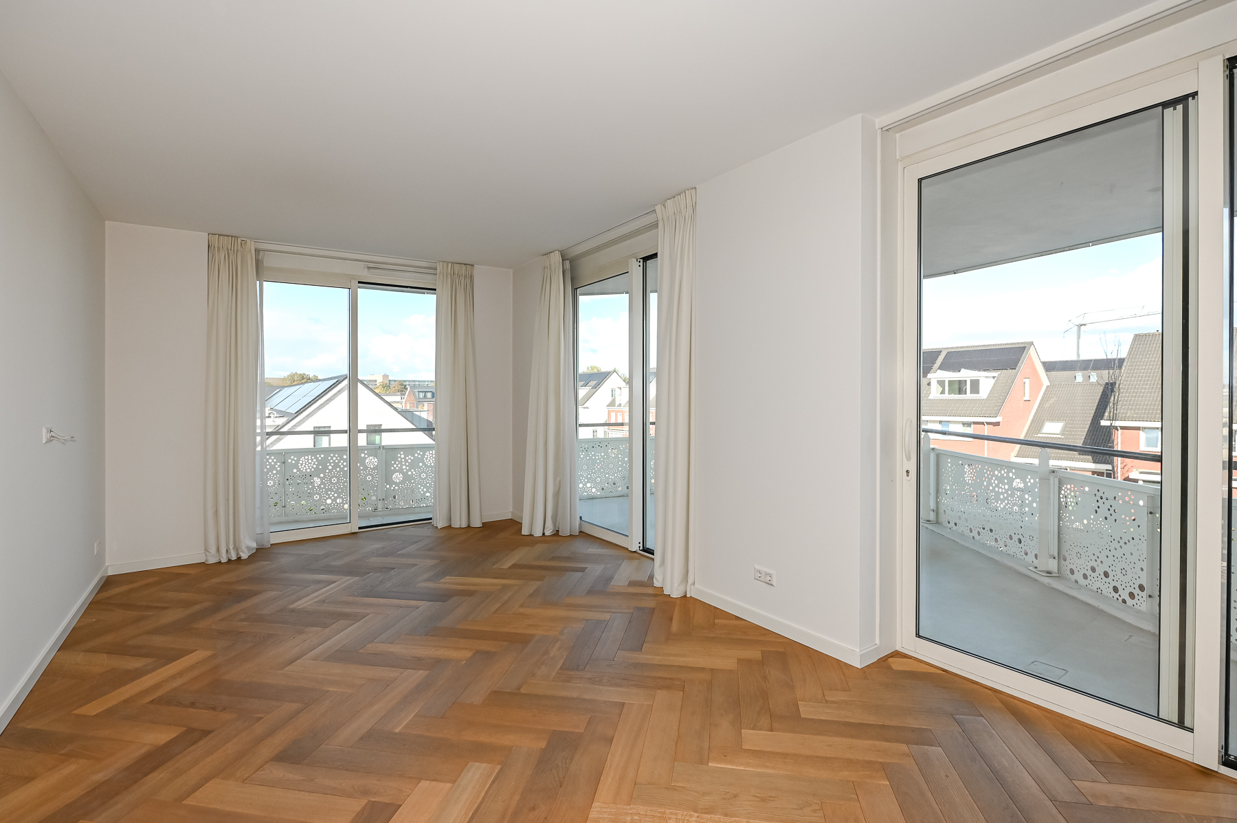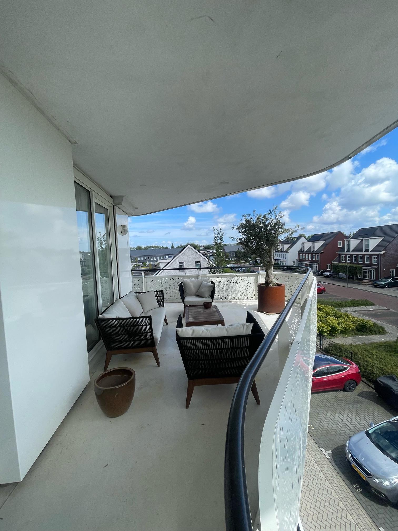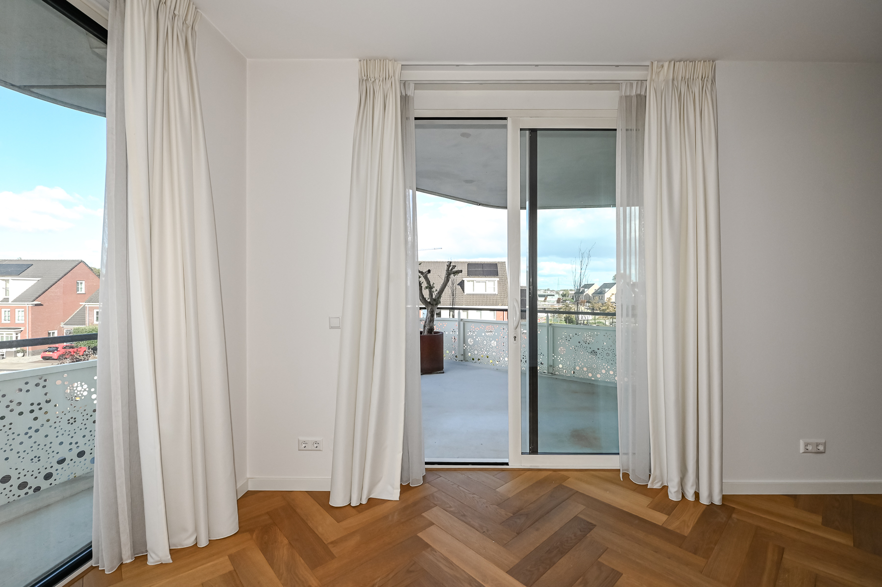 Het ruime balkon van ca. 33 m² ligt op het oosten, waardoor je ’s ochtends kunt genieten van het eerste licht. Doordat het een hoekappartement is en op de tweede verdieping ligt met schuifpuien, is er extra lichtinval en uitzicht.