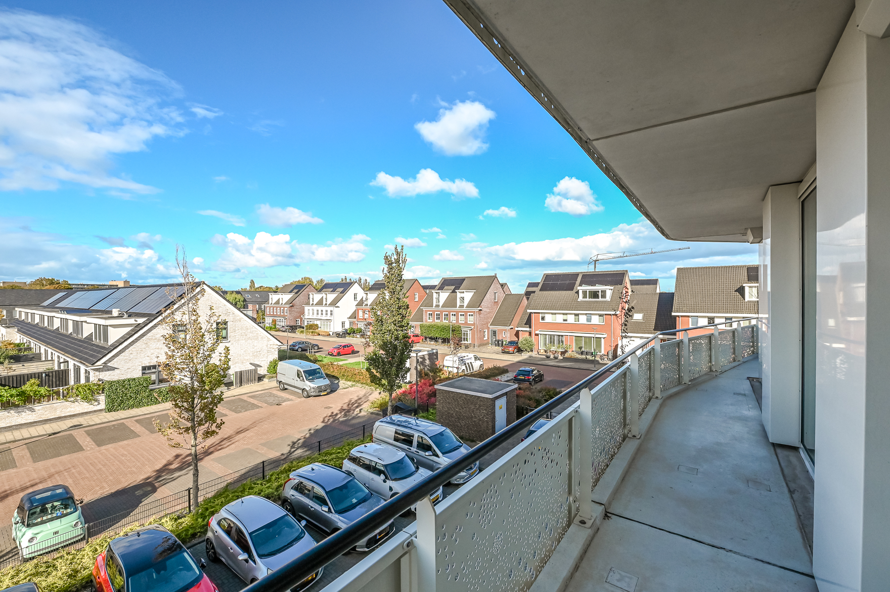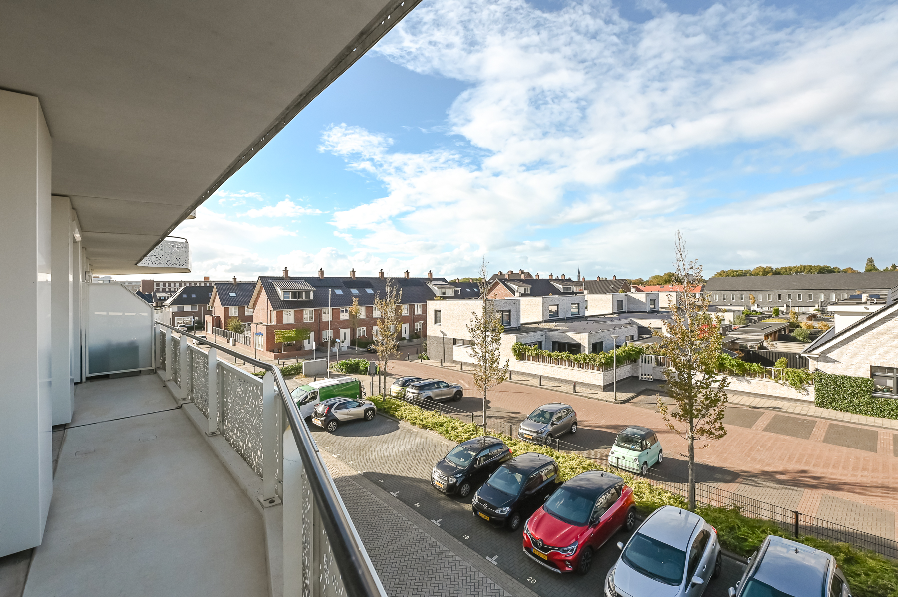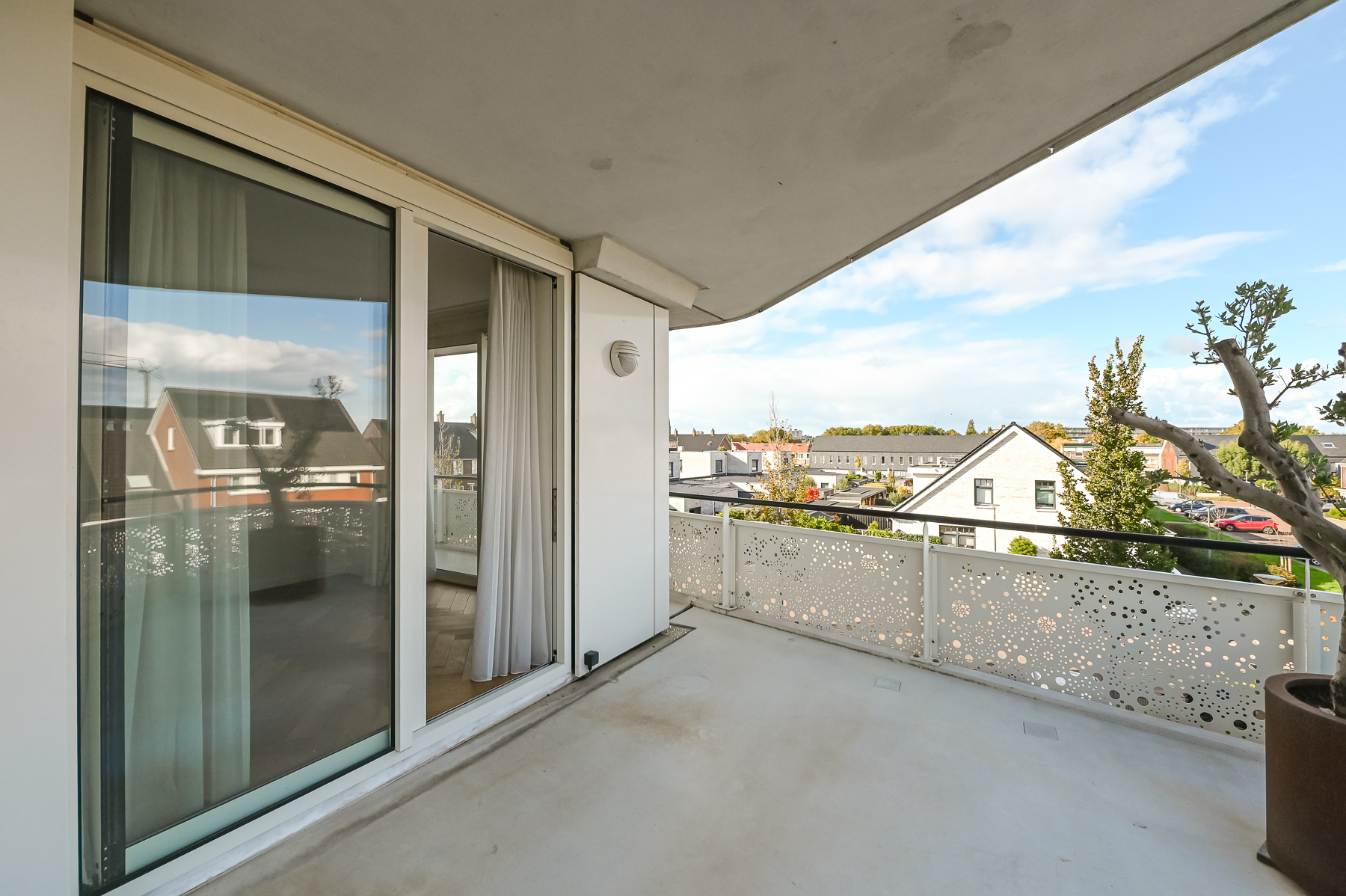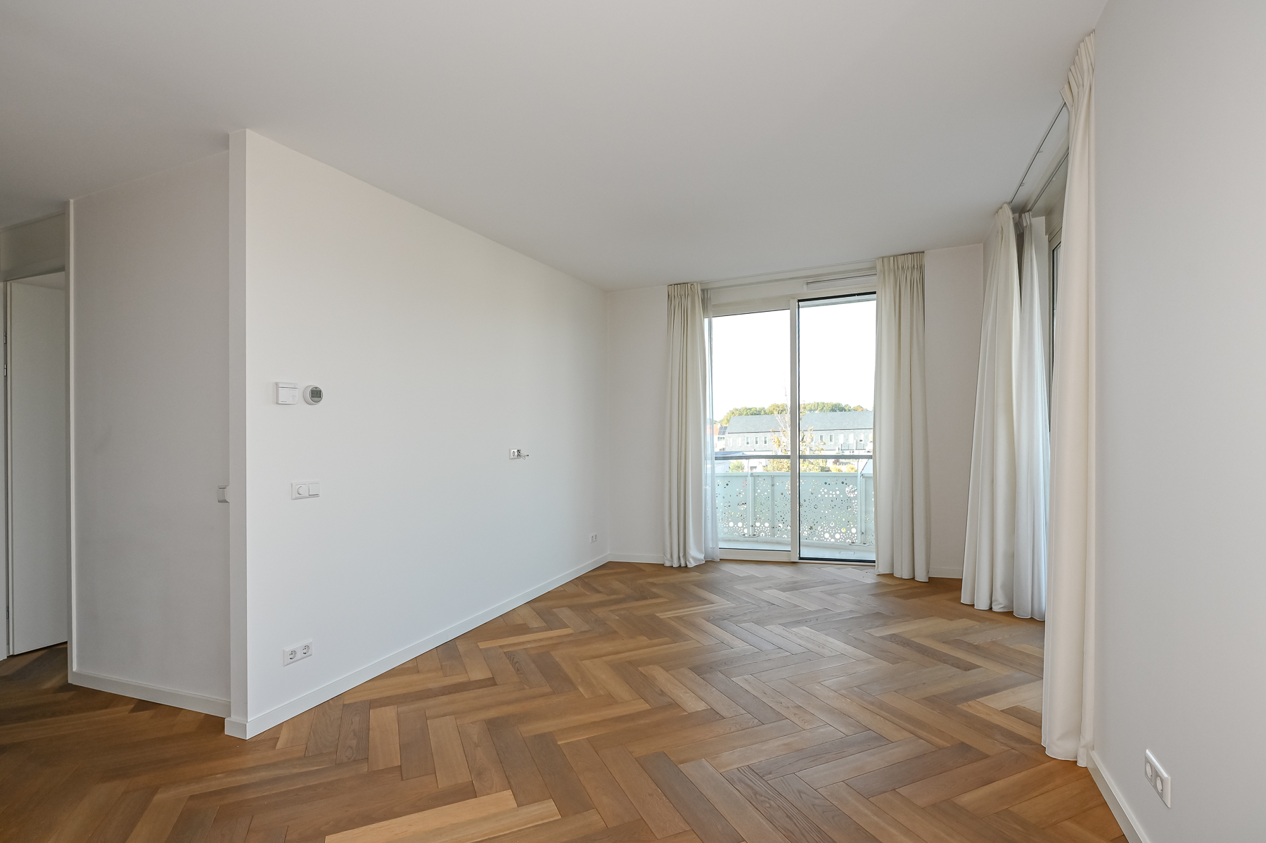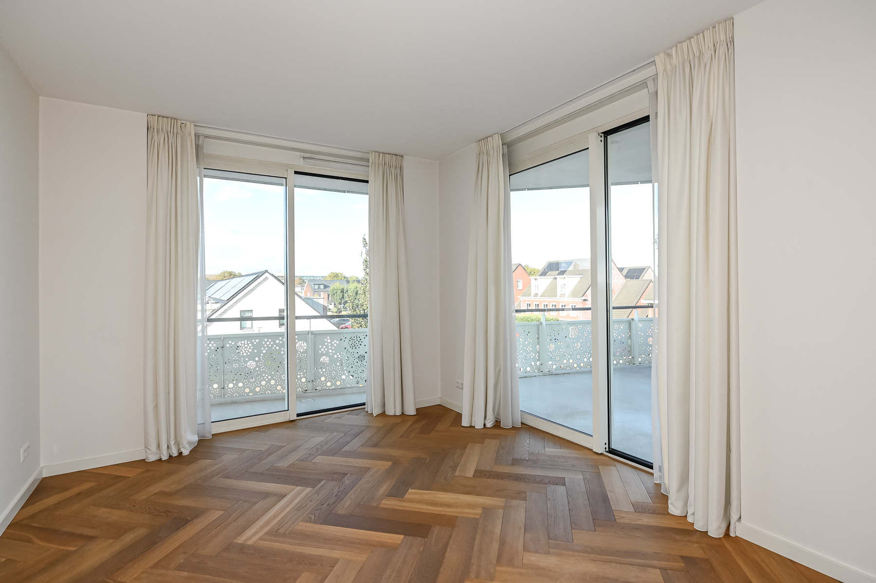 Het ruime balkon van ca. 33 m² ligt op het oosten, waardoor je ’s ochtends kunt genieten van het eerste licht. Doordat het een hoekappartement is en op de tweede verdieping ligt met schuifpuien, is er extra lichtinval en uitzicht.