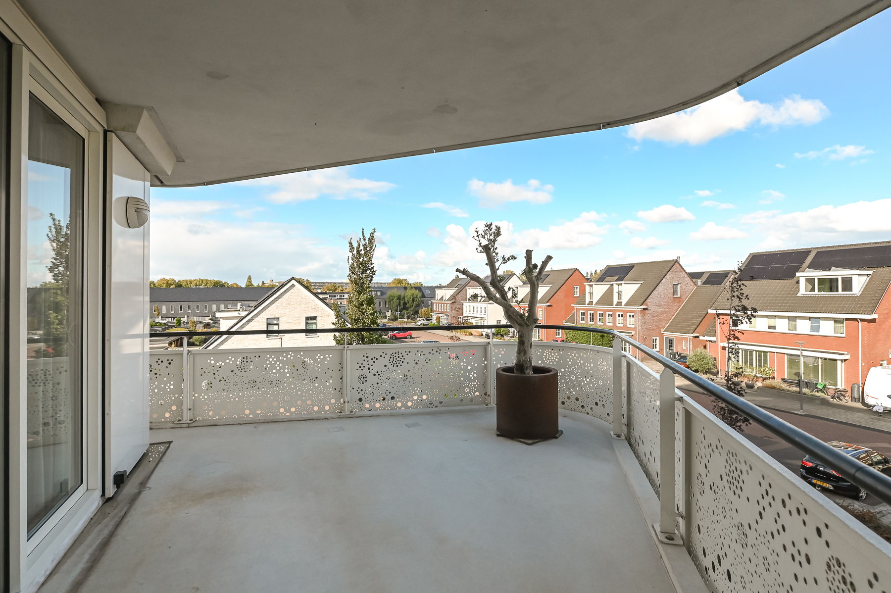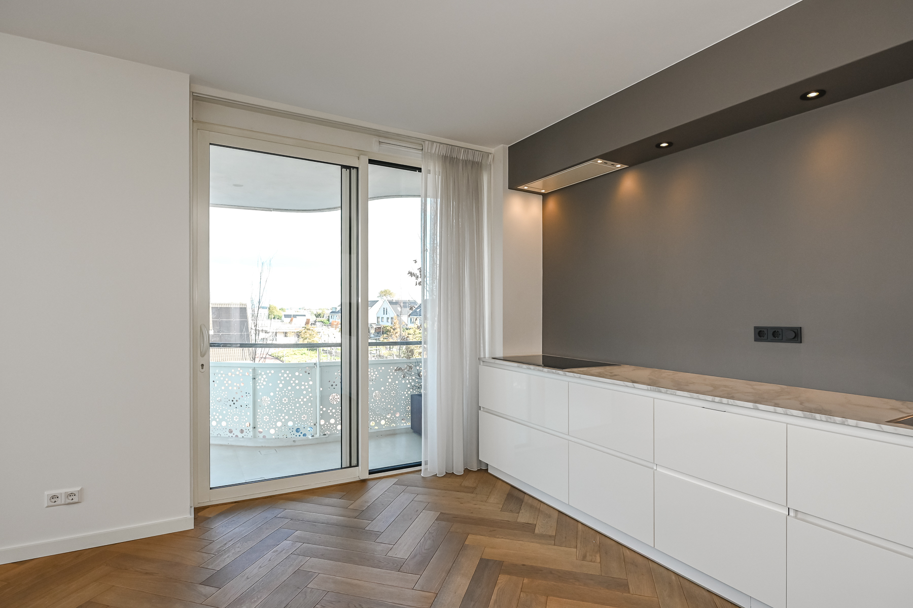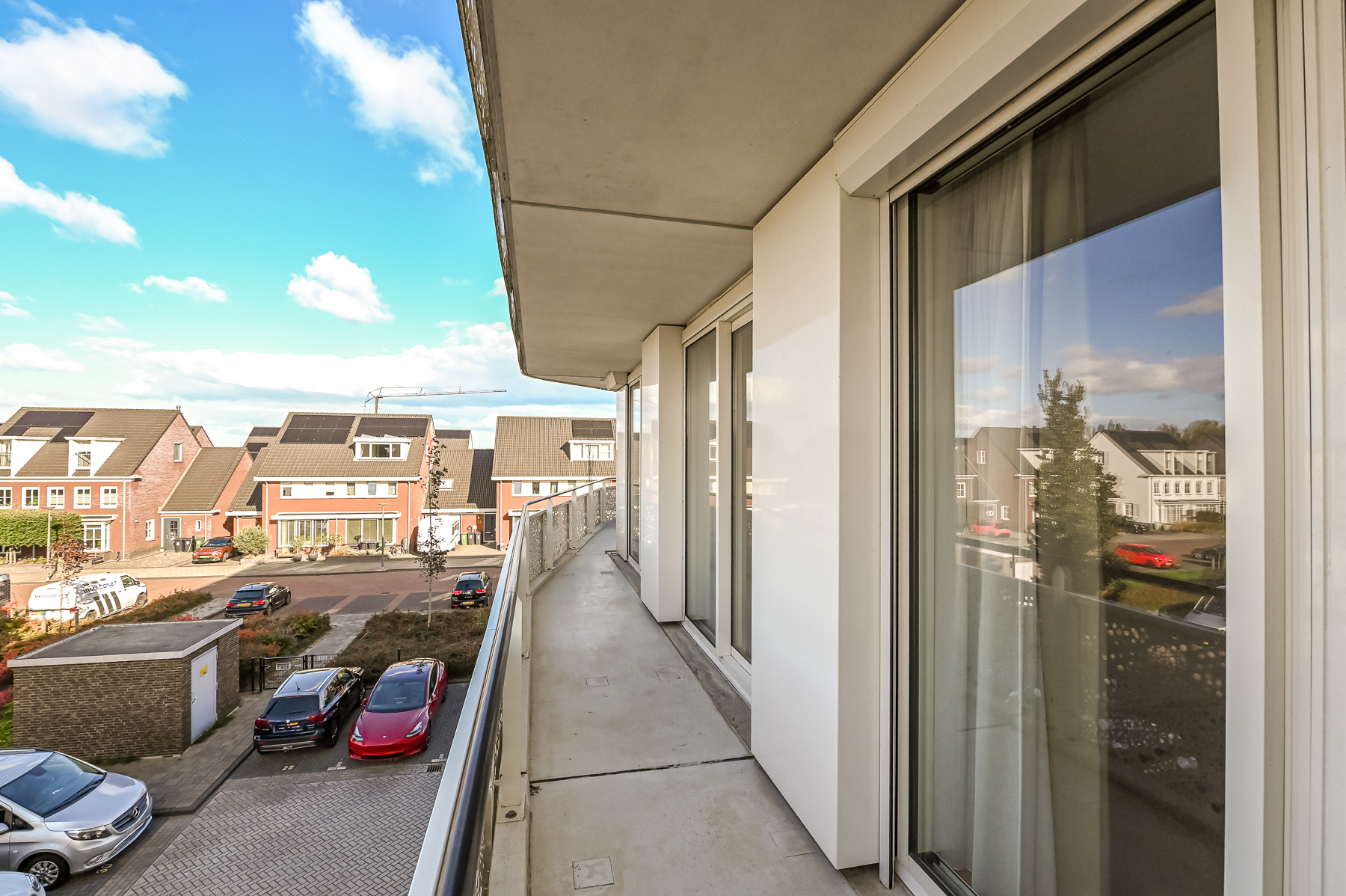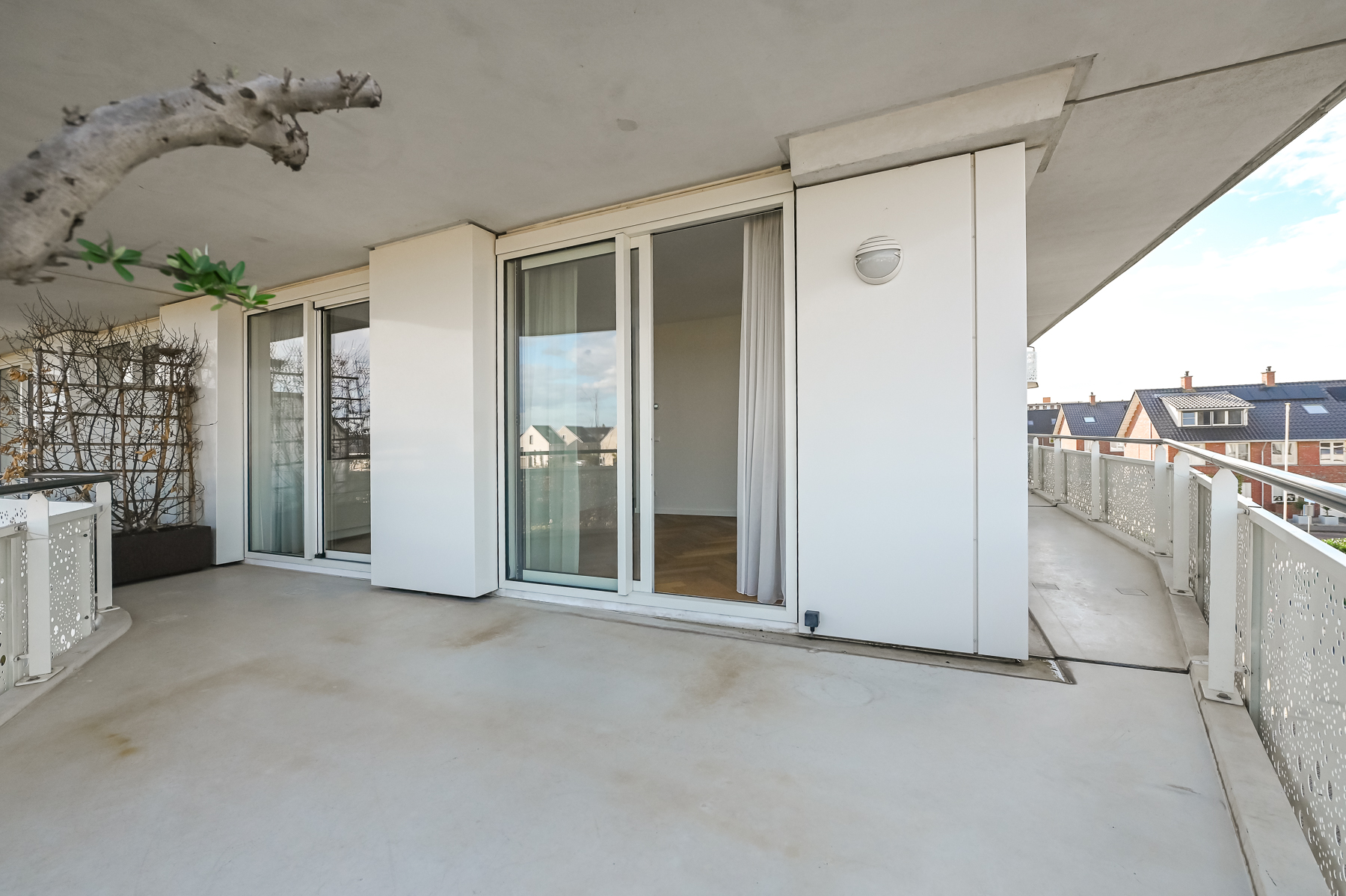 Het ruime balkon van ca. 33 m² ligt op het oosten, waardoor je ’s ochtends kunt genieten van het eerste licht. Doordat het een hoekappartement is en op de tweede verdieping ligt met schuifpuien, is er extra lichtinval en uitzicht.