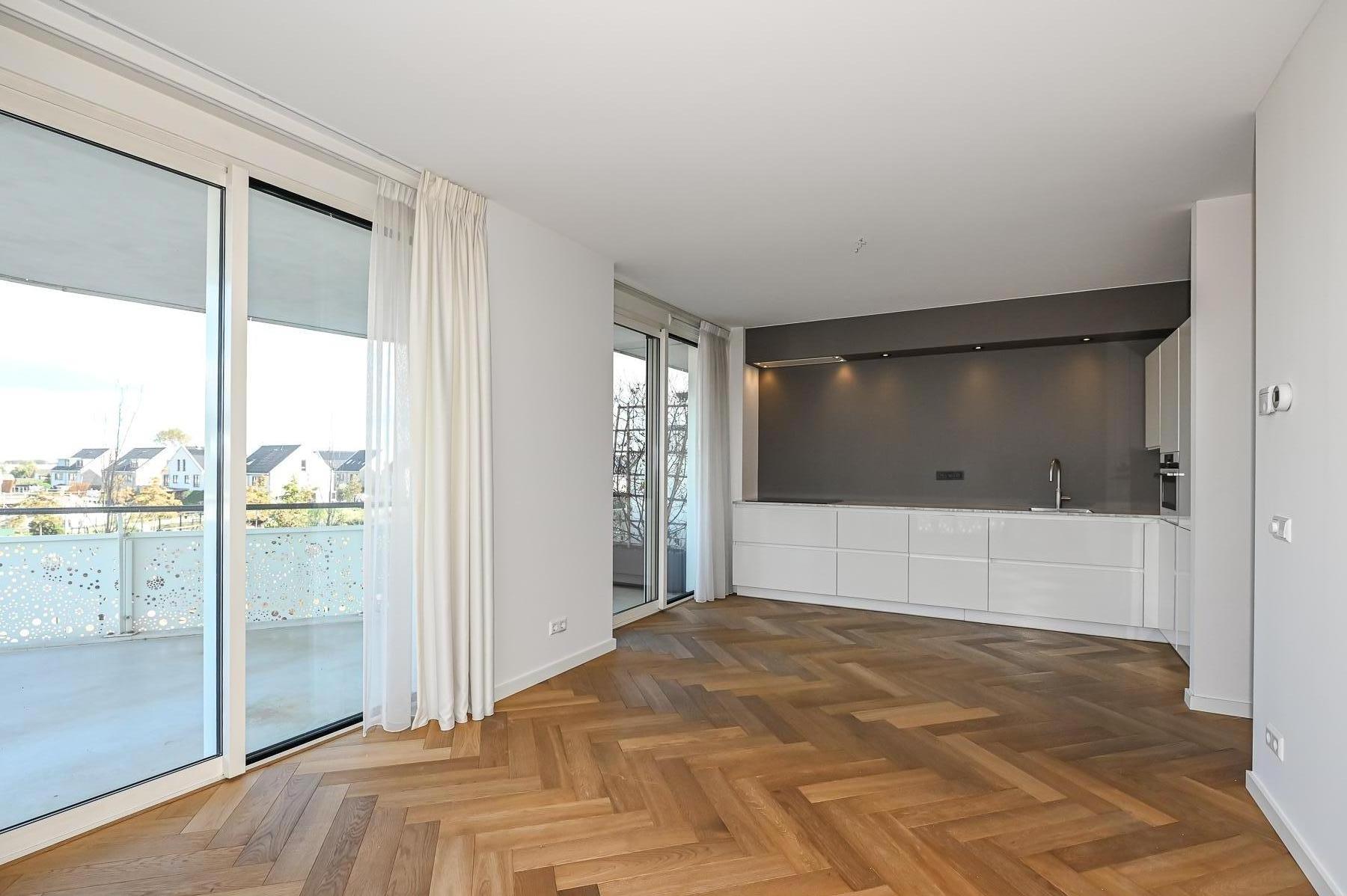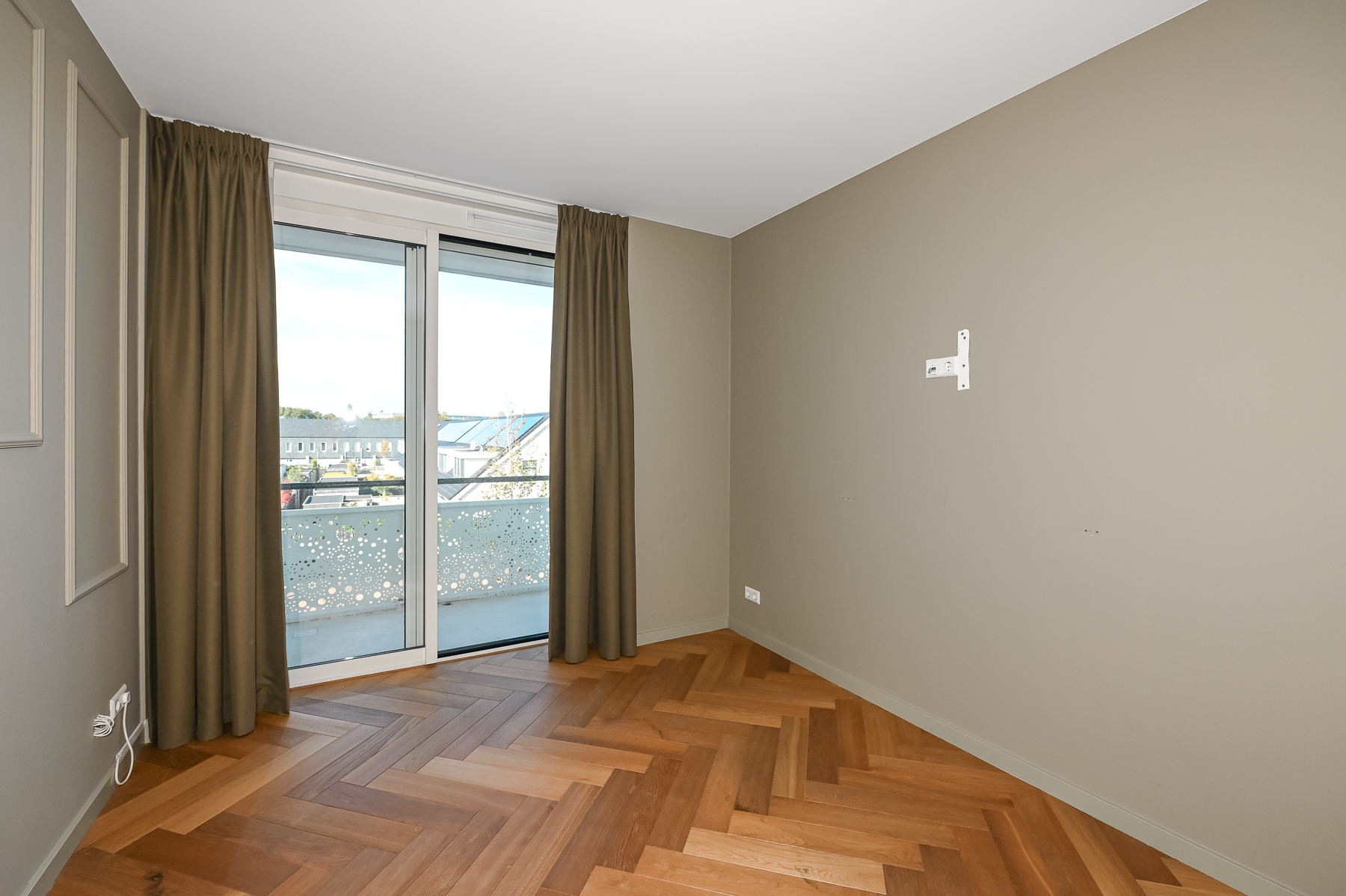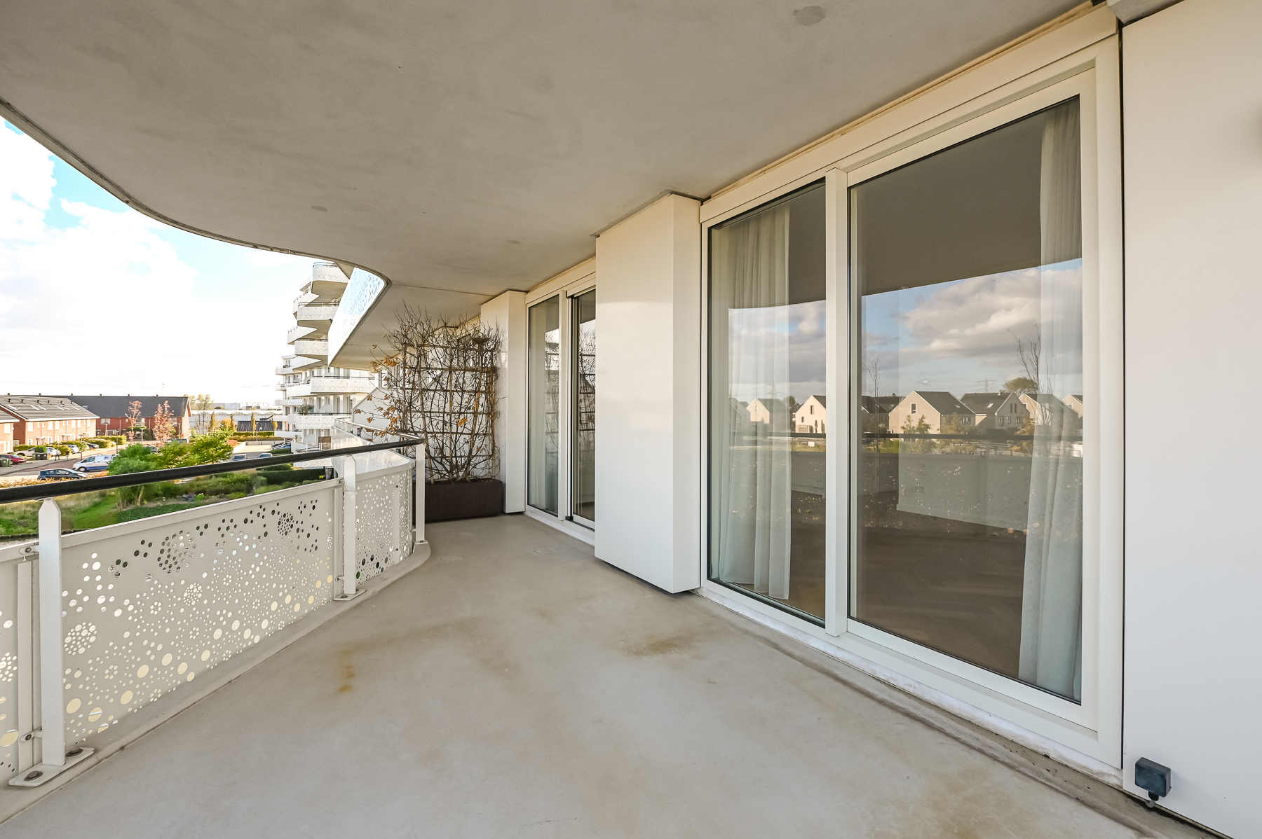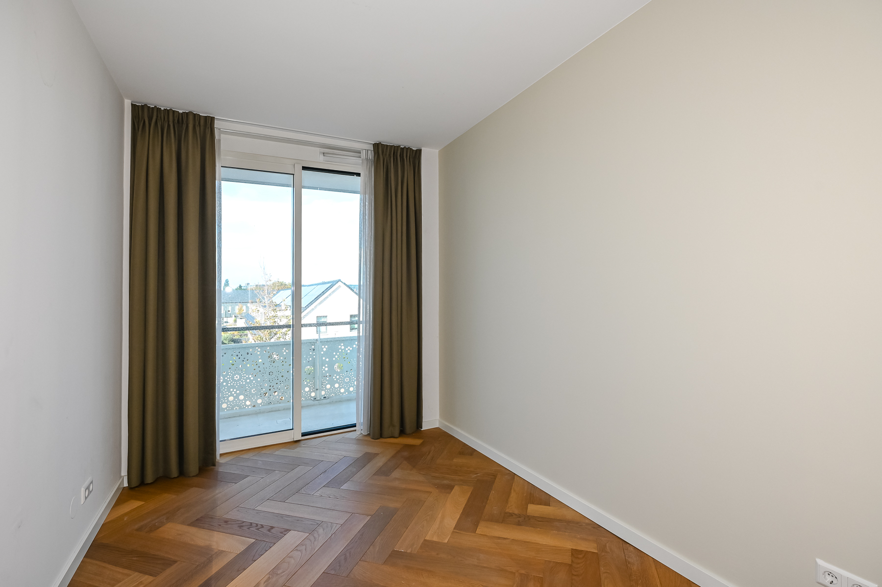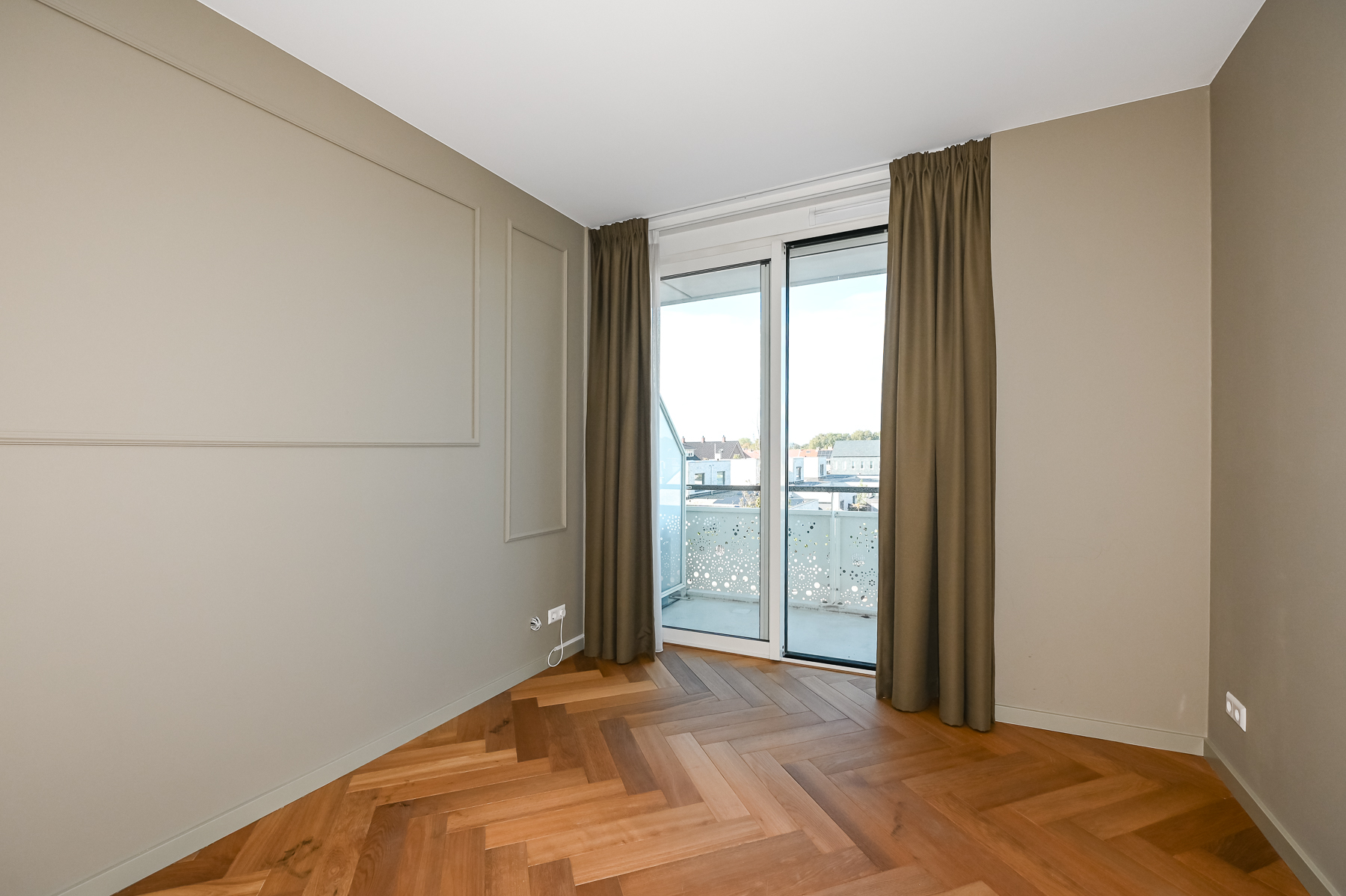 Het ruime balkon van ca. 33 m² ligt op het oosten, waardoor je ’s ochtends kunt genieten van het eerste licht. Doordat het een hoekappartement is en op de tweede verdieping ligt met schuifpuien, is er extra lichtinval en uitzicht.