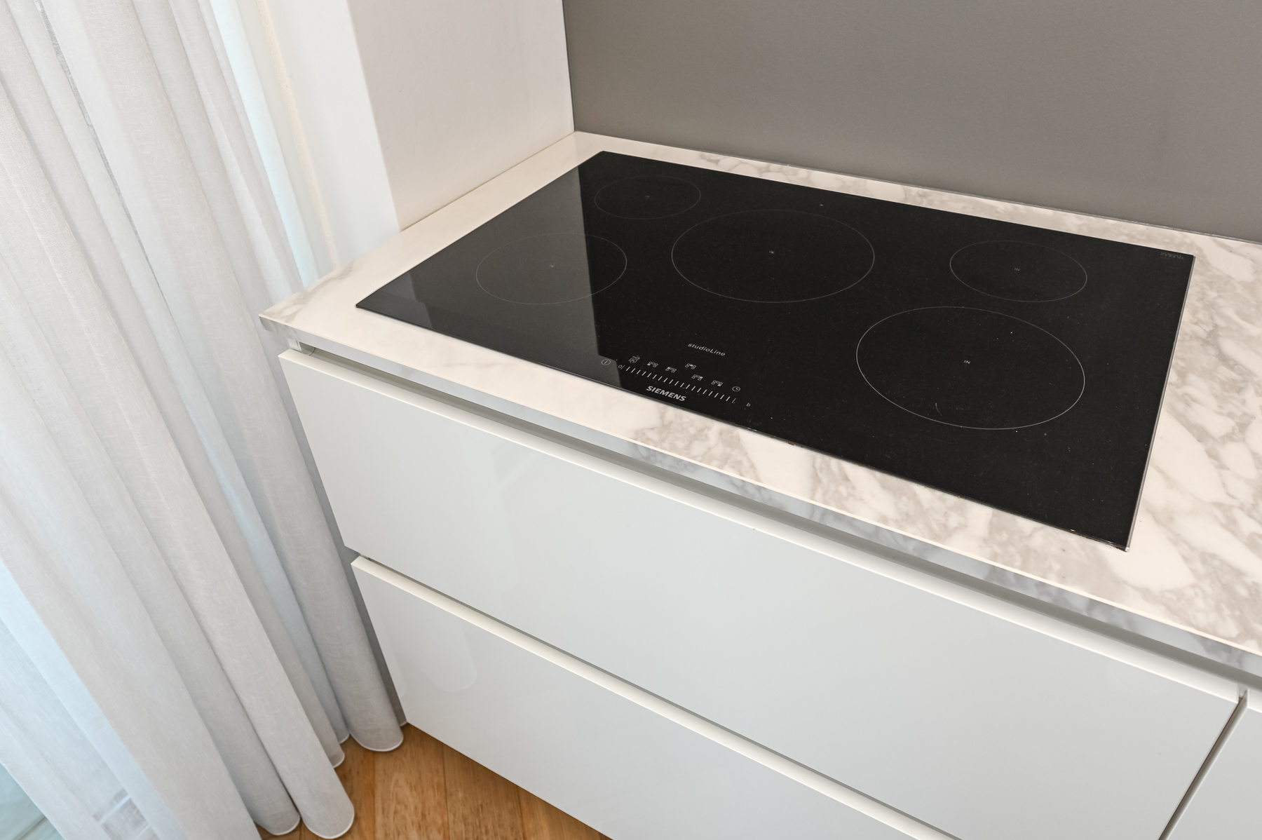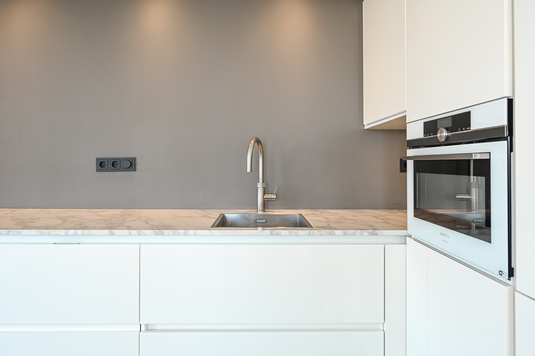 De open keuken in L-vorm is uitgerust met hoogwaardige Siemens Studioline inbouwapparatuur als een 5 pits inductiekookplaat, combi oven/ magnetron, koel-/vriescombinatie, een Miele vaatwasmachine en een Quooker.