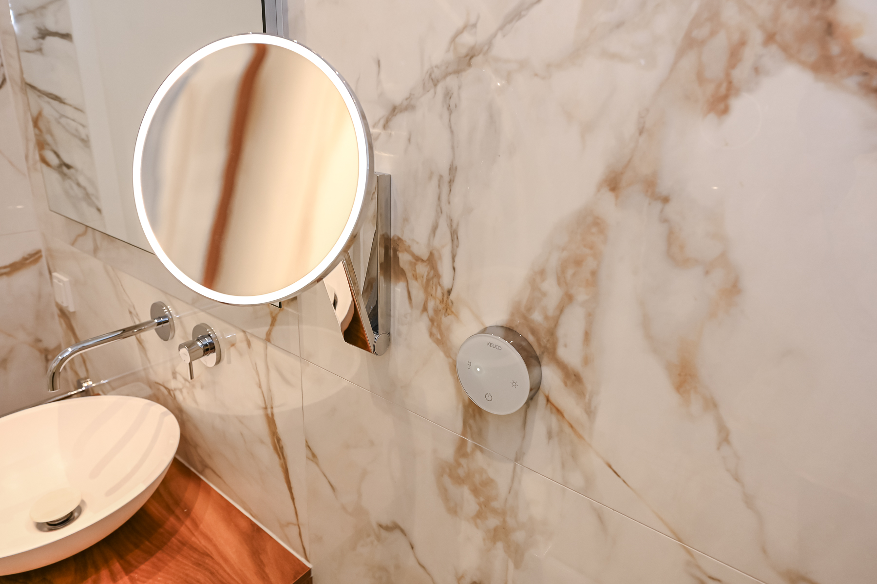De badkamer (geplaatst in 2021) heeft een inloopdouche met zowel regendouchekop als normale douchekop, wastafelmeubel, toilet en elektrische handdoekradiator. De wasruimte, bereikbaar vanuit de hal, heeft aansluitingen voor wasmachine en droger, plankruimtes, en herbergt de warmtepomp en de boiler (150L).
