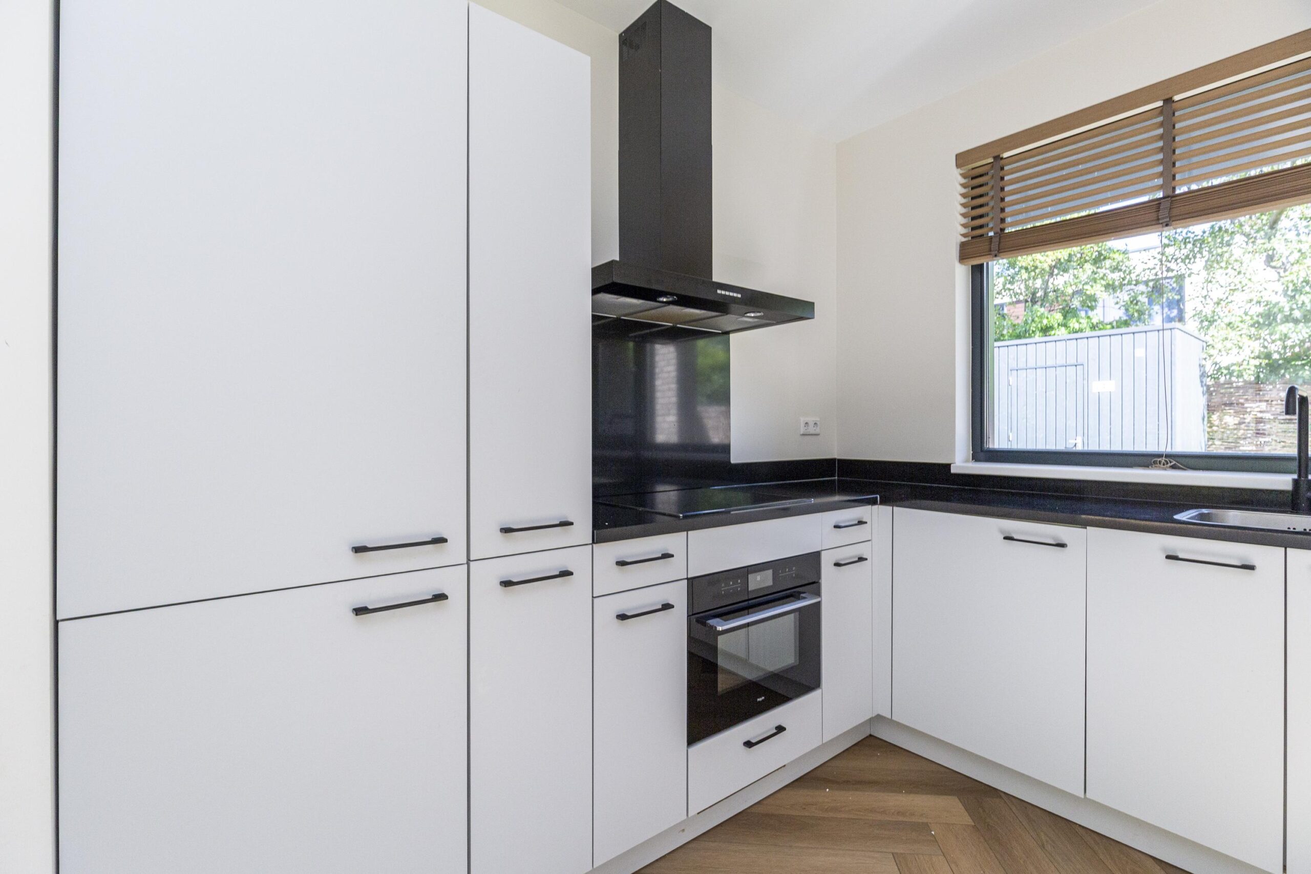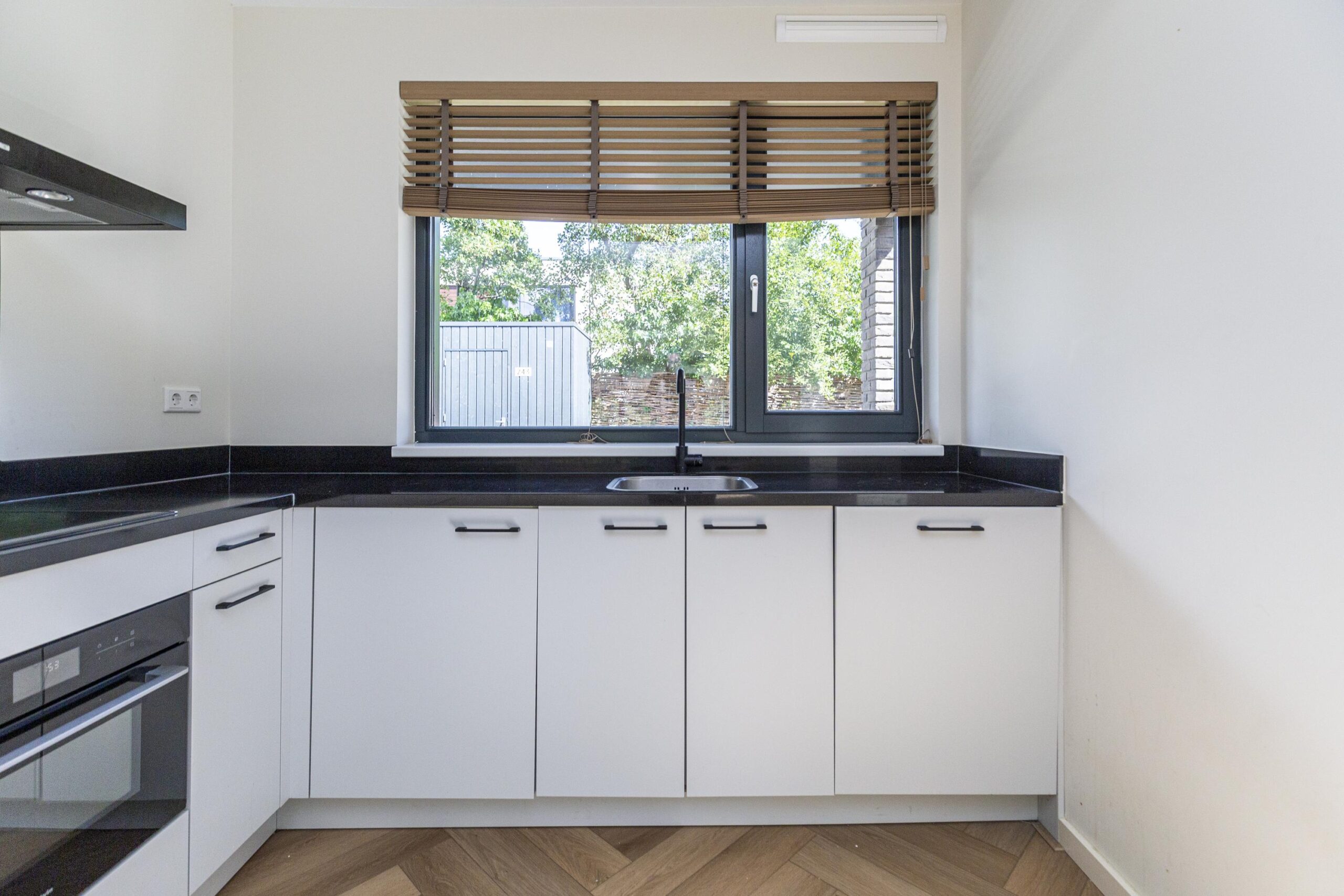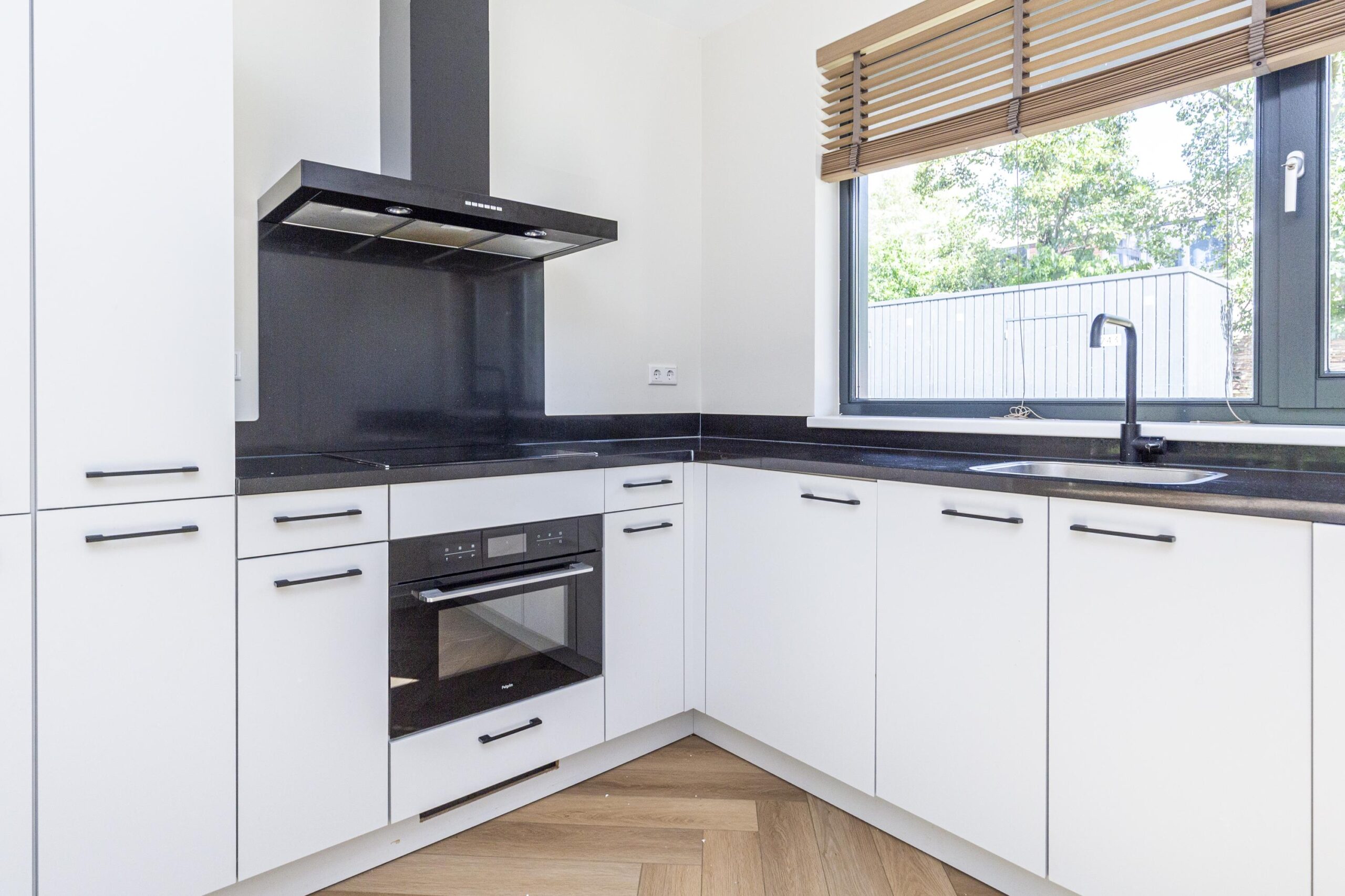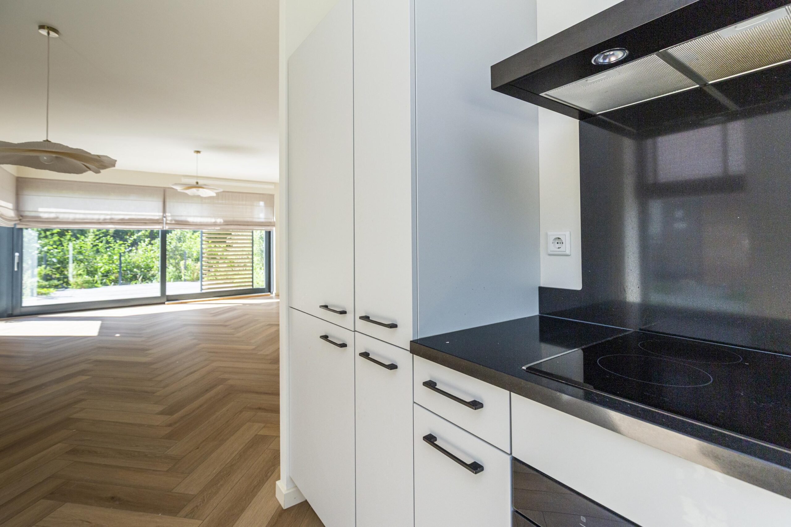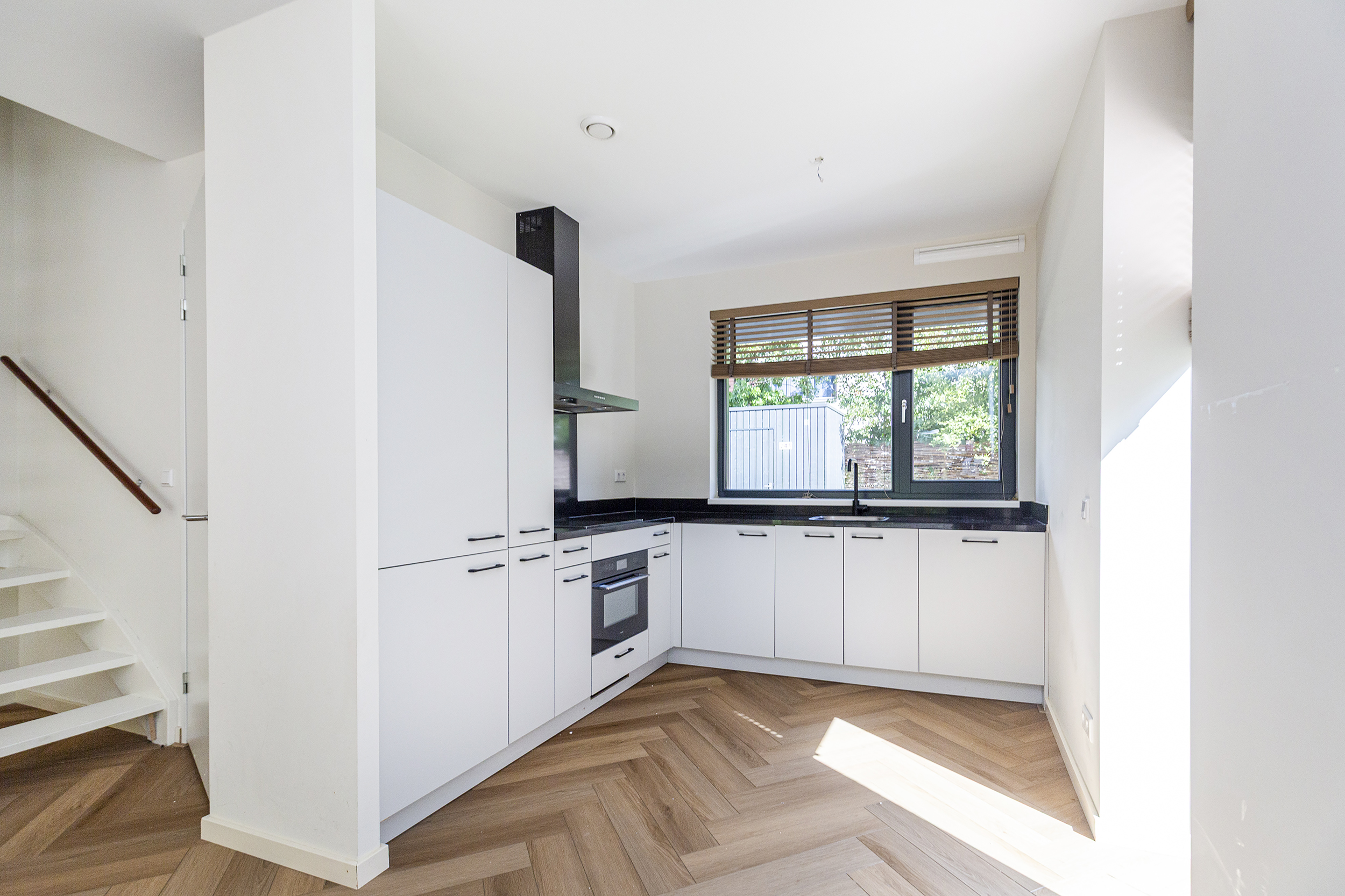Aan de voorzijde van de woning bevindt zich de open keuken in hoekopstelling, compleet met keramische kookplaat, oven, vaatwasser, koelkast, vriezer, spoelbak met close-in boiler.