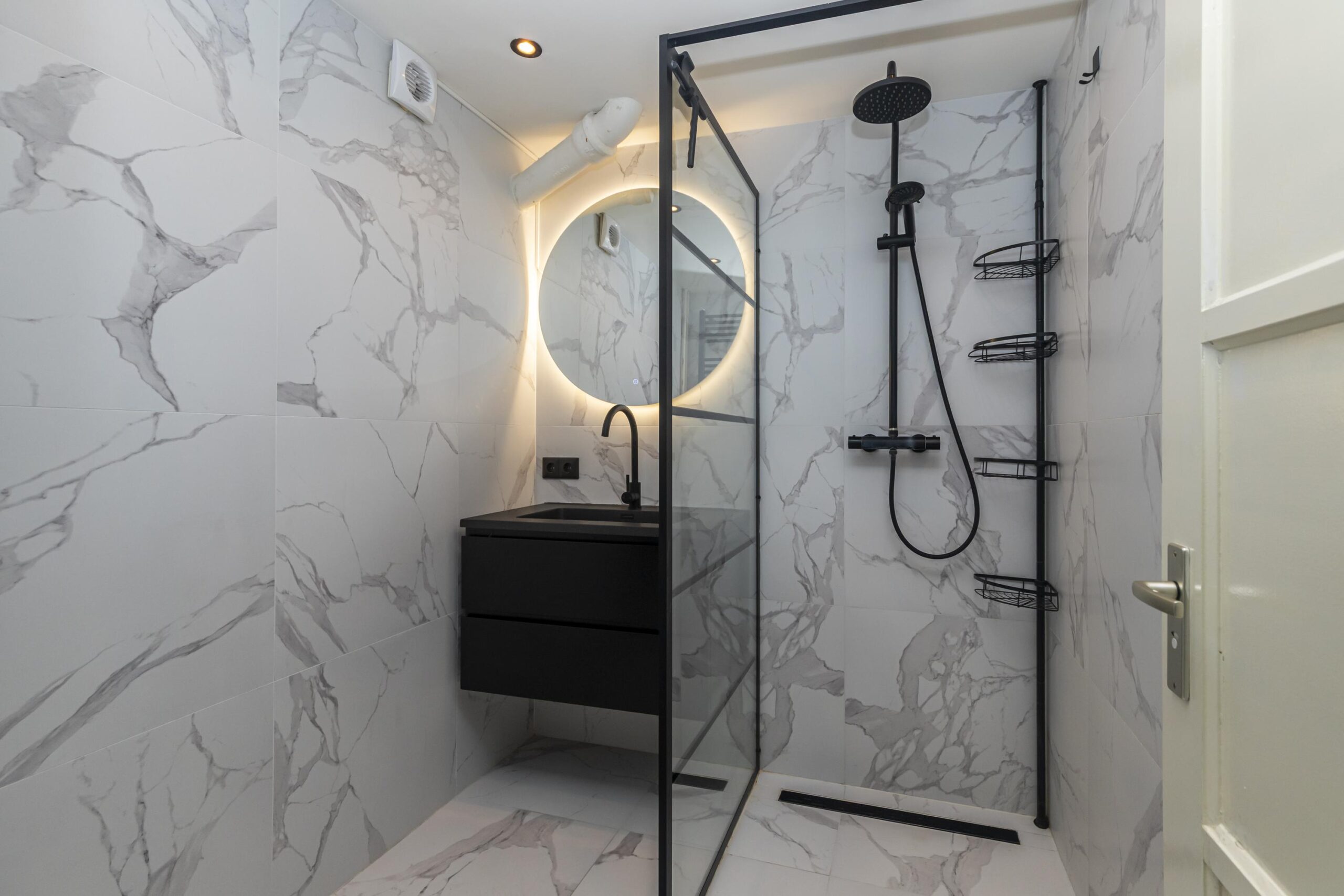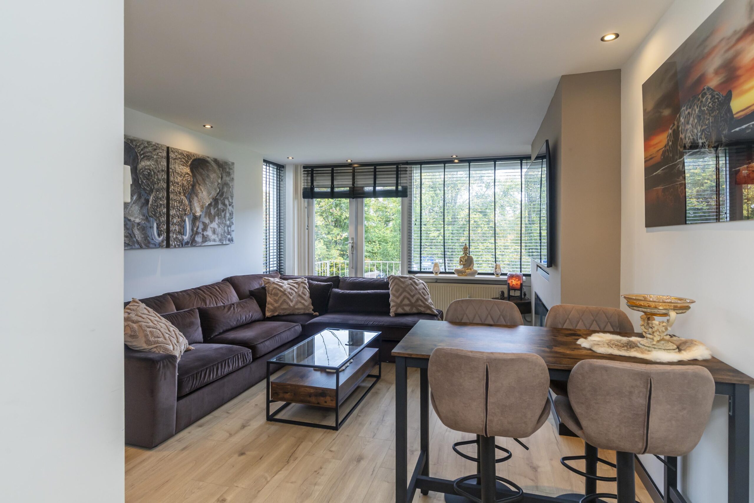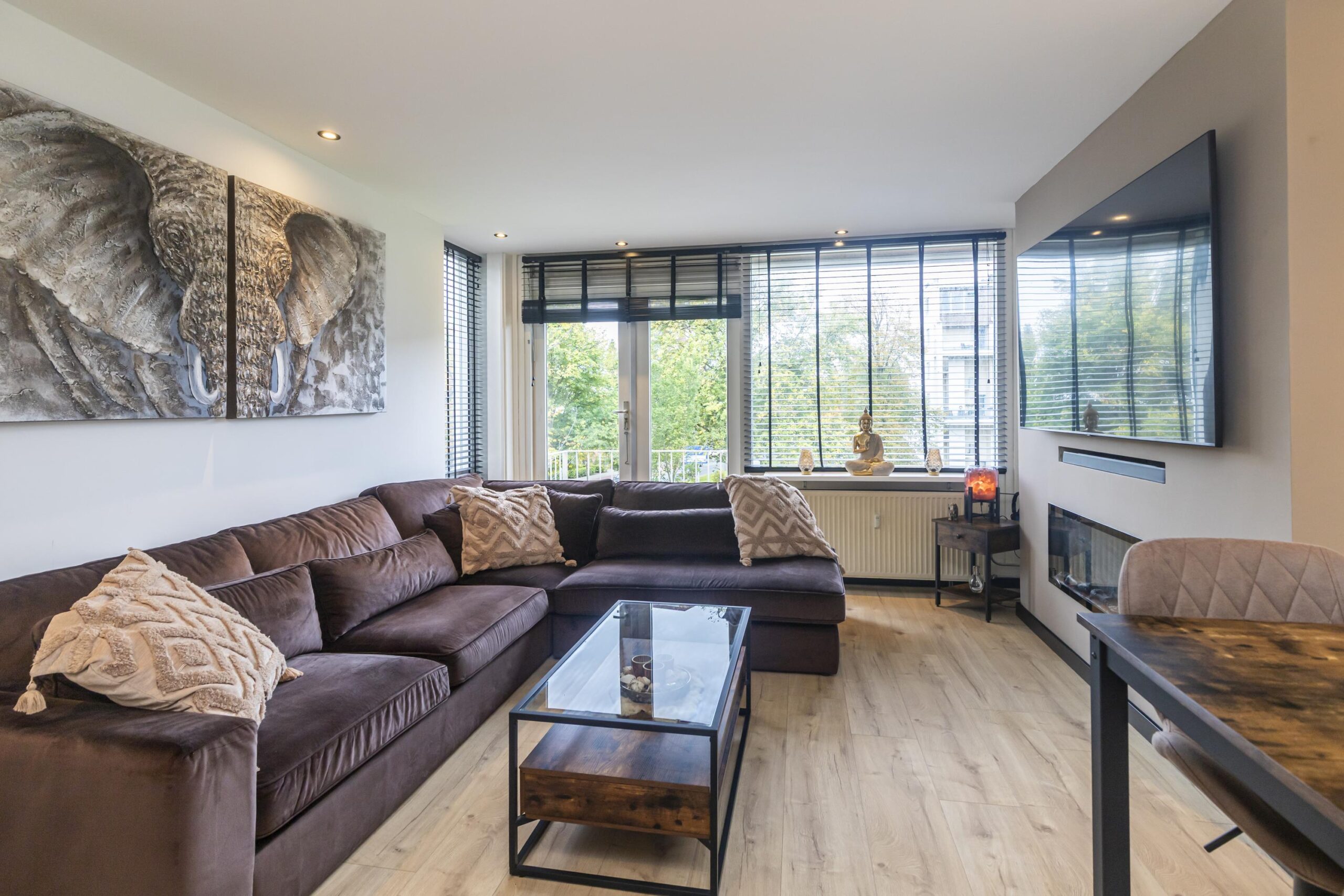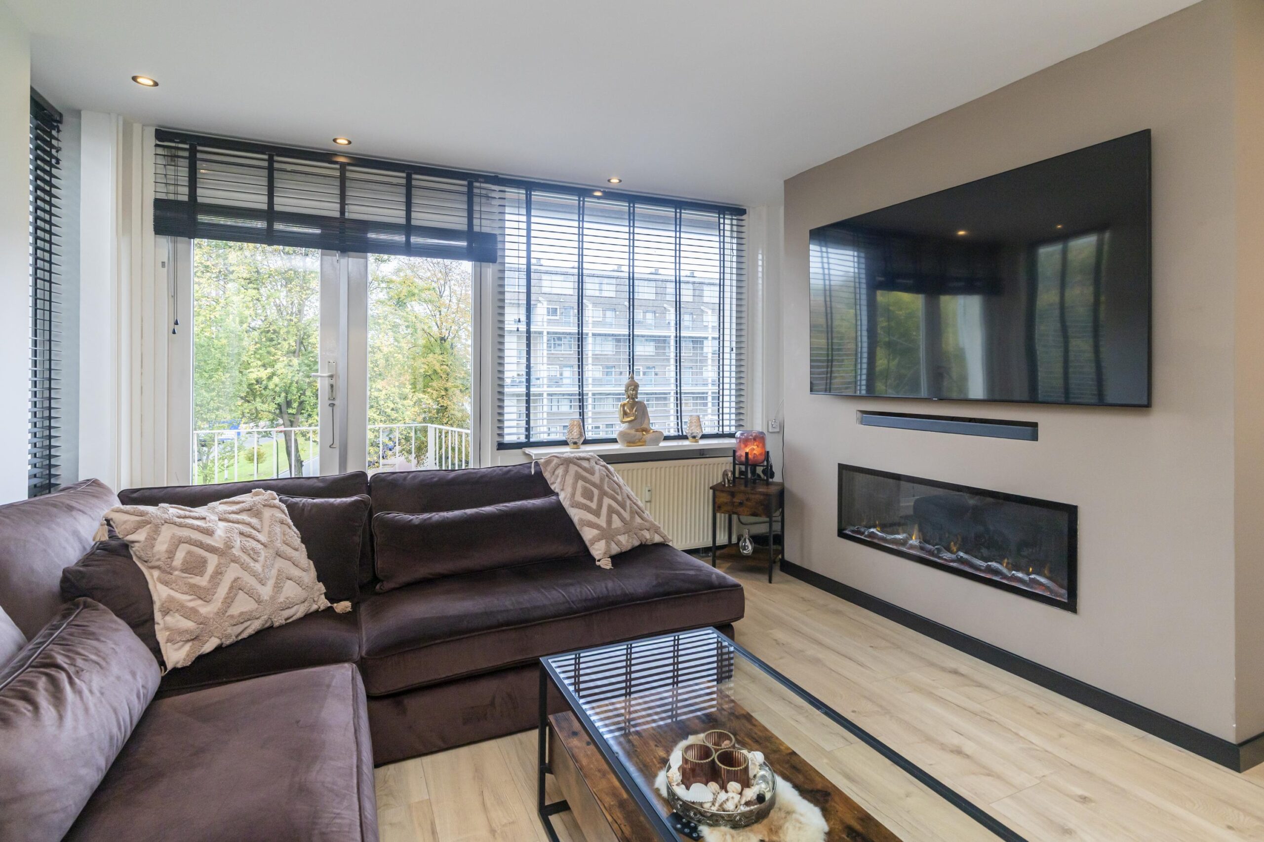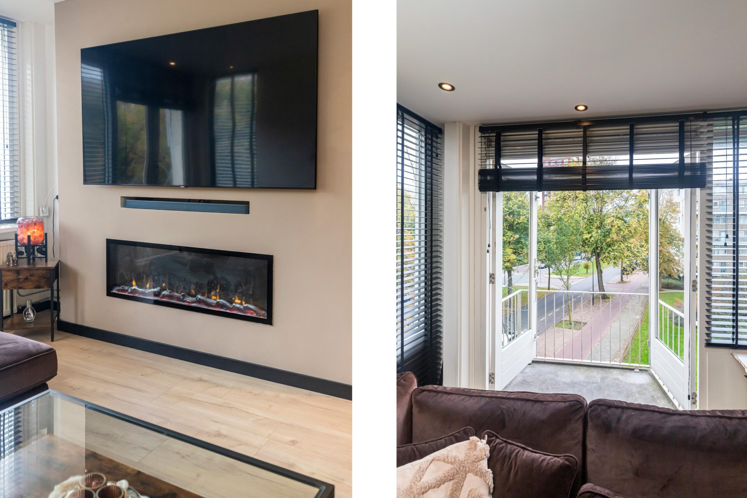 Binnenkomst in de hal. Aan de linkerzijde bevindt zich de half open keuken, welke is voorzien van diverse inbouwapparatuur. De moderne keuken is in 2023 volledig gerenoveerd. Het separate toilet is ruim en voorzien van een fonteintje. De lichte woonkamer heeft een verlaagd plafond met inbouwspots. De woonkamer is stijlvol afgewerkt met een luxe cinewall inclusief een elektrische haard. Ook bevinden zich twee praktische opbergkasten op deze verdieping. Vanuit de woonkamer heeft u toegang tot het zonnige balkon, gelegen op het zuidwesten.