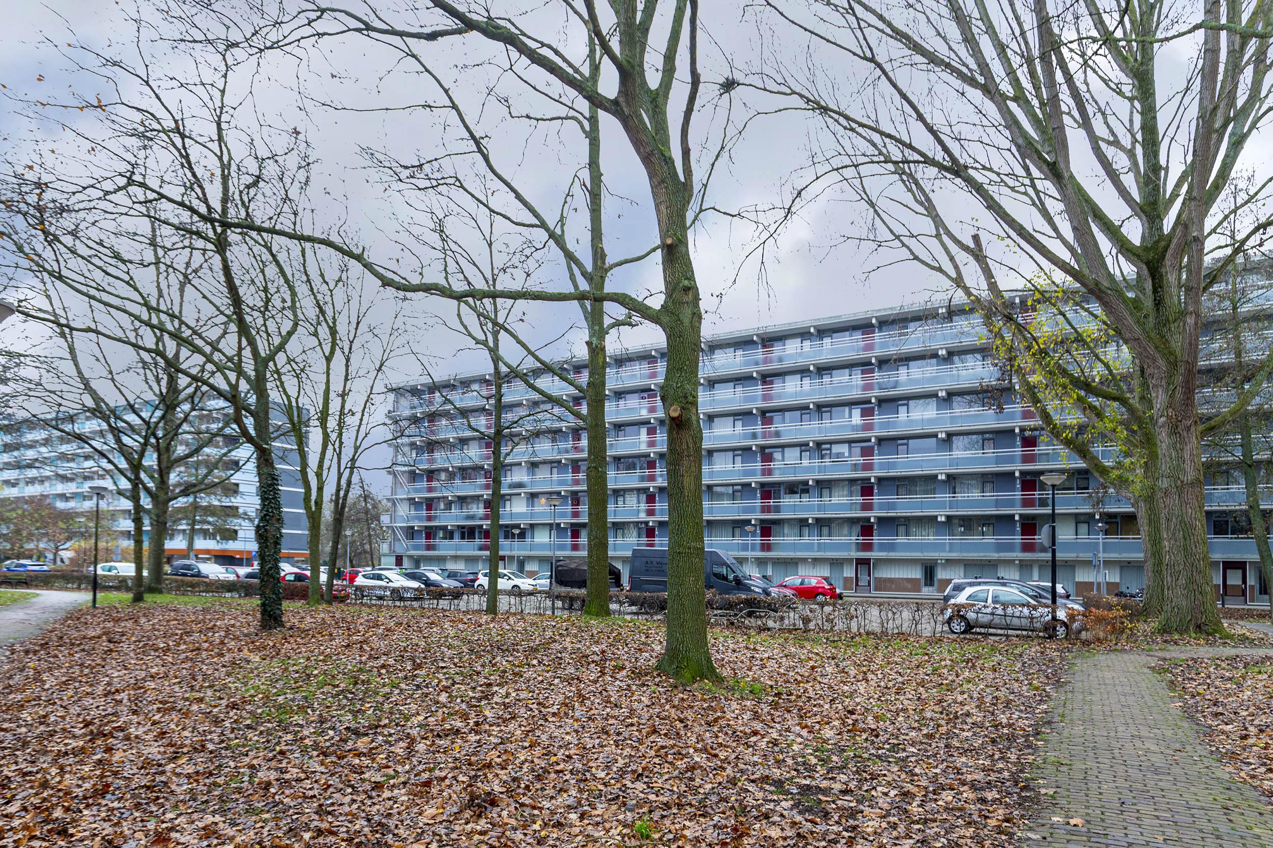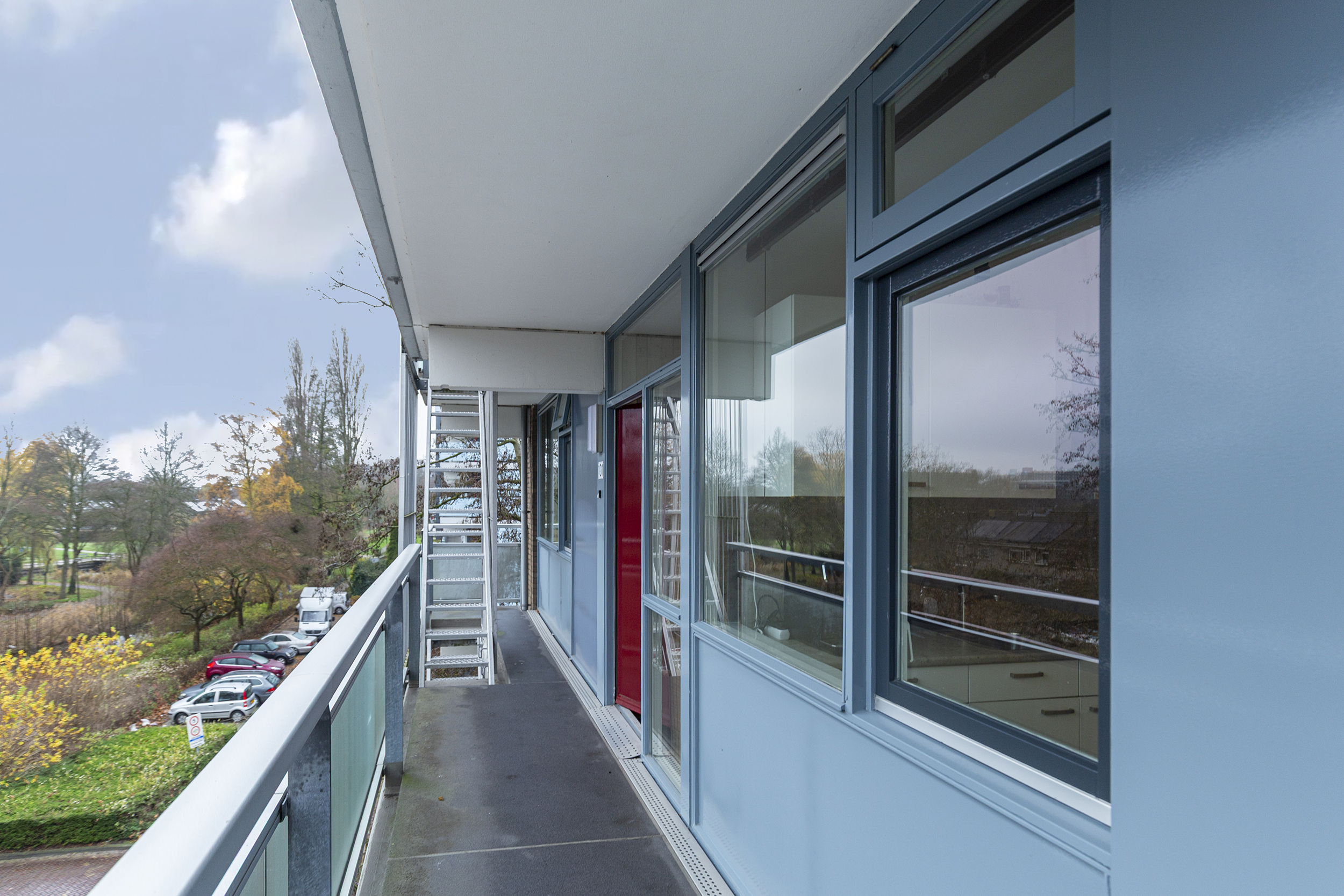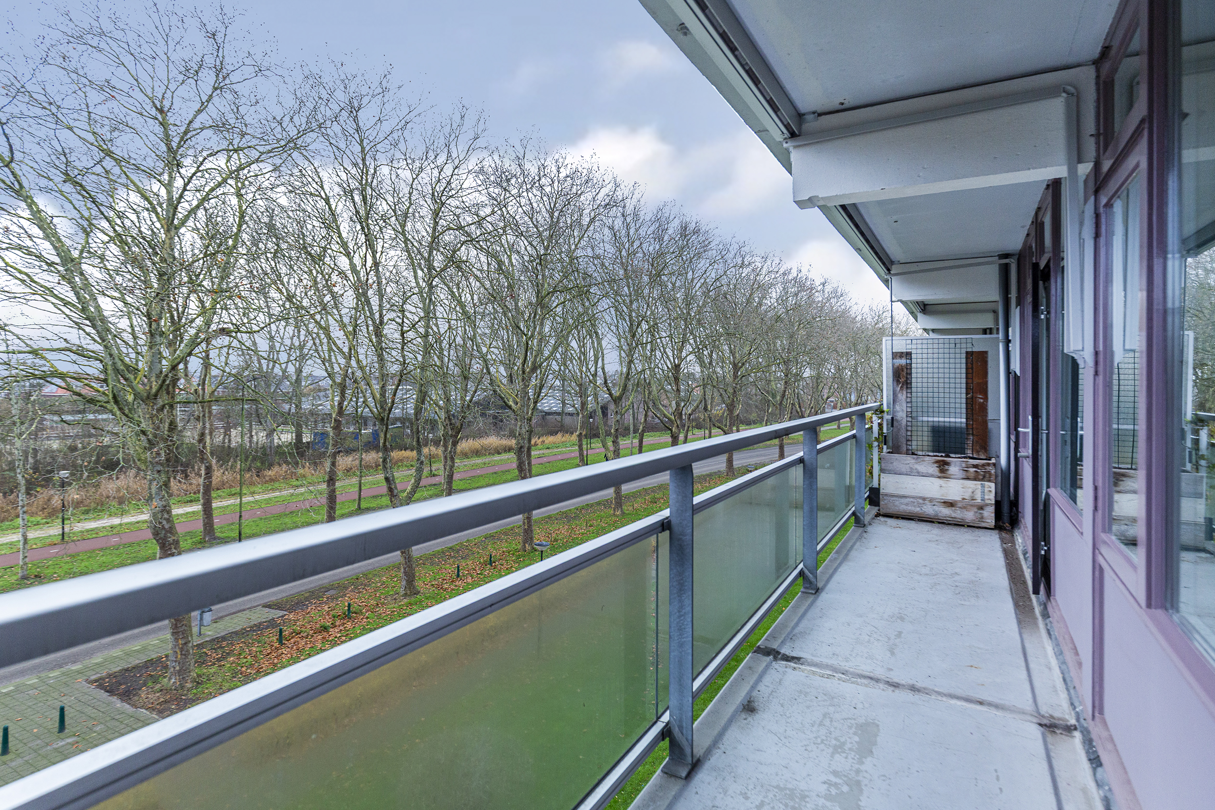 Via de galerij kom je bij de entree van het appartement. Tochtportaal, gang met twee vaste kasten en bergkast. Tussenliggende badkamer met inloopdouche en wastafelmeubel. Nette toiletruimte met fonteintje. Zeer ruime woon-eetkamer met toegang tot het balkon op het zuidwesten, met vrij uitzicht over het groen. Gesloten keuken met keukenblok en opstelplaats voor wasmachine en of droger. Twee slaapkamers aan de achterzijde- waarvan één toegang biedt tot het balkon en de hoofdslaapkamer aan de voorzijde gelegen van het appartement gelegen.