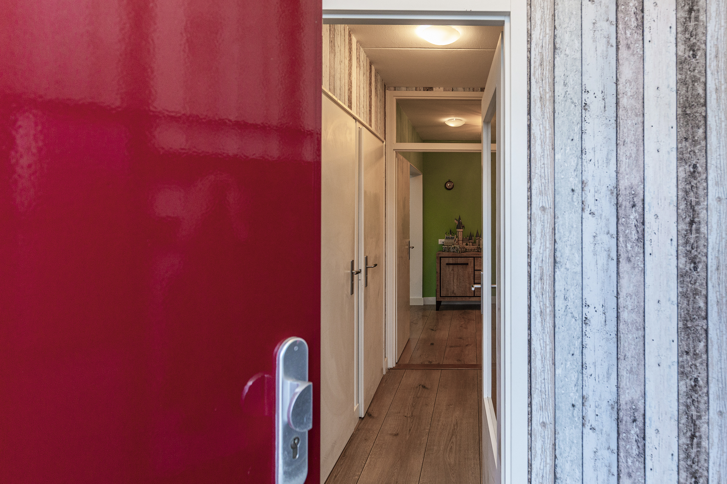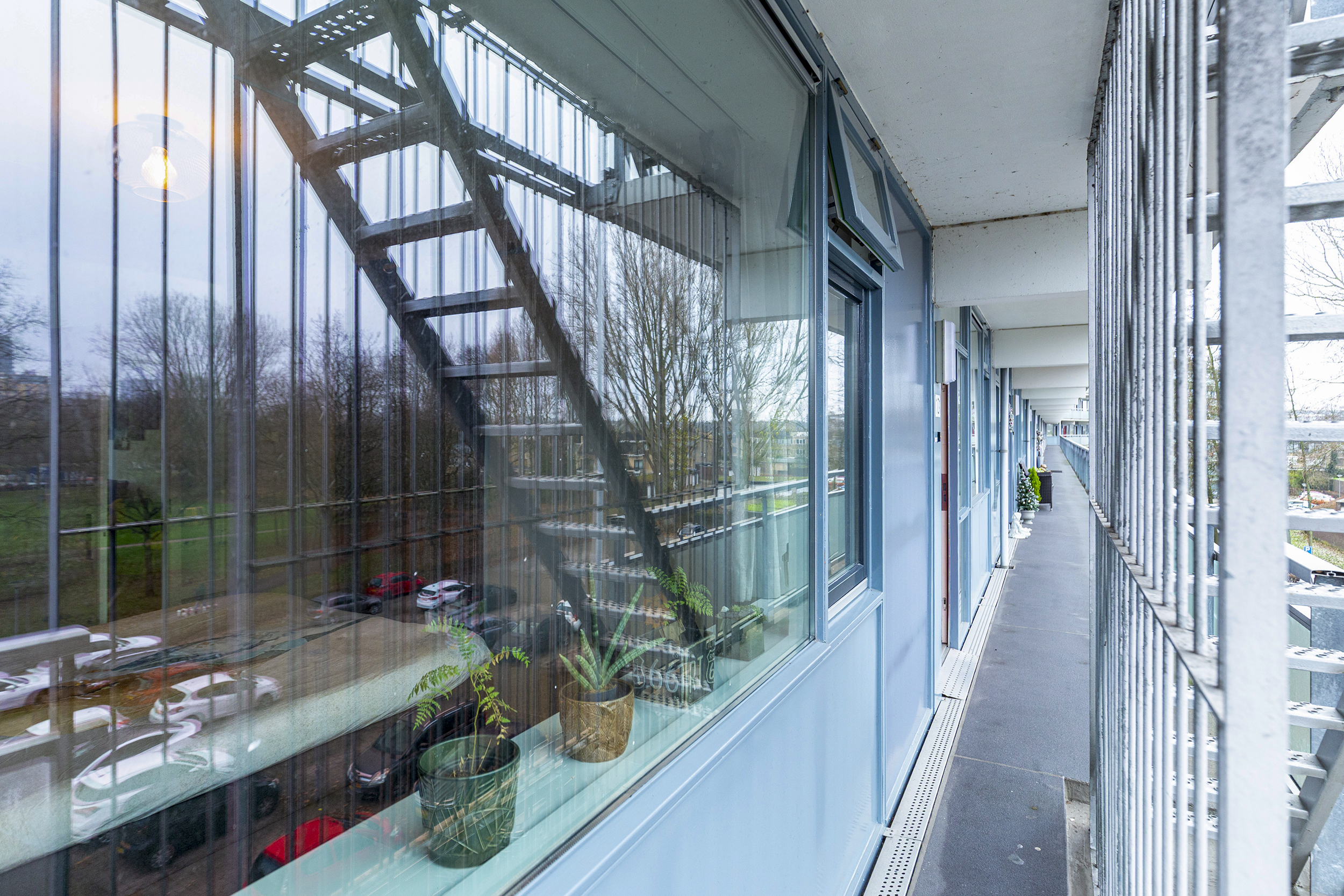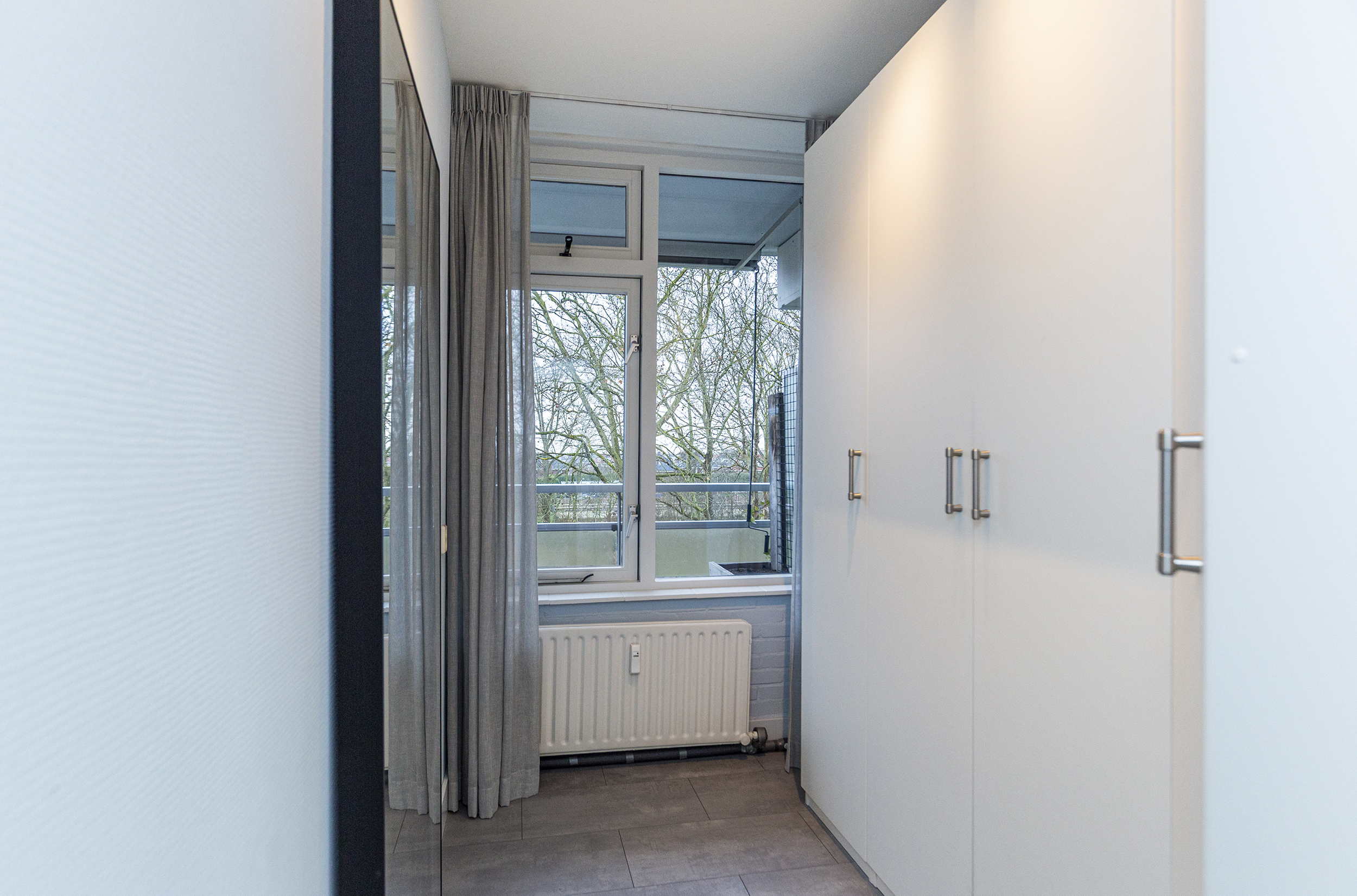 Via de galerij kom je bij de entree van het appartement. Tochtportaal, gang met twee vaste kasten en bergkast. Tussenliggende badkamer met inloopdouche en wastafelmeubel. Nette toiletruimte met fonteintje. Zeer ruime woon-eetkamer met toegang tot het balkon op het zuidwesten, met vrij uitzicht over het groen. Gesloten keuken met keukenblok en opstelplaats voor wasmachine en of droger. Twee slaapkamers aan de achterzijde- waarvan één toegang biedt tot het balkon en de hoofdslaapkamer aan de voorzijde gelegen van het appartement gelegen.