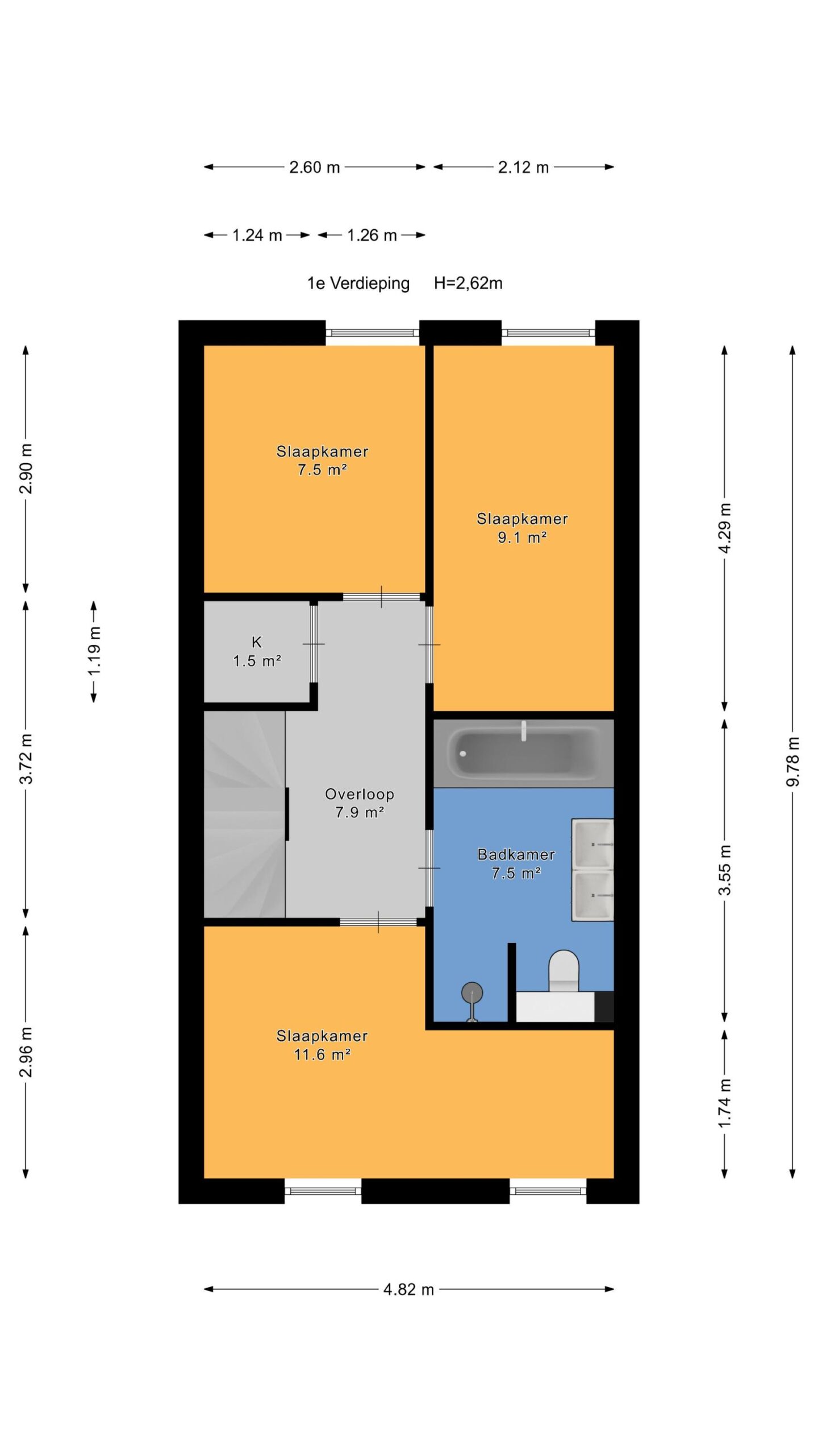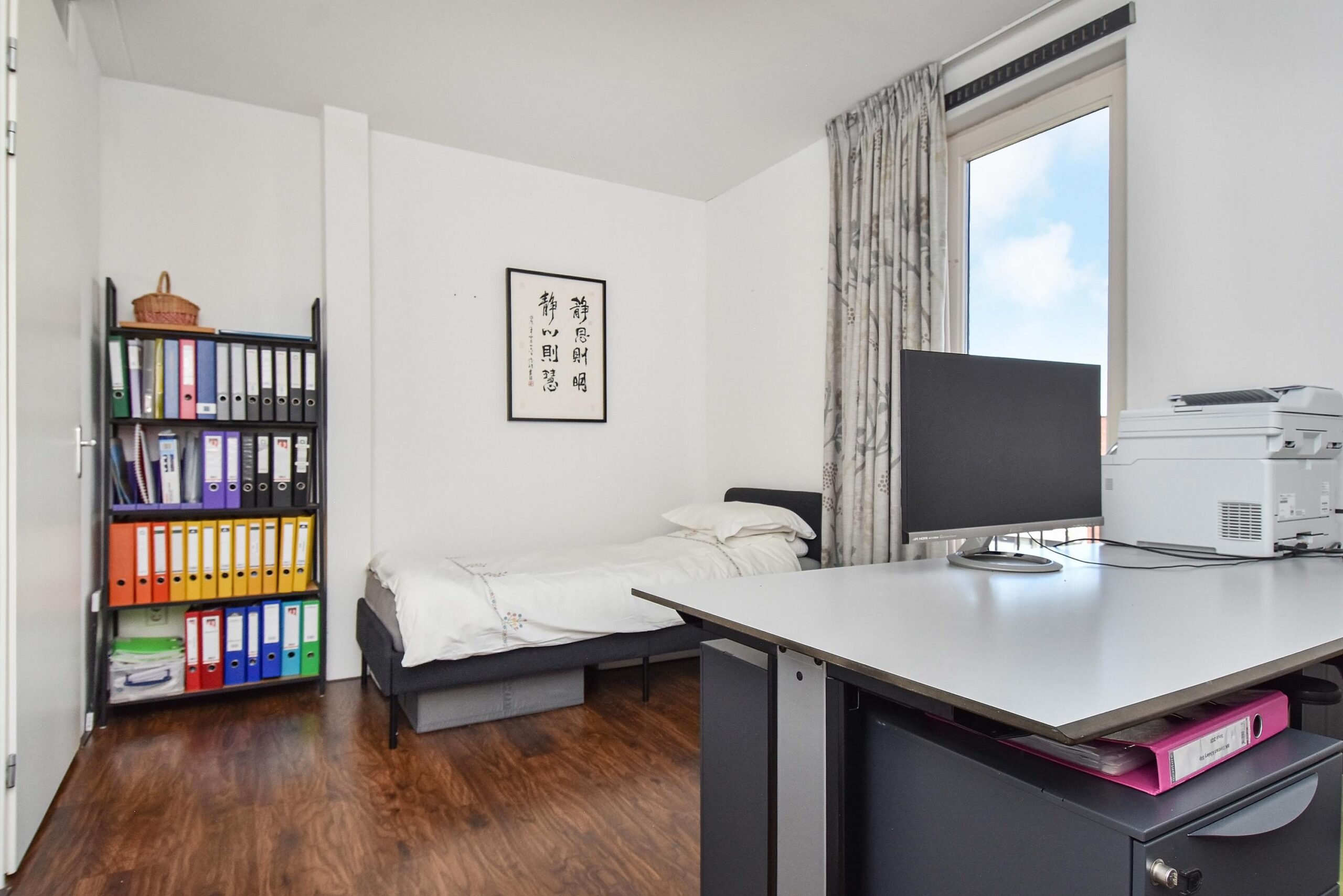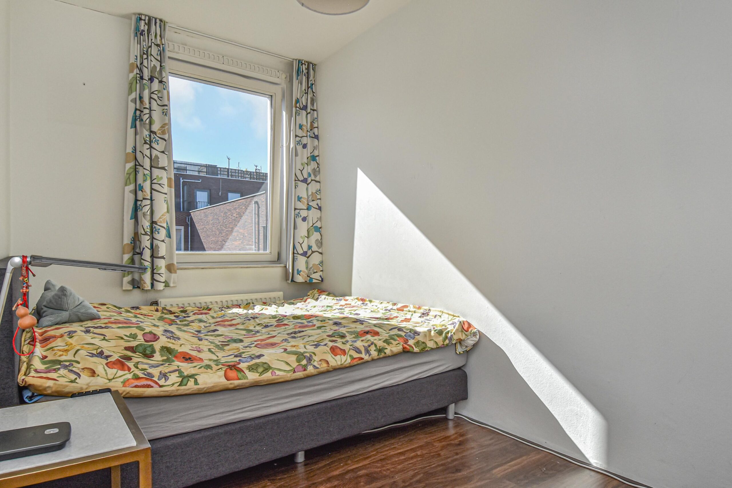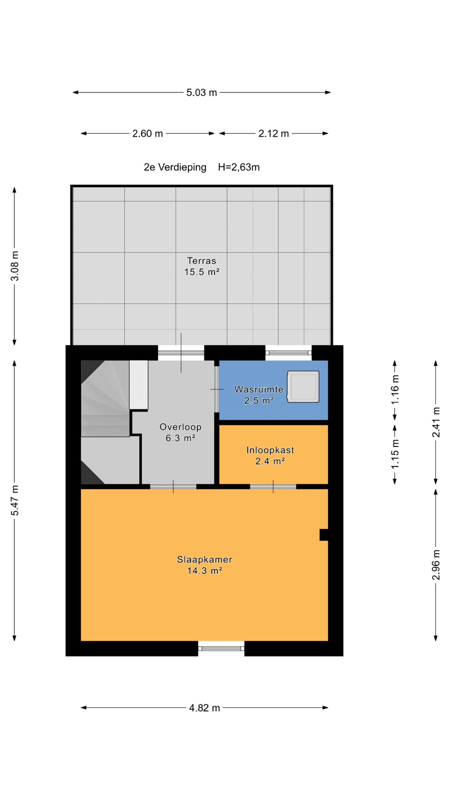 Overloop, toegang tot het ruime dakterras, wasruimte met opstelplaats wasmachine, wasdroger (groep en extra afvoer) en mechanische ventilatie, ruime voorslaapkamer met inloopkast en Frans balkon.