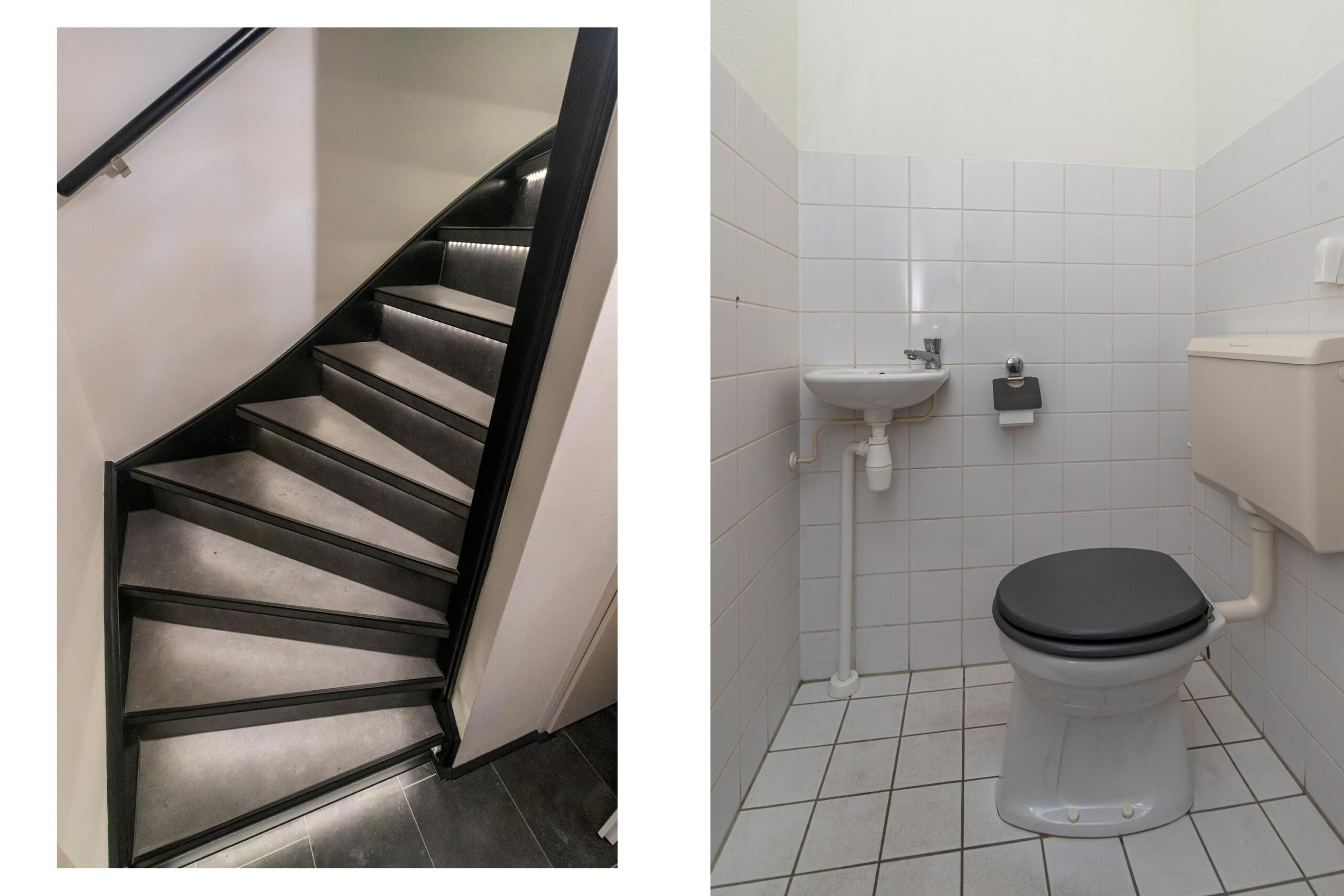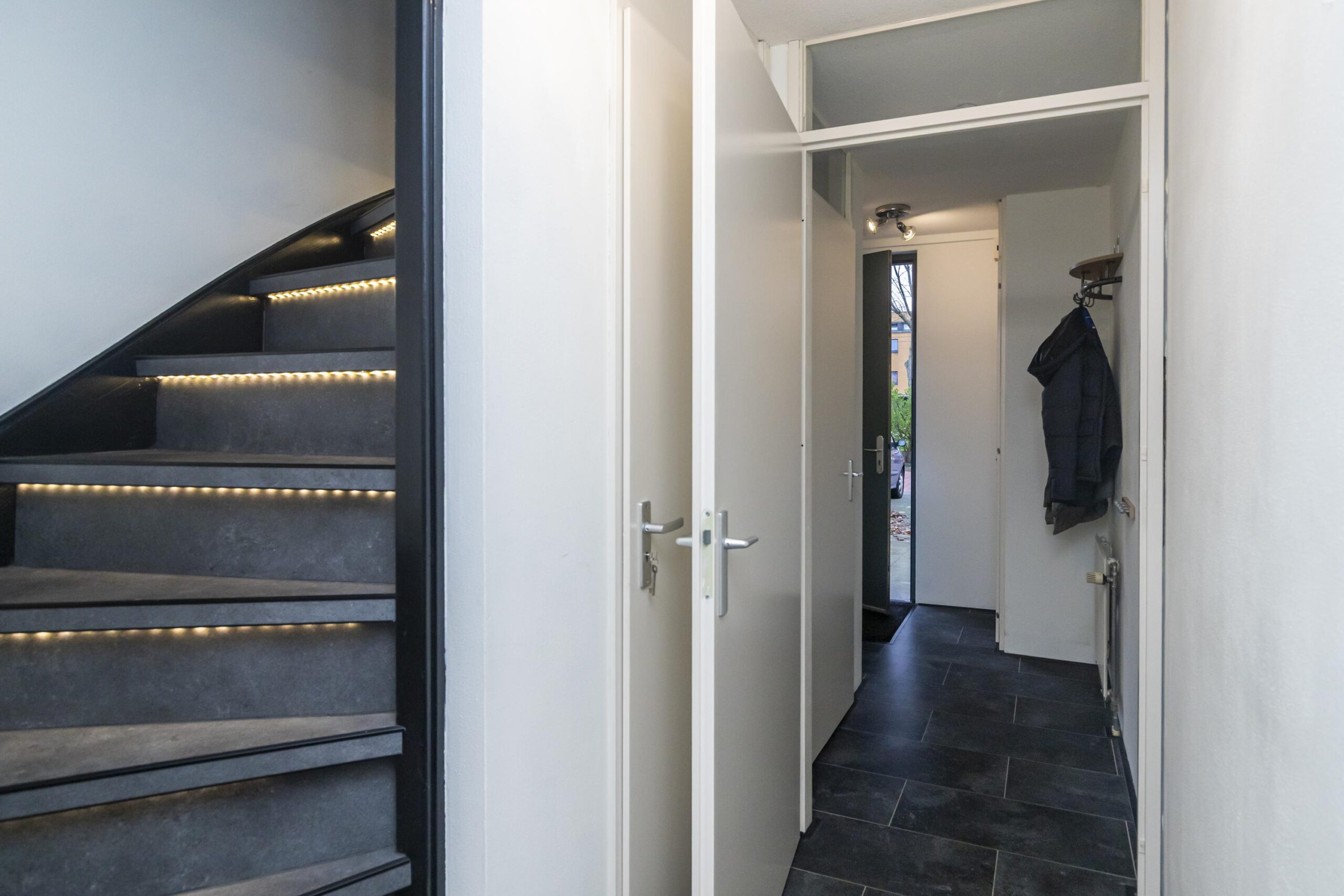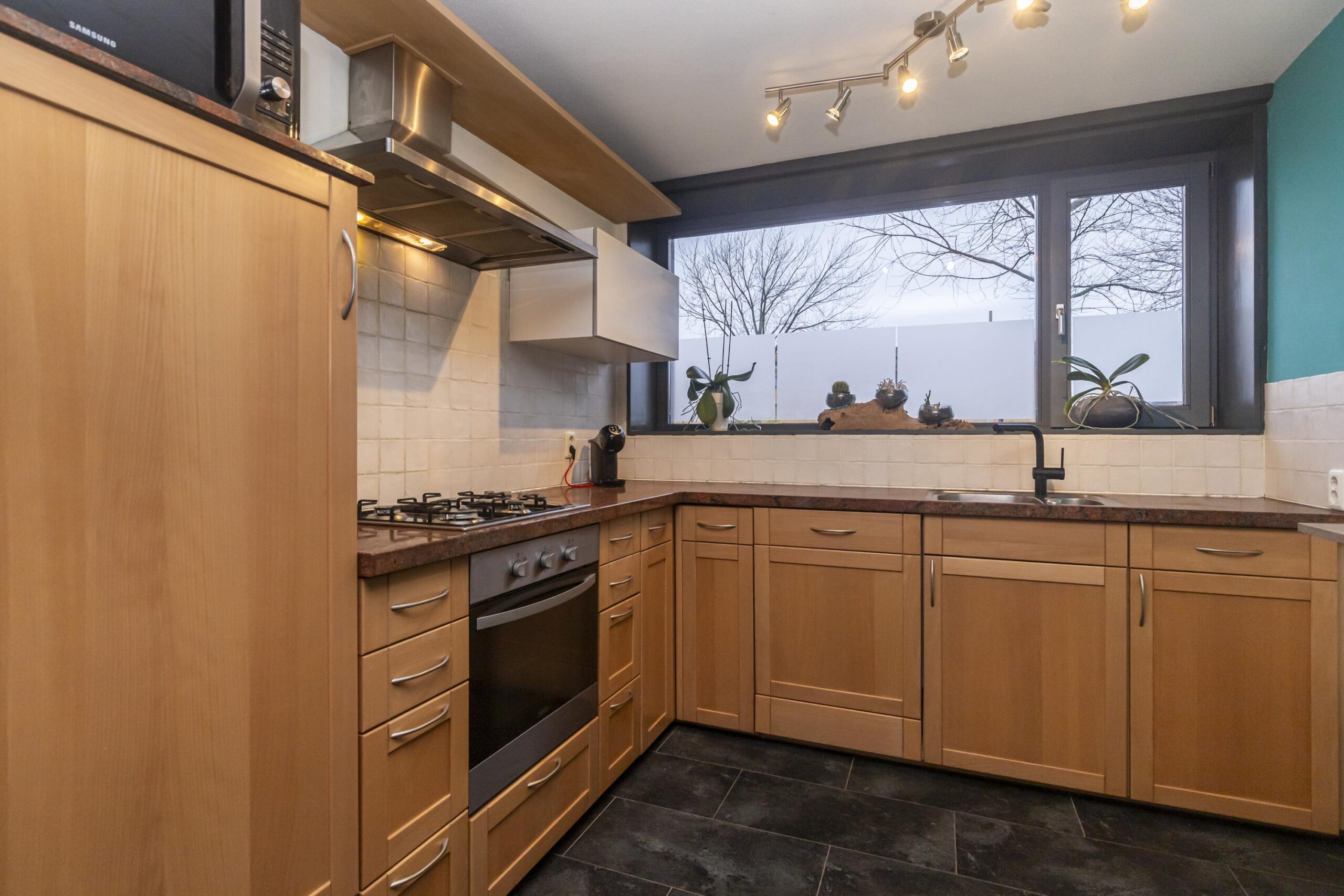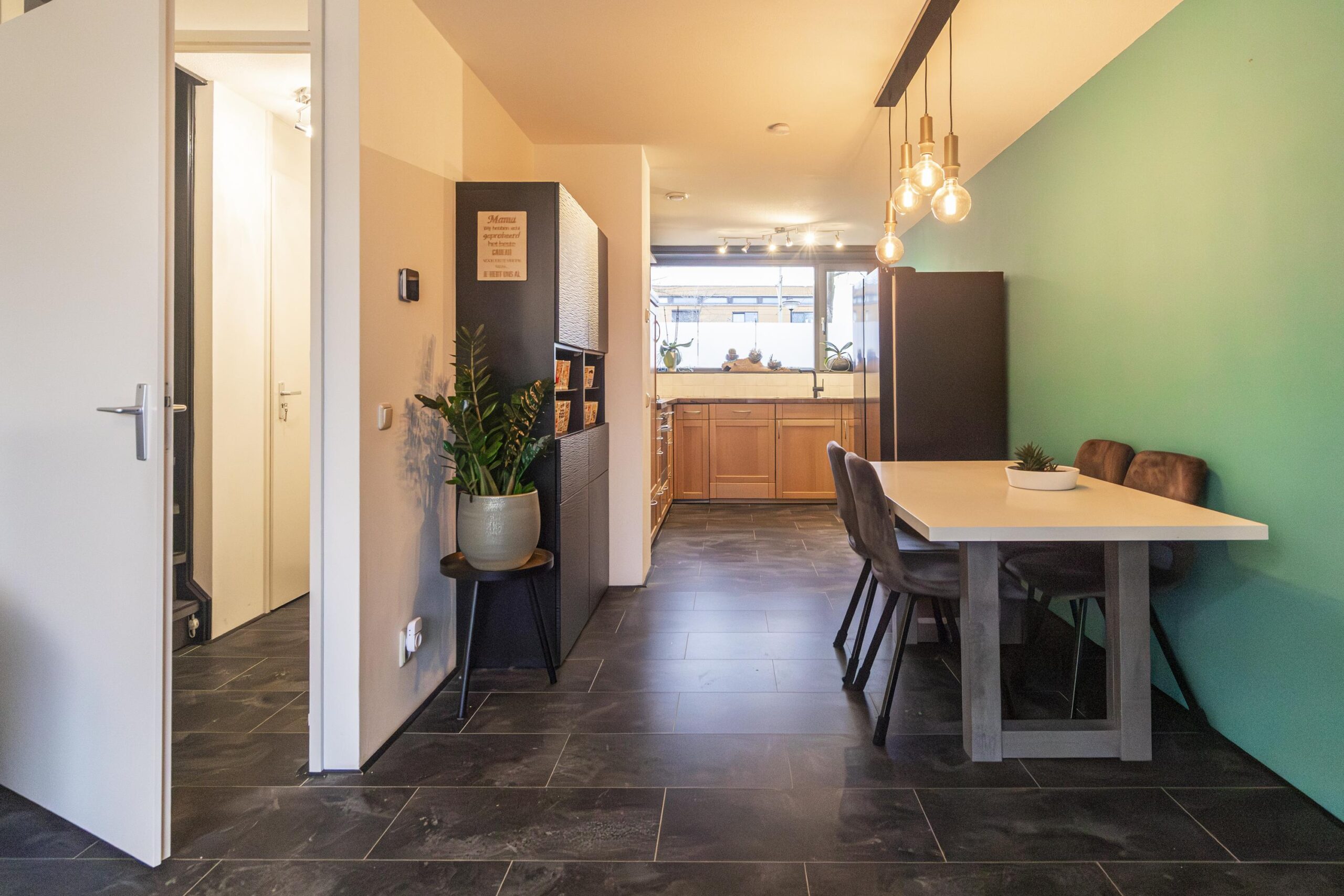 Via de verzorgde voortuin bereik je de entree van de woning. In het tochtportaal bevinden zich de meterkast en het toilet met fonteintje. De trap naar boven is recent vernieuwd en afgewerkt met pvc-bekleding en ingebouwde verlichting, wat zorgt voor een strakke en moderne uitstraling. Vanuit de hal stap je de lichte woon-eetkamer binnen waar de brede schuifpui aan de achterzijde zorgt voor veel daglicht en direct toegang geeft tot de zonnige tuin. Onder de trap is een praktische bergruimte aanwezig. Aan de voorzijde van de woning ligt de keuken in een L-opstelling die is voorzien van een vierpits gasfornuis, een elektrische oven, afzuiging naar buiten, Amerikaanse koelkast uit 2023 en een vaatwasser uit 2022. Aan de tuinzijde is een elektrische zonwering geplaatst over de volledige breedte van het huis waardoor je op warme dagen beschut buiten kunt zitten.