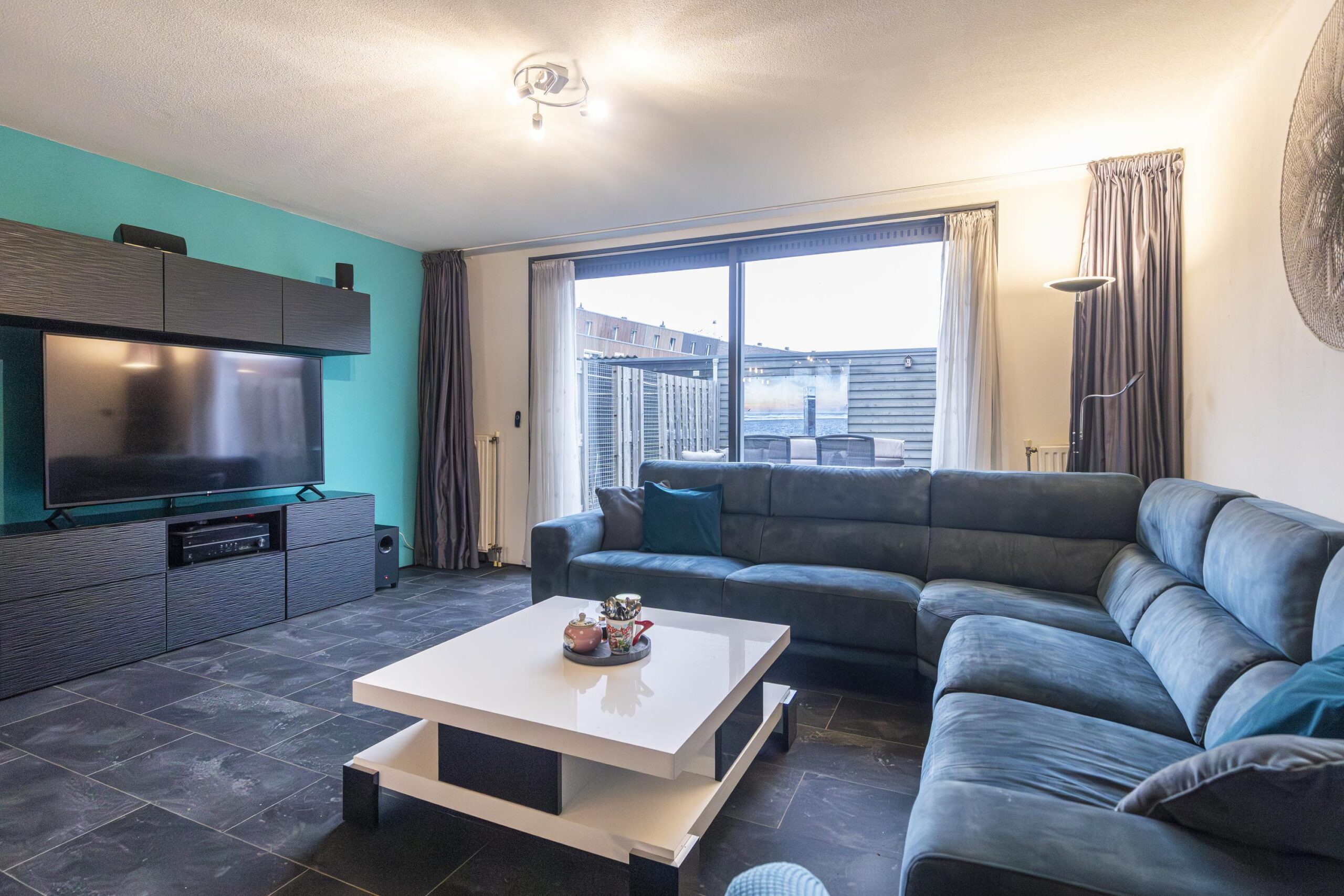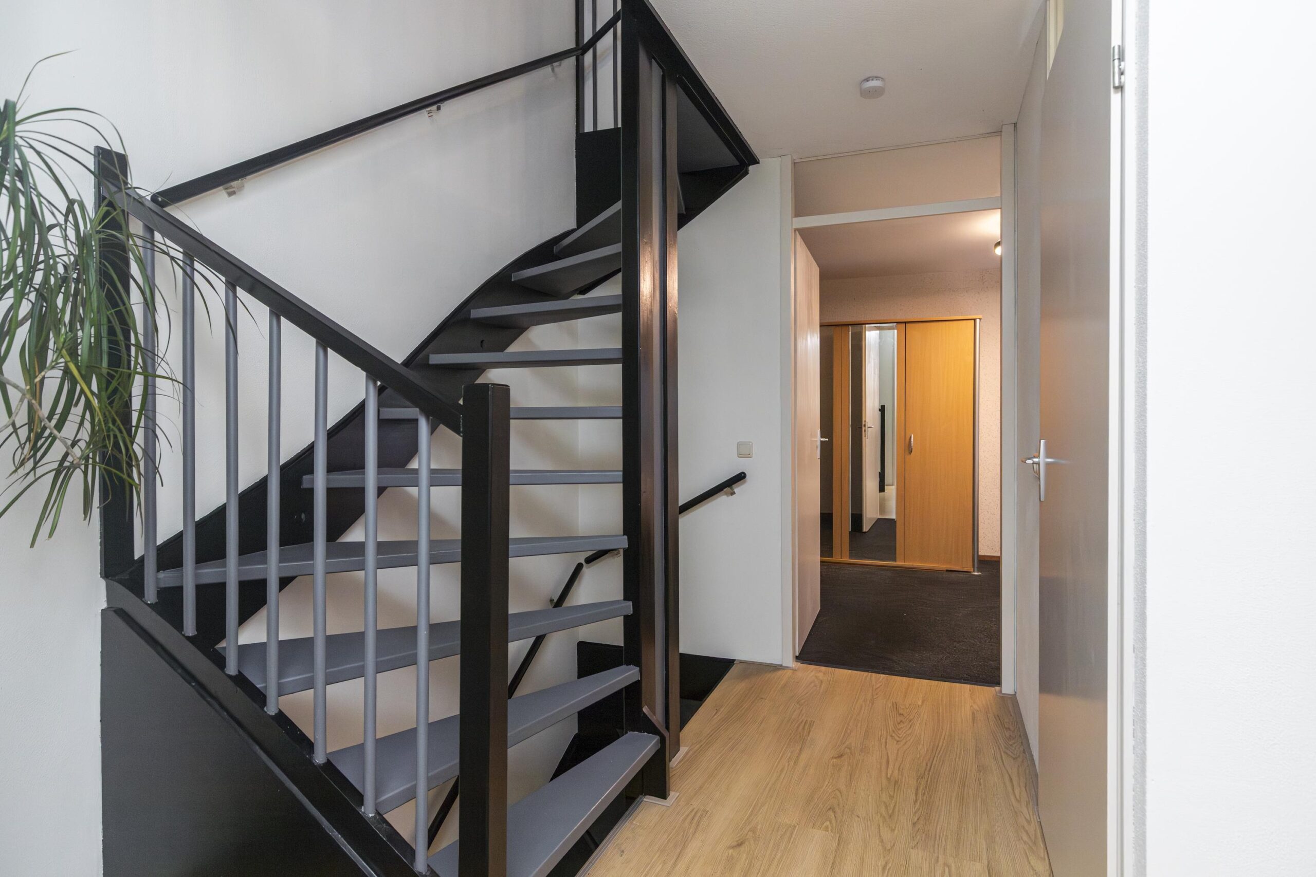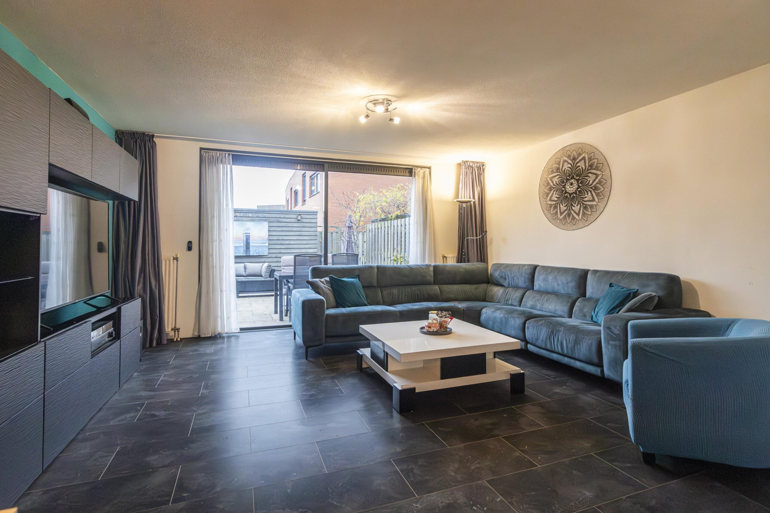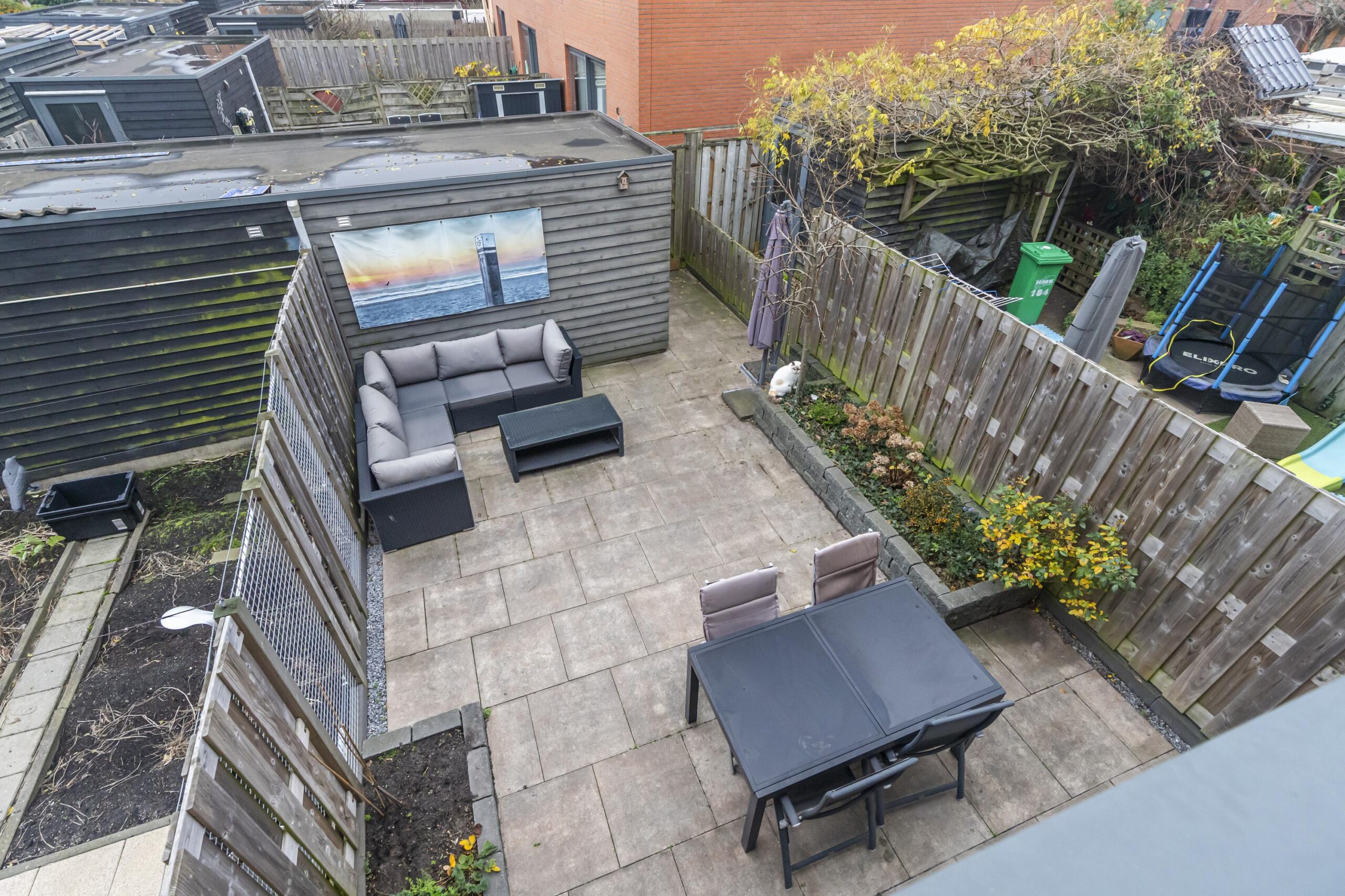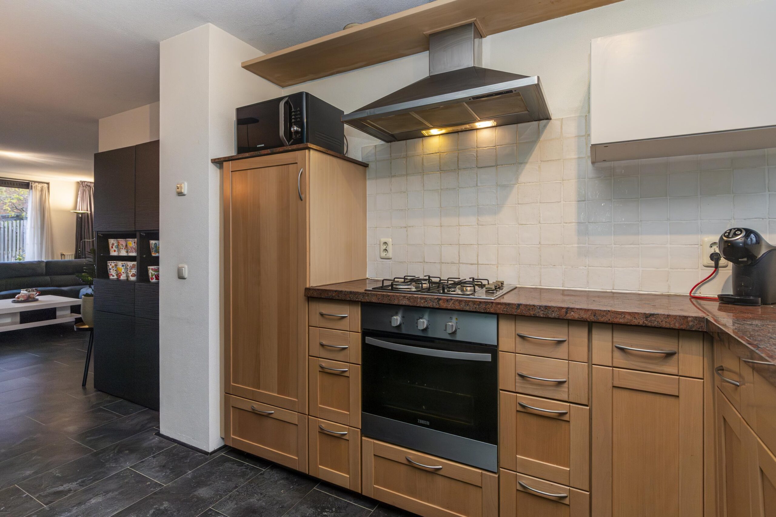 Via de verzorgde voortuin bereik je de entree van de woning. In het tochtportaal bevinden zich de meterkast en het toilet met fonteintje. De trap naar boven is recent vernieuwd en afgewerkt met pvc-bekleding en ingebouwde verlichting, wat zorgt voor een strakke en moderne uitstraling. Vanuit de hal stap je de lichte woon-eetkamer binnen waar de brede schuifpui aan de achterzijde zorgt voor veel daglicht en direct toegang geeft tot de zonnige tuin. Onder de trap is een praktische bergruimte aanwezig. Aan de voorzijde van de woning ligt de keuken in een L-opstelling die is voorzien van een vierpits gasfornuis, een elektrische oven, afzuiging naar buiten, Amerikaanse koelkast uit 2023 en een vaatwasser uit 2022. Aan de tuinzijde is een elektrische zonwering geplaatst over de volledige breedte van het huis waardoor je op warme dagen beschut buiten kunt zitten.