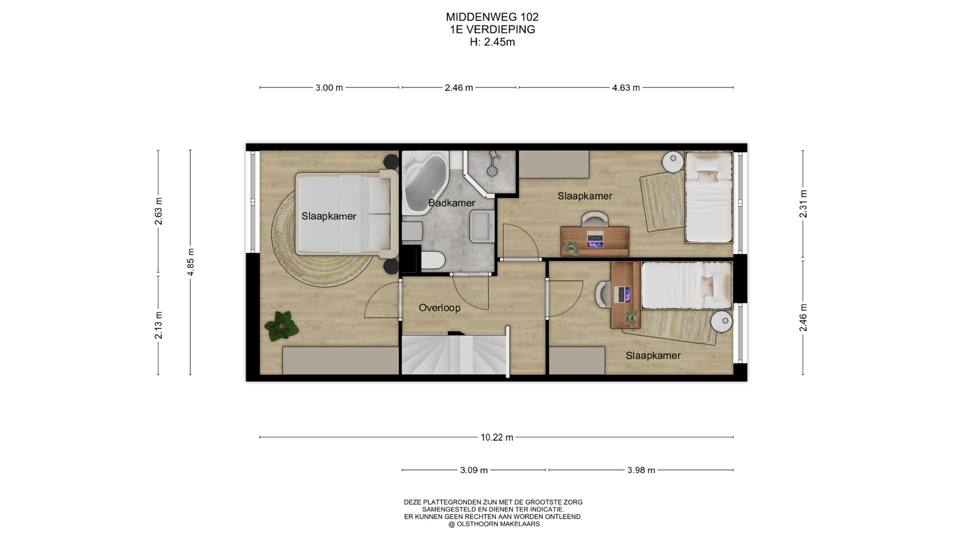 Op de eerste verdieping geeft de ruime overloop toegang tot drie slaapkamers. De grootste kamer ligt aan de voorzijde en strekt zich uit over de volle breedte van de woning, terwijl de twee andere slaapkamers aan de achterzijde zijn gesitueerd. De badkamer is ruim en beschikt over een hoekbad, een aparte douche, een toilet, een wastafel en een radiator. Alles bij elkaar een praktische indeling.