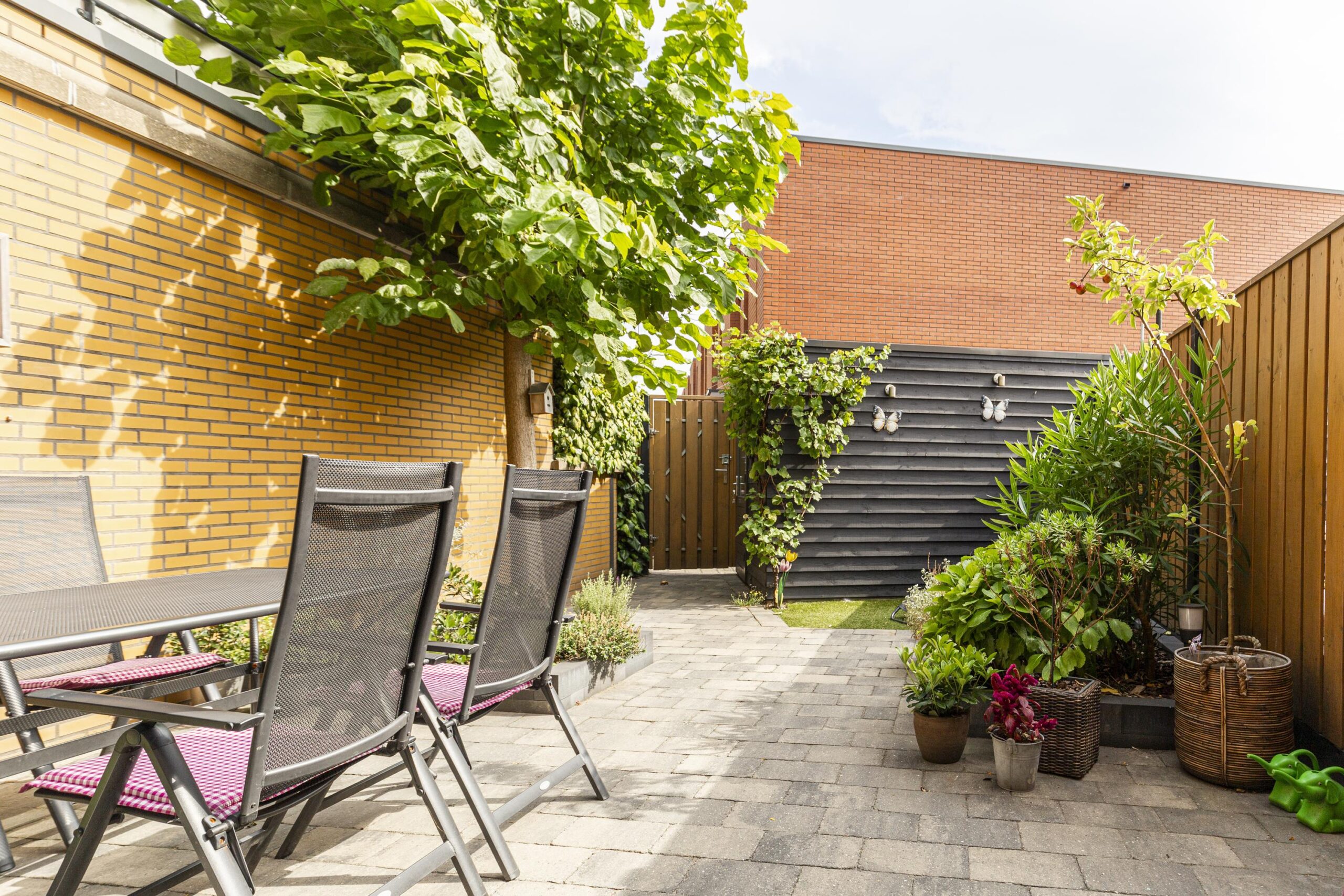 De zonnige achtertuin ligt op het zuiden en heeft een berging en een achterom.