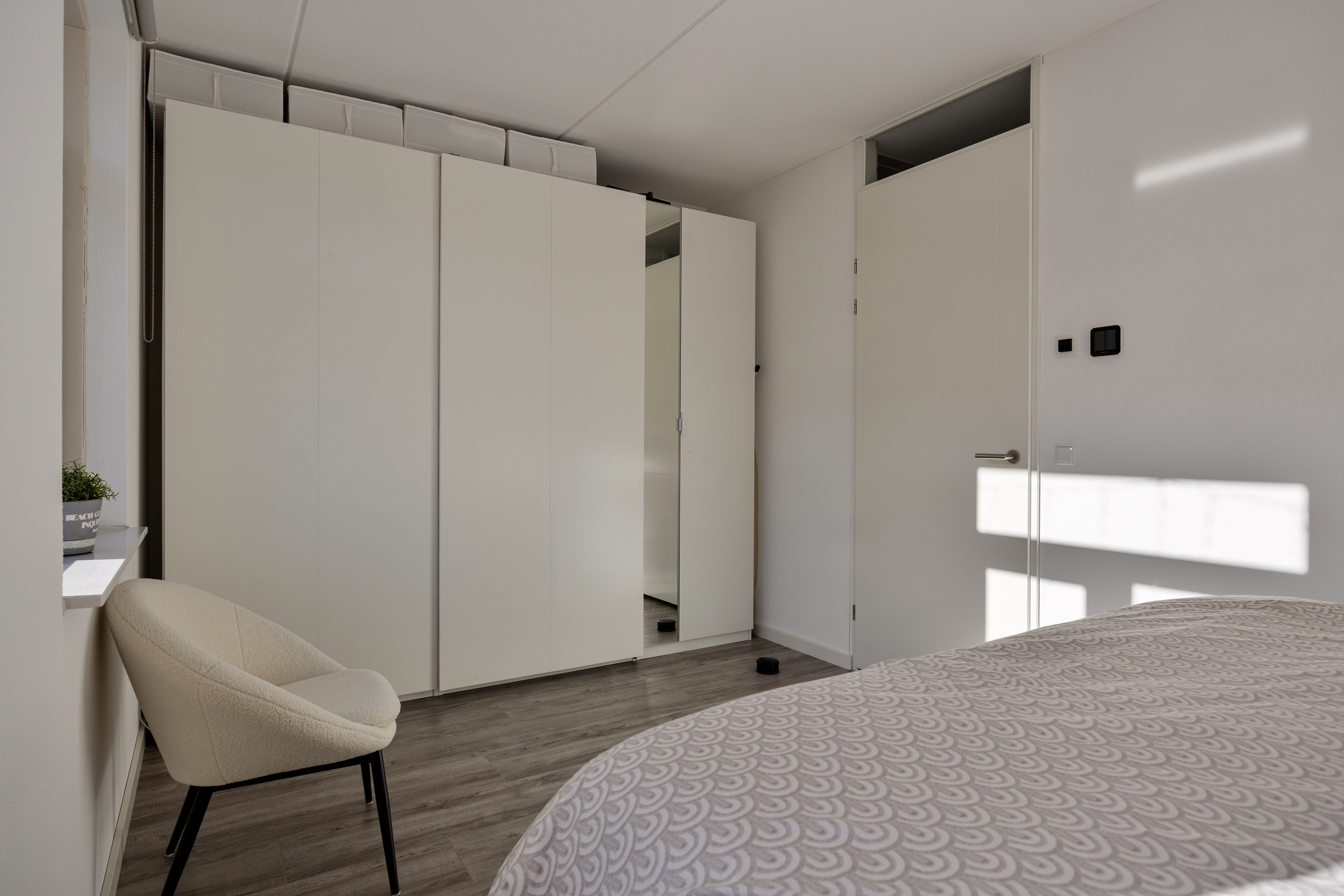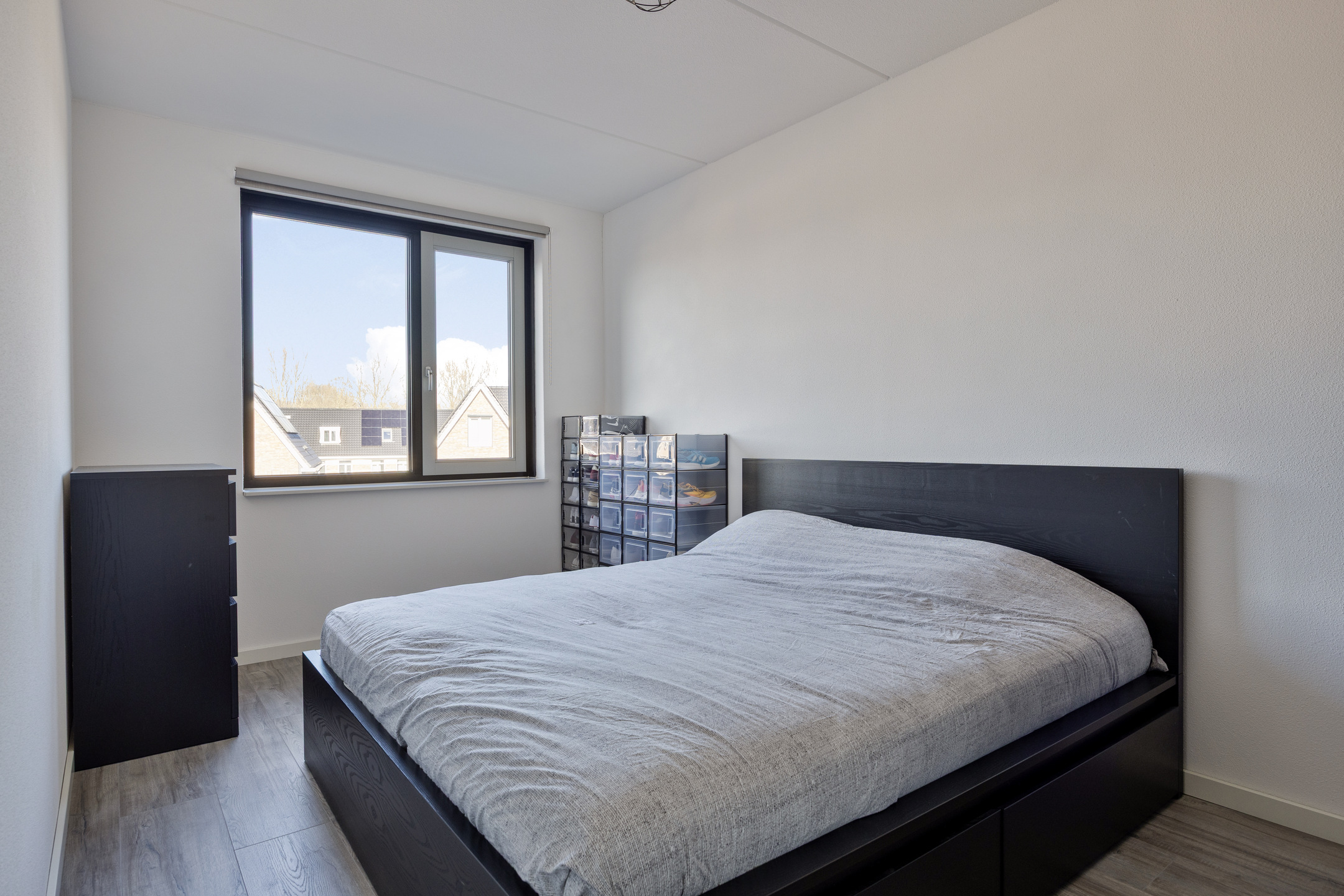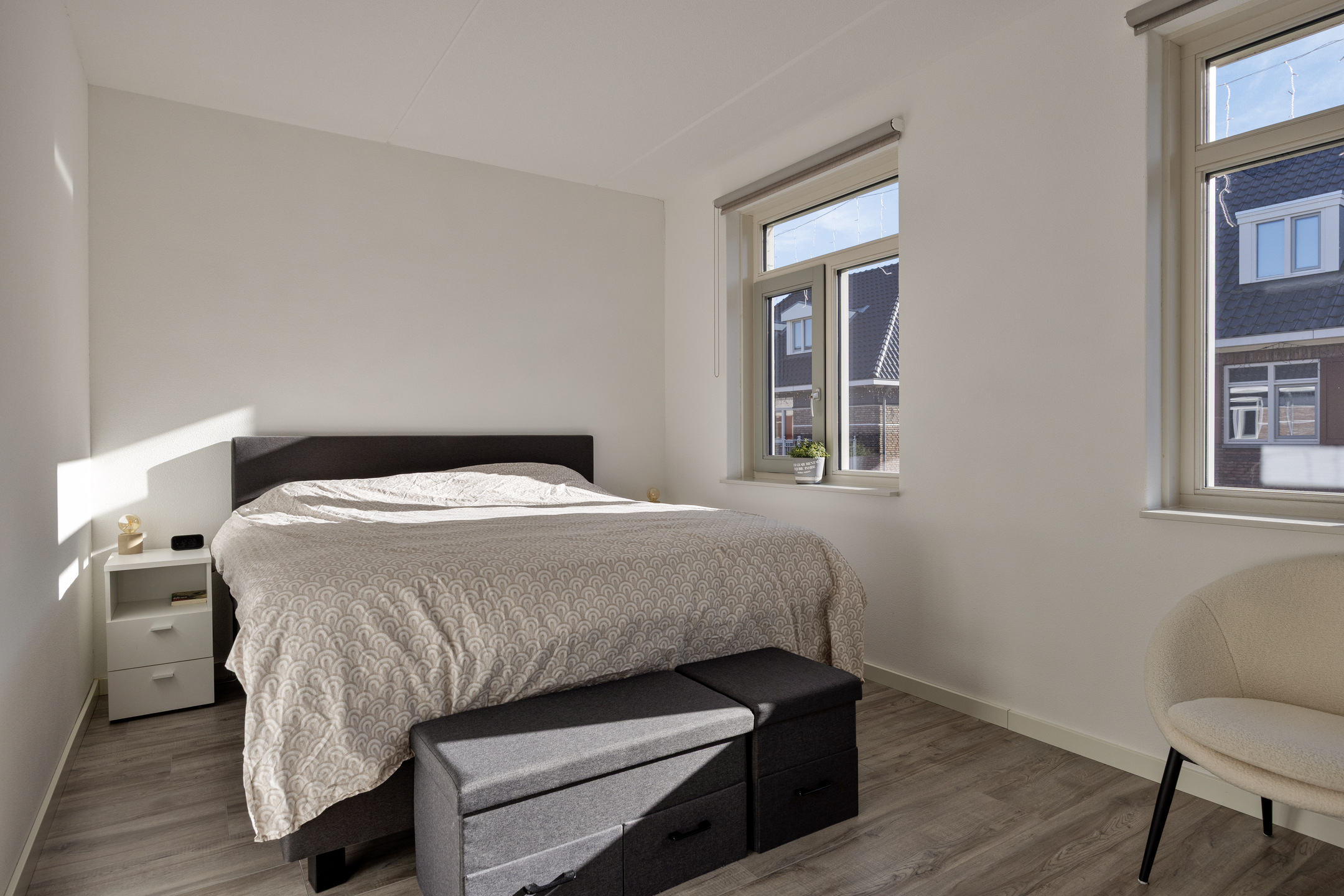 De ruime overloop geeft toegang tot drie slaapkamers. De hoofdslaapkamer aan de voorzijde is royaal van formaat en biedt voldoende ruimte voor een groot bed en een garderobekast. De tweede slaapkamer aan de achterzijde is ideaal als kinderkamer of werkkamer. Aan de achterzijde ligt nog een derde slaapkamer, eveneens goed bemeten en praktisch in te richten. De badkamer is centraal gelegen en modern uitgevoerd met een douche, wastafelmeubel en een tweede toilet.