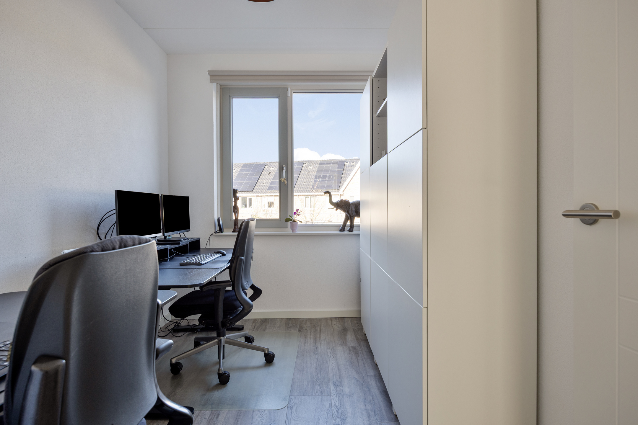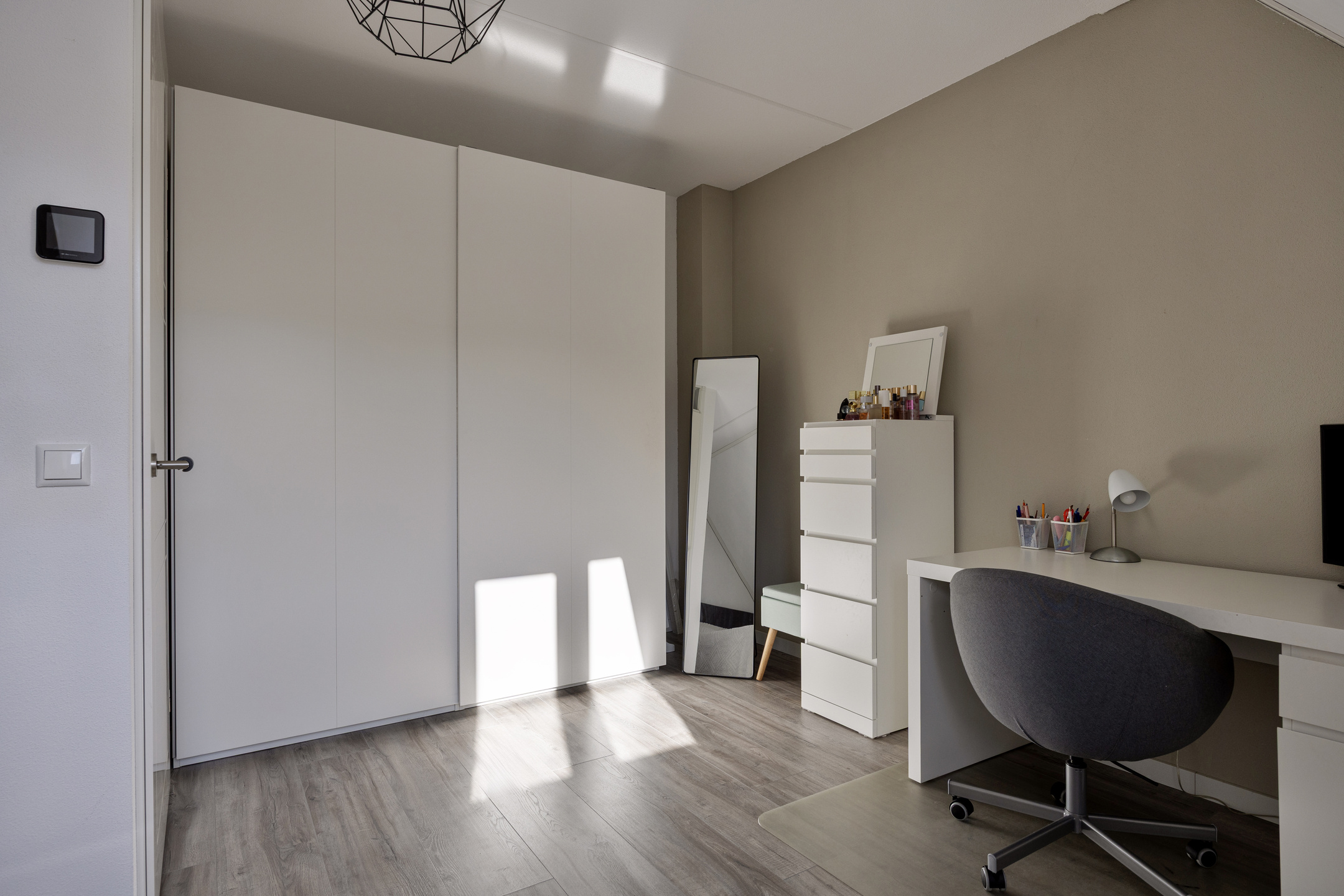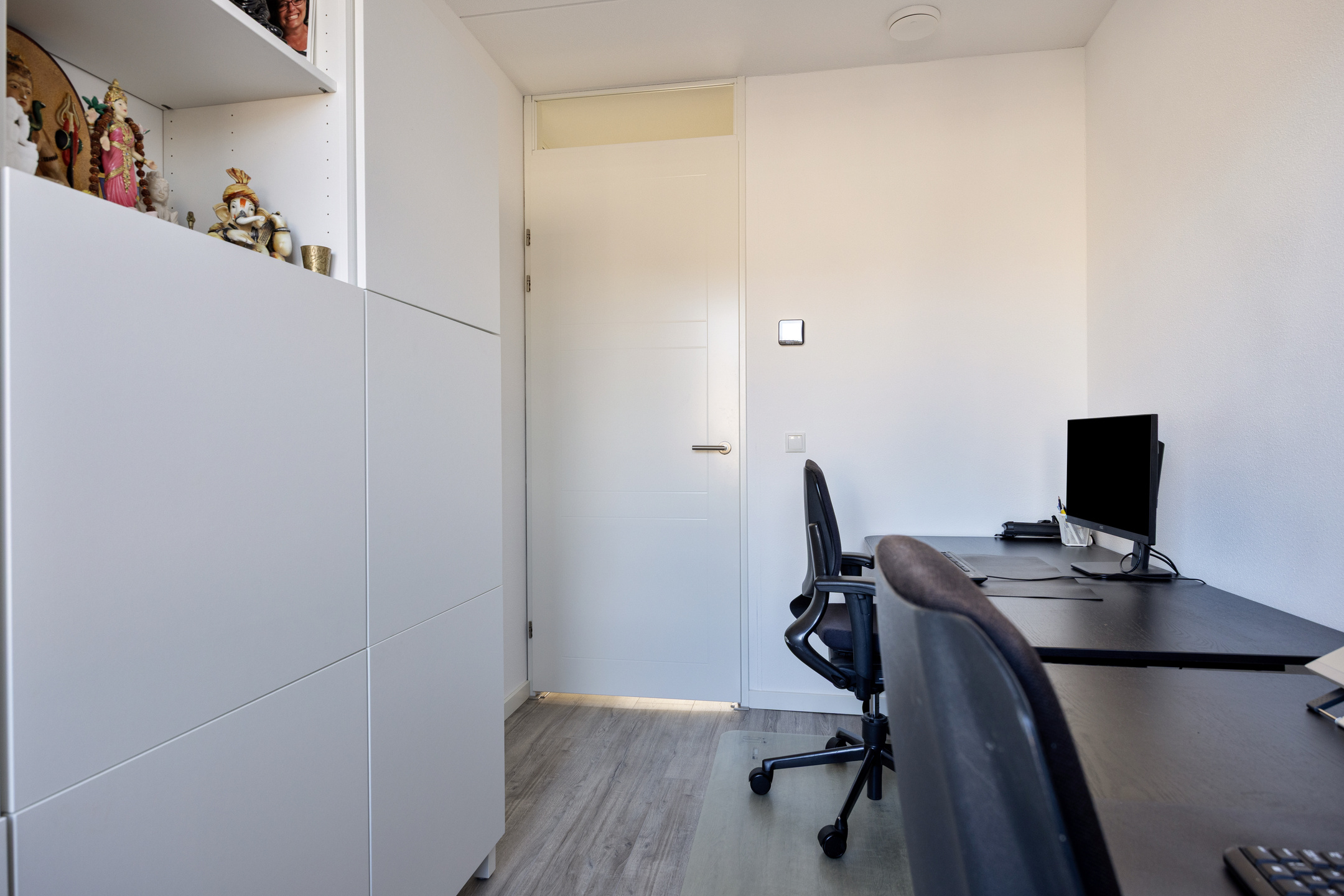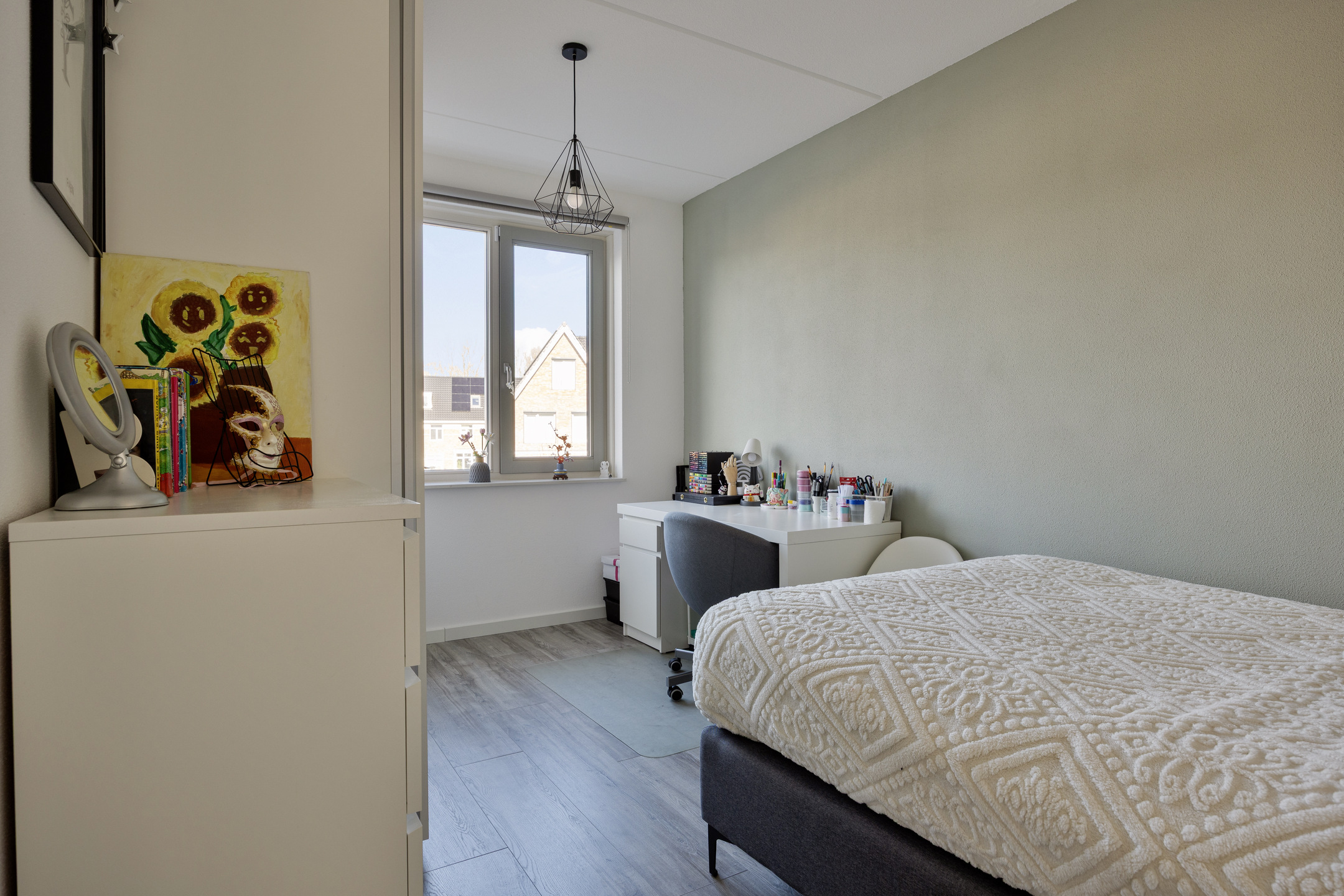 De ruime overloop geeft toegang tot drie slaapkamers. De hoofdslaapkamer aan de voorzijde is royaal van formaat en biedt voldoende ruimte voor een groot bed en een garderobekast. De tweede slaapkamer aan de achterzijde is ideaal als kinderkamer of werkkamer. Aan de achterzijde ligt nog een derde slaapkamer, eveneens goed bemeten en praktisch in te richten. De badkamer is centraal gelegen en modern uitgevoerd met een douche, wastafelmeubel en een tweede toilet.