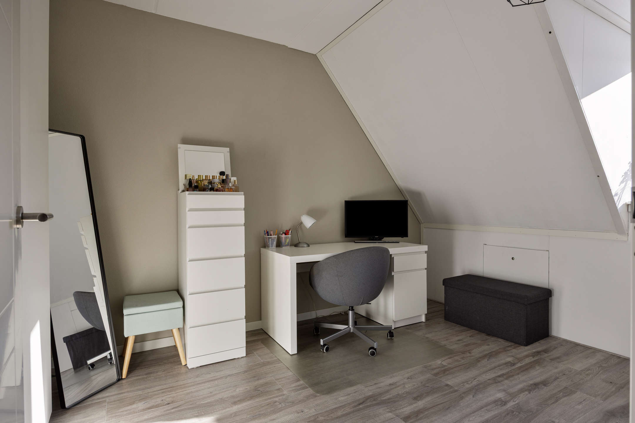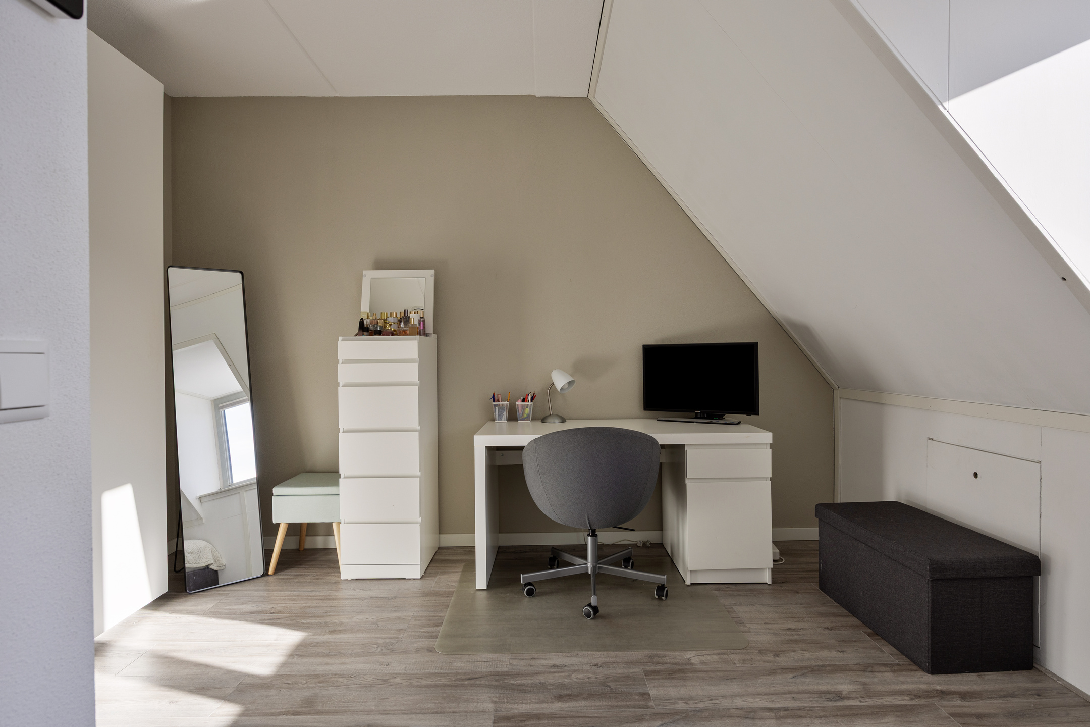 Deze verdieping verrast met twee ruime slaapkamers, mede dankzij de rechte gevels aan de achterzijde en een dakkapel aan de voorzijde. De slaapkamer aan de voorzijde is licht en ruim en kan desgewenst als master bedroom of hobbyruimte worden gebruikt. Deze kamer beschikt ook over extra bergruimte achter de knieschotten. De achterkamer is tevens ruim van formaat en kijkt uit over de achtertuin. Verder is er een aparte wasruimte met aansluitingen voor wasmachine en droger, plus de opstelplaats van de WTW-installatie.