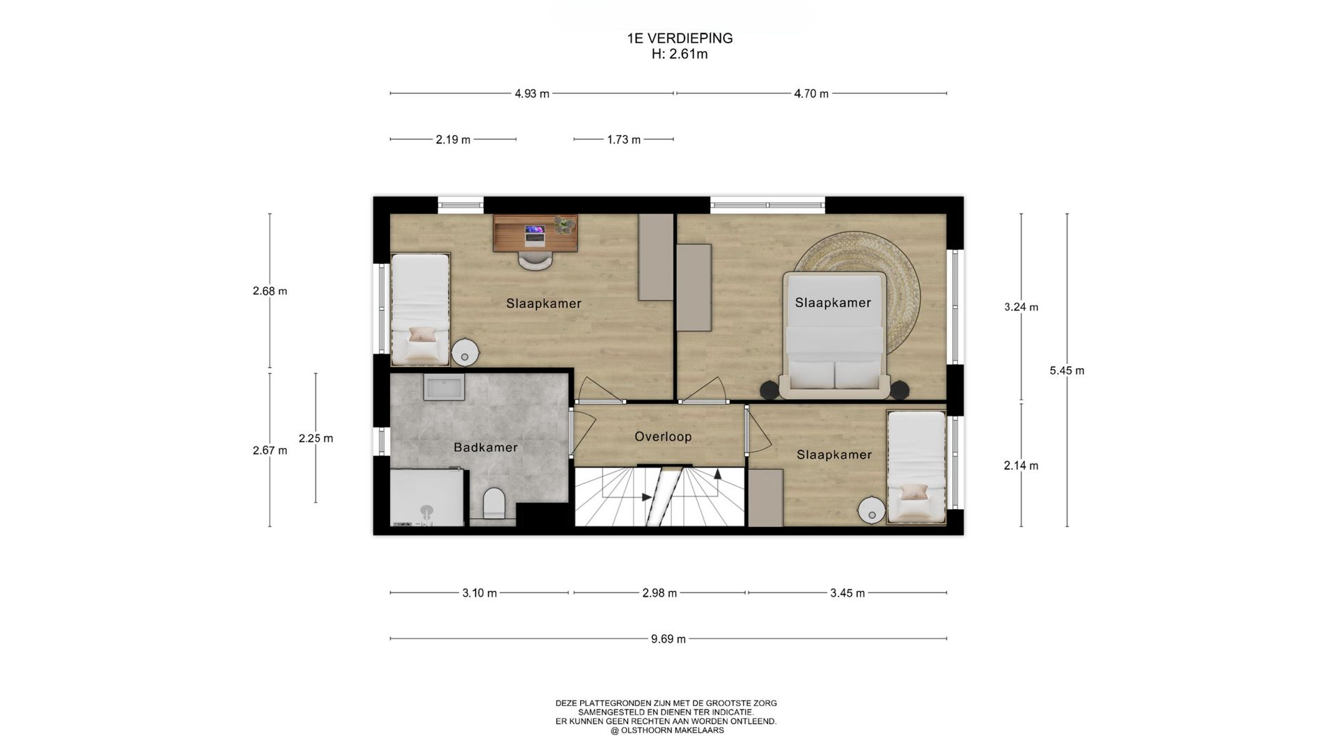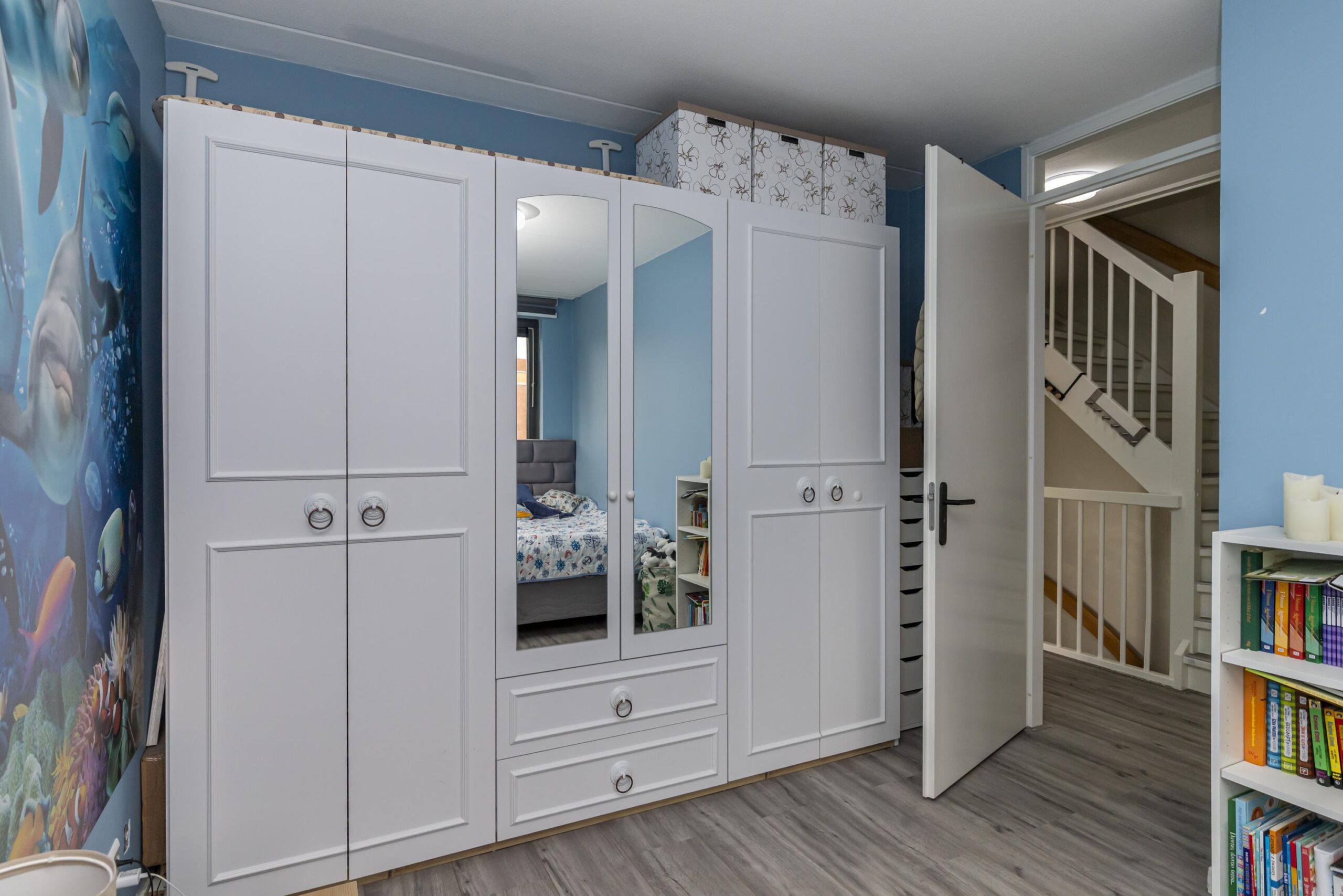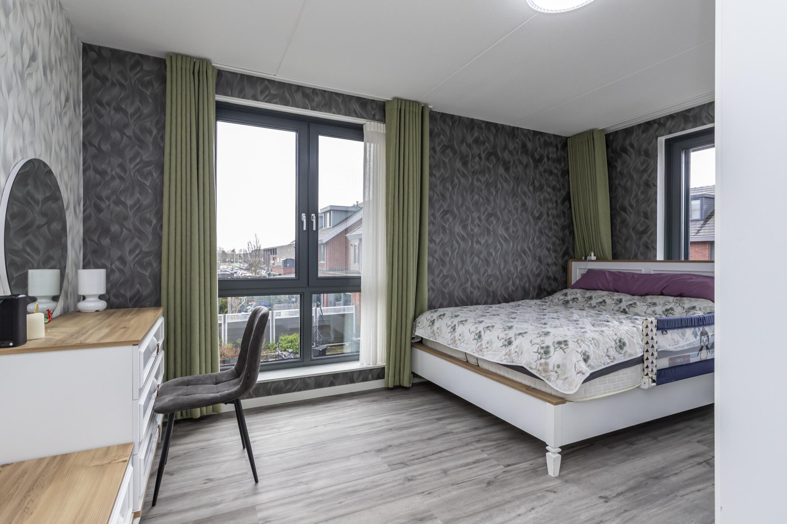 De overloop geeft toegang tot drie ruime slaapkamers en de badkamer. Zowel de slaapkamers als de overloop zijn voorzien van laminaat. De grootste slaapkamer biedt een prachtig uitzicht over de waterpartij. De badkamer is volledig betegeld in rustige tinten en beschikt over een inloopdouche, een brede wastafel met onderkast, een spiegel met geïntegreerde verlichting, een hangkast en een apart toilet.