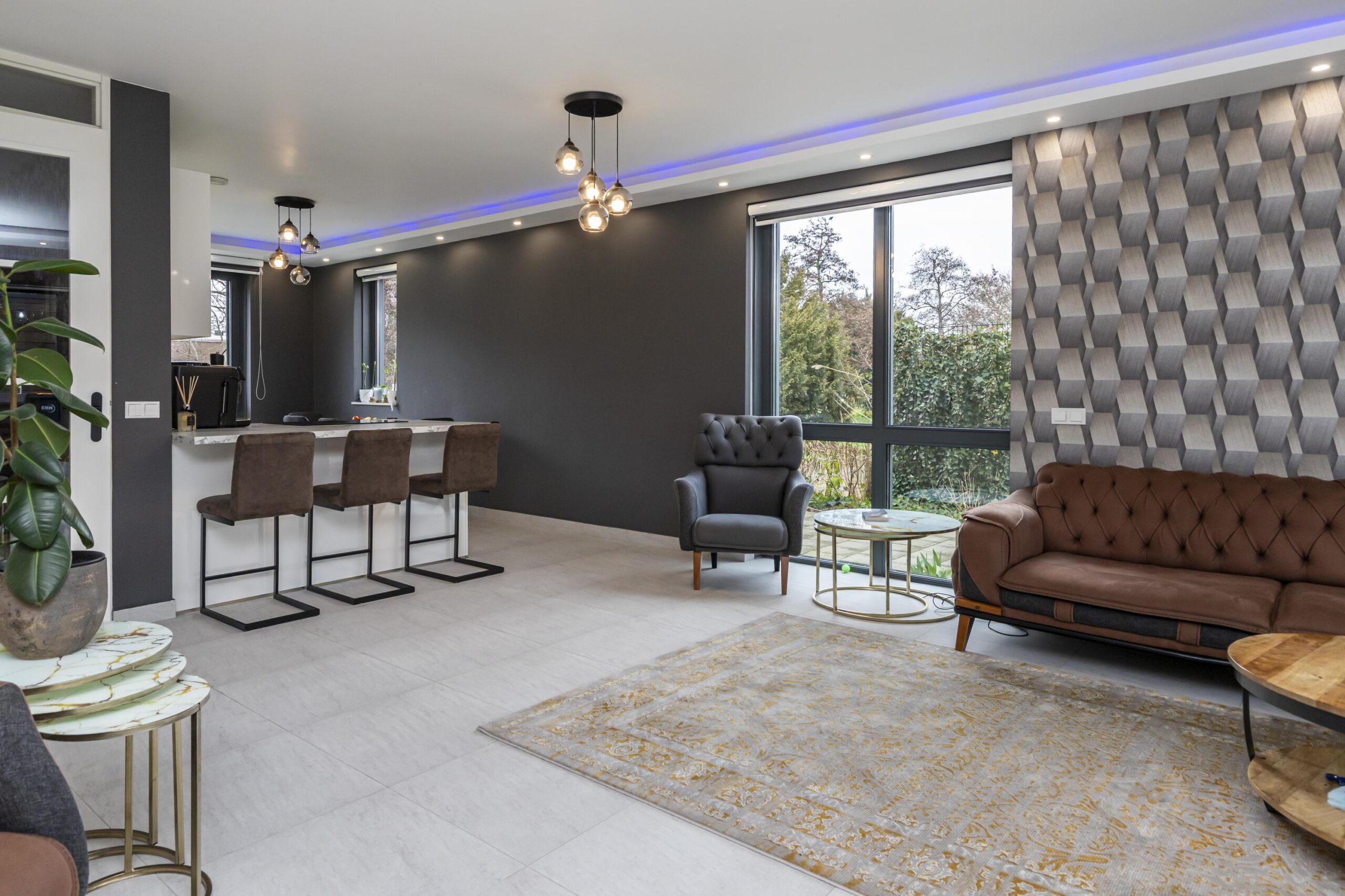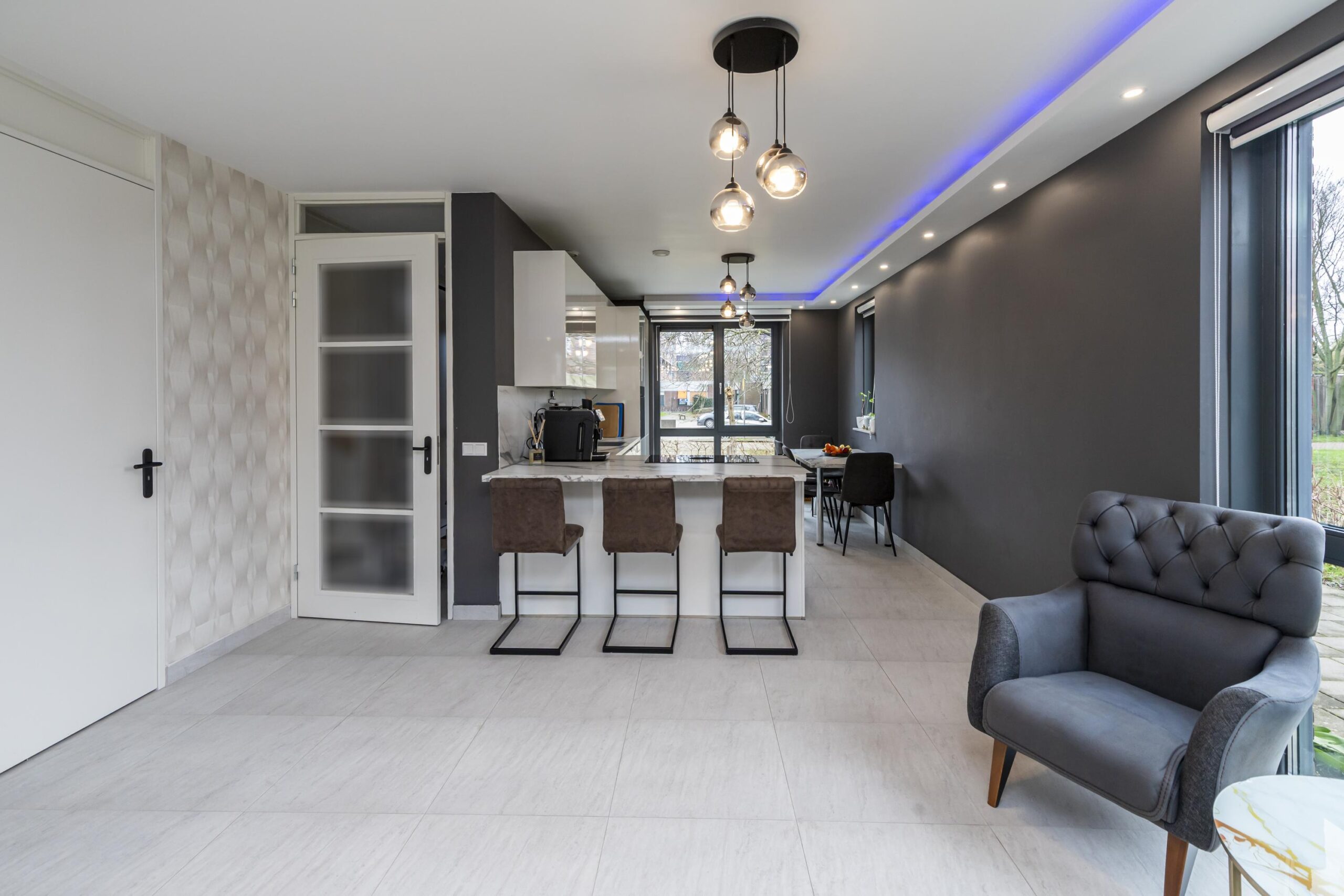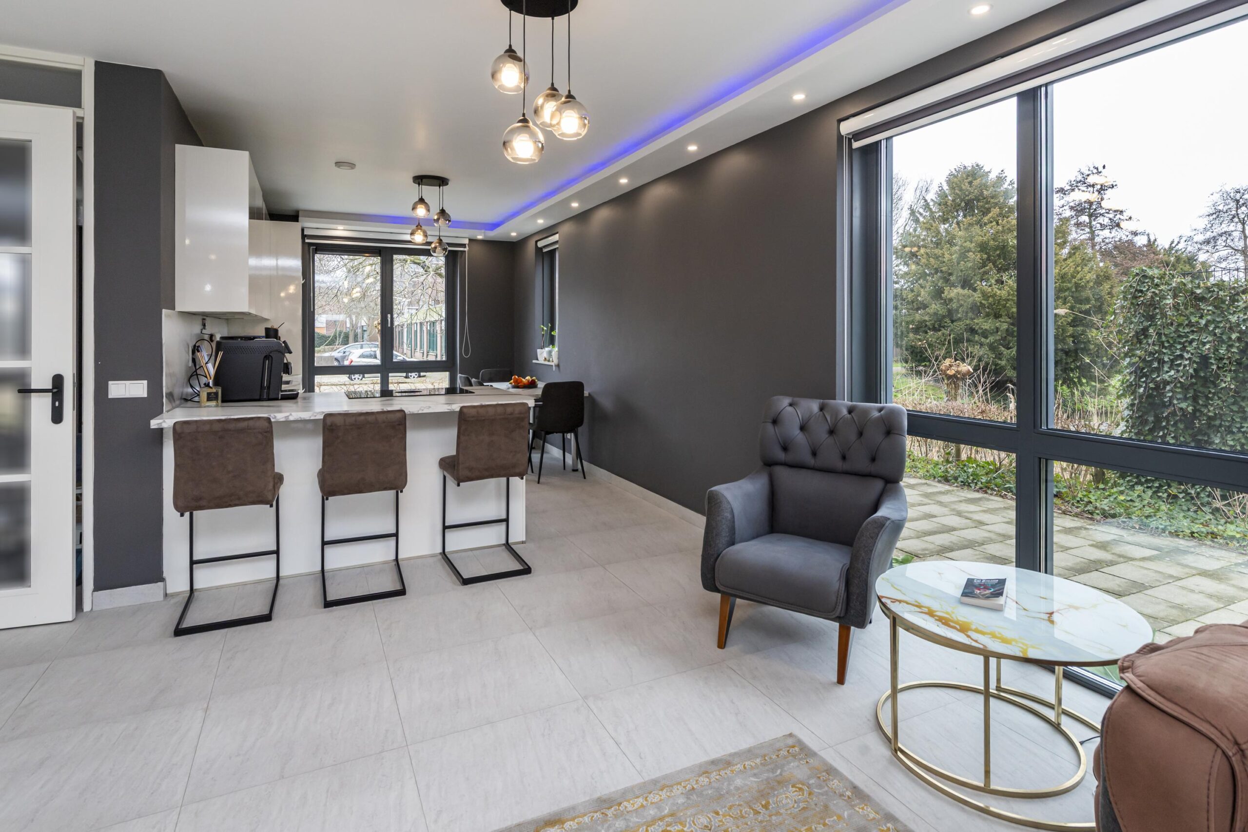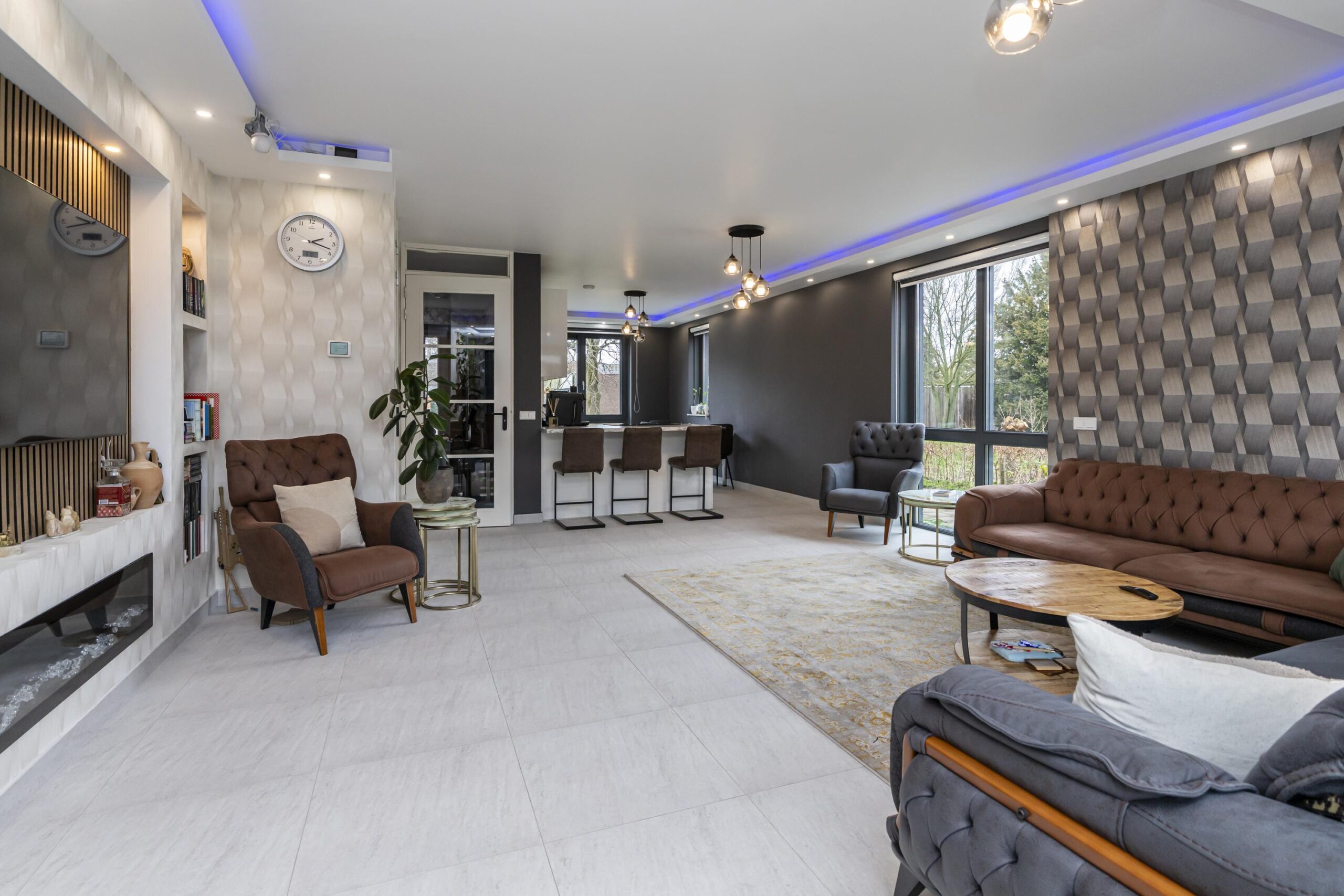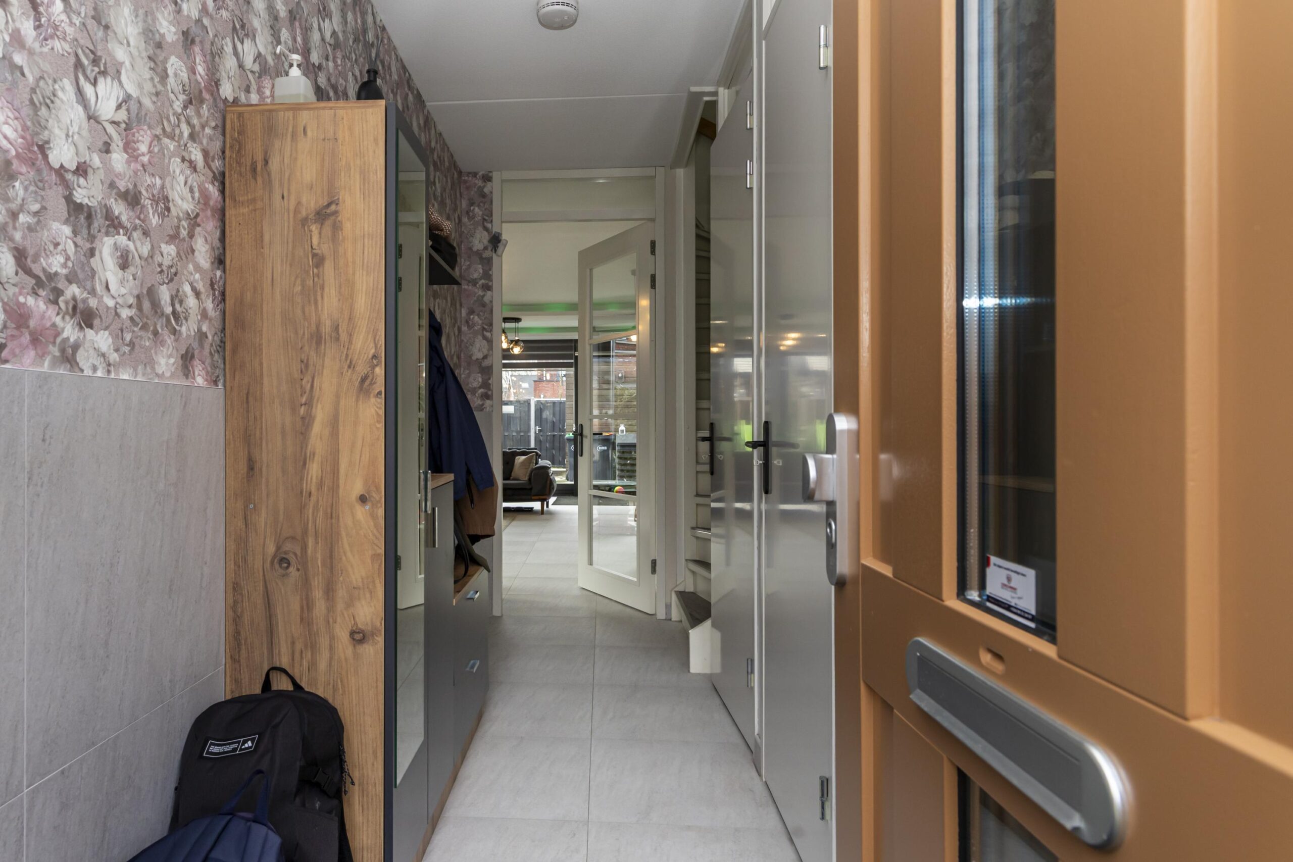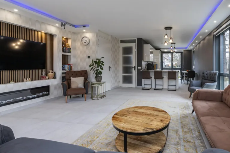 Via de voordeur kom je in de ruime entree met garderobe, toilet met hangcloset en fonteintje, een vaste kast en de trap naar de eerste verdieping. Vanuit de hal betreed je de lichte woonkamer, waar het daglicht rijkelijk binnenvalt dankzij de grote raampartijen. De brede schuifpui aan de achterzijde biedt directe toegang tot de tuin. Een echte eyecatcher is de stijlvolle designwand met inbouwspots en ruimte voor de televisie, aangevuld met een extra inbouwkast.