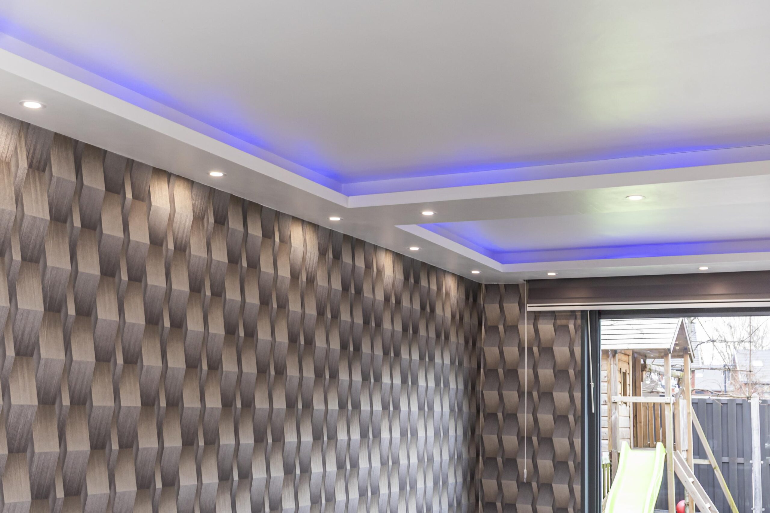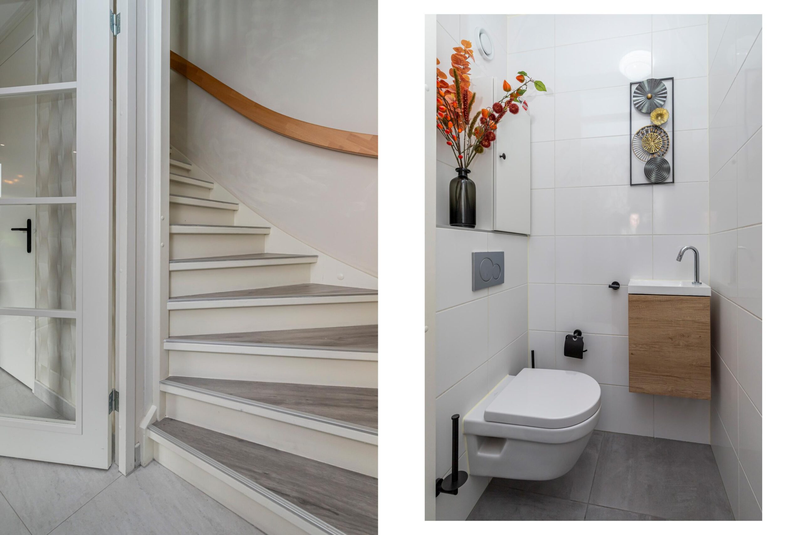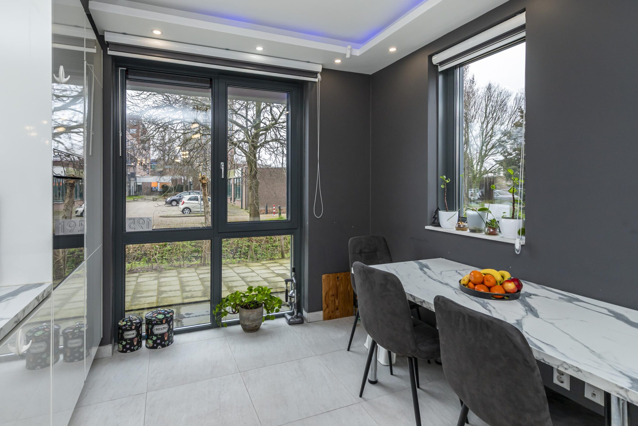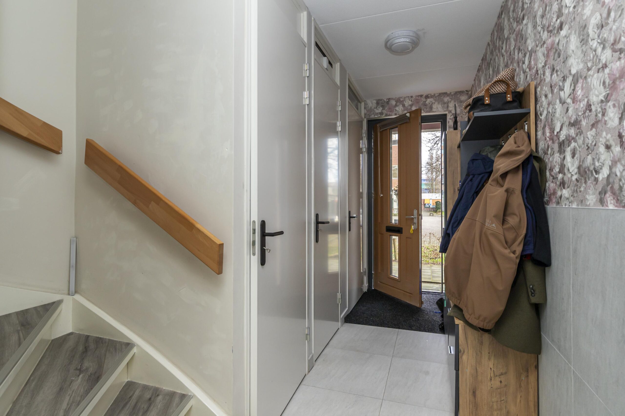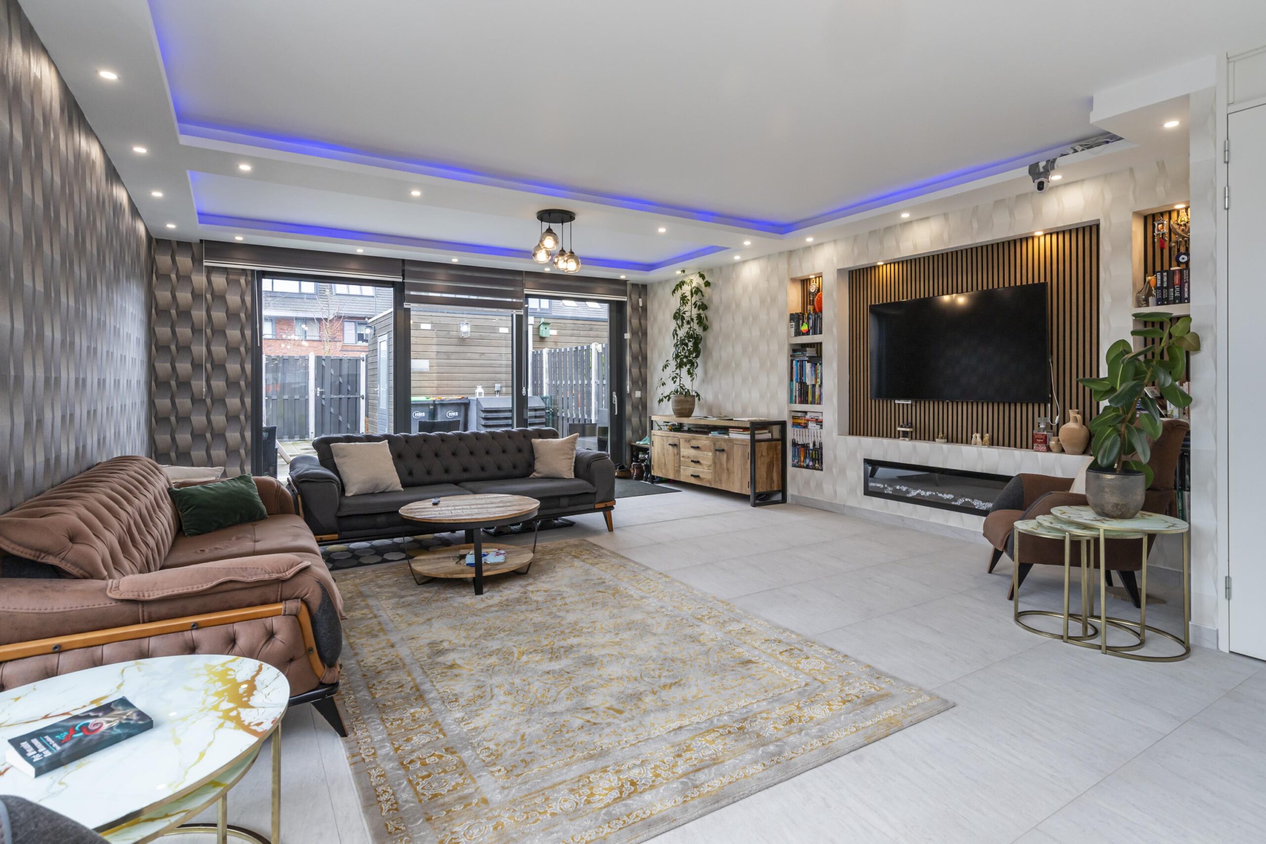 Via de voordeur kom je in de ruime entree met garderobe, toilet met hangcloset en fonteintje, een vaste kast en de trap naar de eerste verdieping. Vanuit de hal betreed je de lichte woonkamer, waar het daglicht rijkelijk binnenvalt dankzij de grote raampartijen. De brede schuifpui aan de achterzijde biedt directe toegang tot de tuin. Een echte eyecatcher is de stijlvolle designwand met inbouwspots en ruimte voor de televisie, aangevuld met een extra inbouwkast.