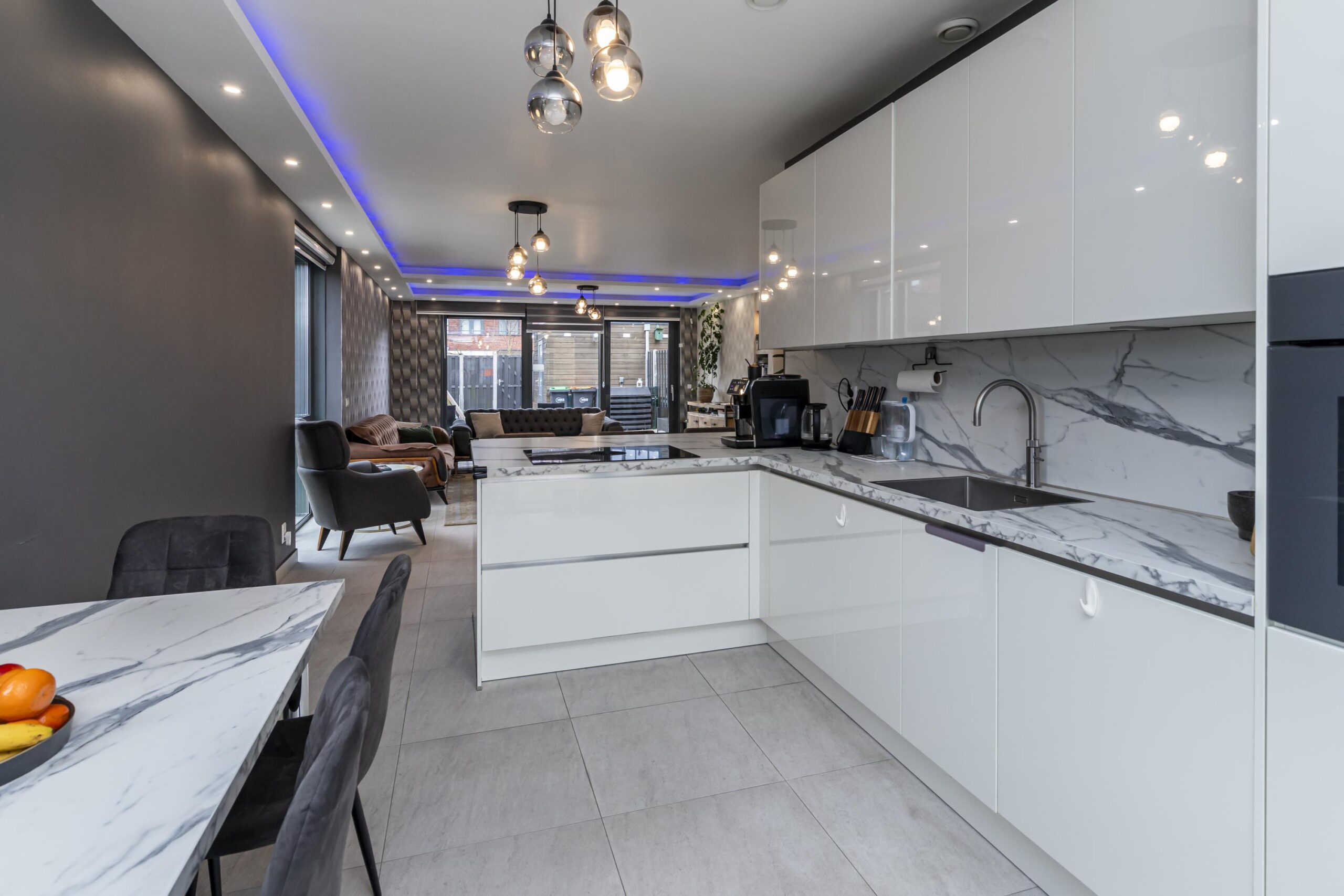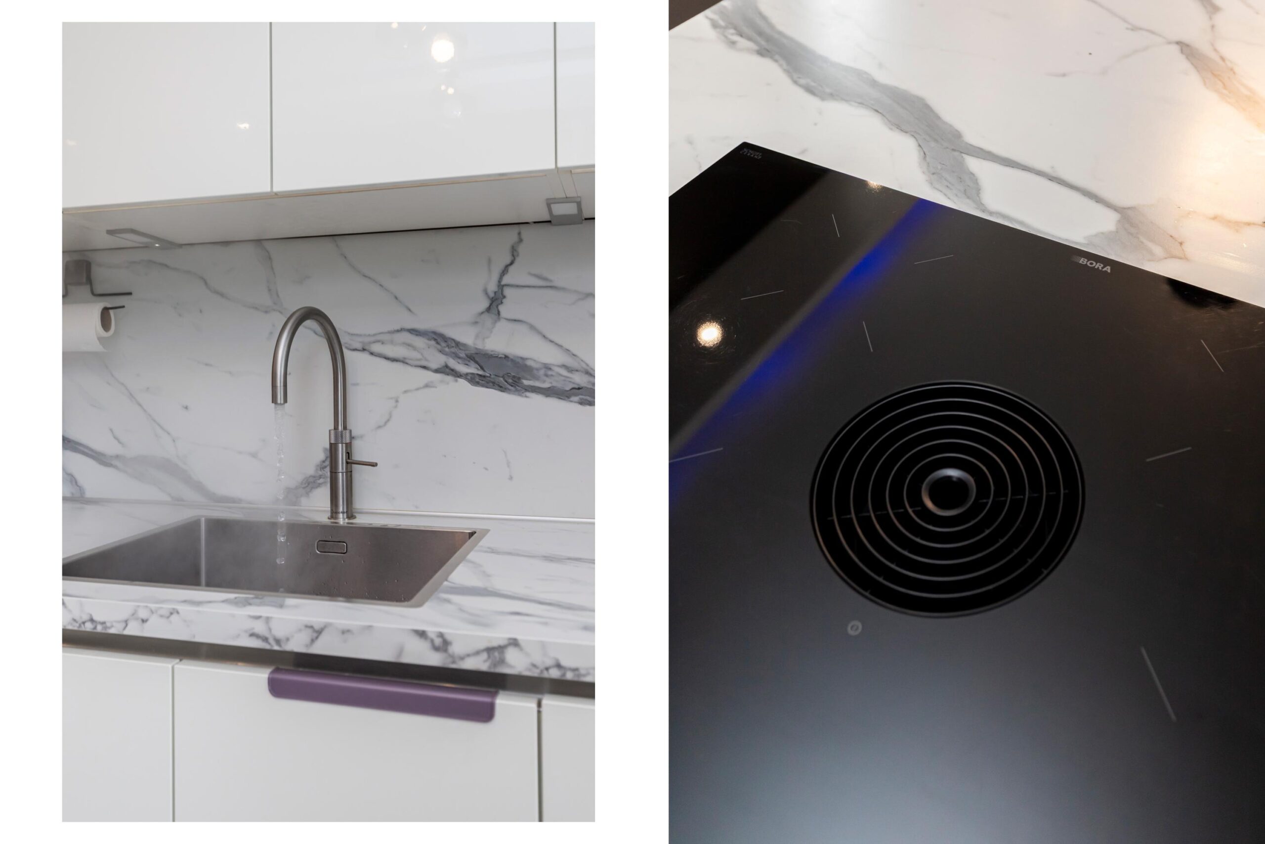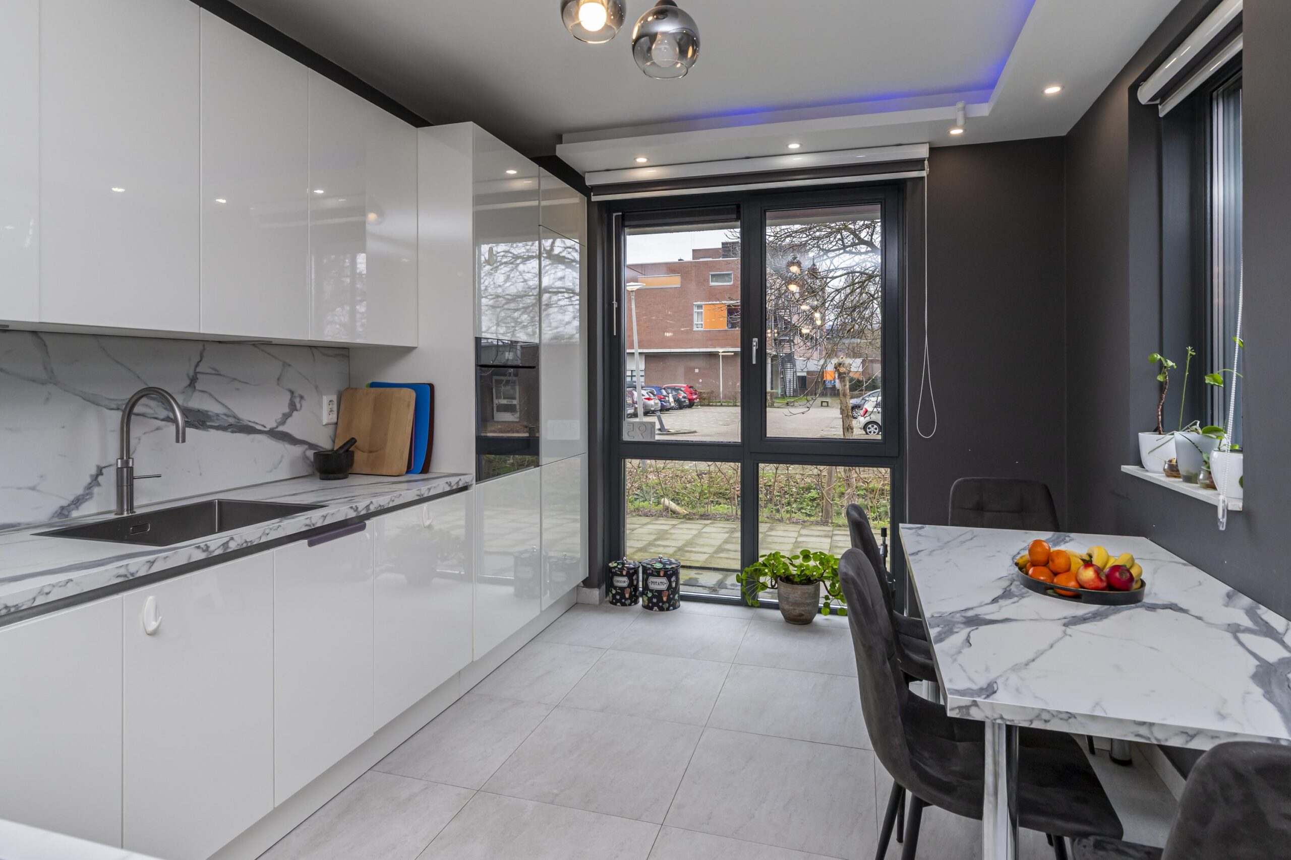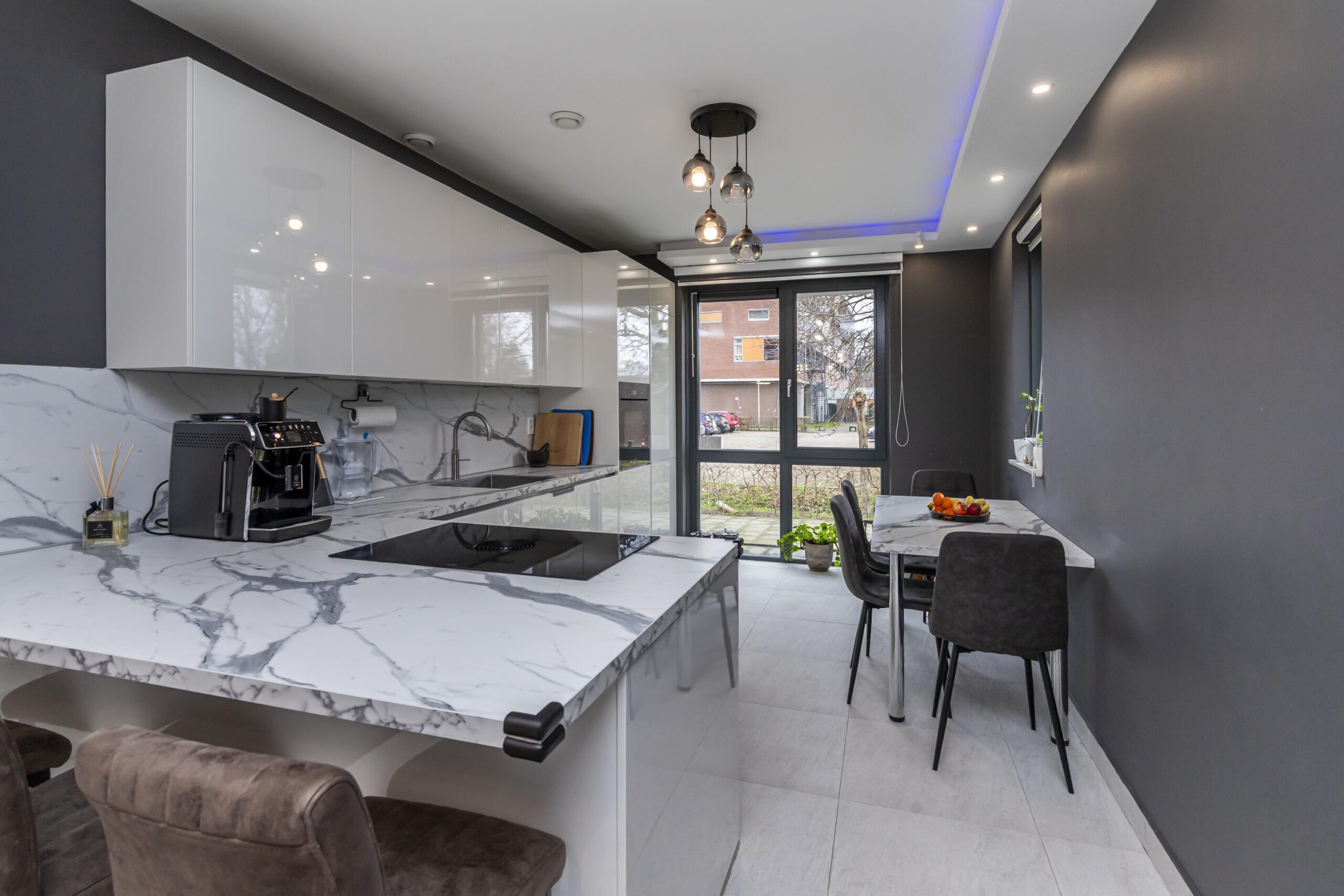 Aan de voorzijde bevindt zich de moderne, strak vormgegeven witte hoogglans keuken. Deze is uitgerust met een Bora inductiekookplaat met geïntegreerde afzuiging, combi-oven, spoelbak met Quooker en volop bergruimte. De gehele begane grond is afgewerkt met een fraaie plavuizenvloer.